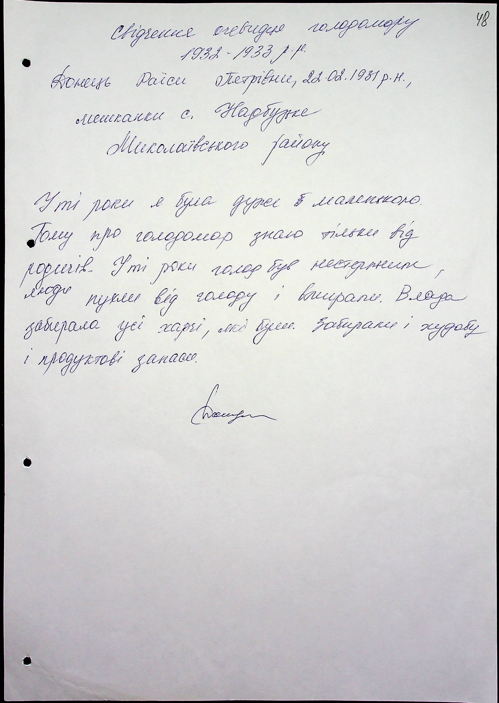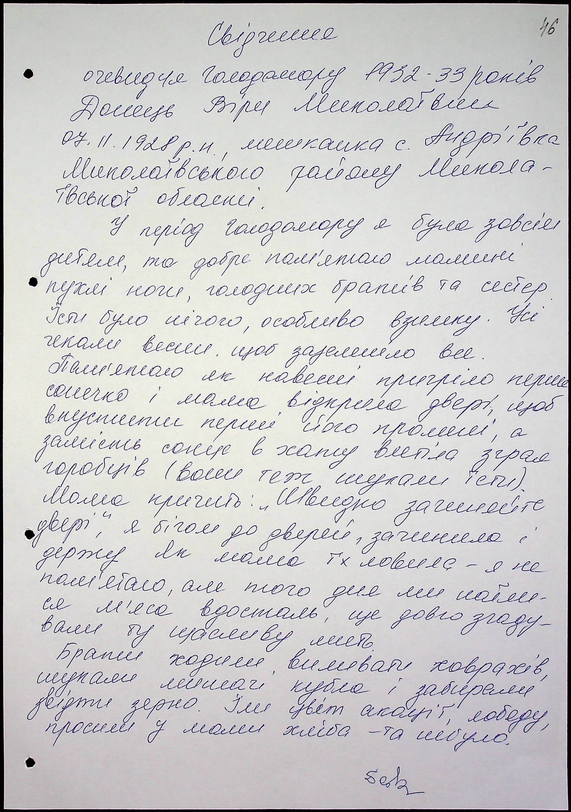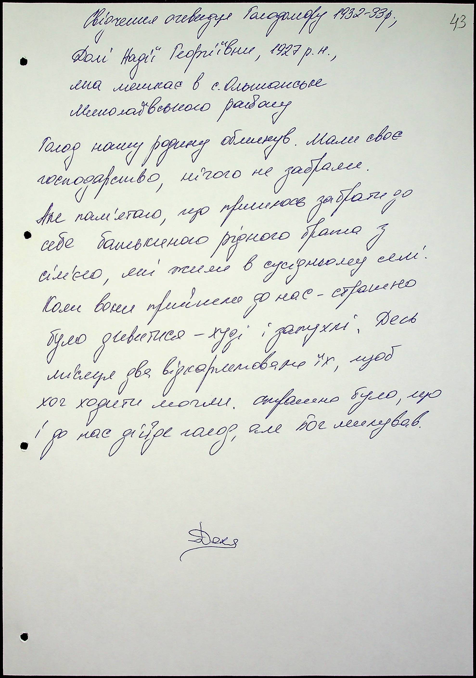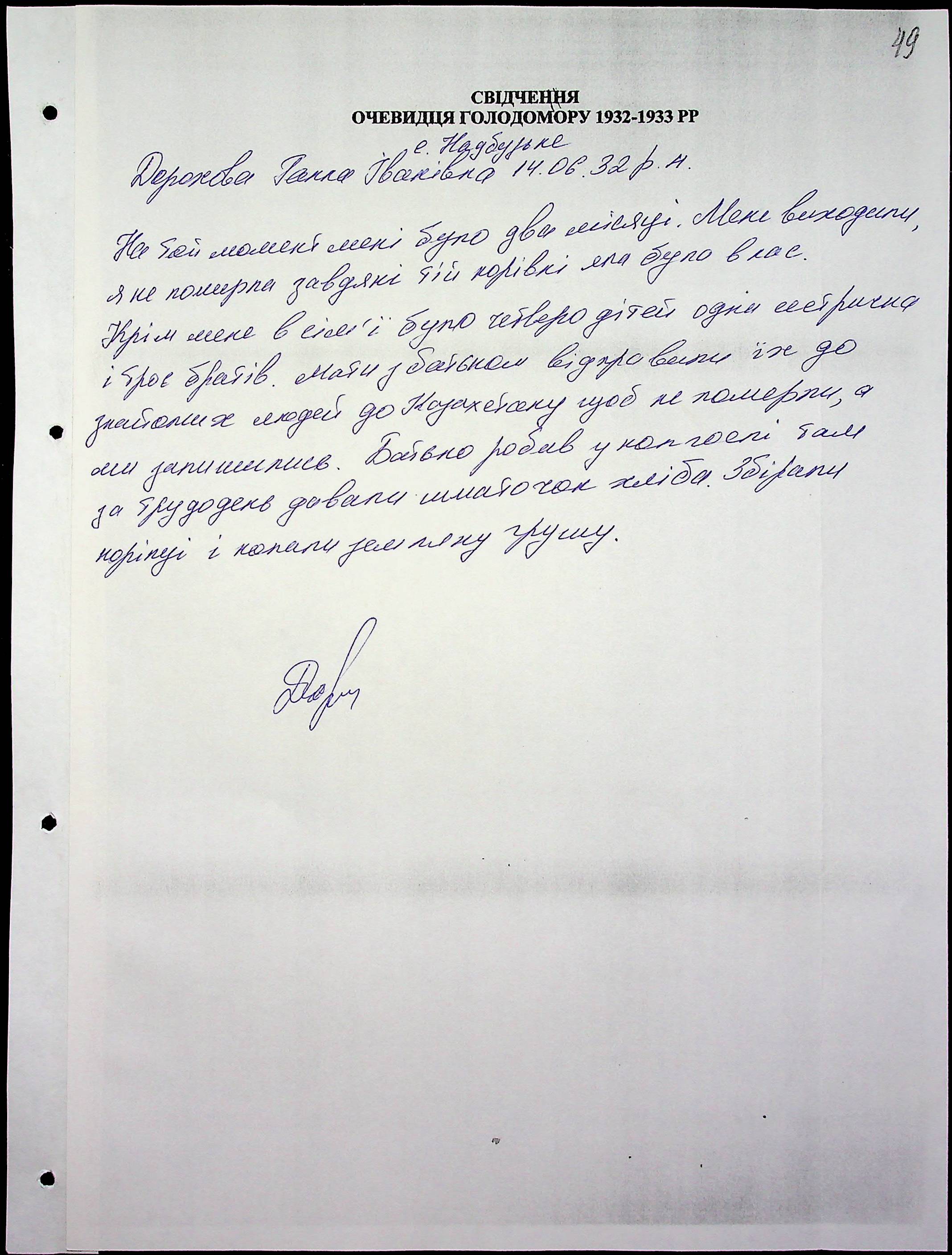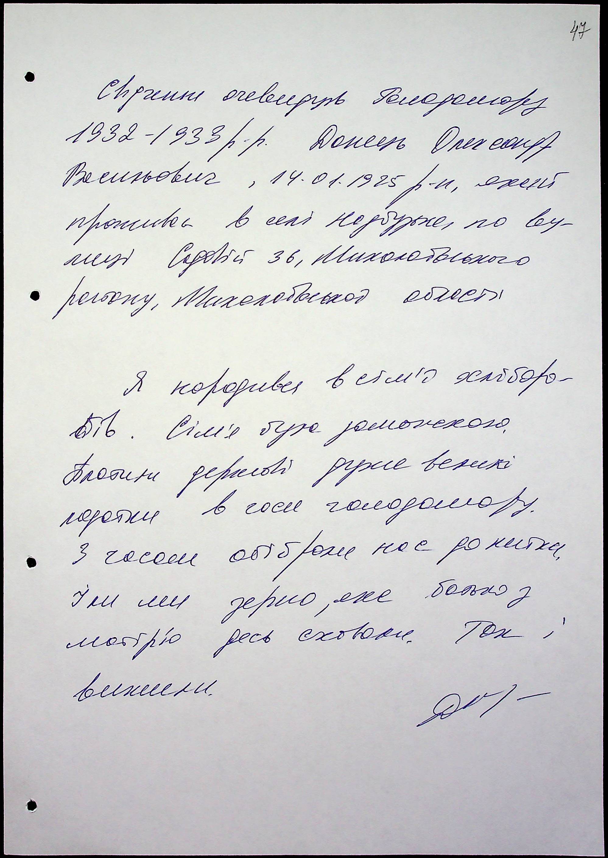 • • • • Справа № 47 “Свідчення очевидців Голодомору 1932-1933 років, які проживають у Миколаївському районі, з прізвищами на літери Д–І”