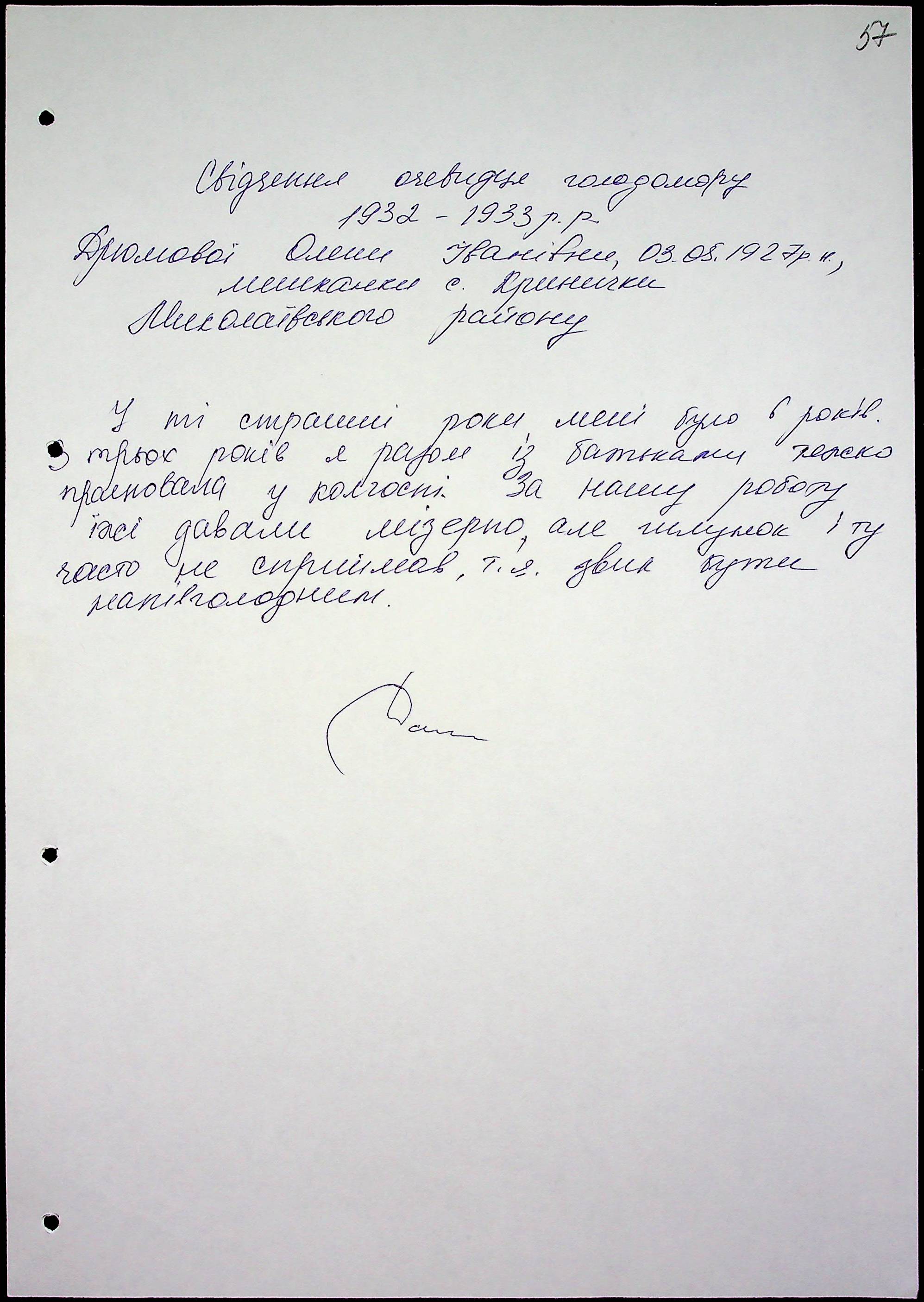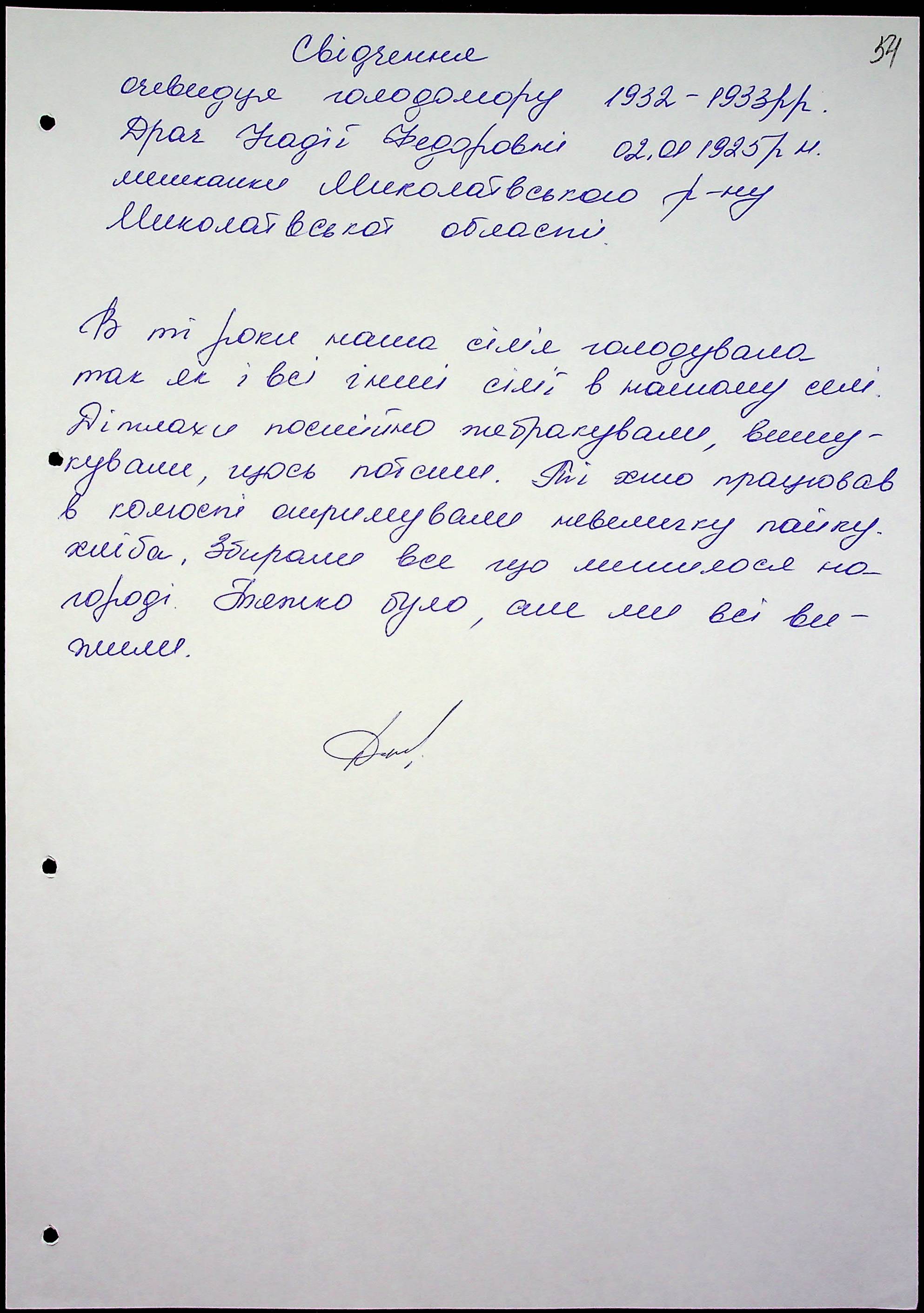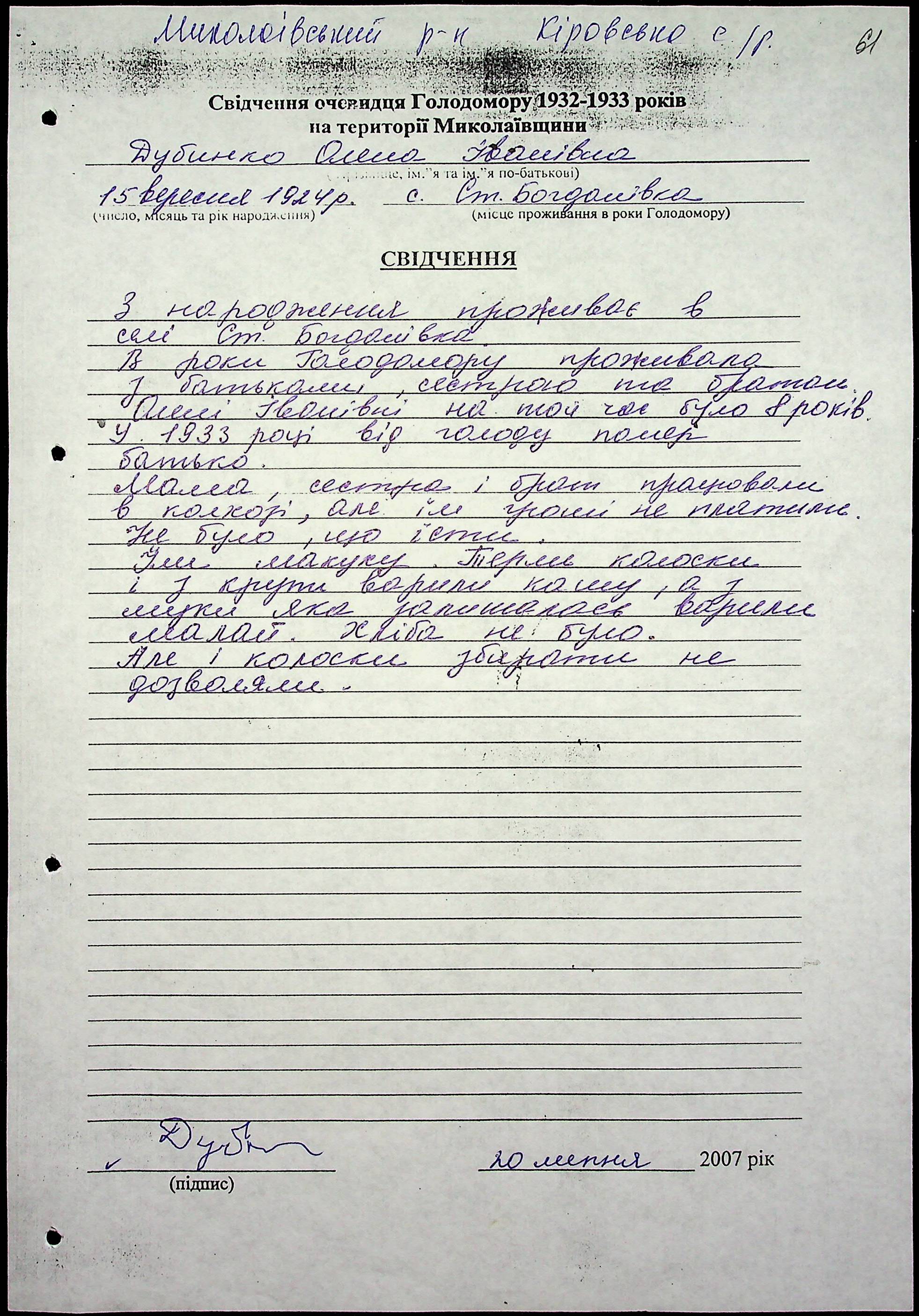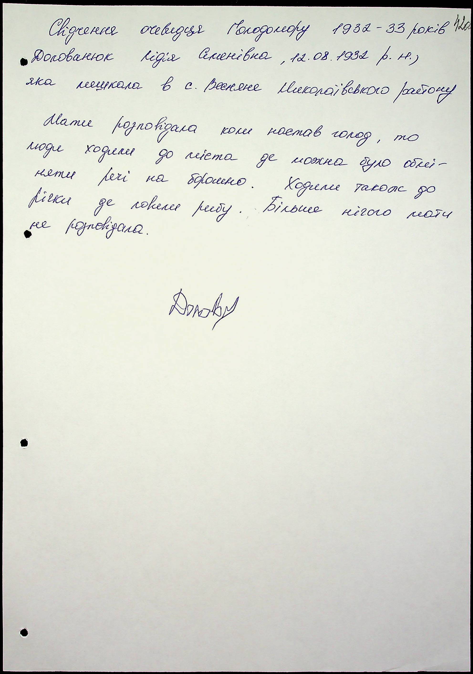 • • • • Справа № 47 “Свідчення очевидців Голодомору 1932-1933 років, які проживають у Миколаївському районі, з прізвищами на літери Д–І”