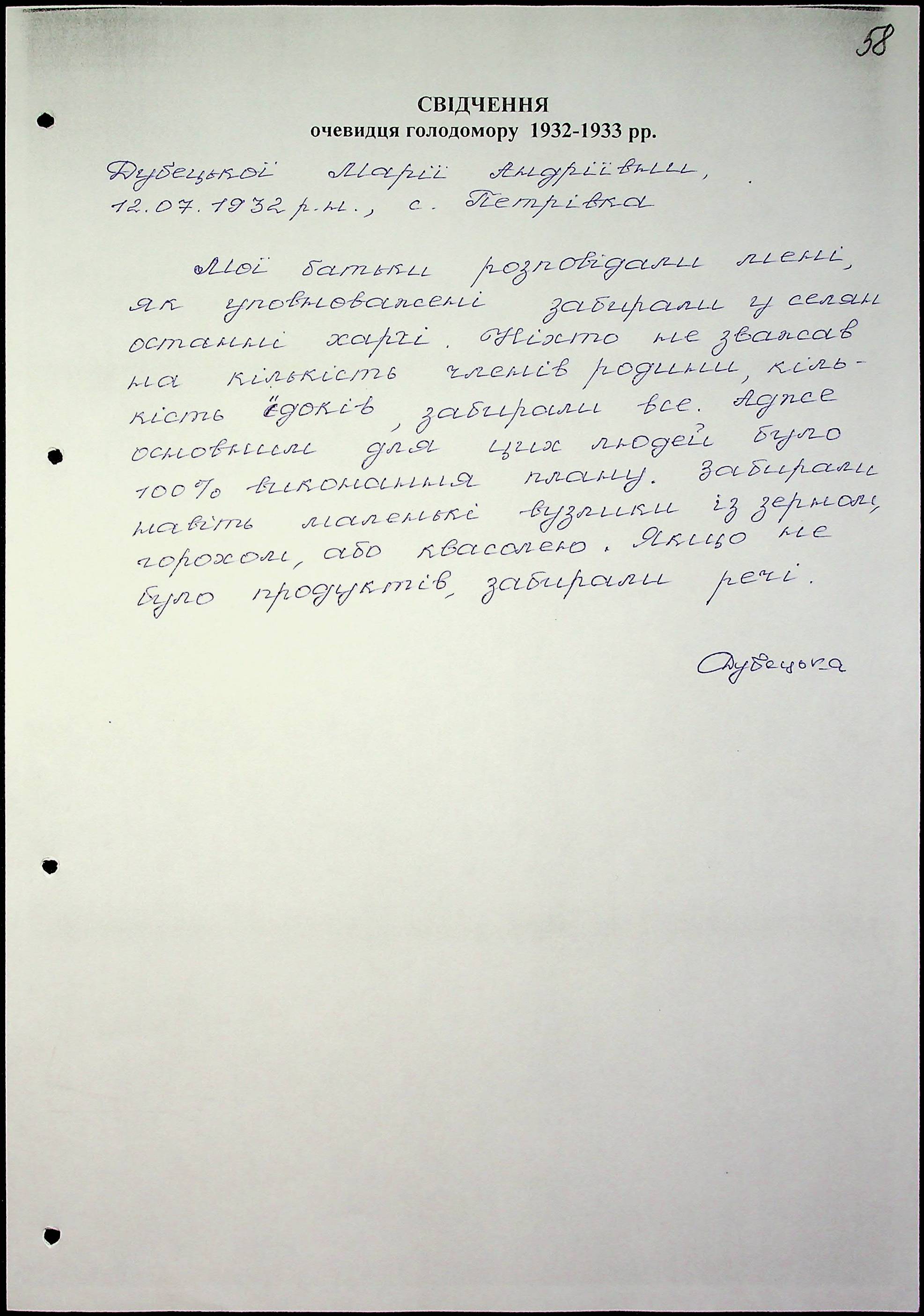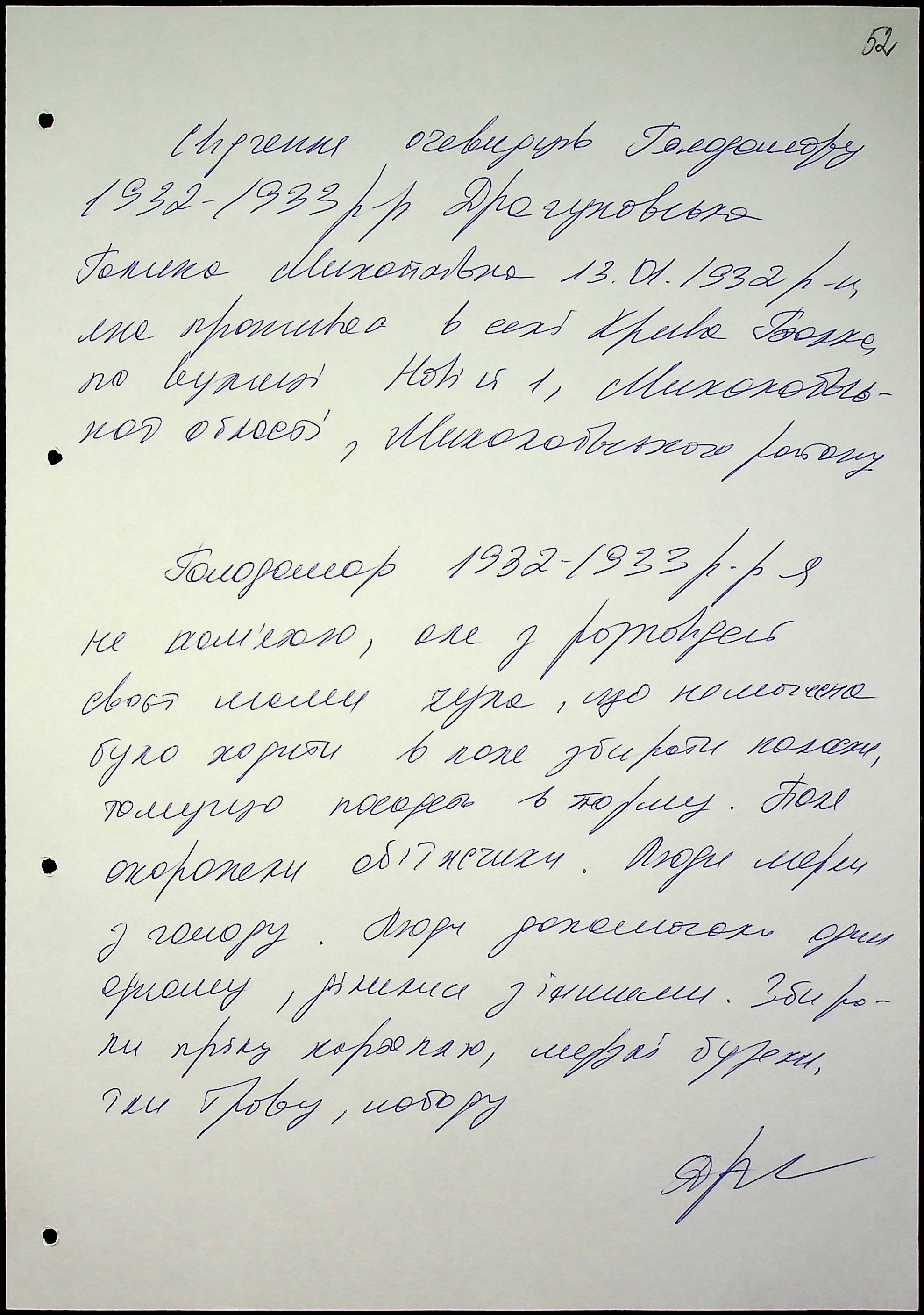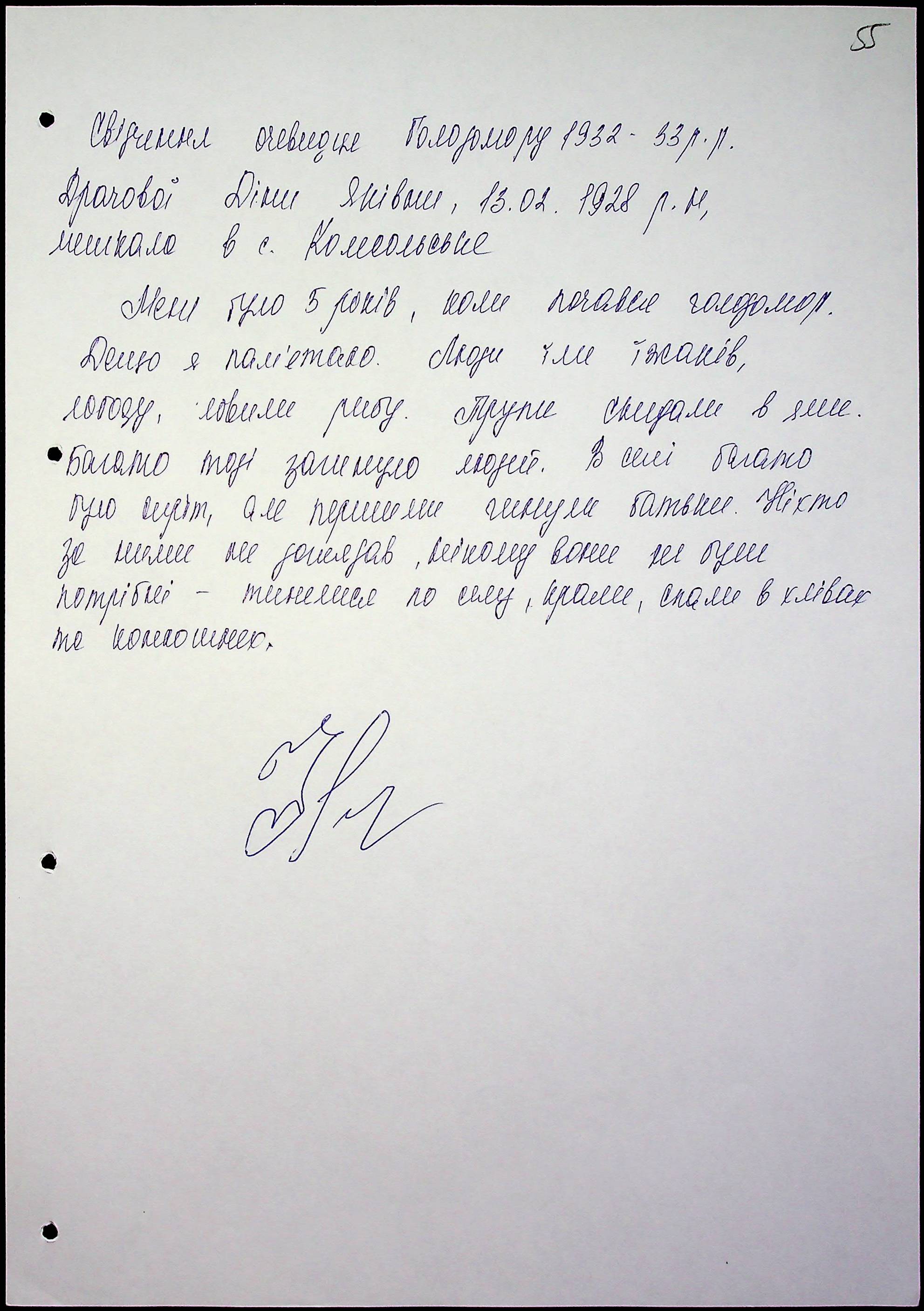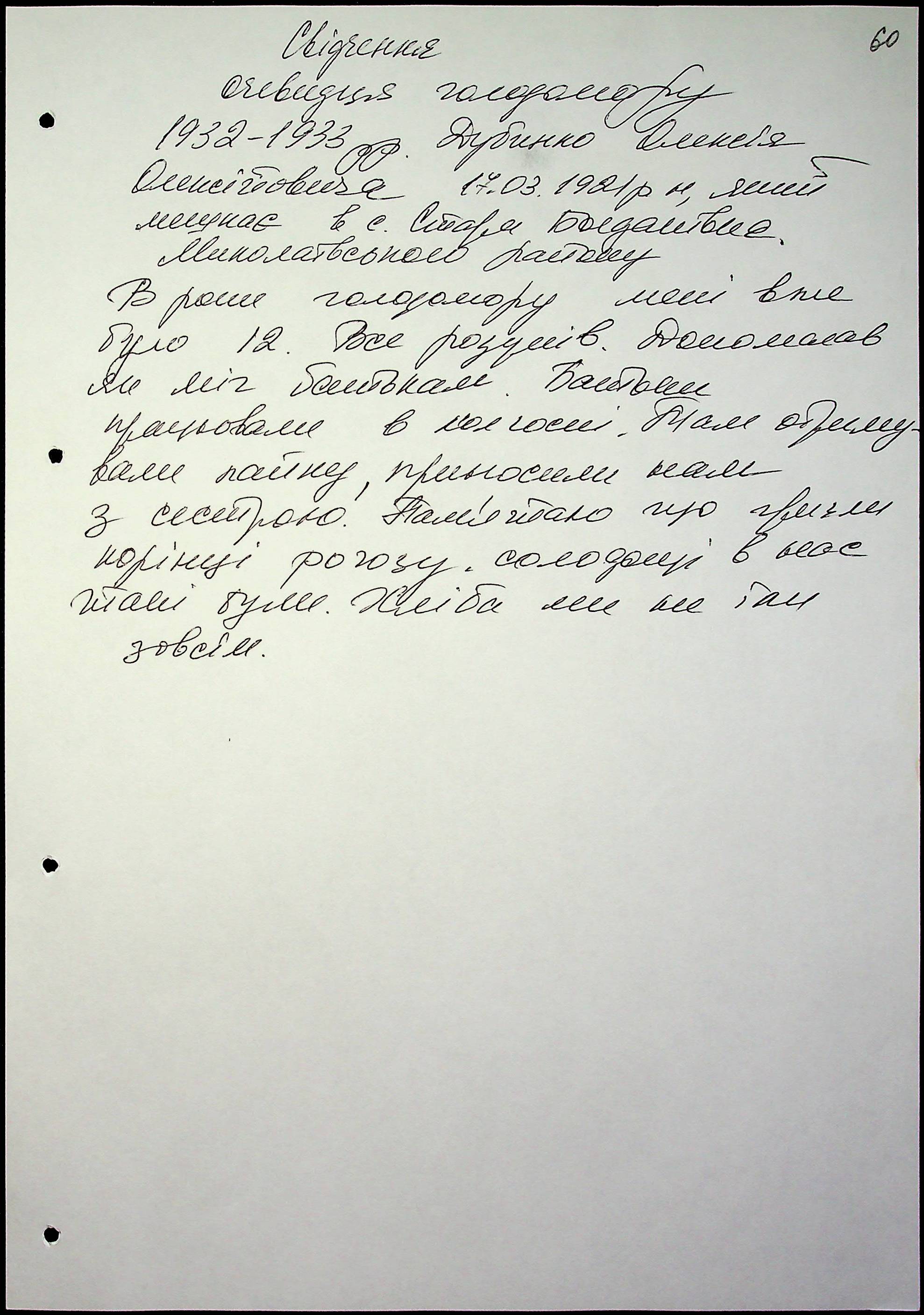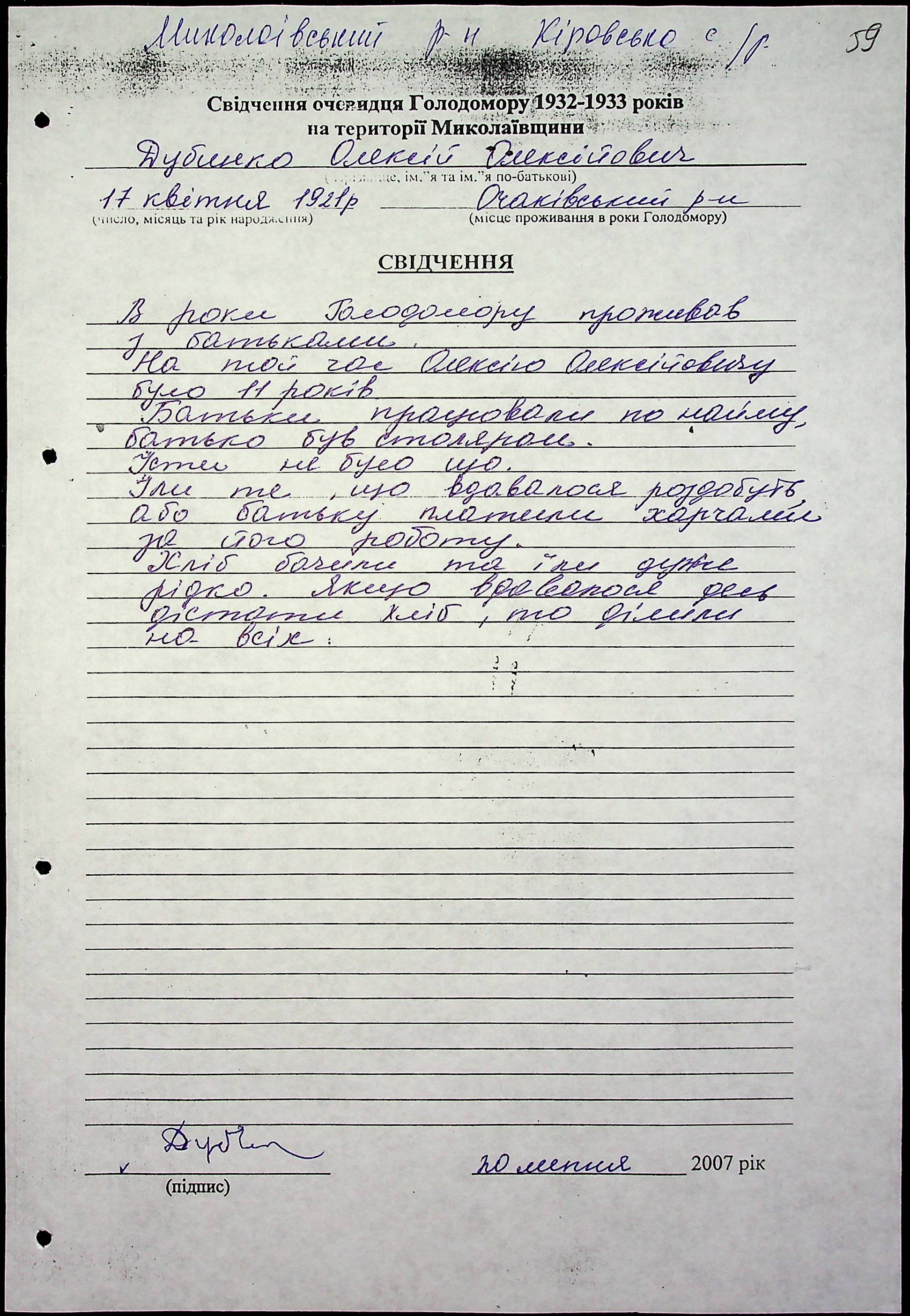 • • • • Справа № 47 “Свідчення очевидців Голодомору 1932-1933 років, які проживають у Миколаївському районі, з прізвищами на літери Д–І”