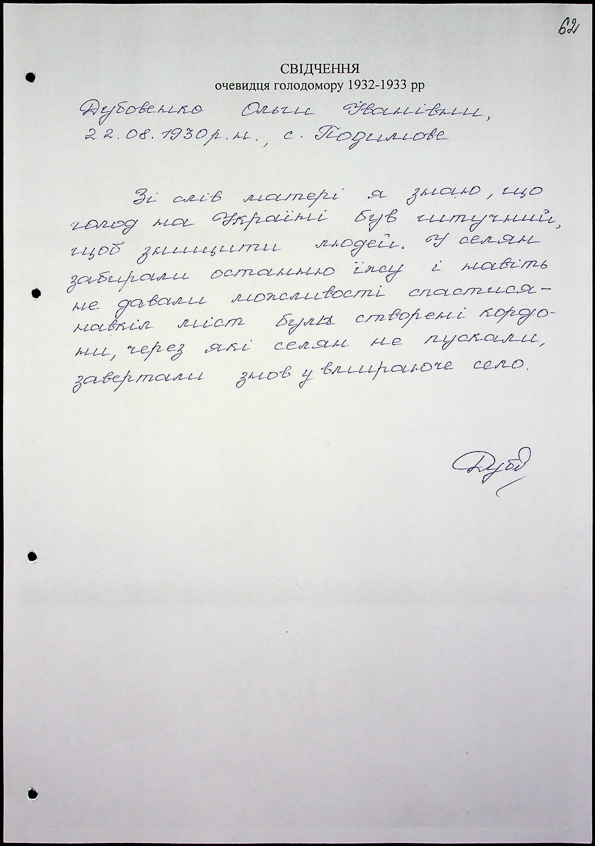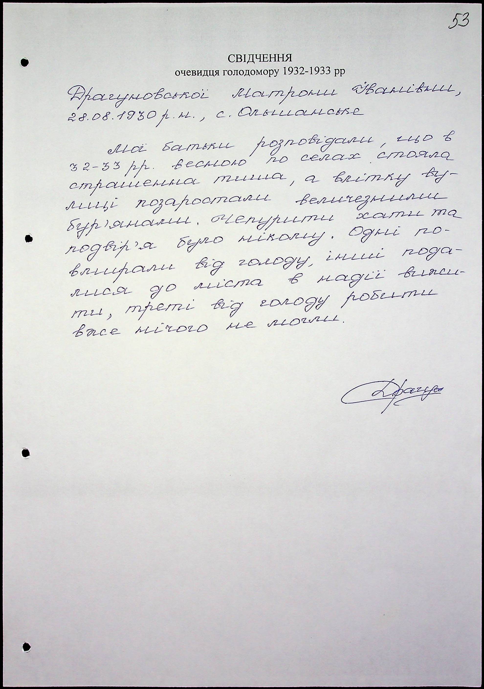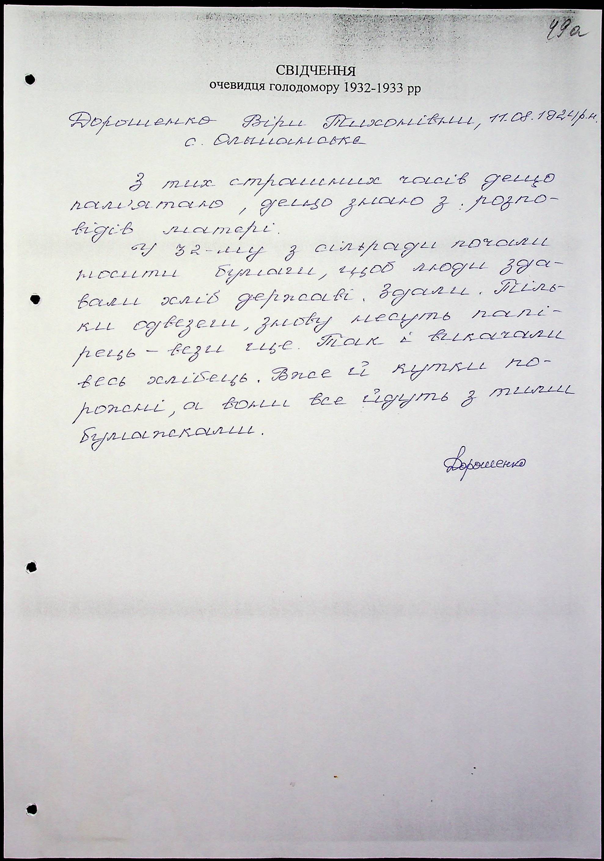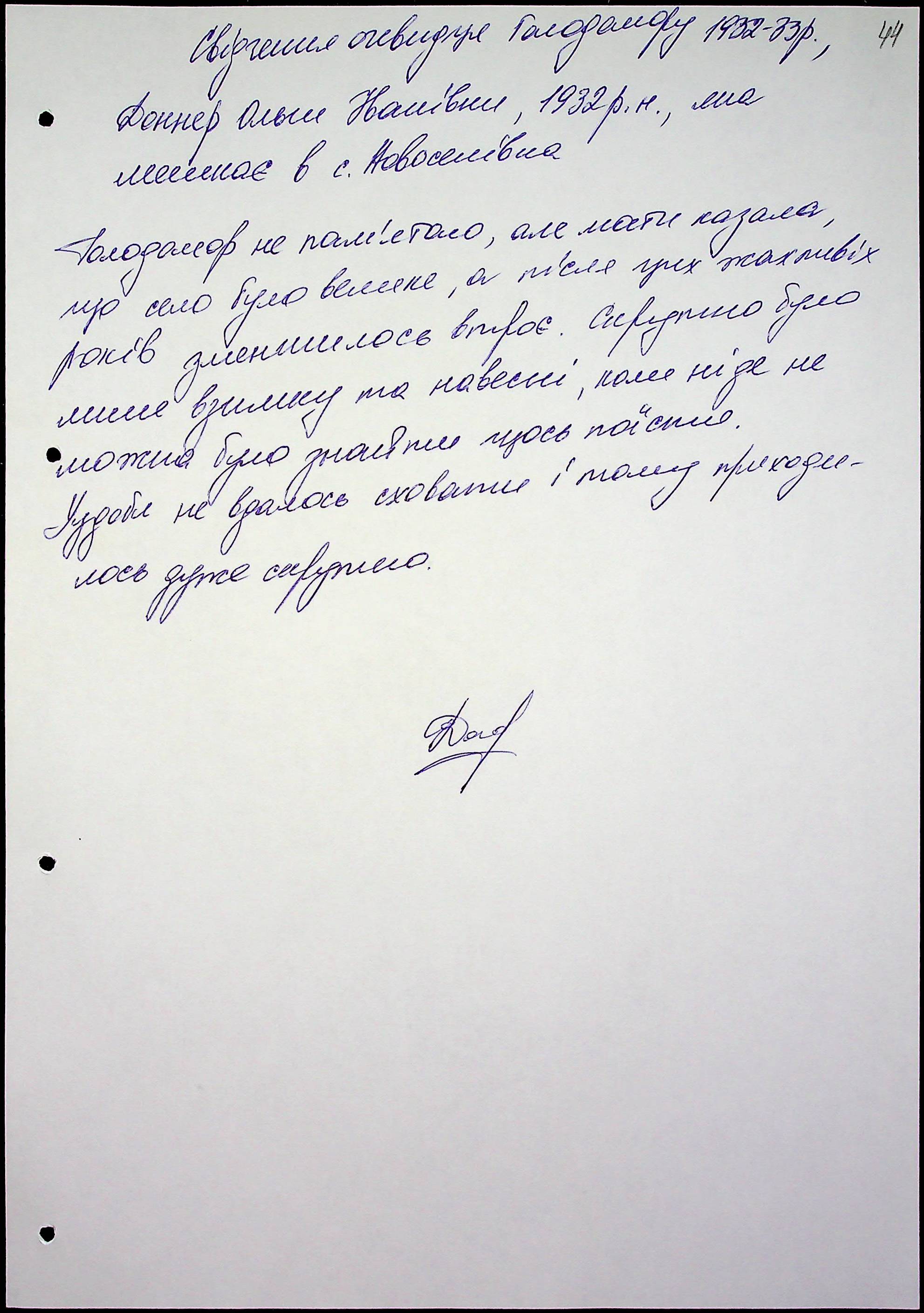 • • • • Справа № 47 “Свідчення очевидців Голодомору 1932-1933 років, які проживають у Миколаївському районі, з прізвищами на літери Д–І”