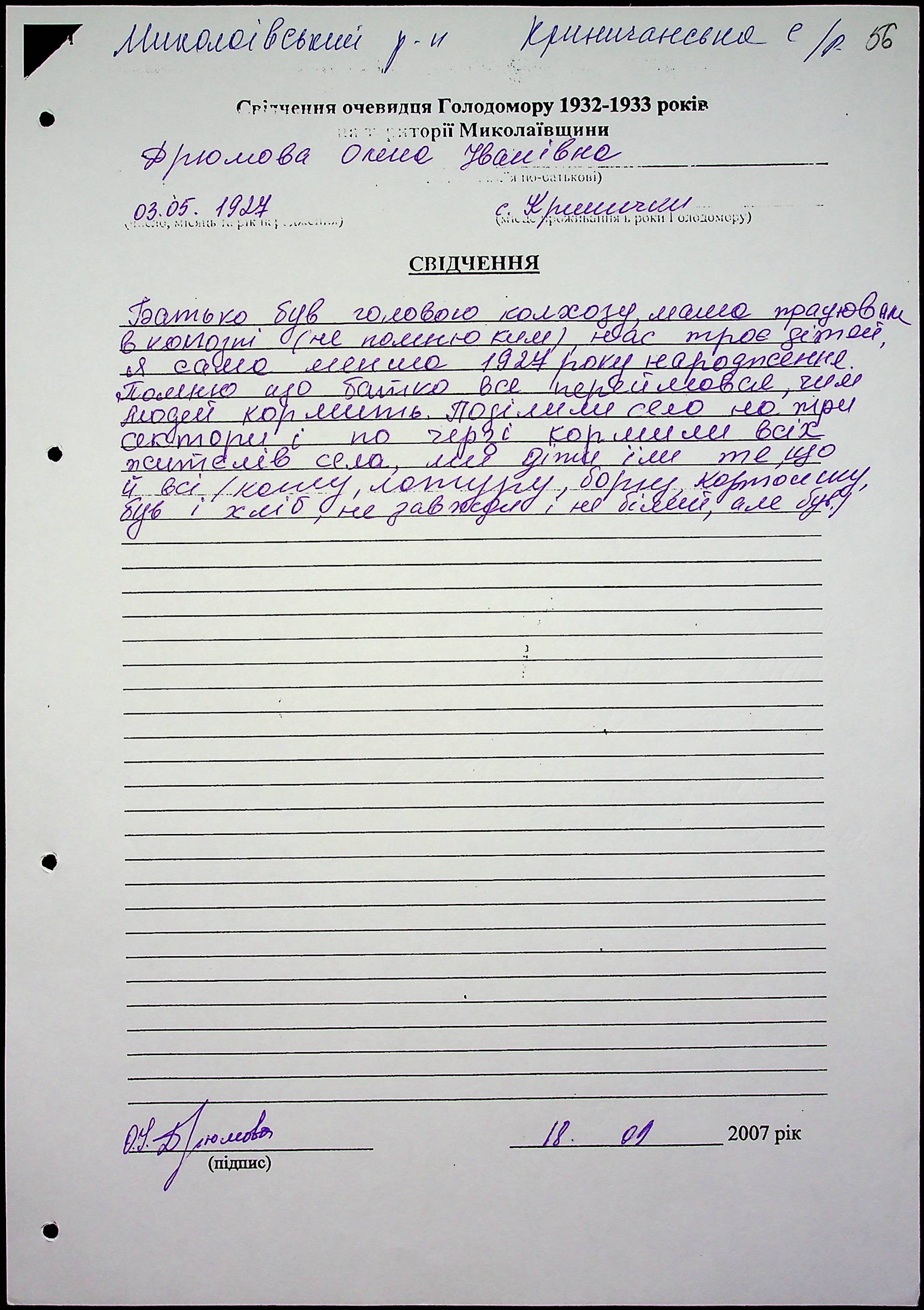 ◦ ◦ Фонд № 6146 “Колекція свідчень очевидців Голодомору 1932-1933 рр., нині проживаючих у Миколаївській області”