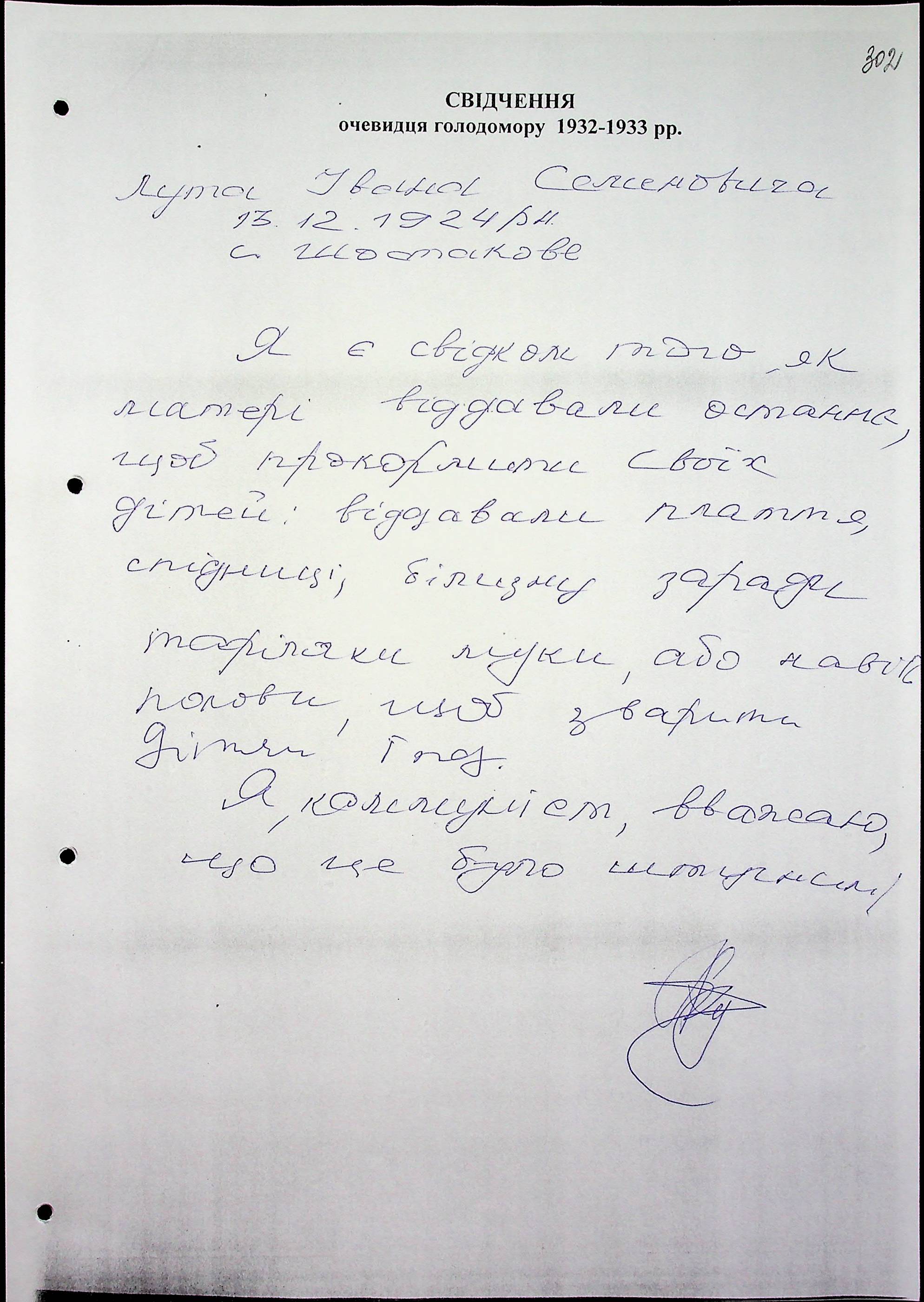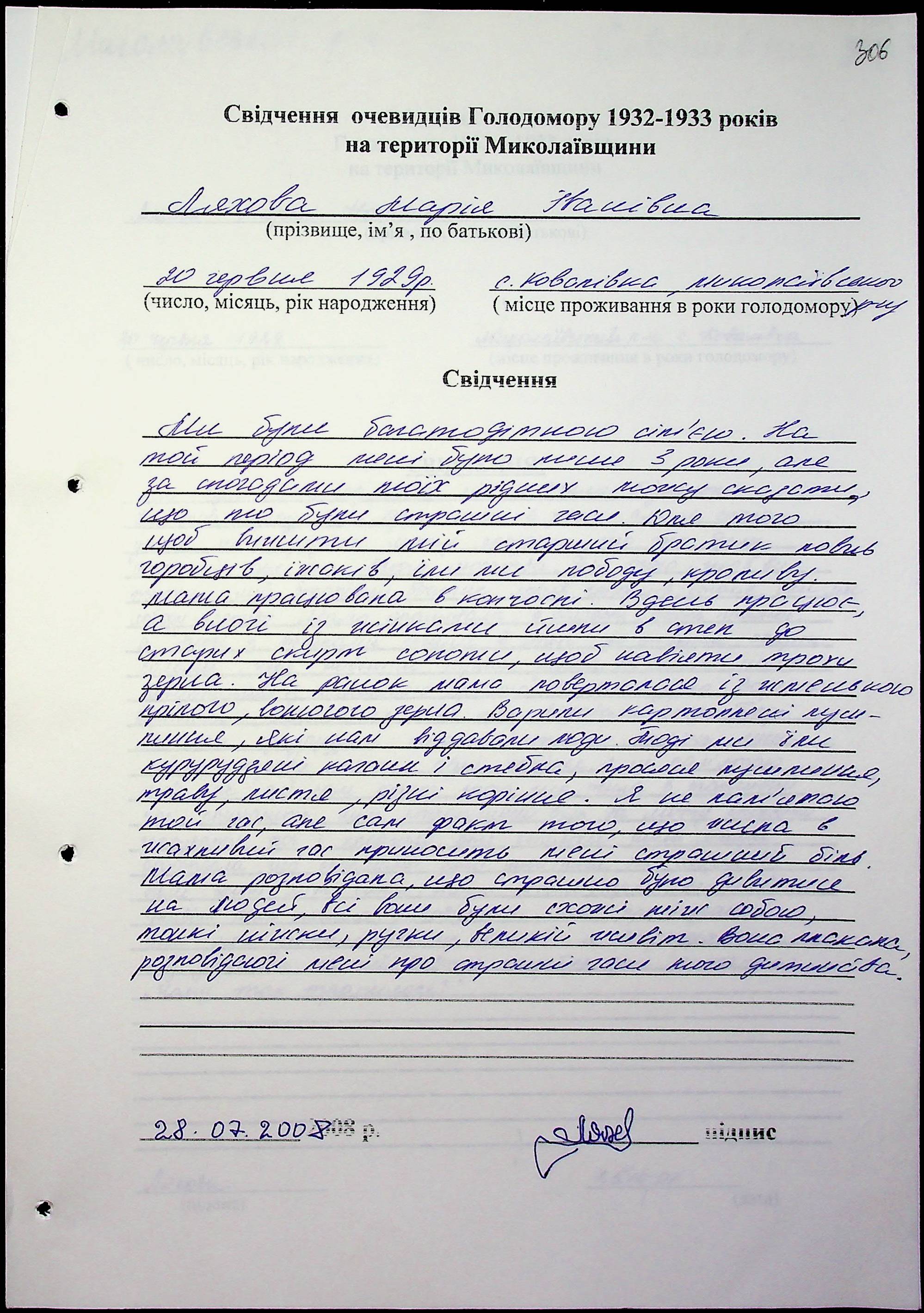 ◦ ◦ Фонд № 6146 “Колекція свідчень очевидців Голодомору 1932-1933 рр., нині проживаючих у Миколаївській області”