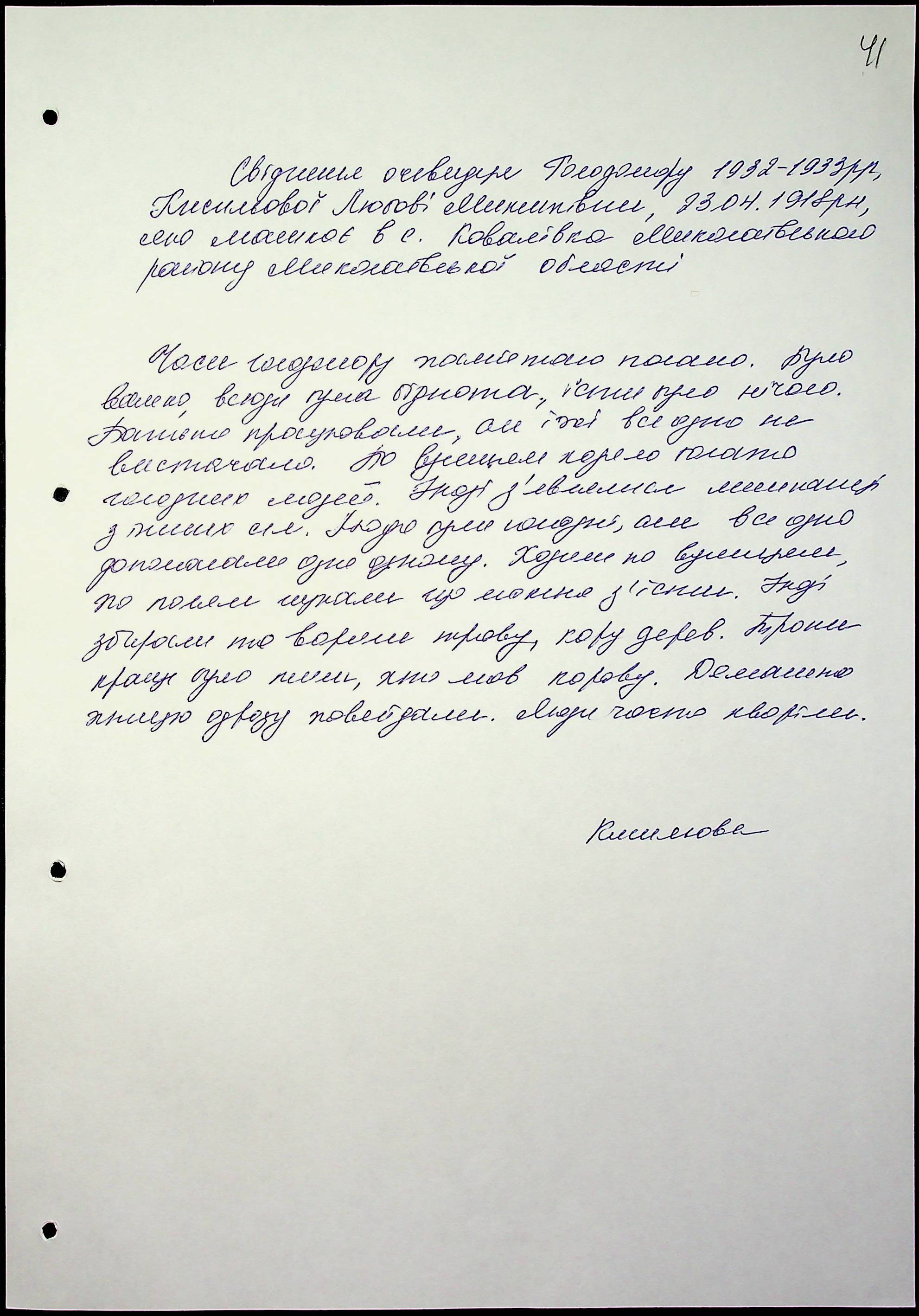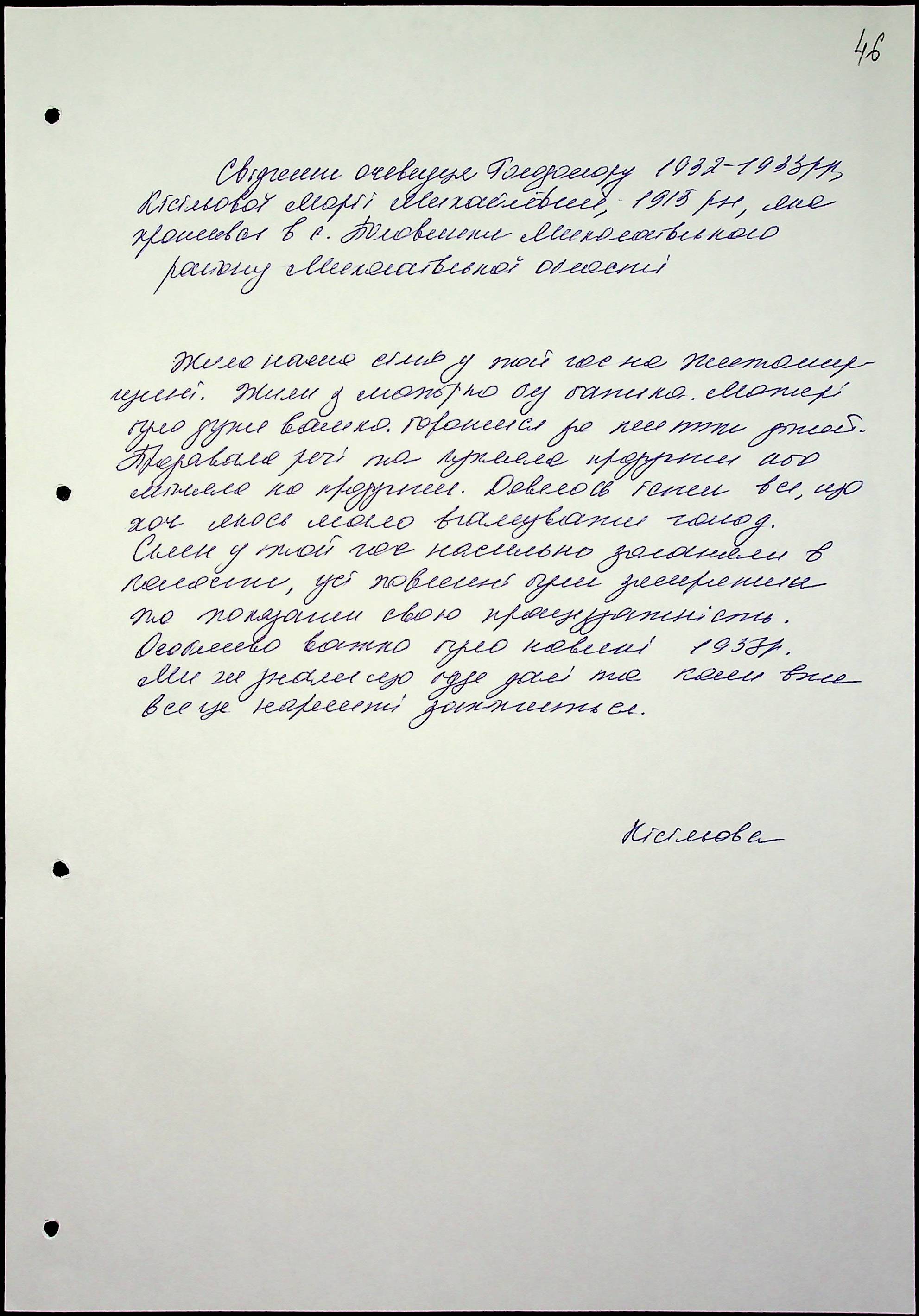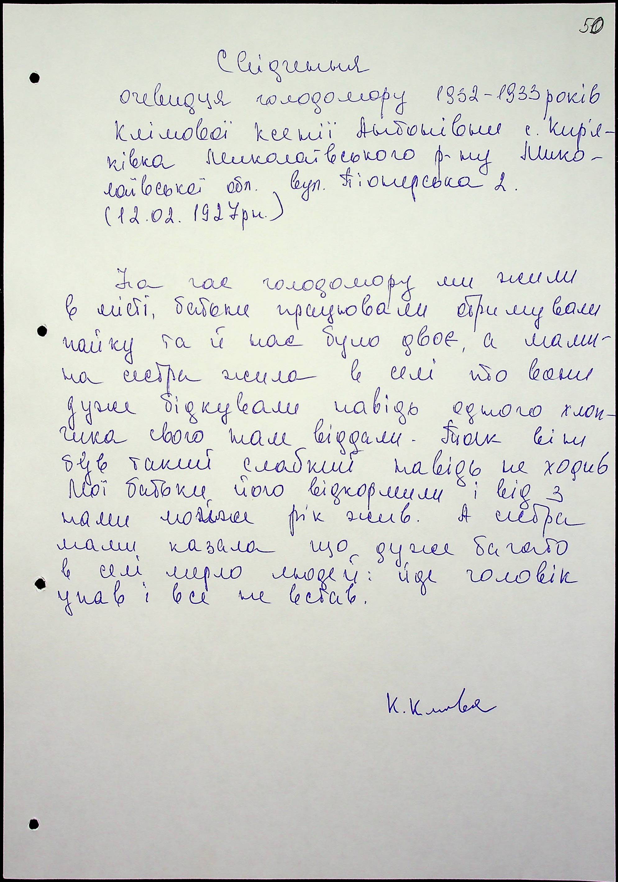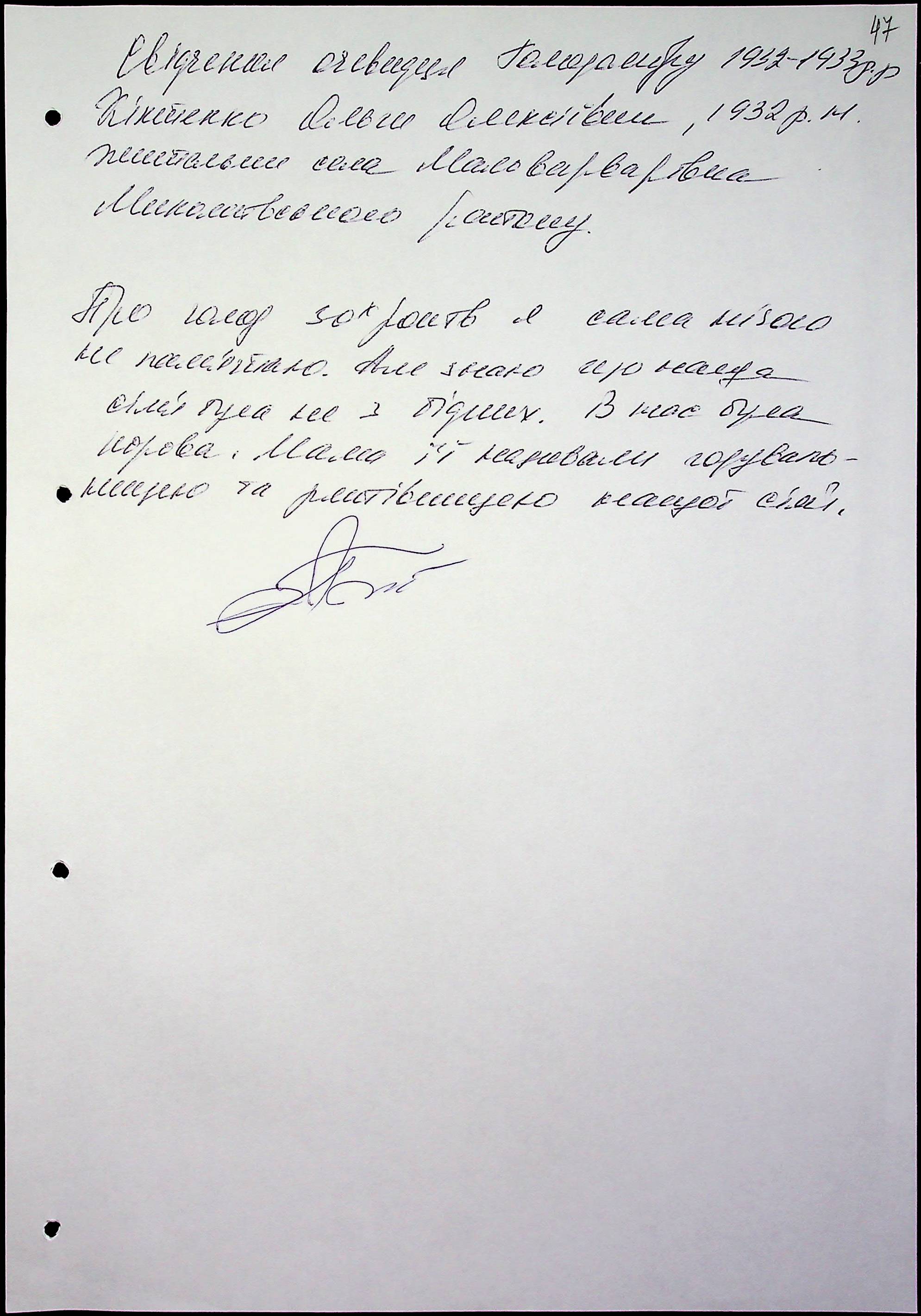 • • • • Справа № 48 “Свідчення очевидців Голодомору 1932-1933 років, які проживають у Миколаївському районі, з прізвищами на літери К–Л”