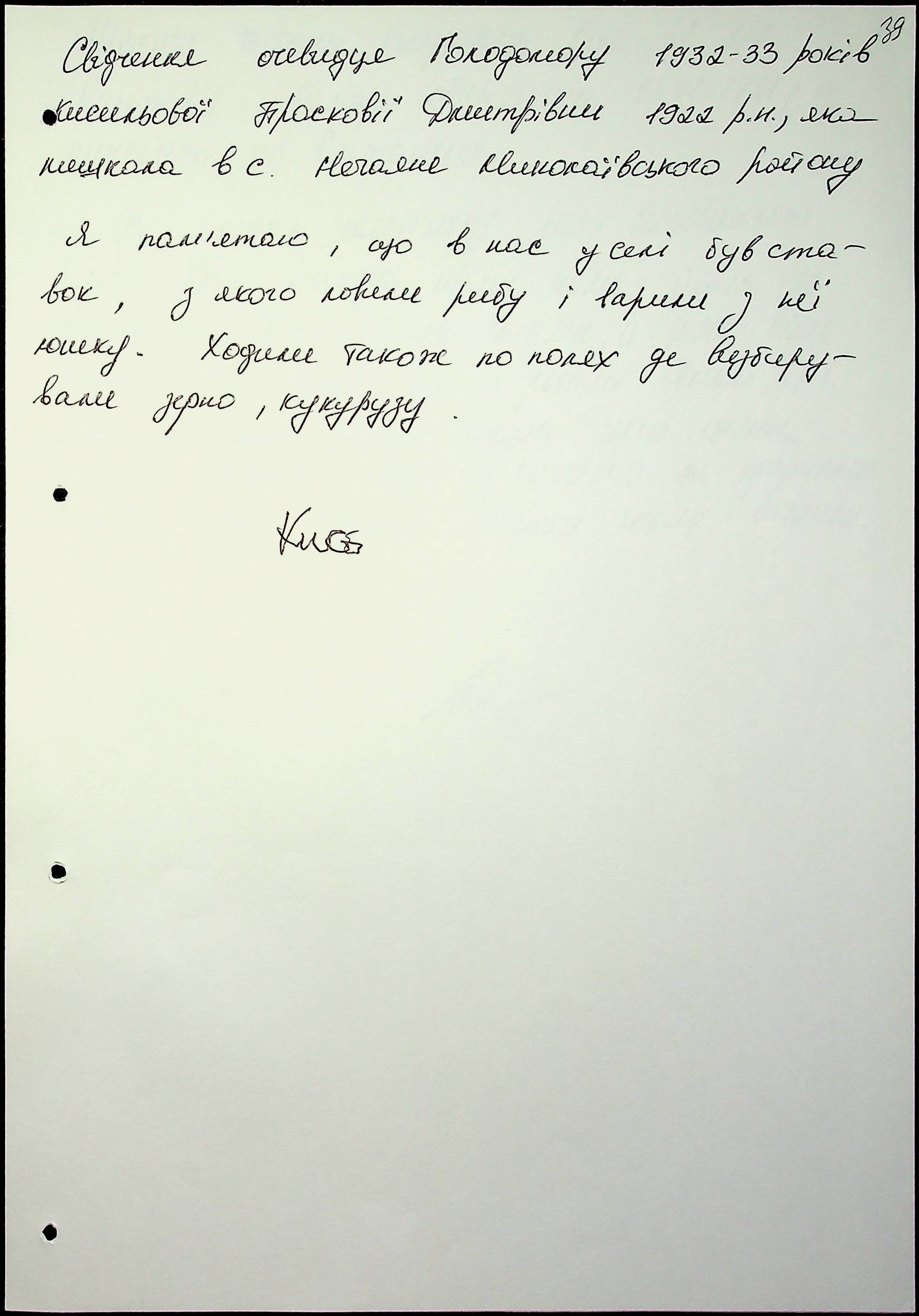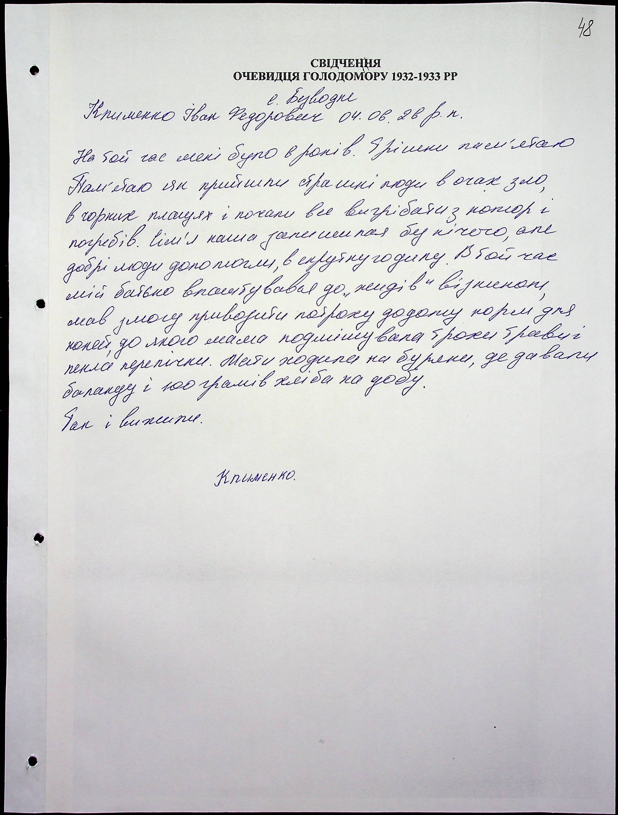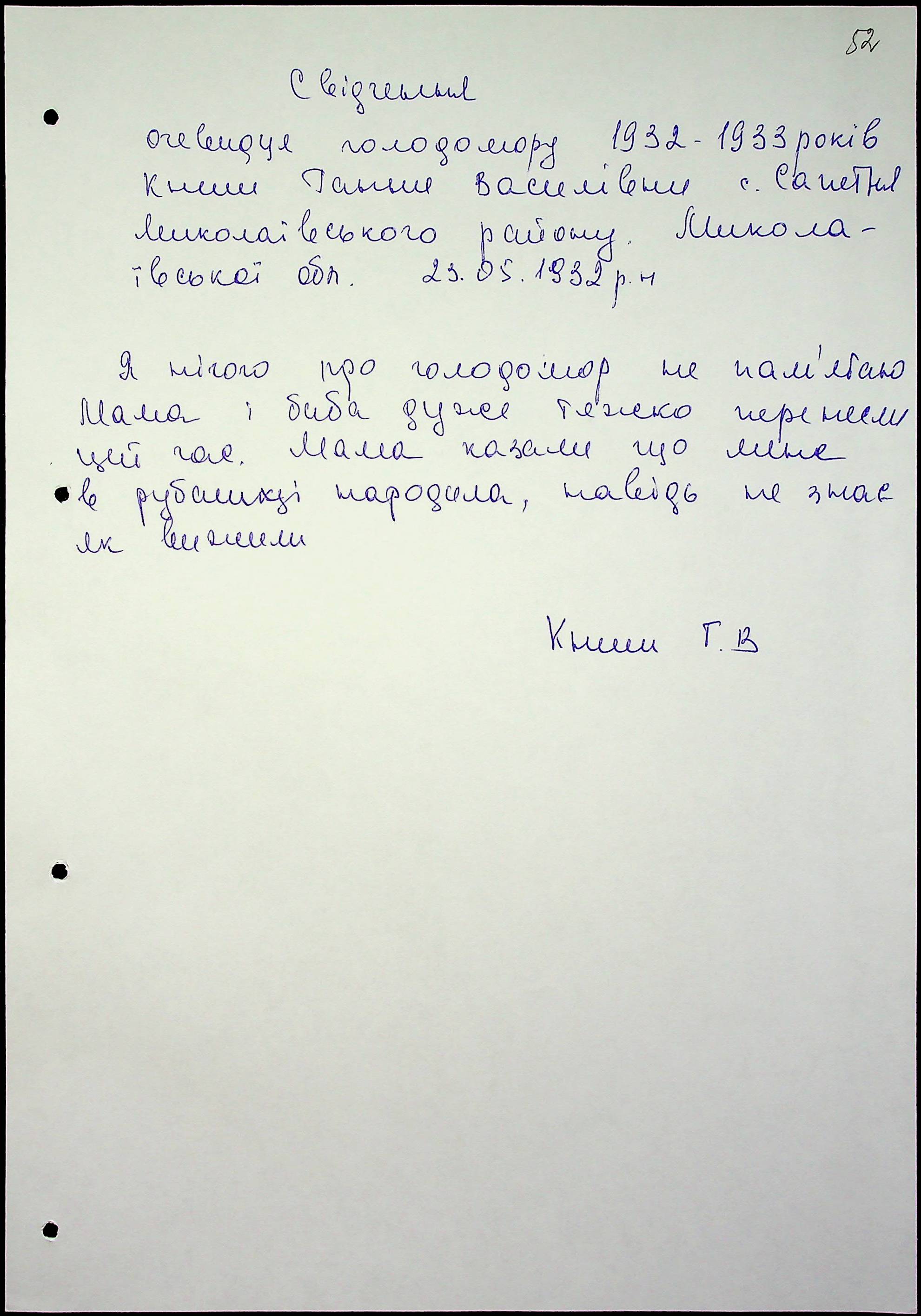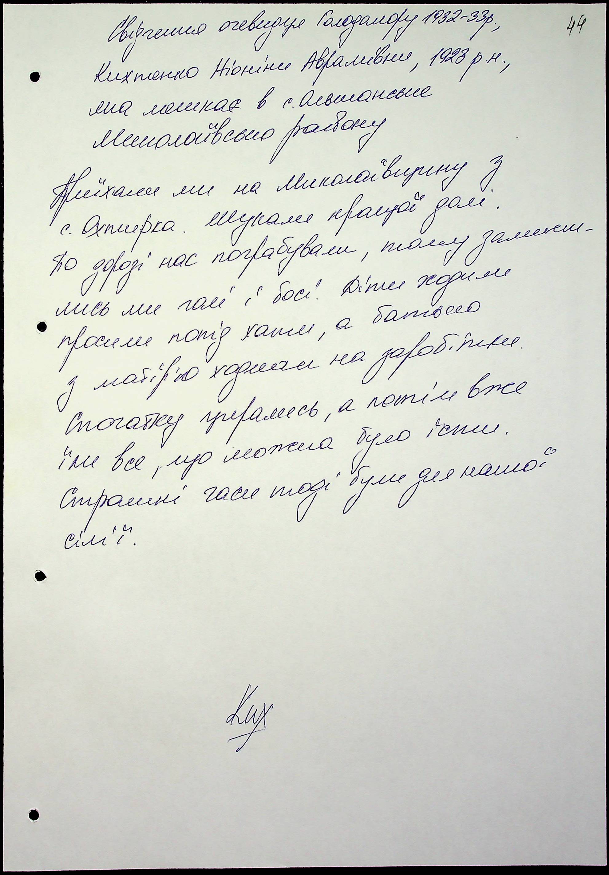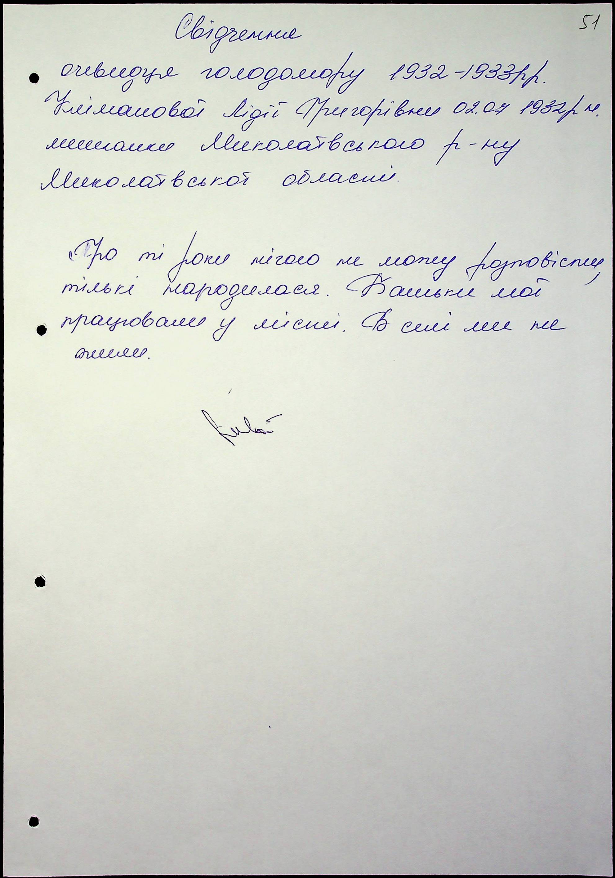 • • • • Справа № 48 “Свідчення очевидців Голодомору 1932-1933 років, які проживають у Миколаївському районі, з прізвищами на літери К–Л”