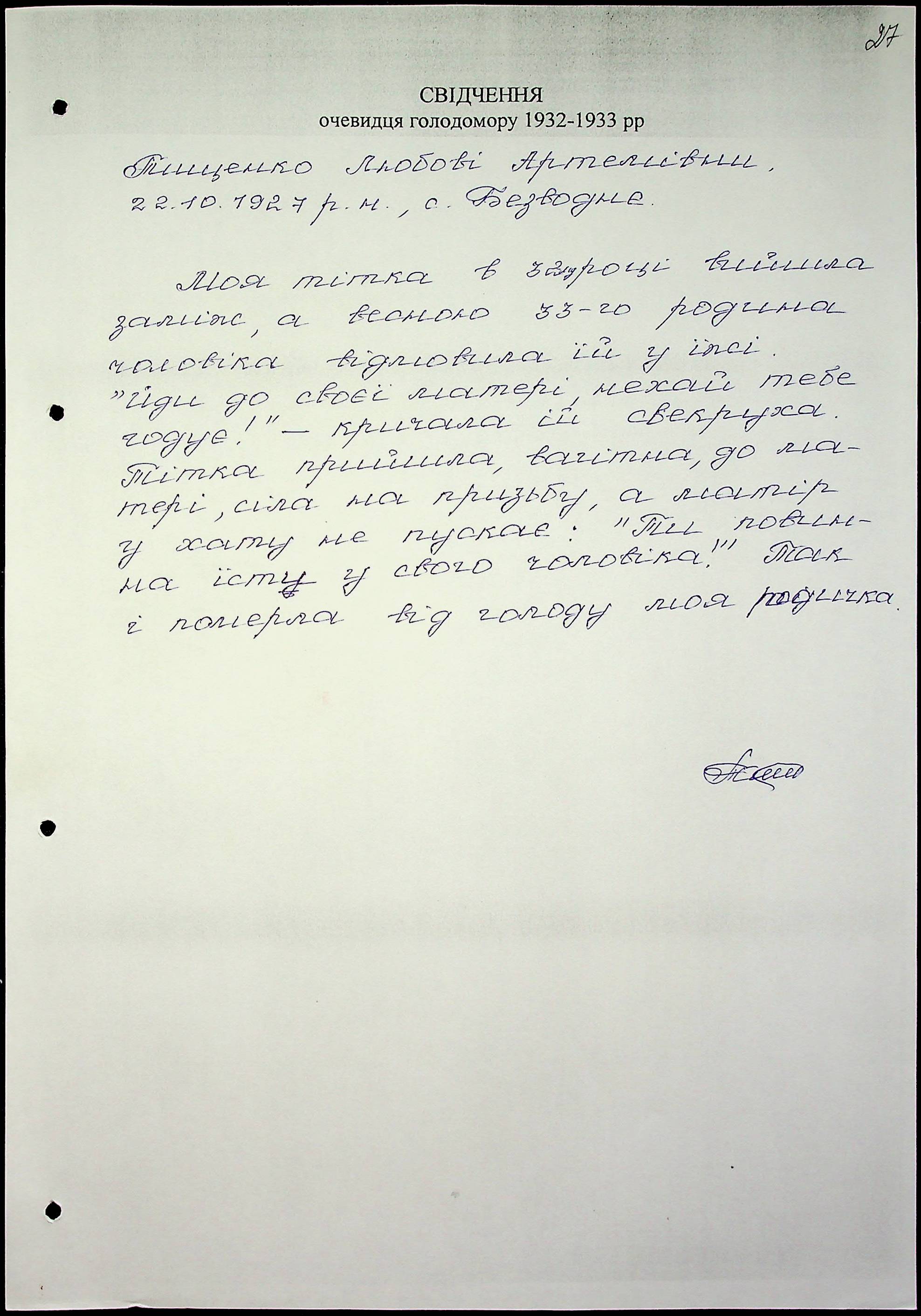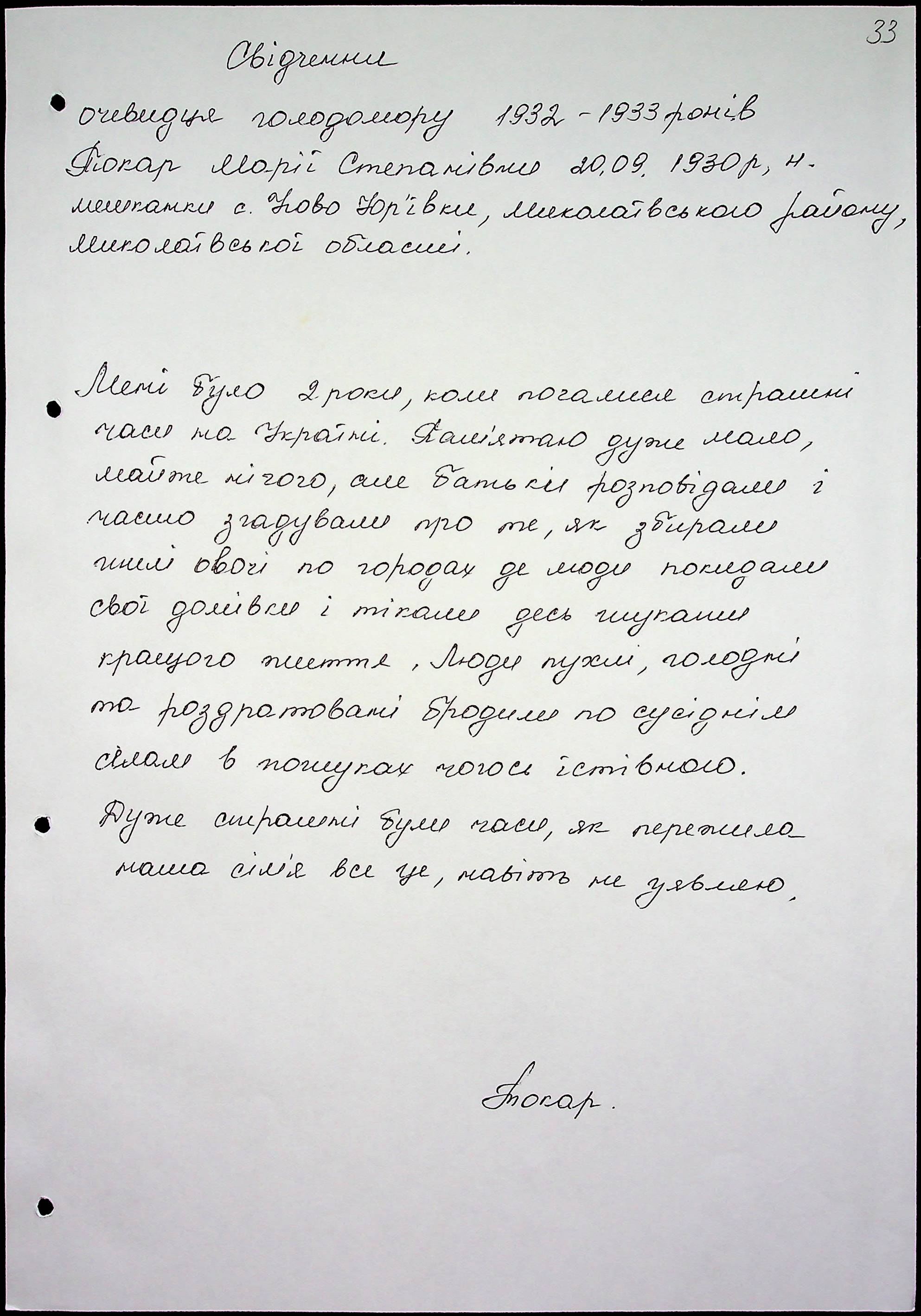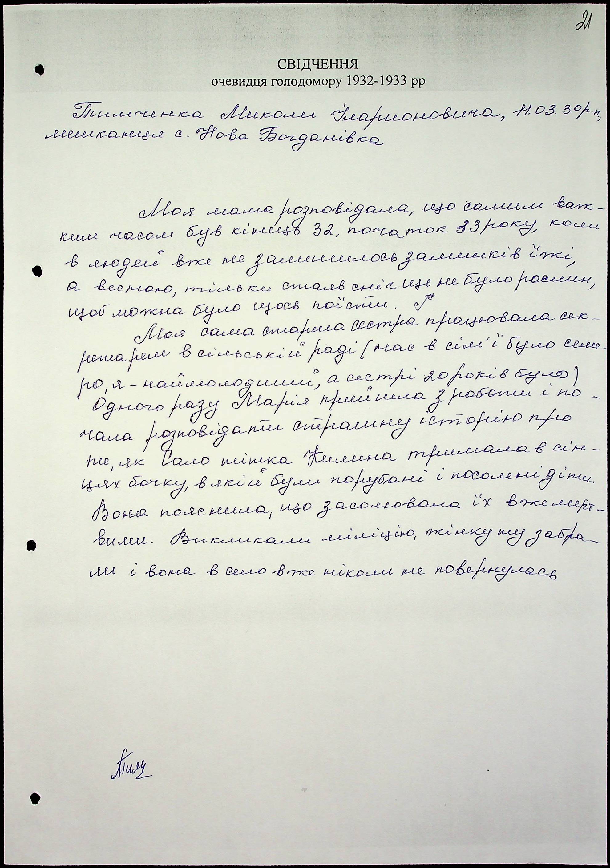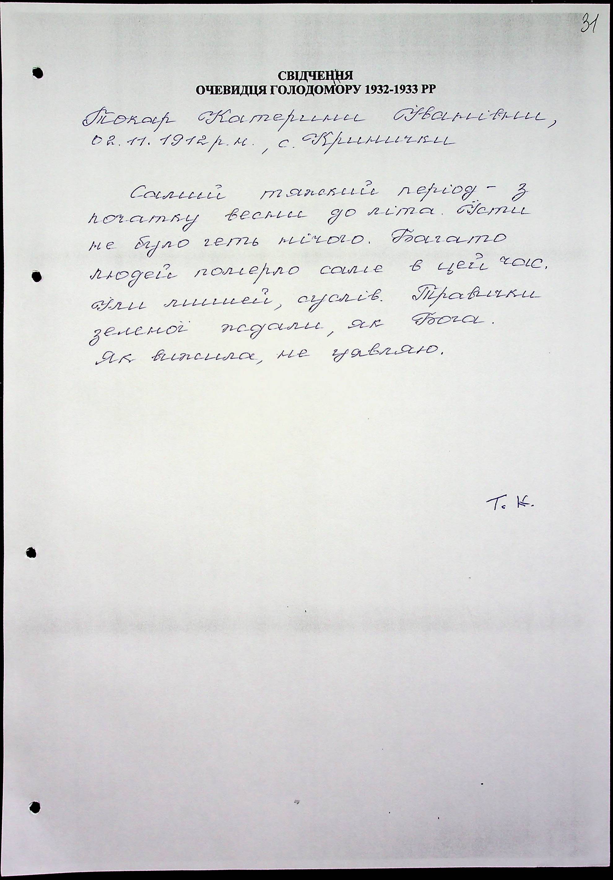• • • • Справа № 51 “Свідчення очевидців Голодомору 1932-1933 років, які проживають у Миколаївському районі, з прізвищами на літери Т–Я”