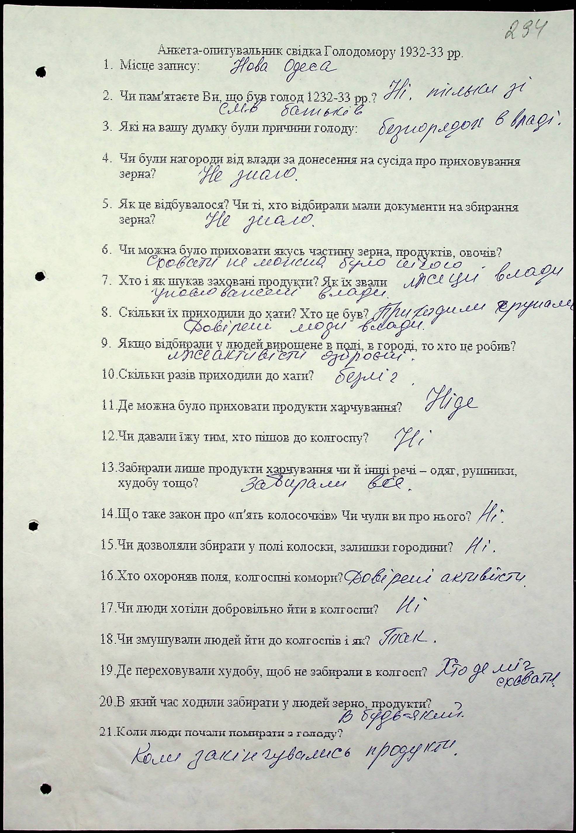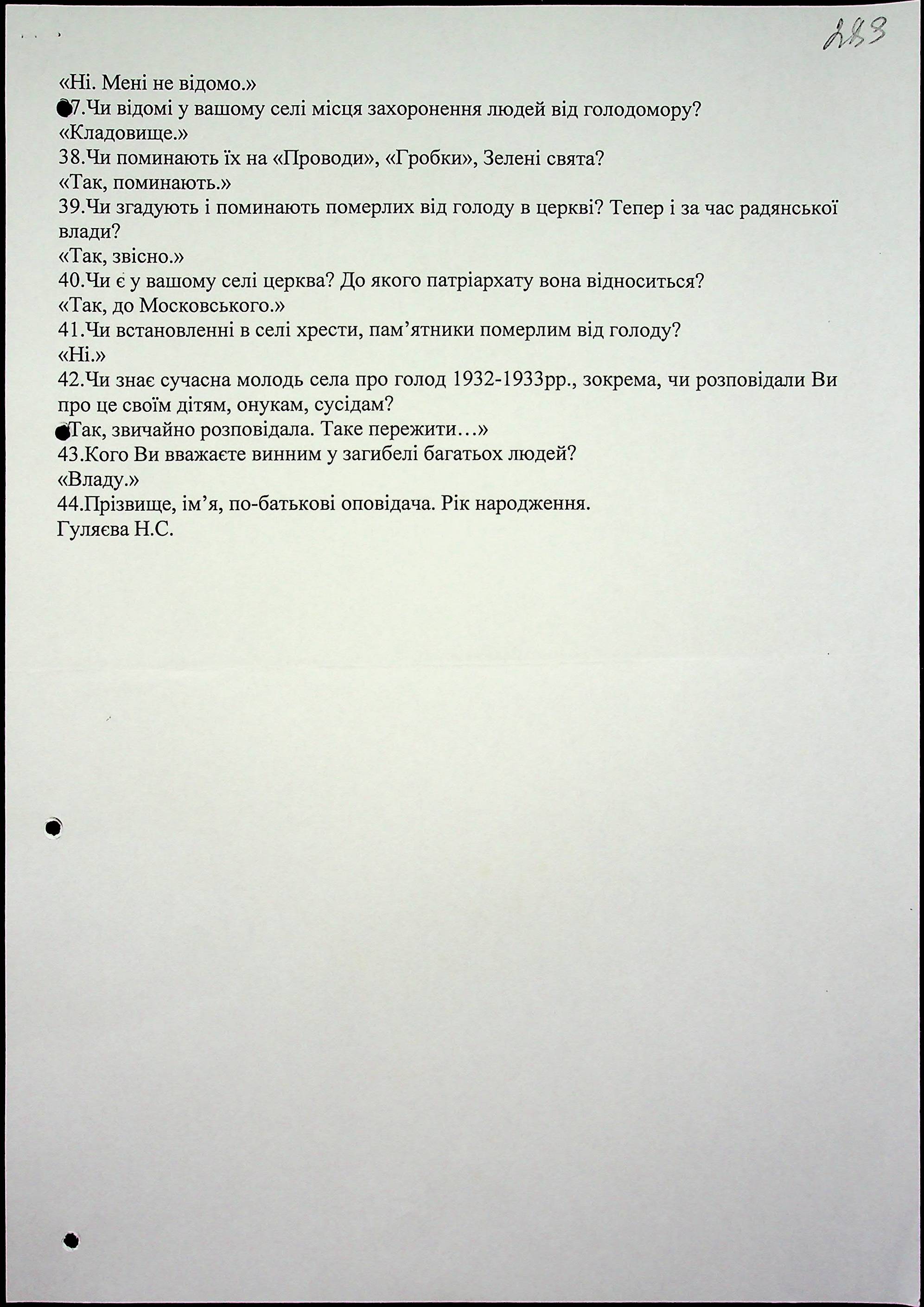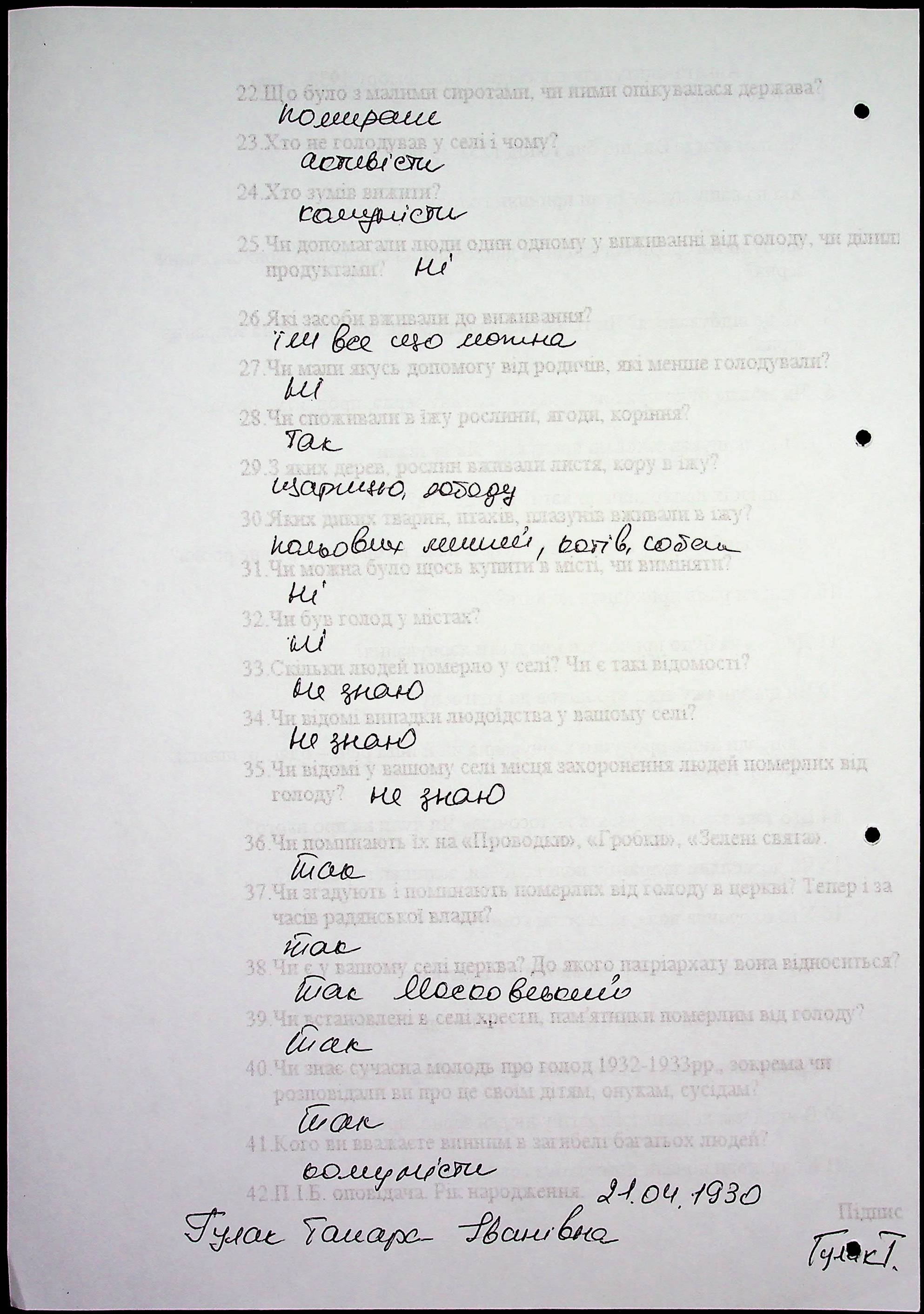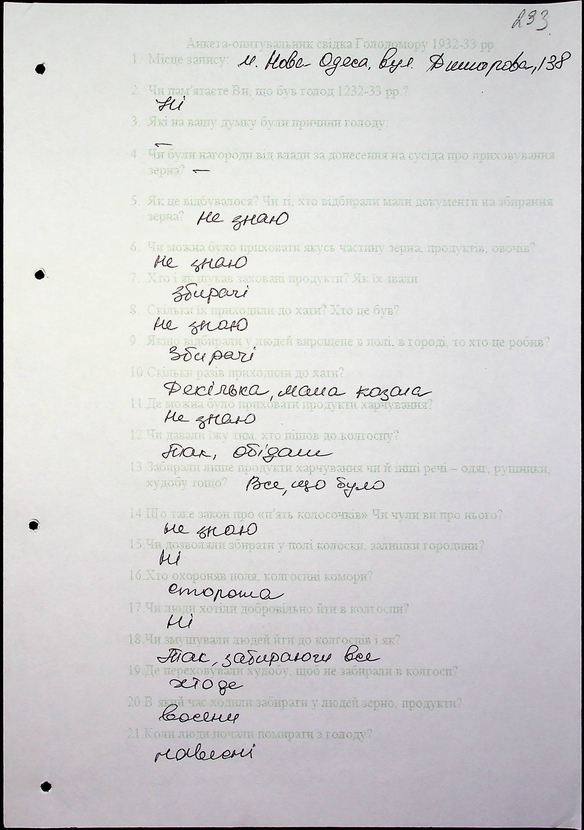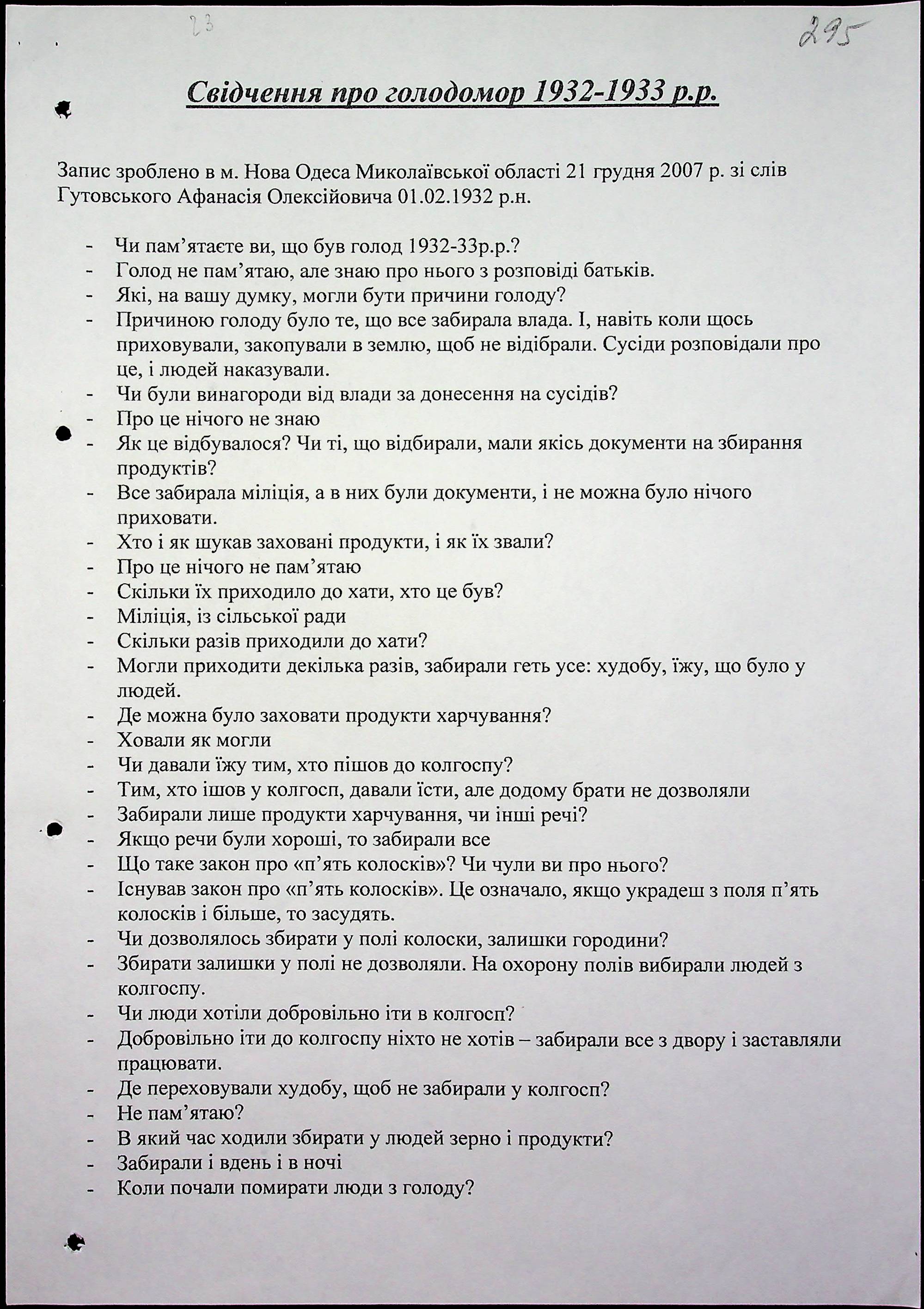 • • • • Справа № 53 “Свідчення очевидців Голодомору 1932-1933 років, які проживають у Новоодеському районі, з прізвищами на літери А–Г”