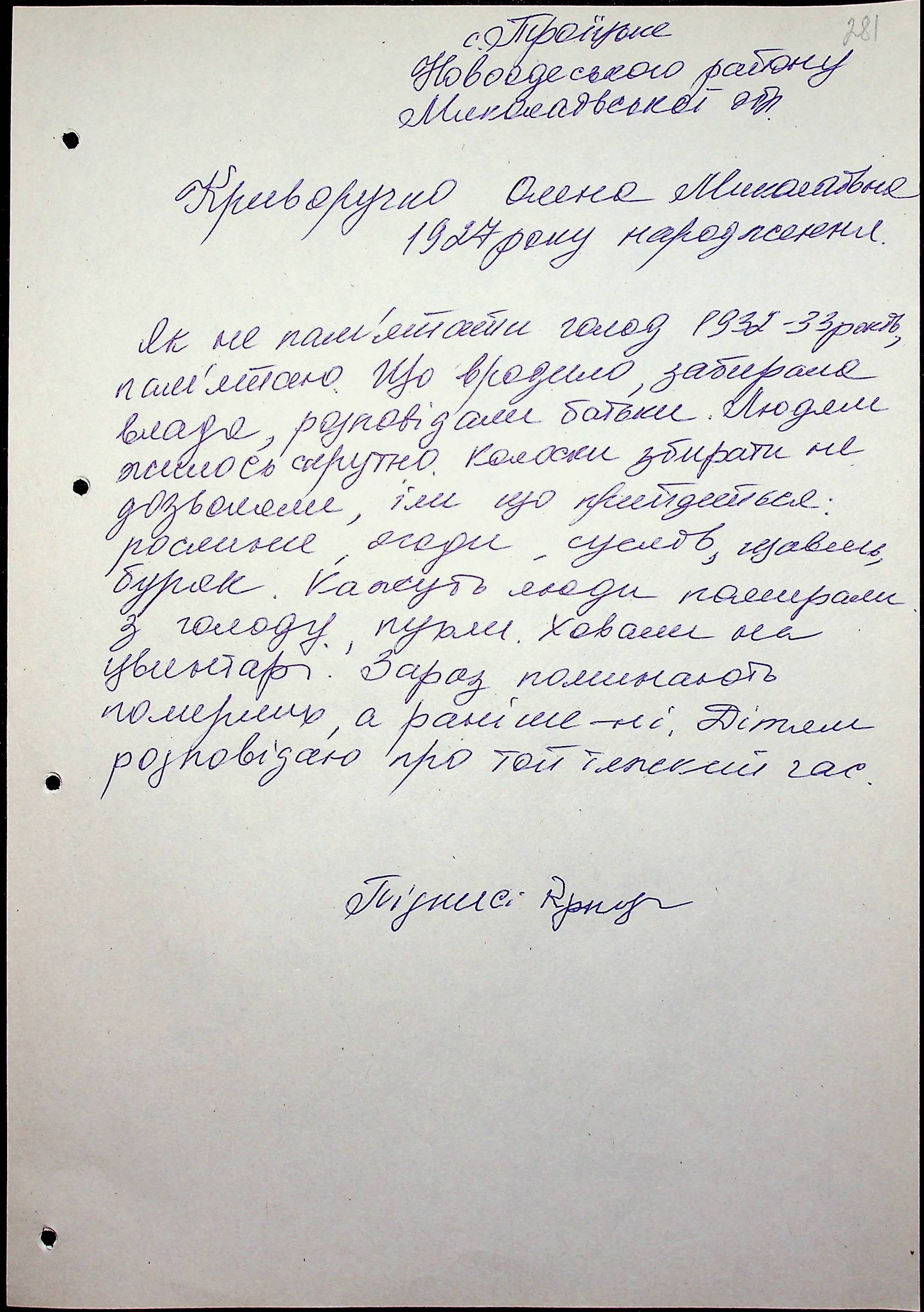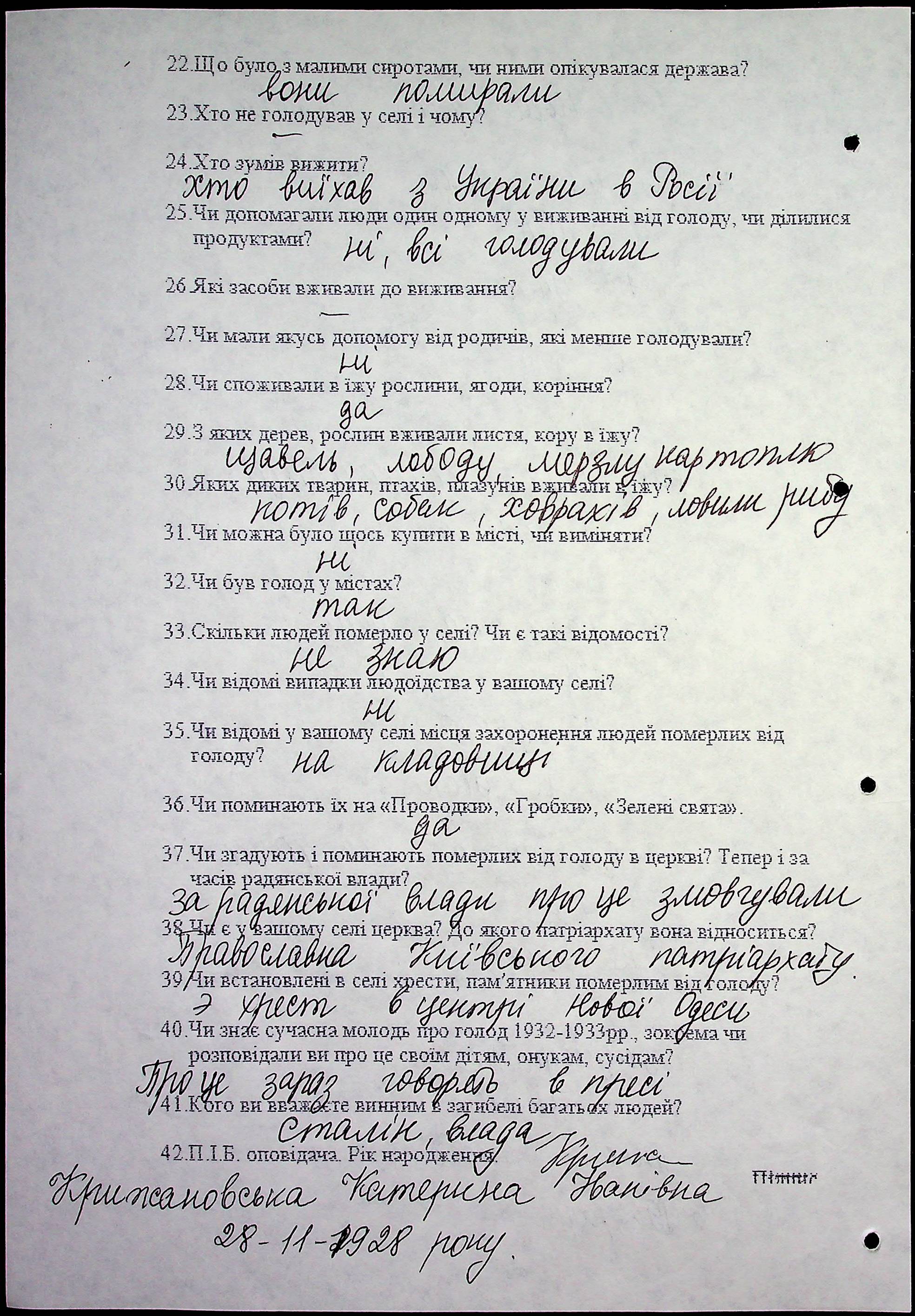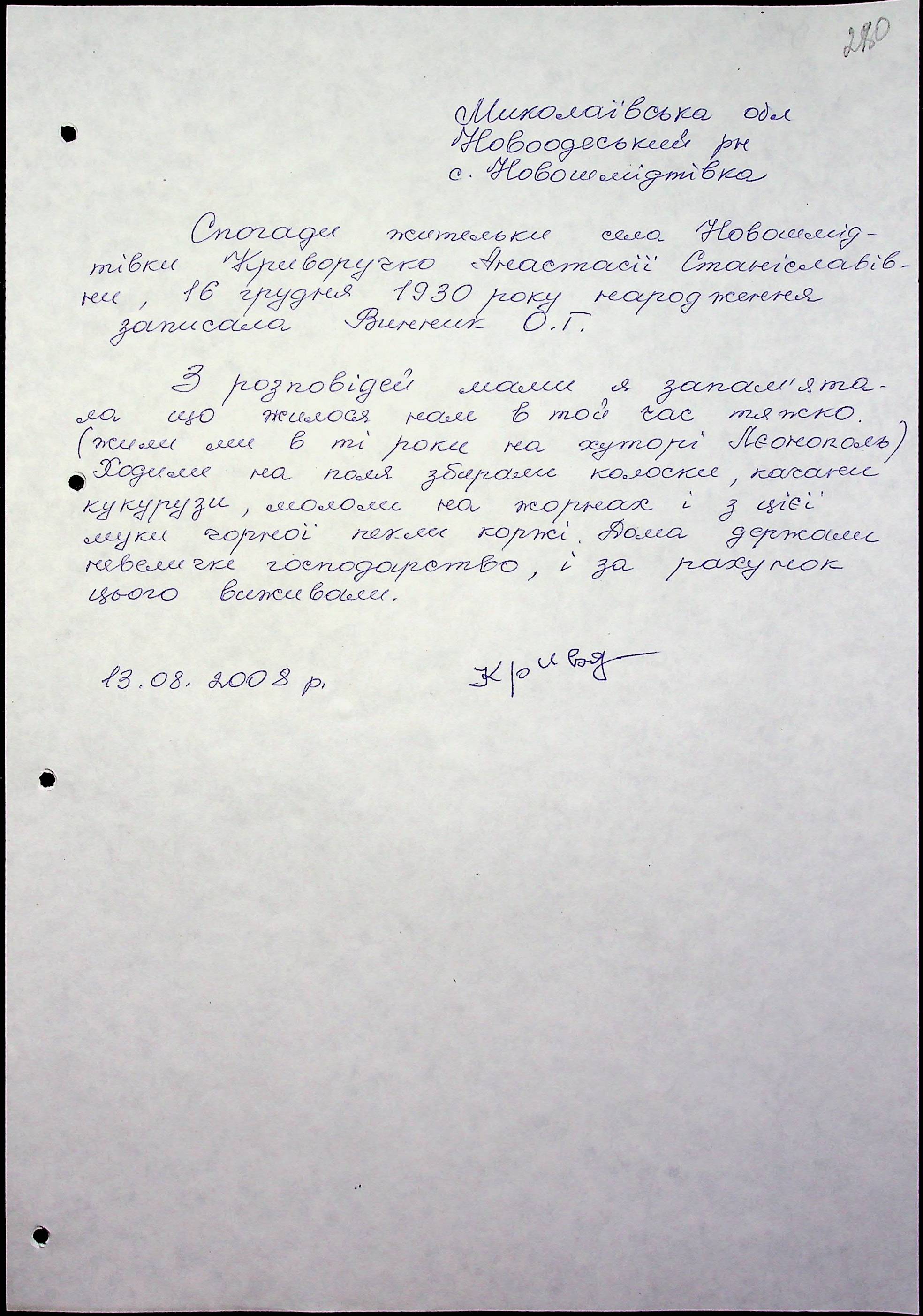 • • • • Справа № 54 “Свідчення очевидців Голодомору 1932-1933 років, які проживають у Новоодеському районі, з прізвищами на літери Д–К”