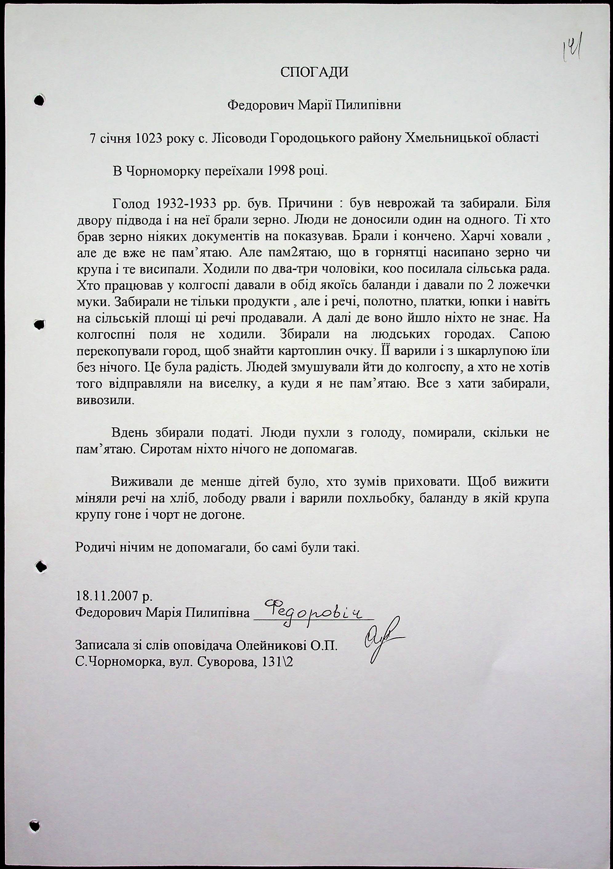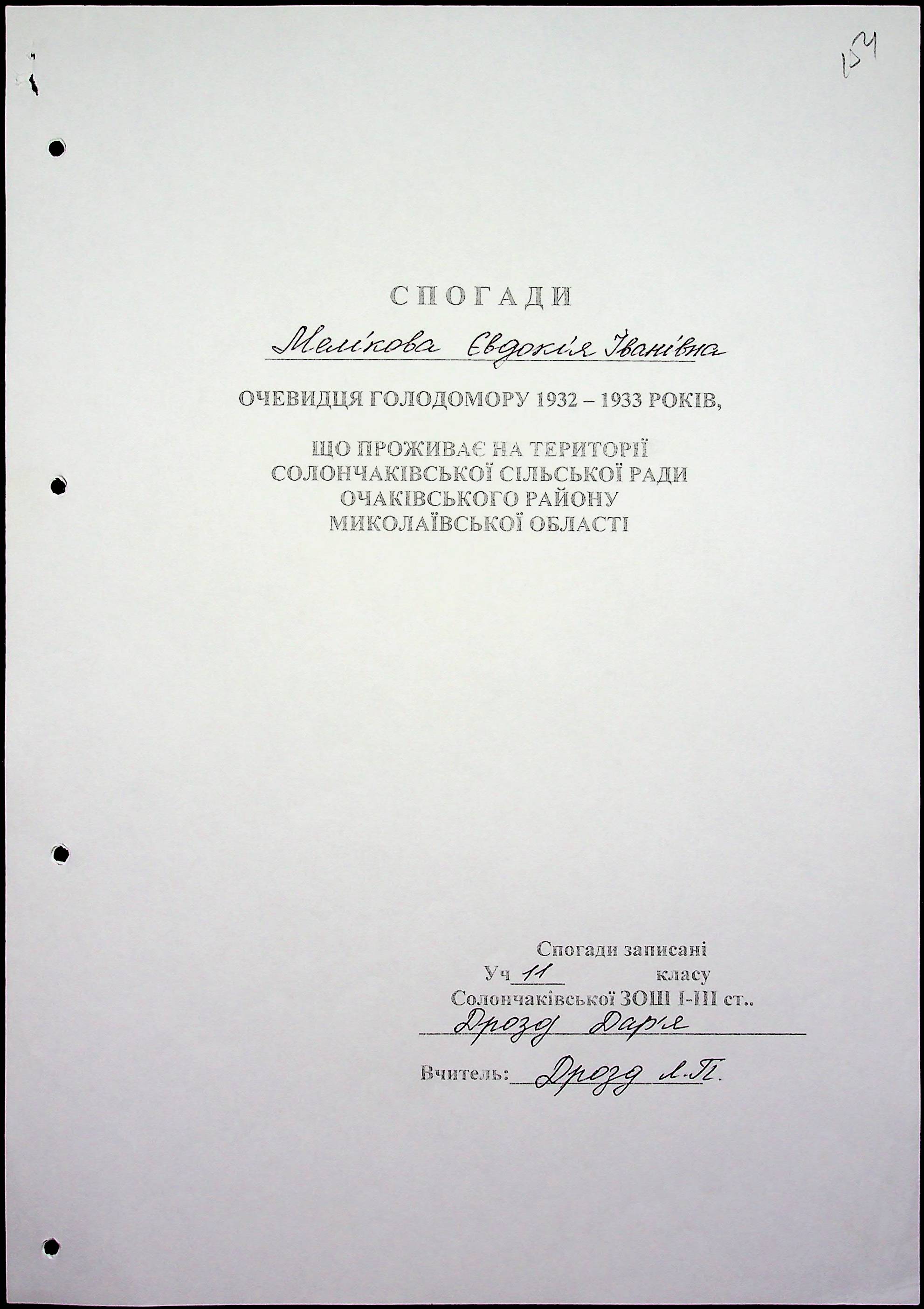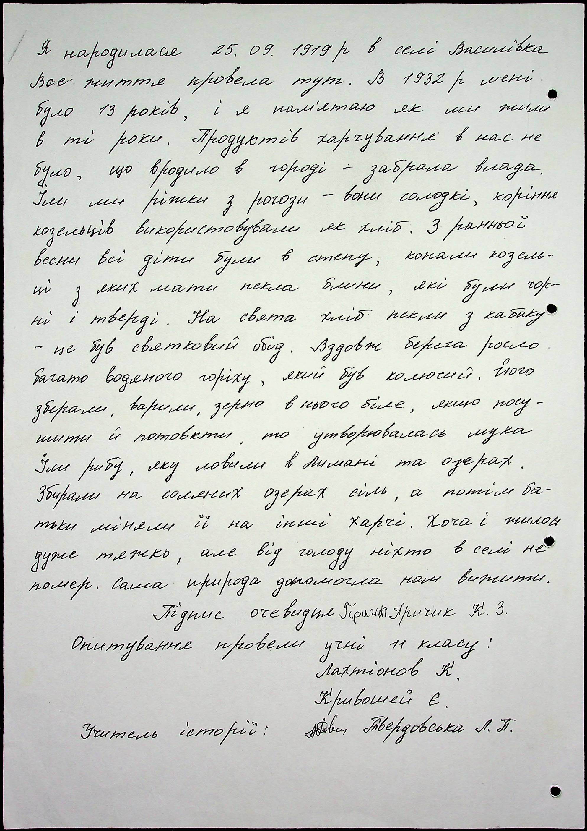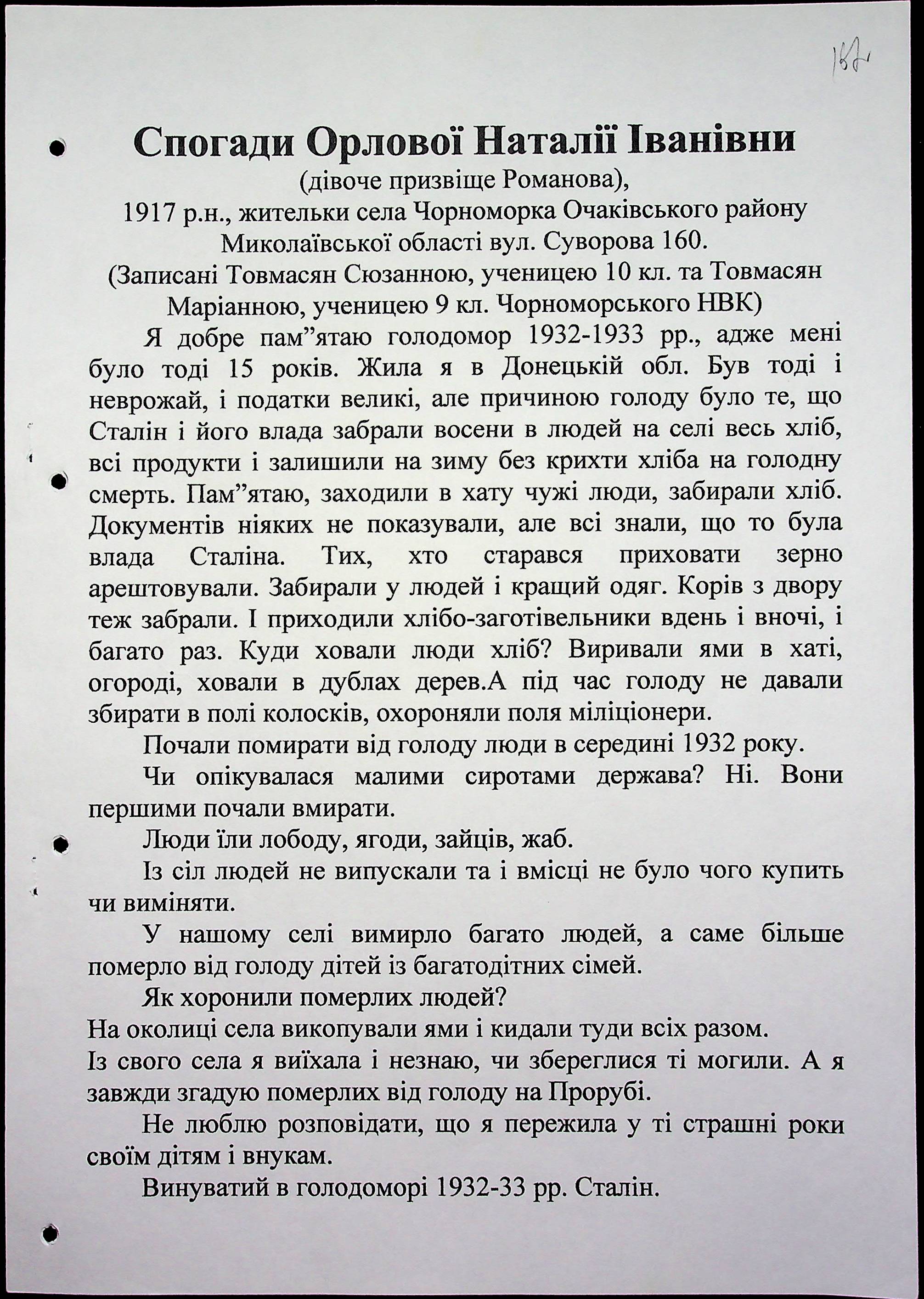 • • • • Справа № 59 “Свідчення очевидців Голодомору 1932-1933 років, які проживають в Очаківському районі. Том 2.”