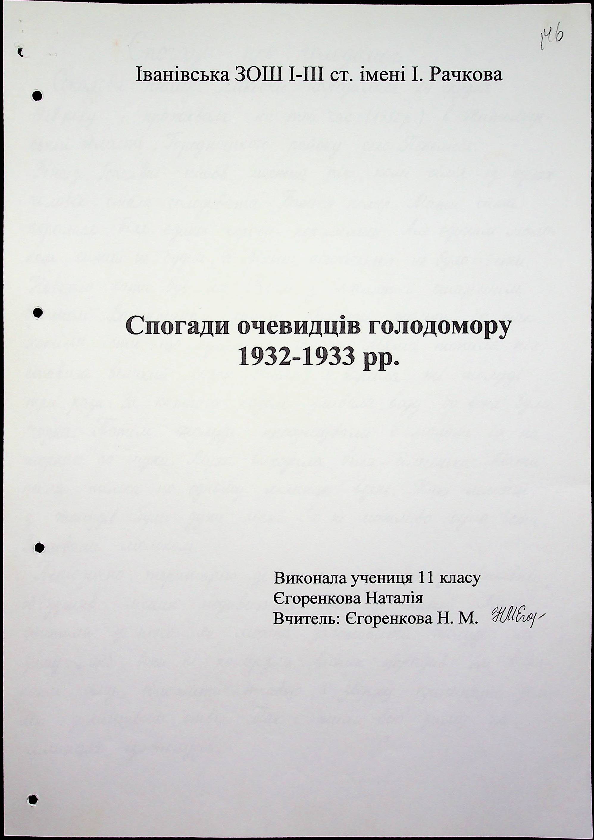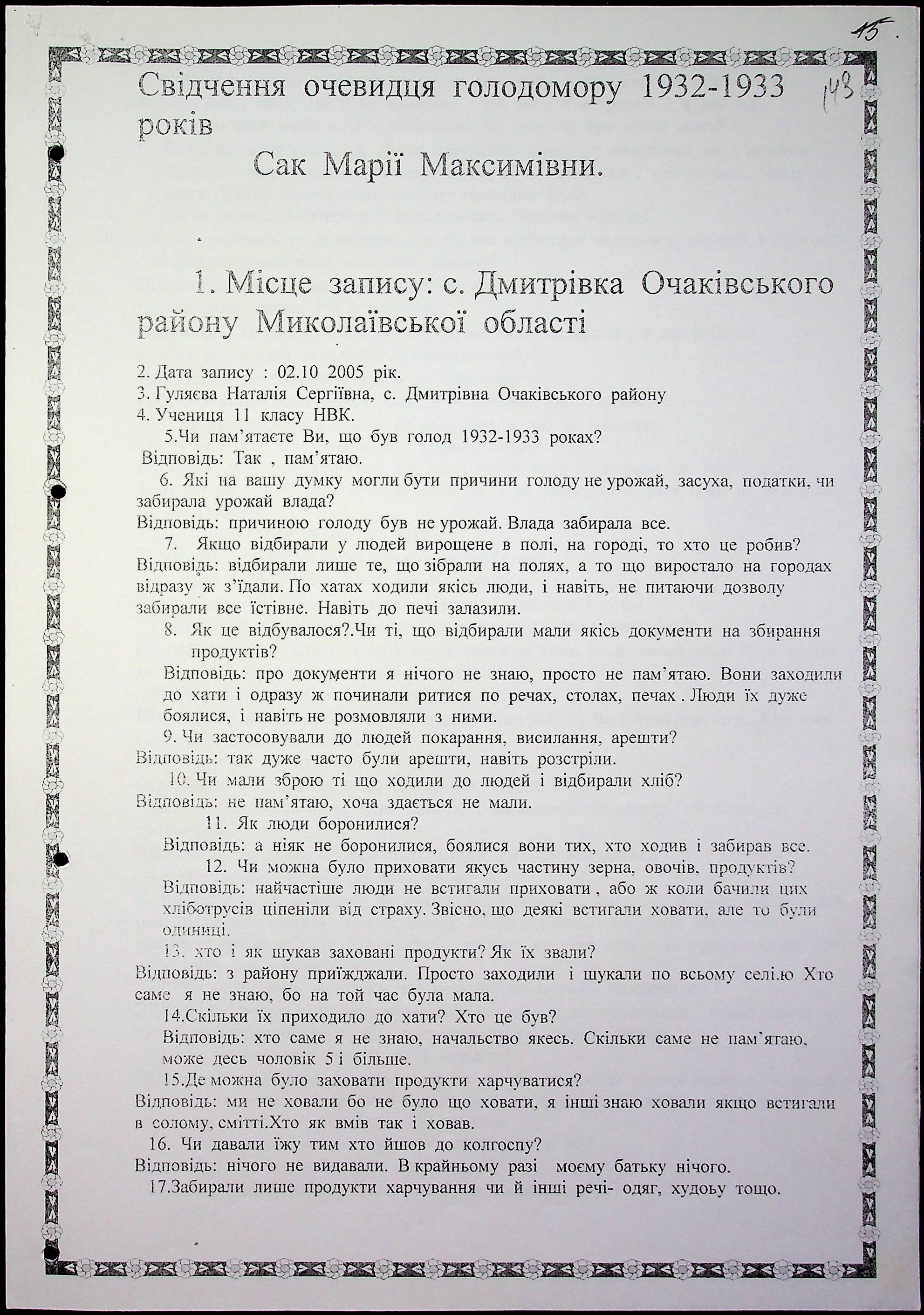 ◦ ◦ Фонд № 6146 “Колекція свідчень очевидців Голодомору 1932-1933 рр., нині проживаючих у Миколаївській області”