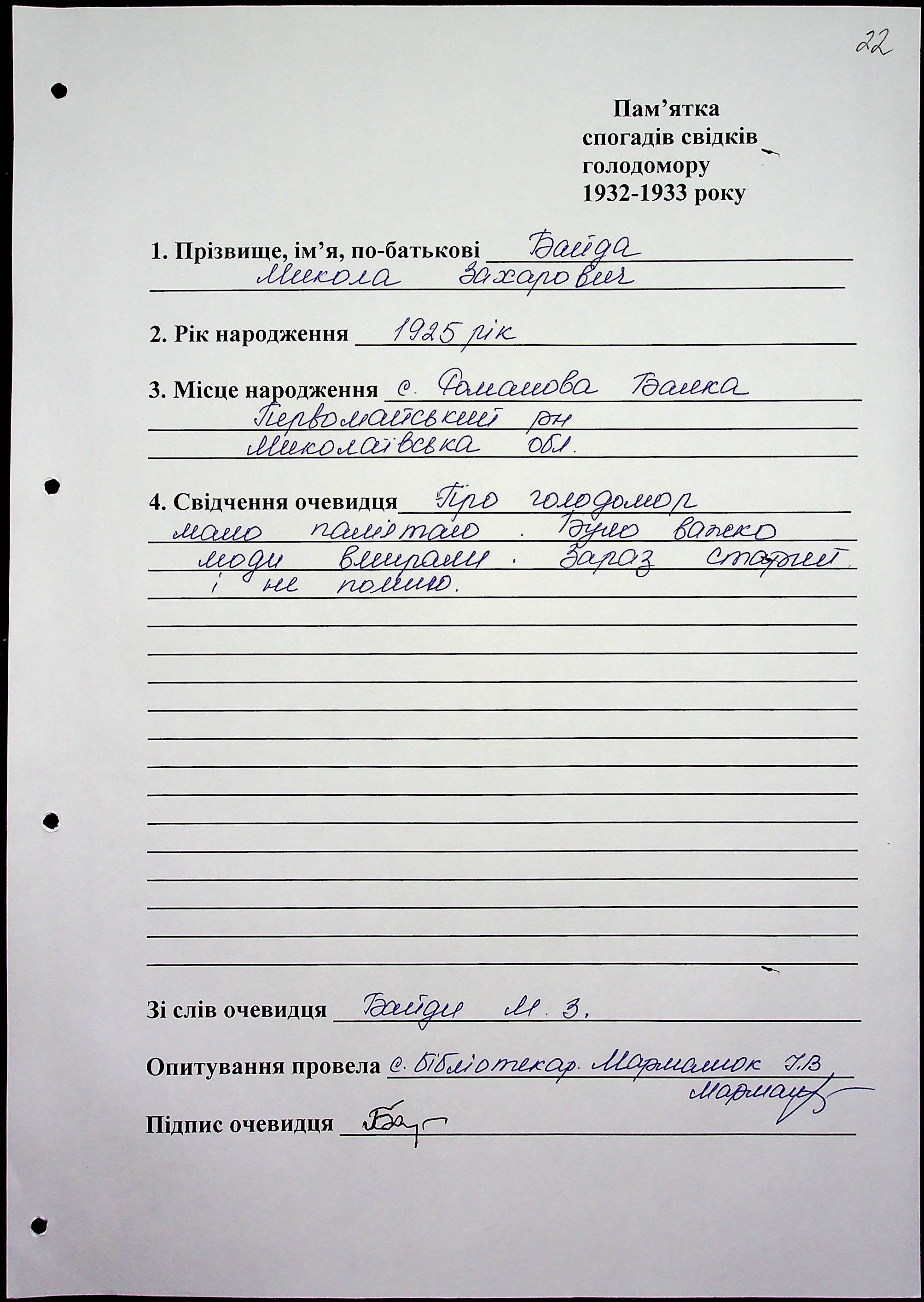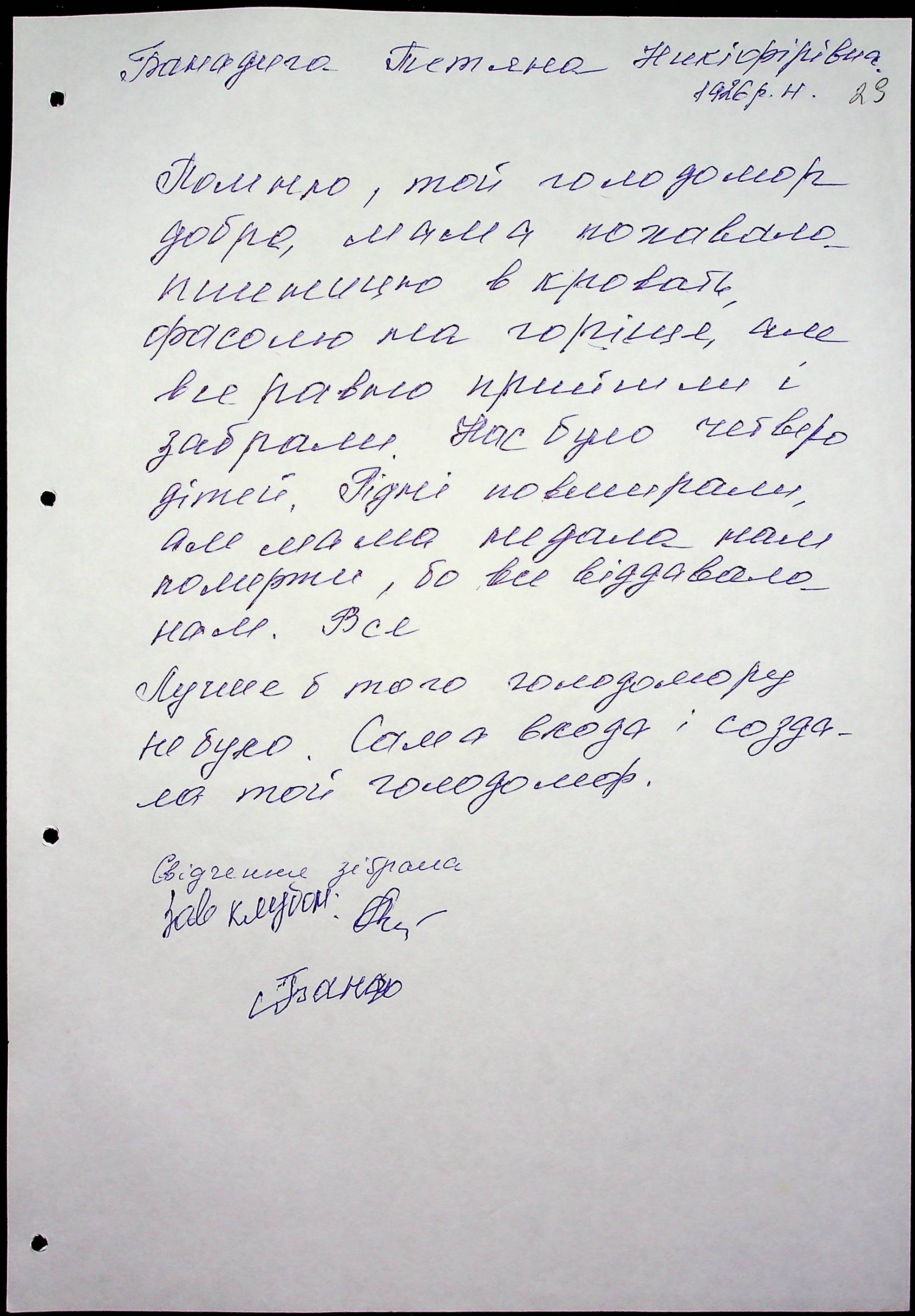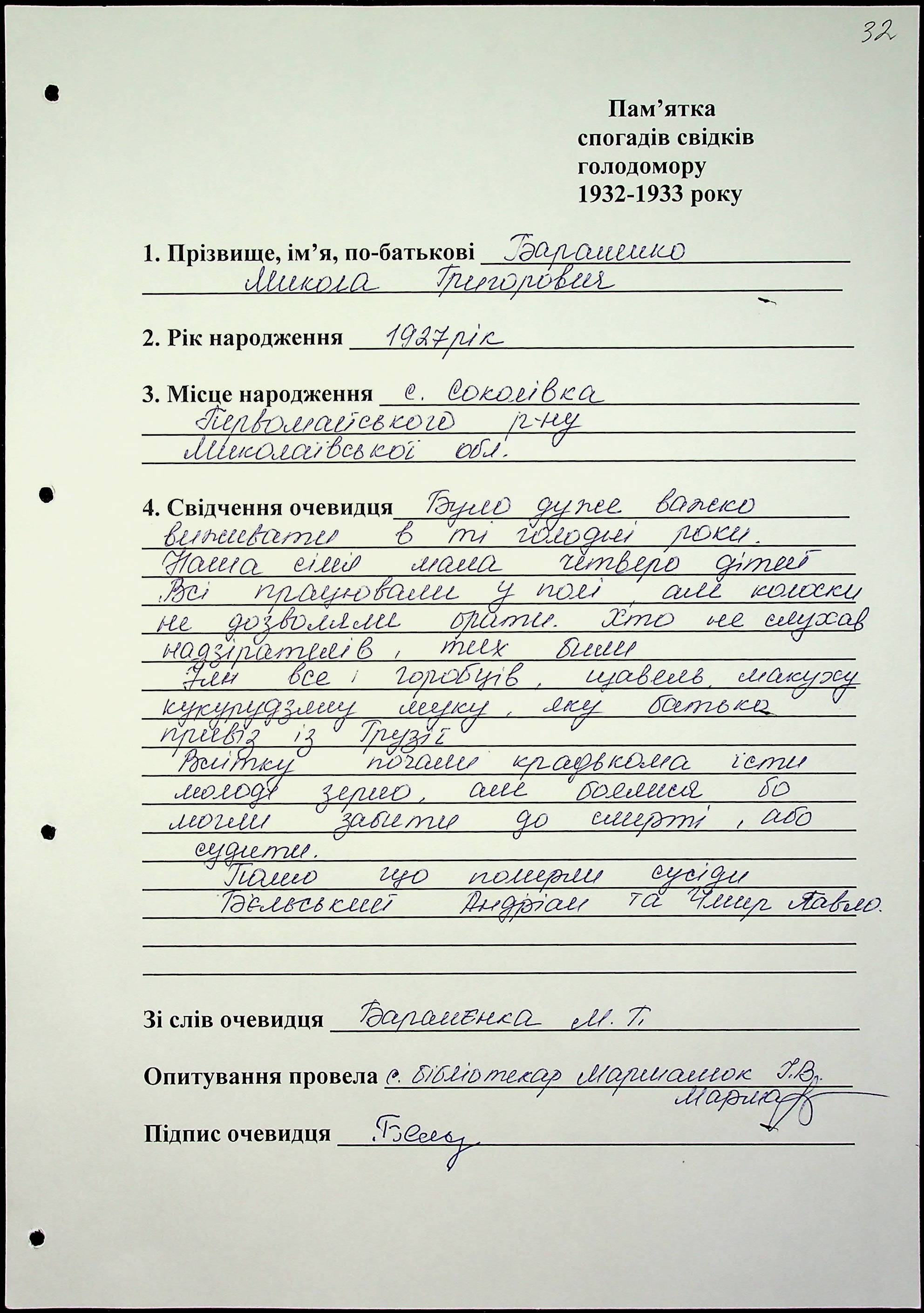 ◦ ◦ Фонд № 6146 “Колекція свідчень очевидців Голодомору 1932-1933 рр., нині проживаючих у Миколаївській області”