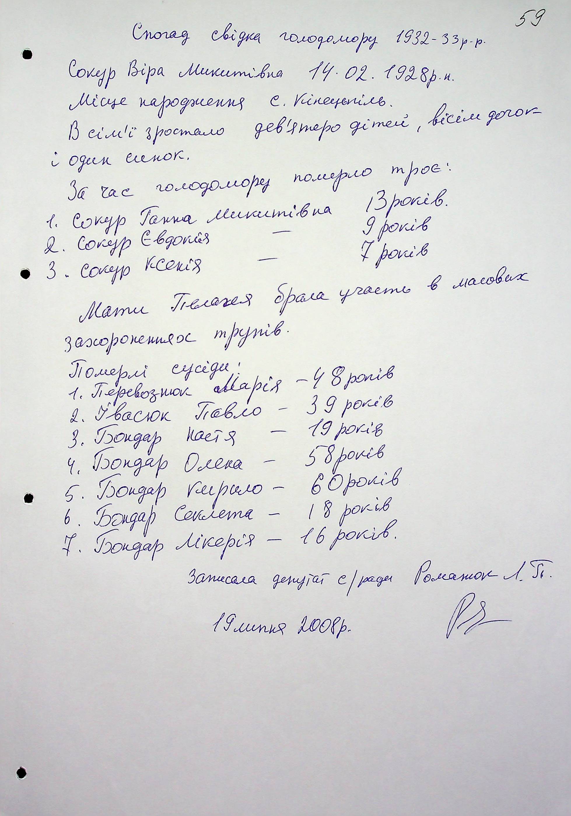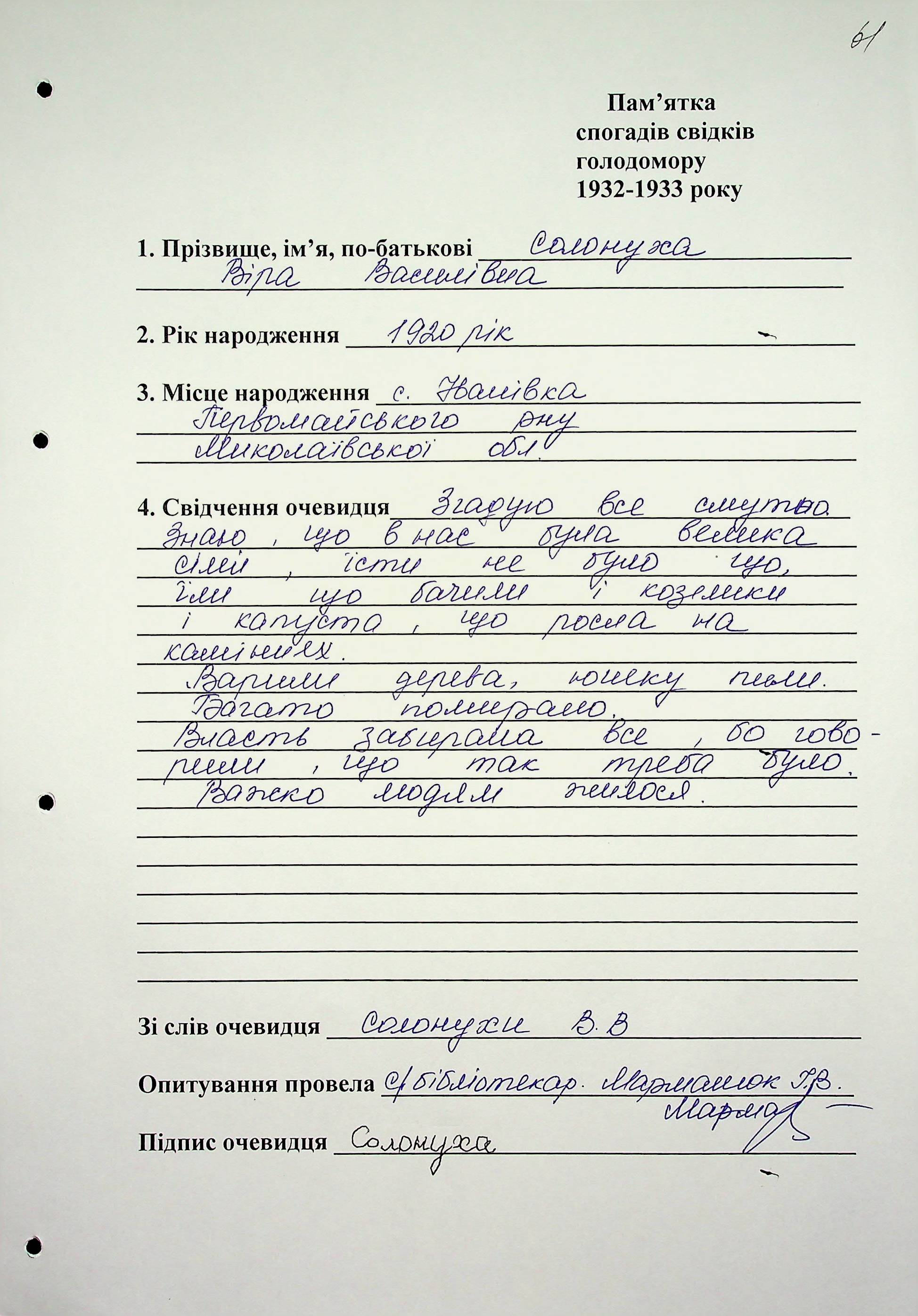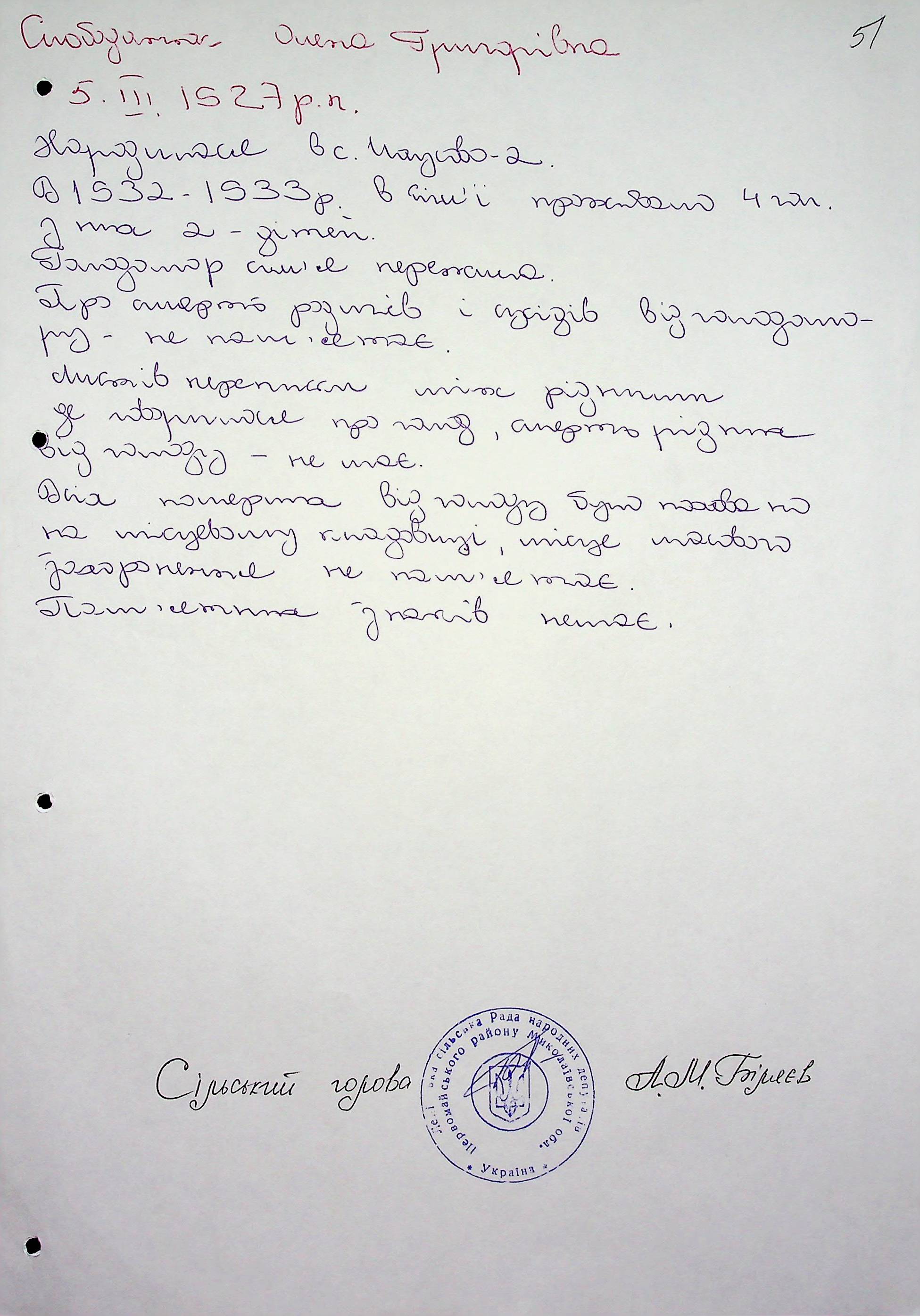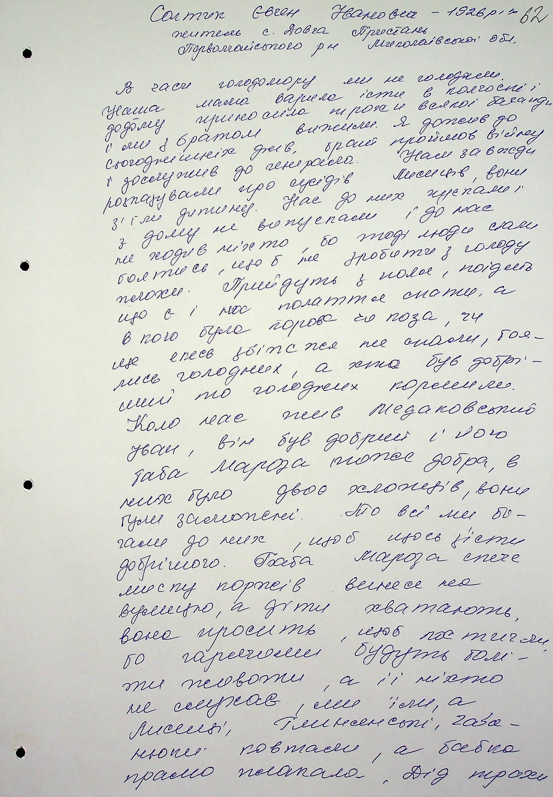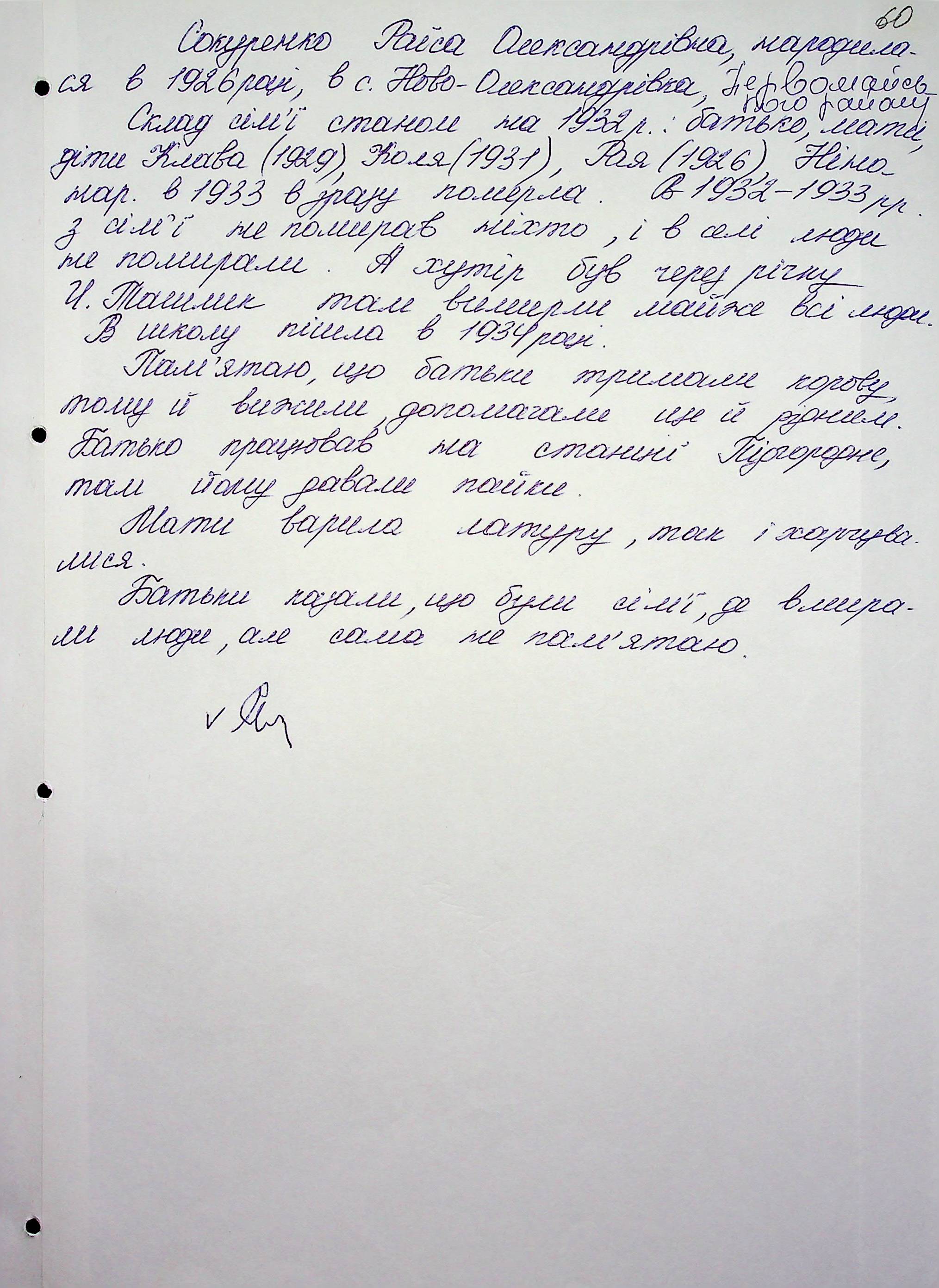 • • • • Справа № 62 “Свідчення очевидців Голодомору 1932-1933 років, які проживають у Первомайському районі, з прізвищами на літери Р–Я”