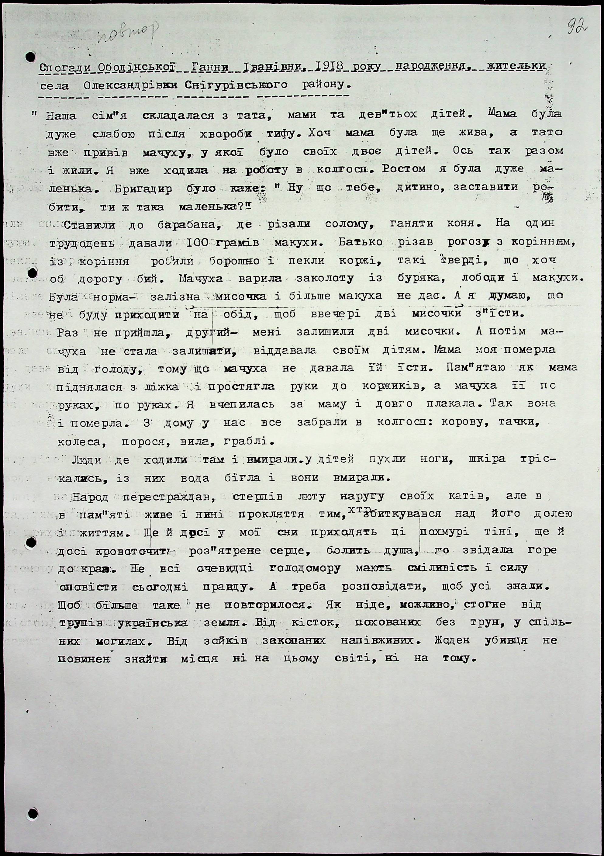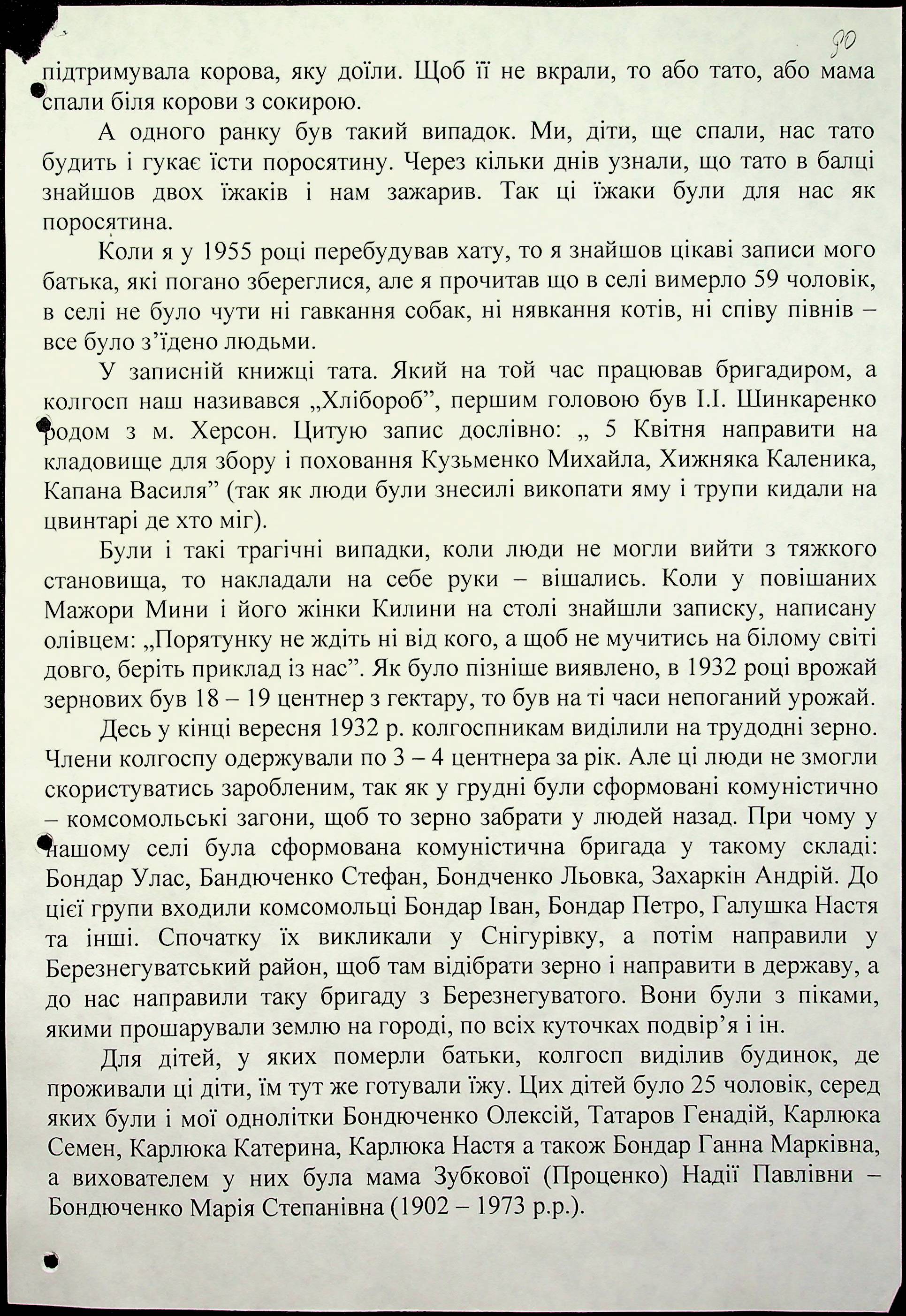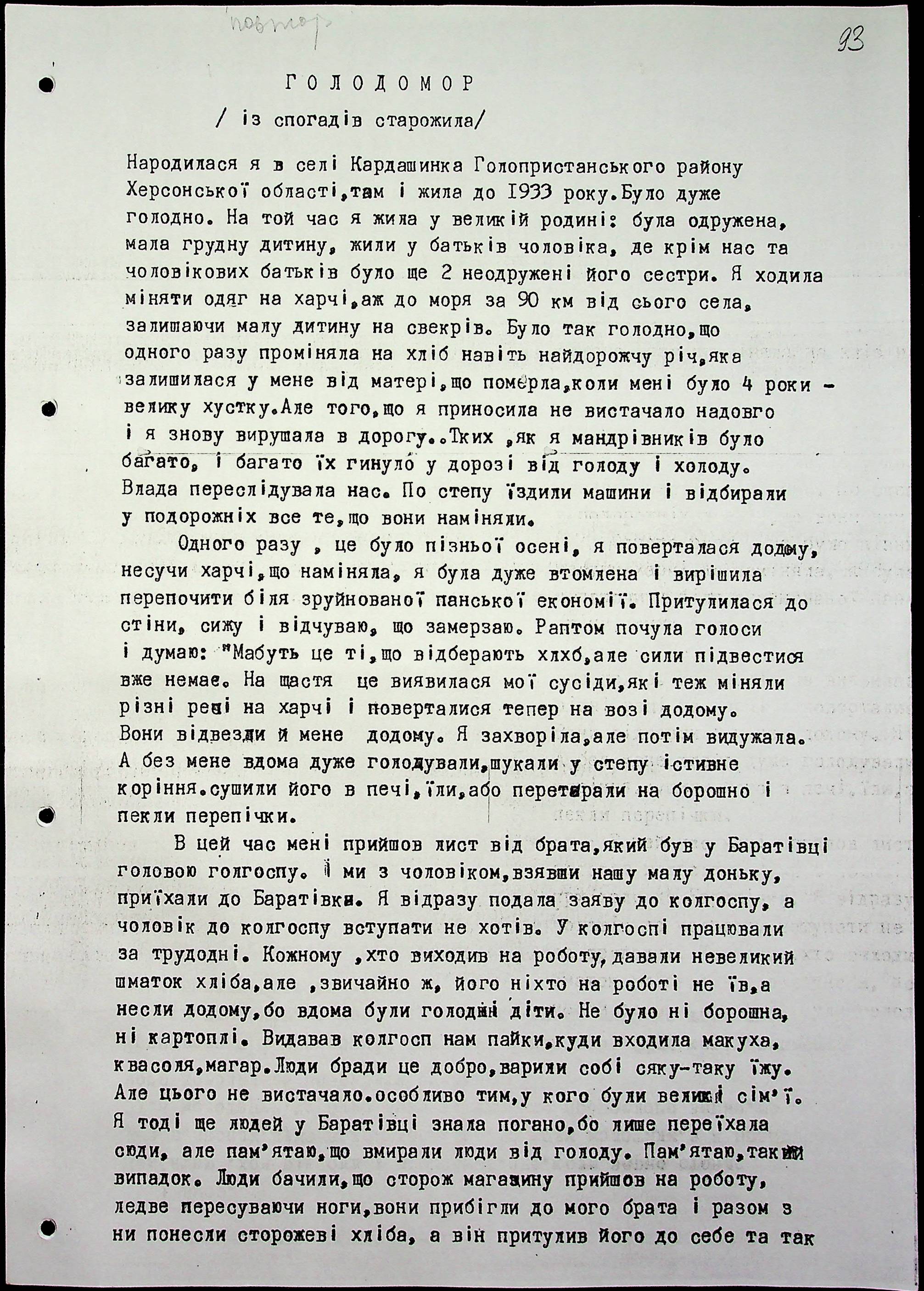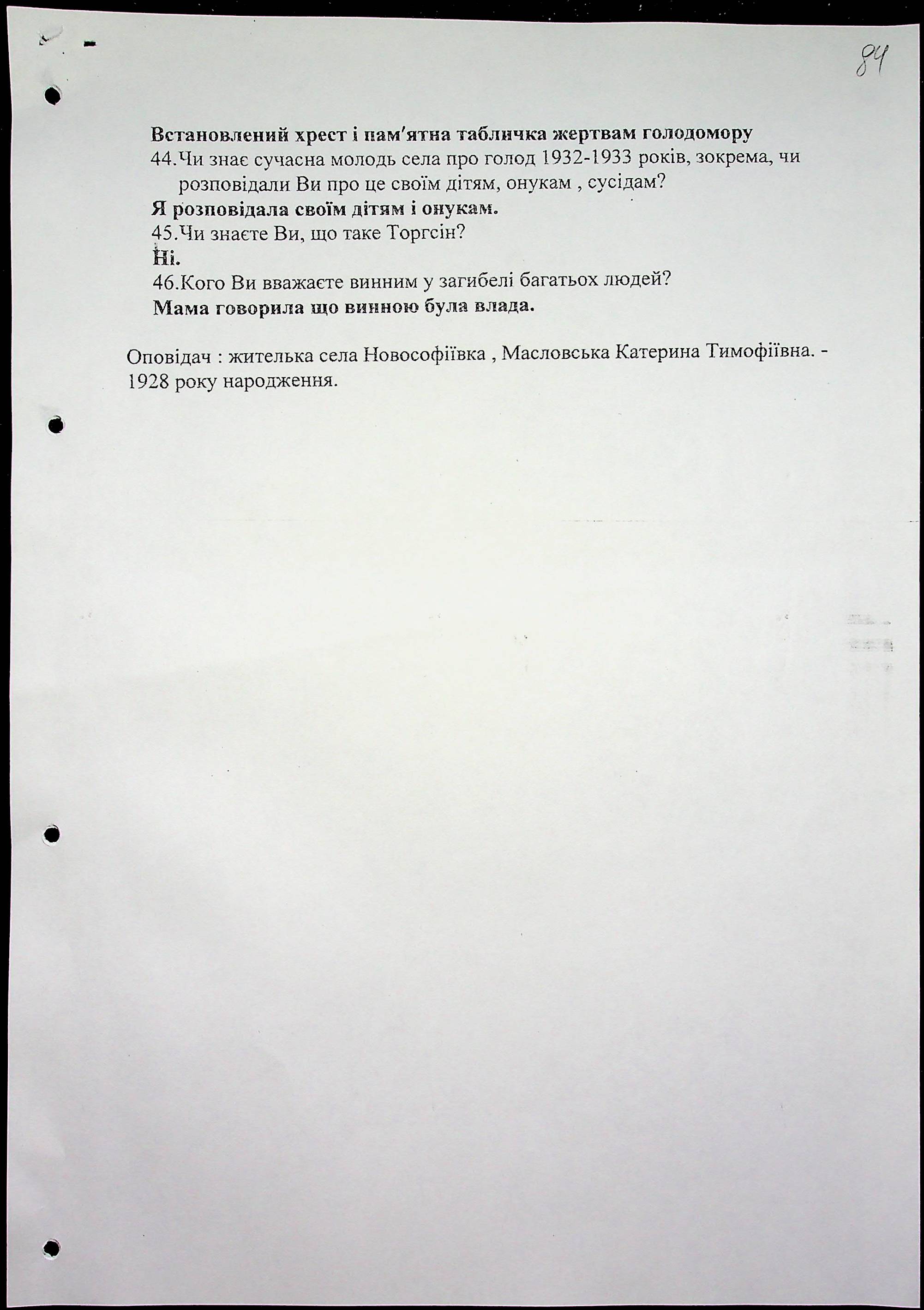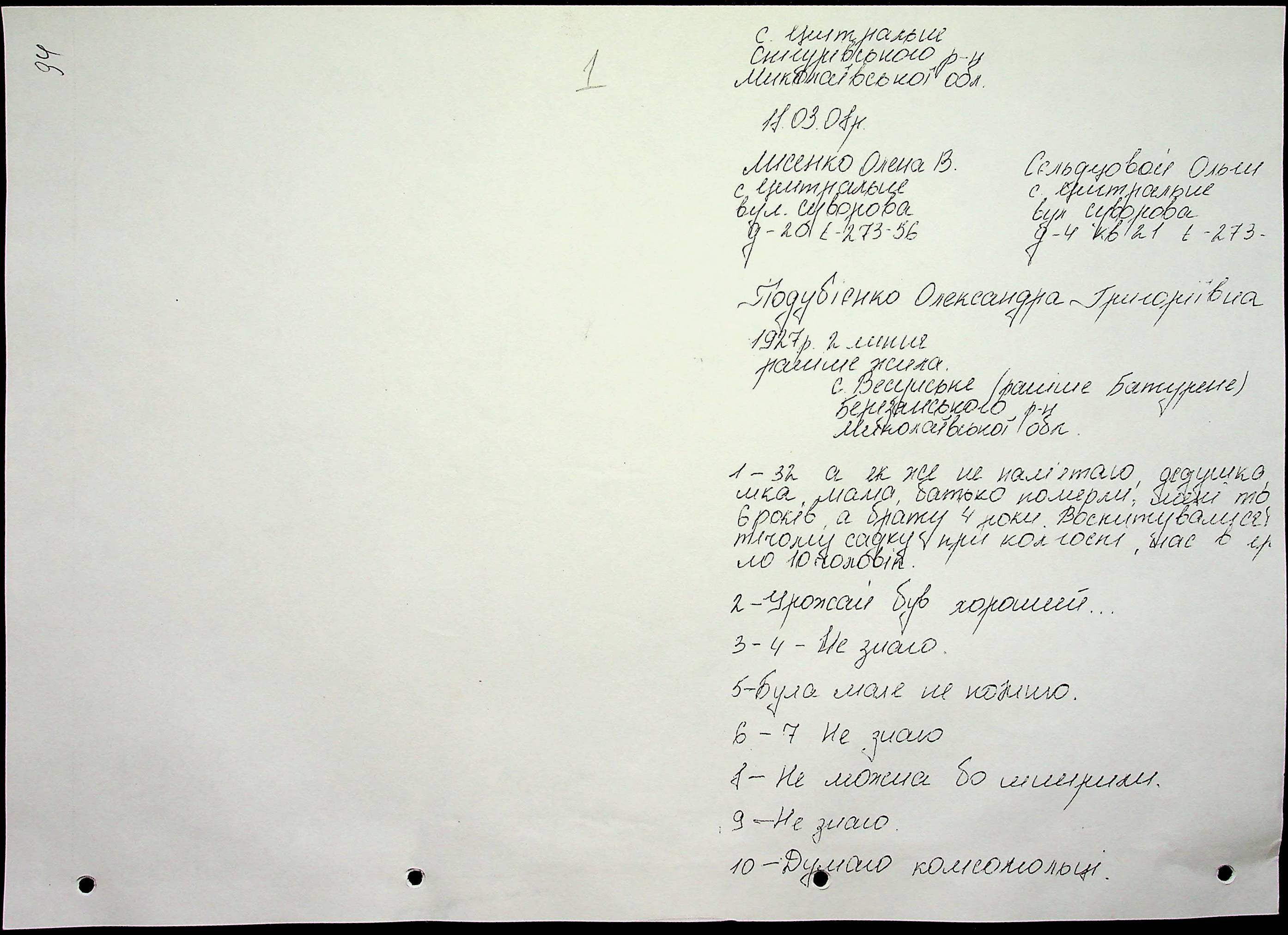• • • • Справа № 64 “Свідчення очевидців Голодомору 1932-1933 років, які проживають у Снігурівському районі. Том 1”