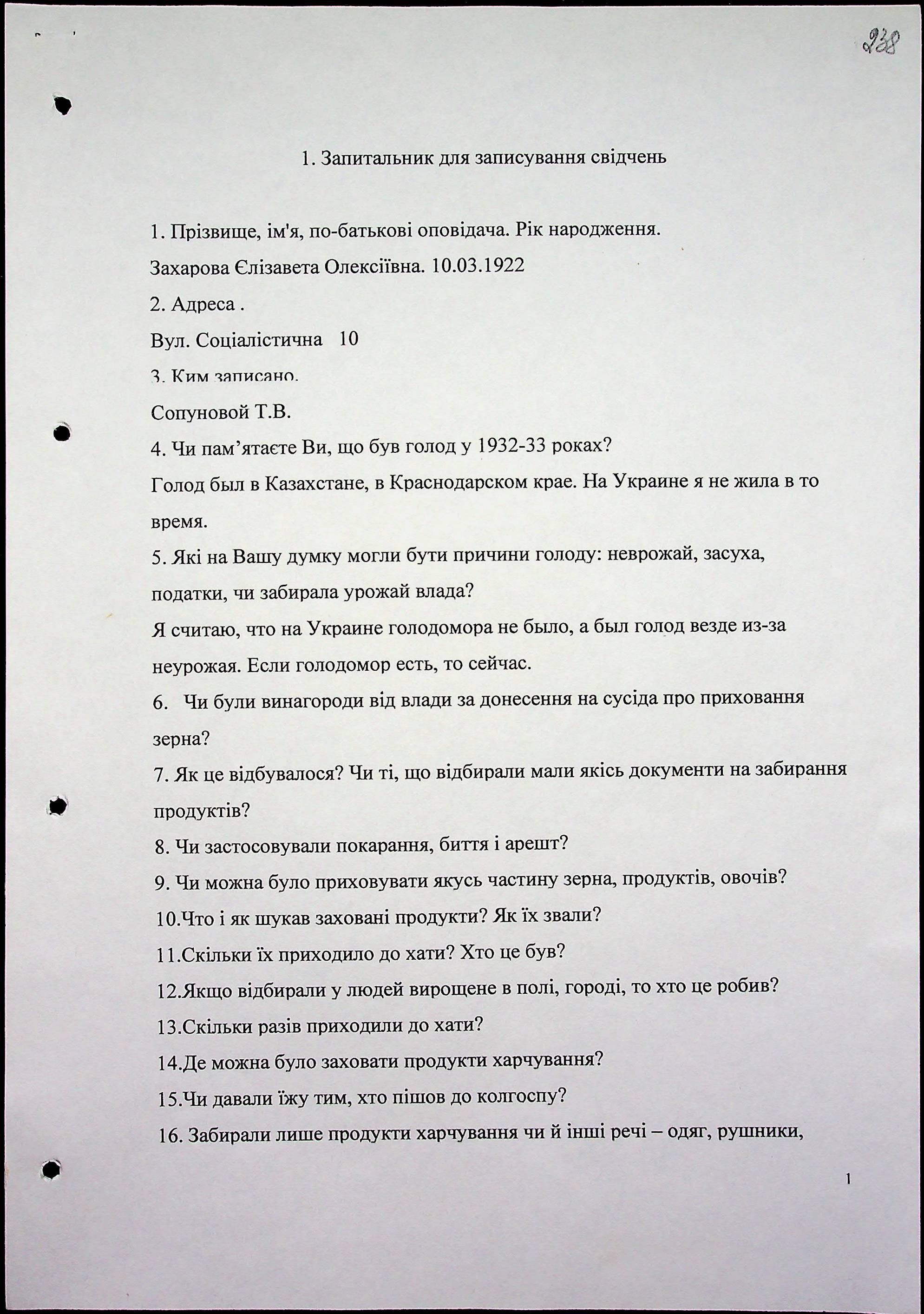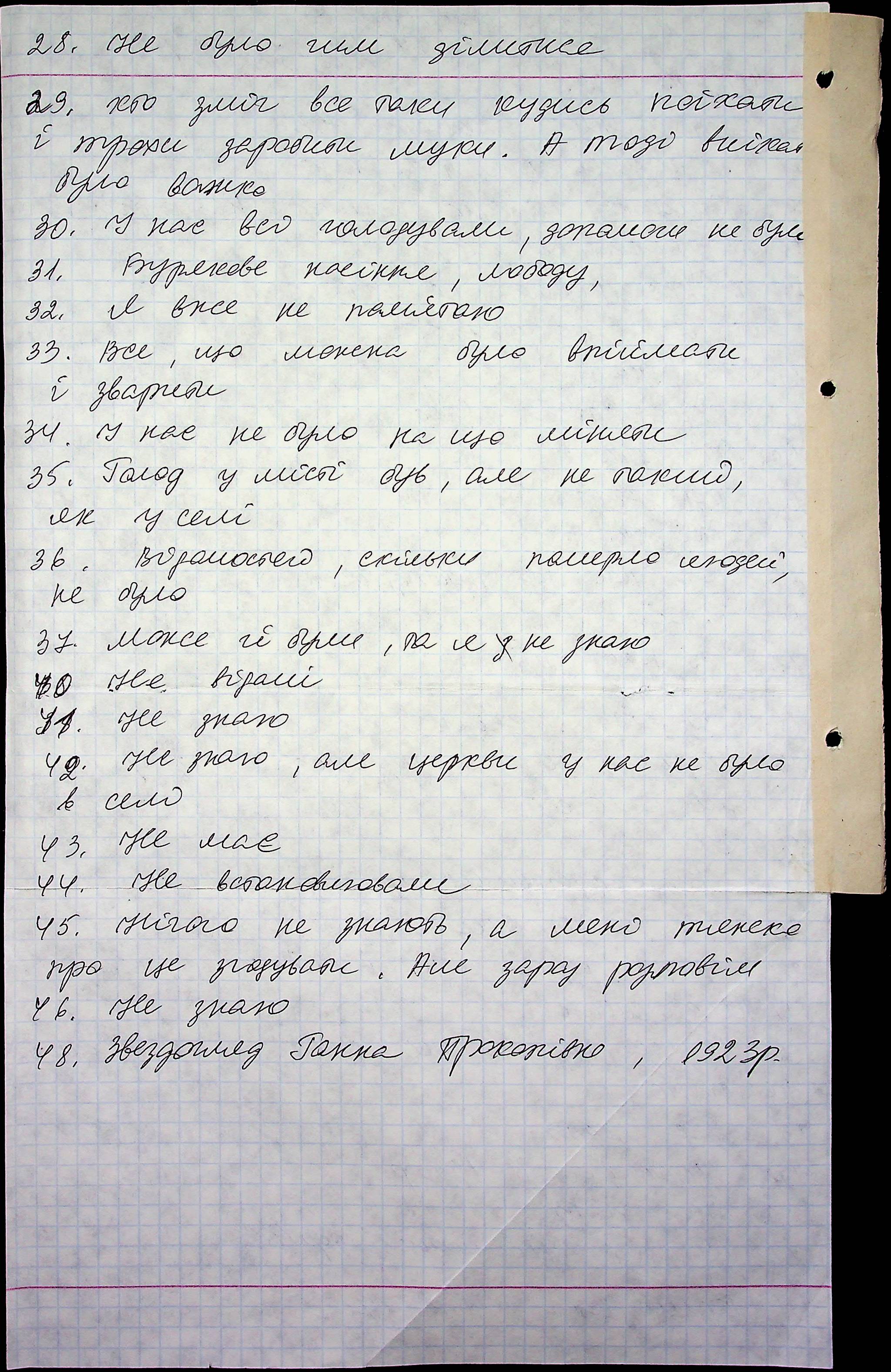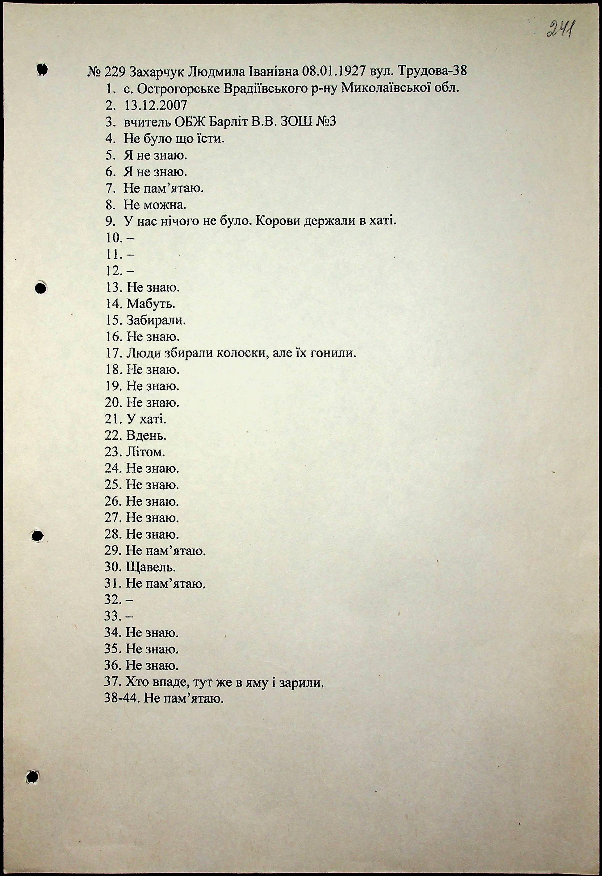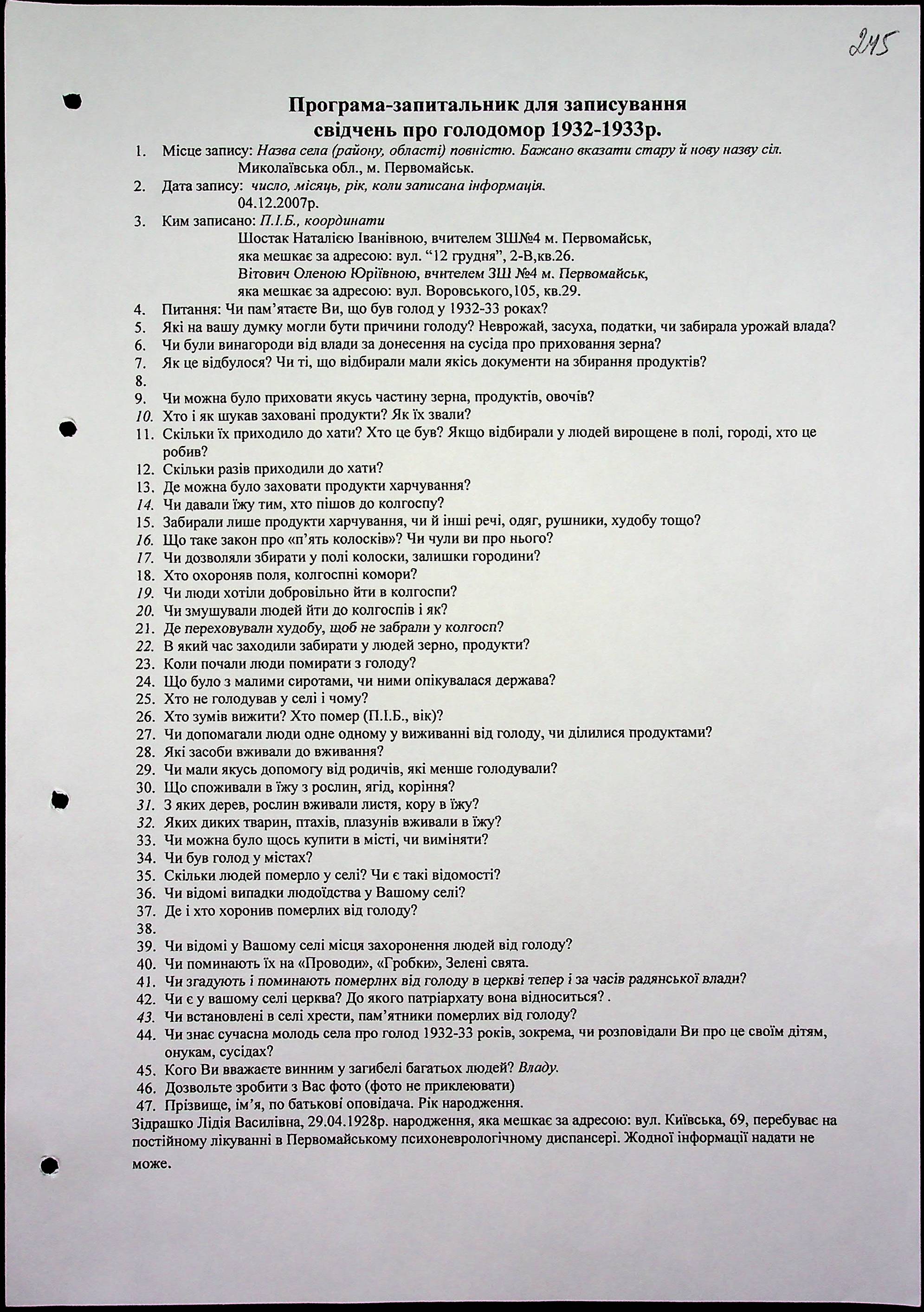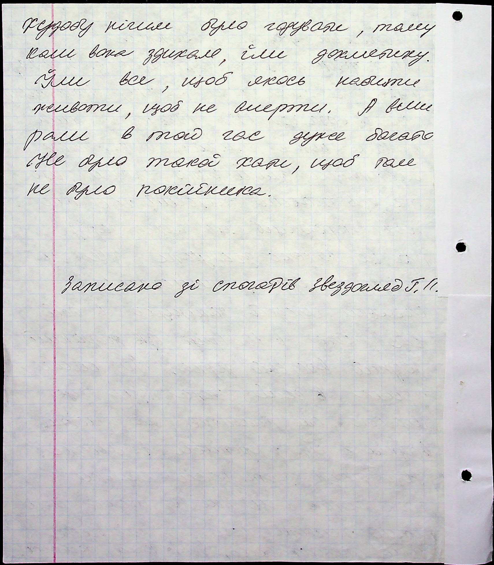 • • • • Справа № 71 “Свідчення очевидців Голодомору 1932-1933 років, які проживають у місті Первомайську, з прізвищами на літери Г–З”