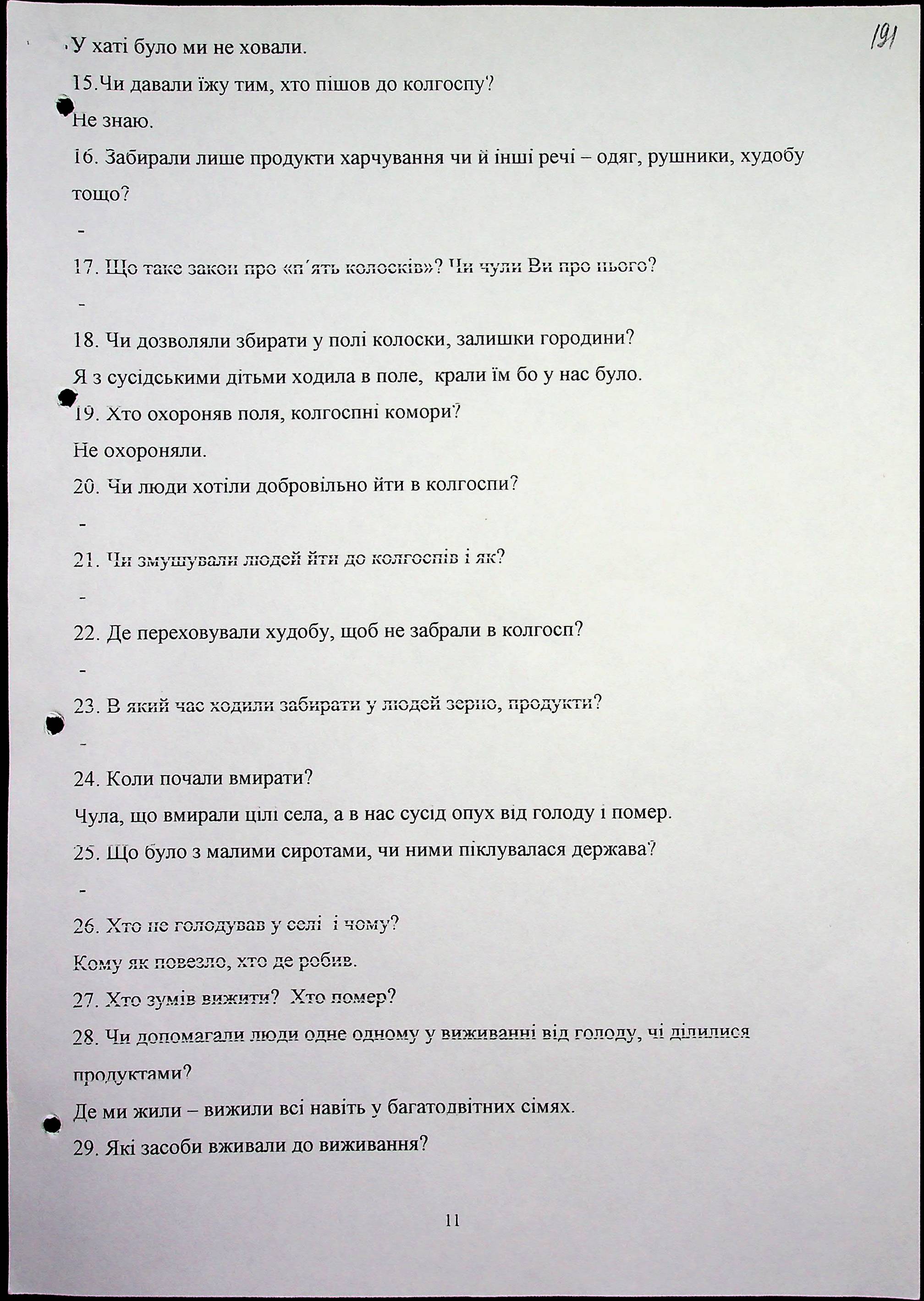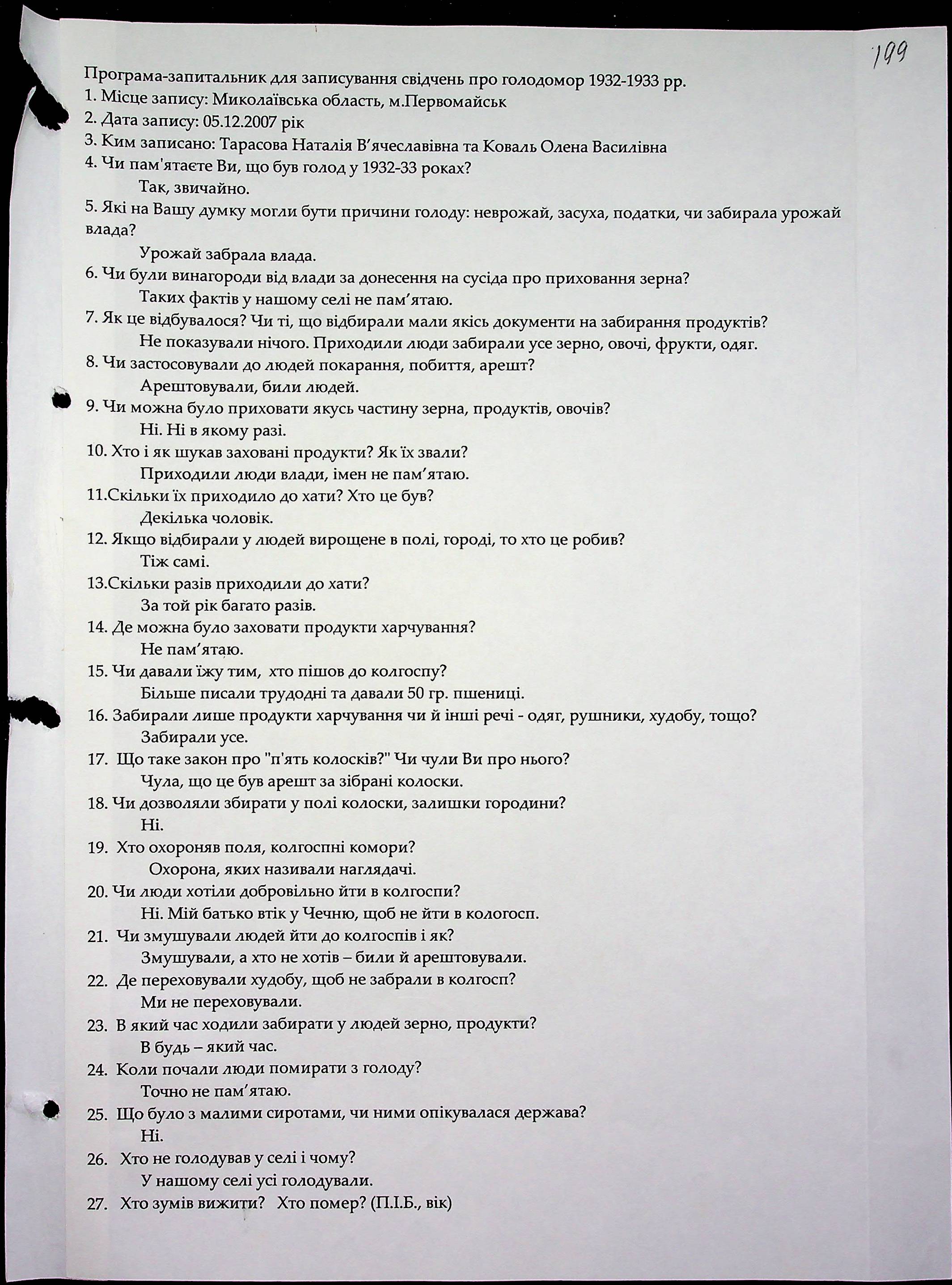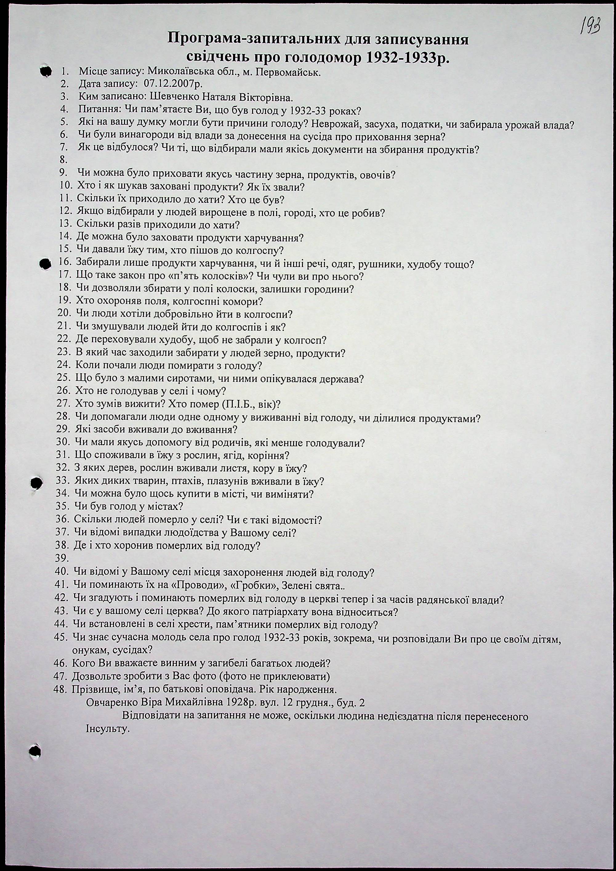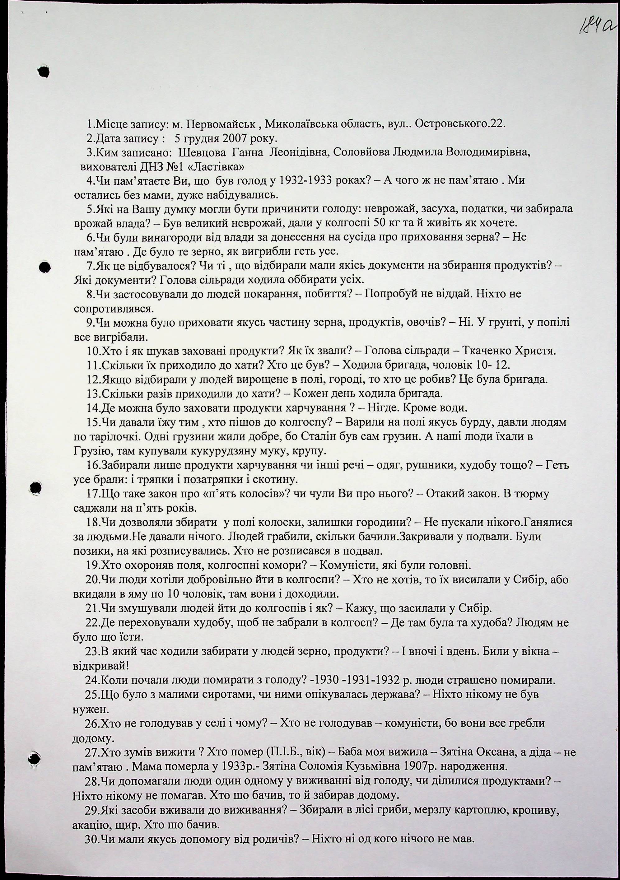 ◦ ◦ Фонд № 6146 “Колекція свідчень очевидців Голодомору 1932-1933 рр., нині проживаючих у Миколаївській області”