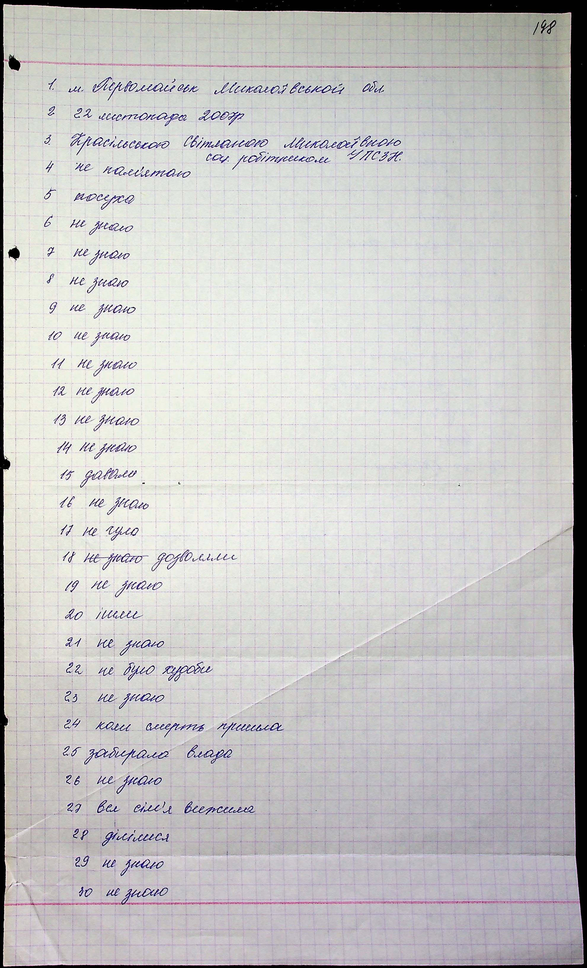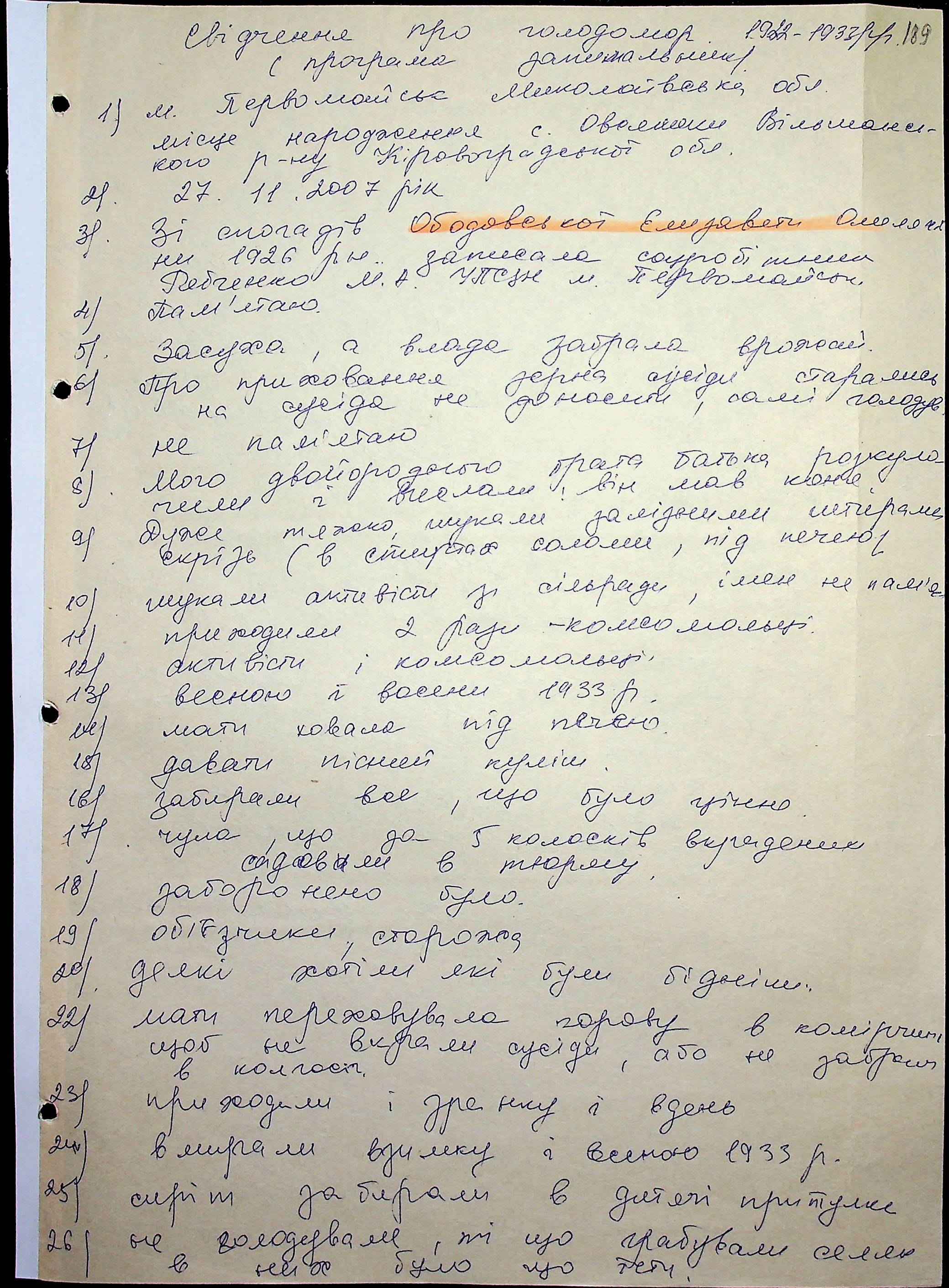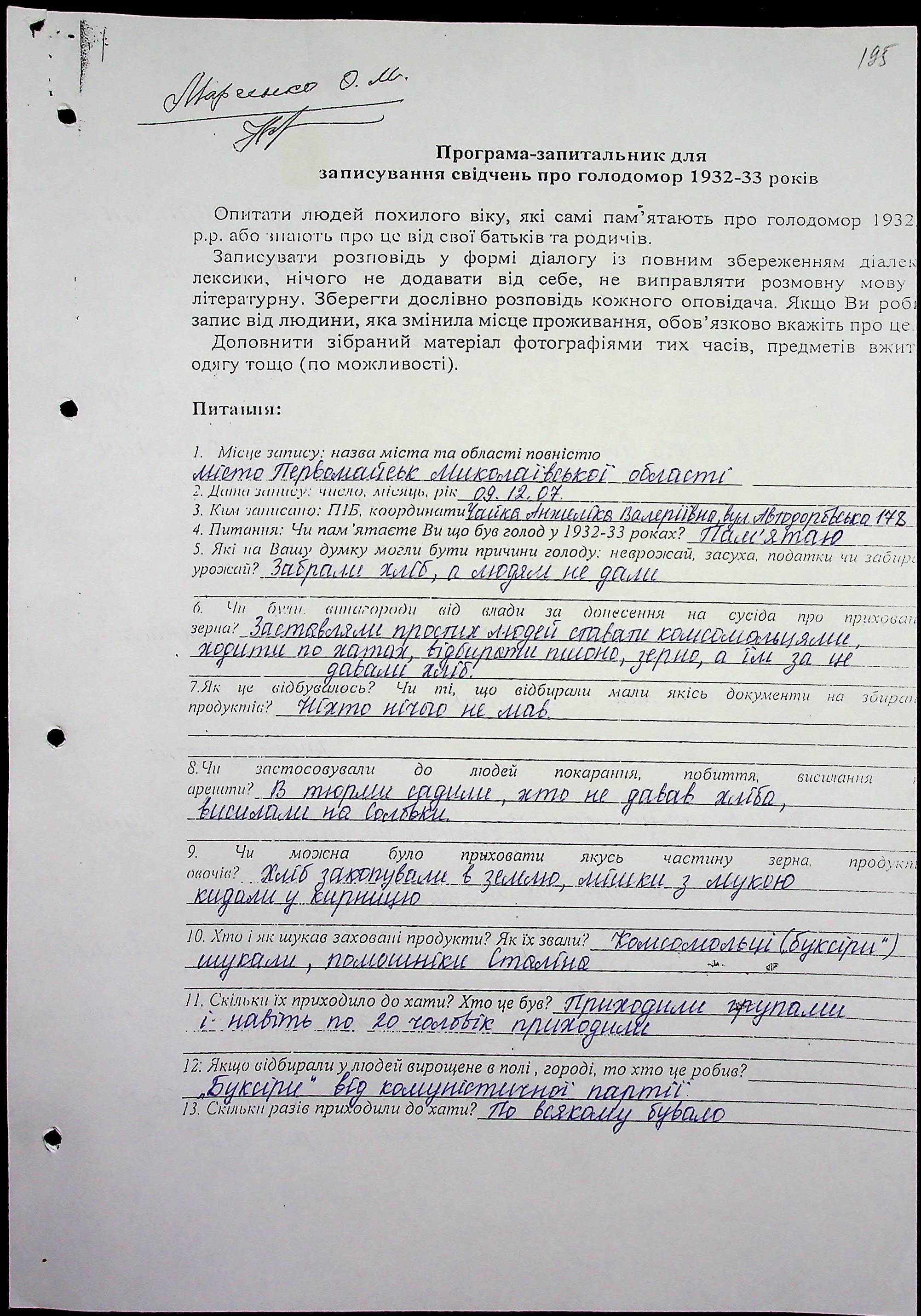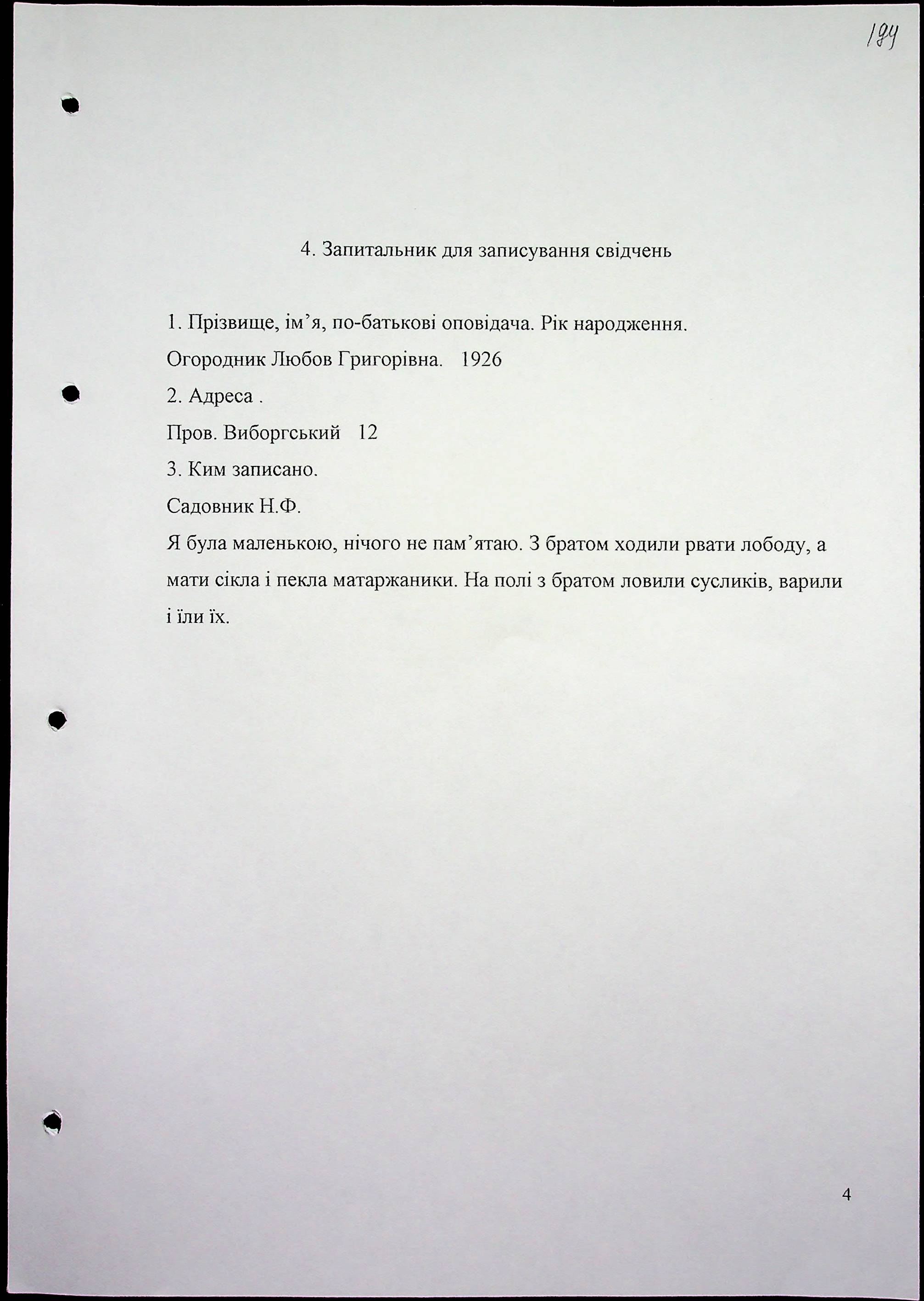 • • • • Справа № 73 “Свідчення очевидців Голодомору 1932-1933 років, які проживають у місті Первомайську, з прізвищами на літери Л–О”