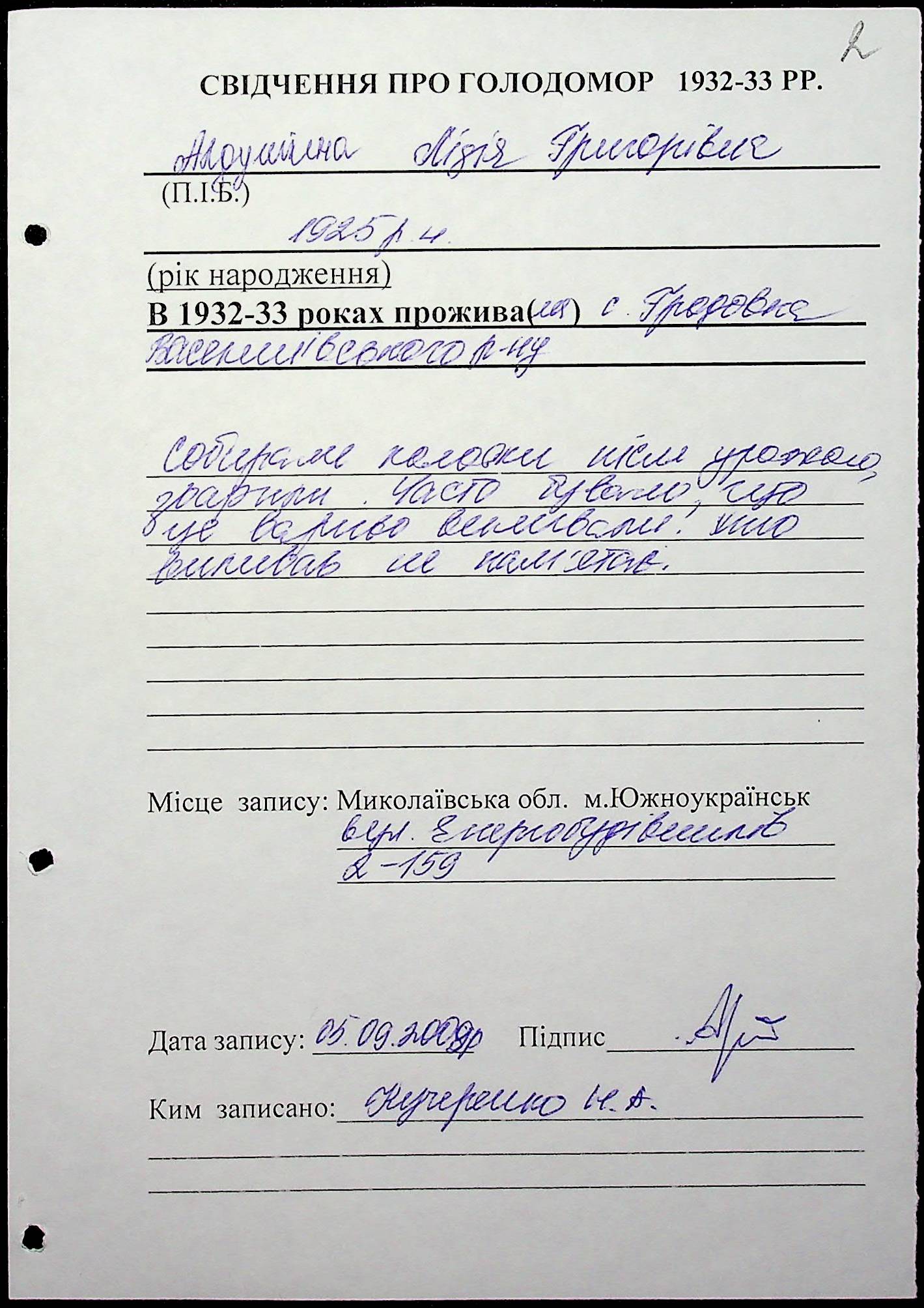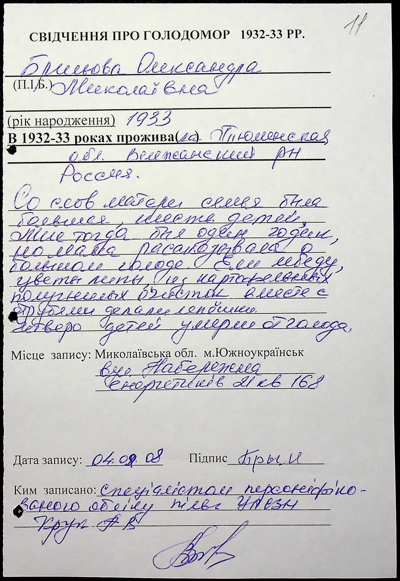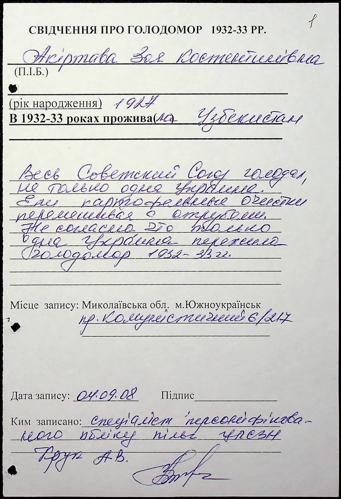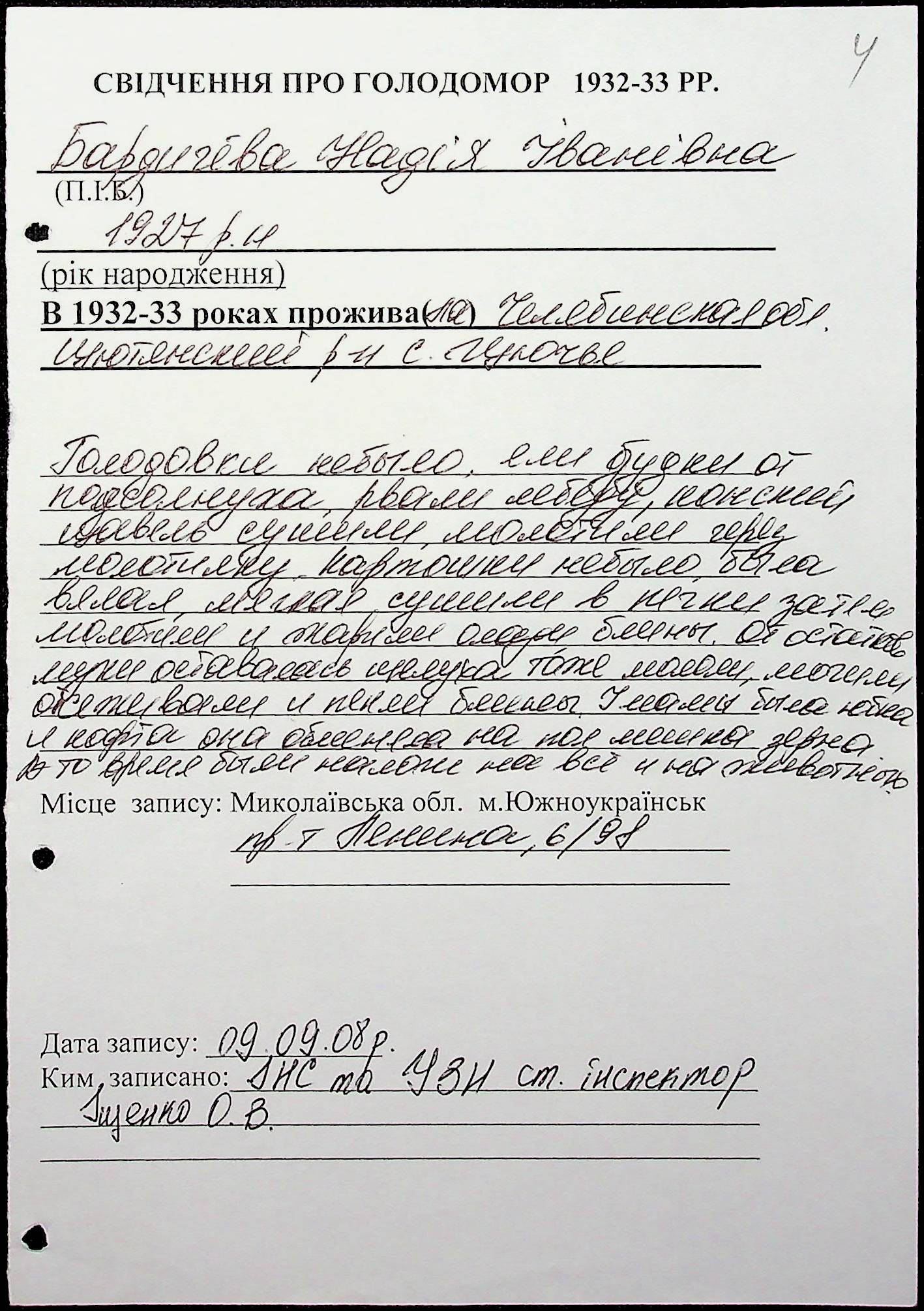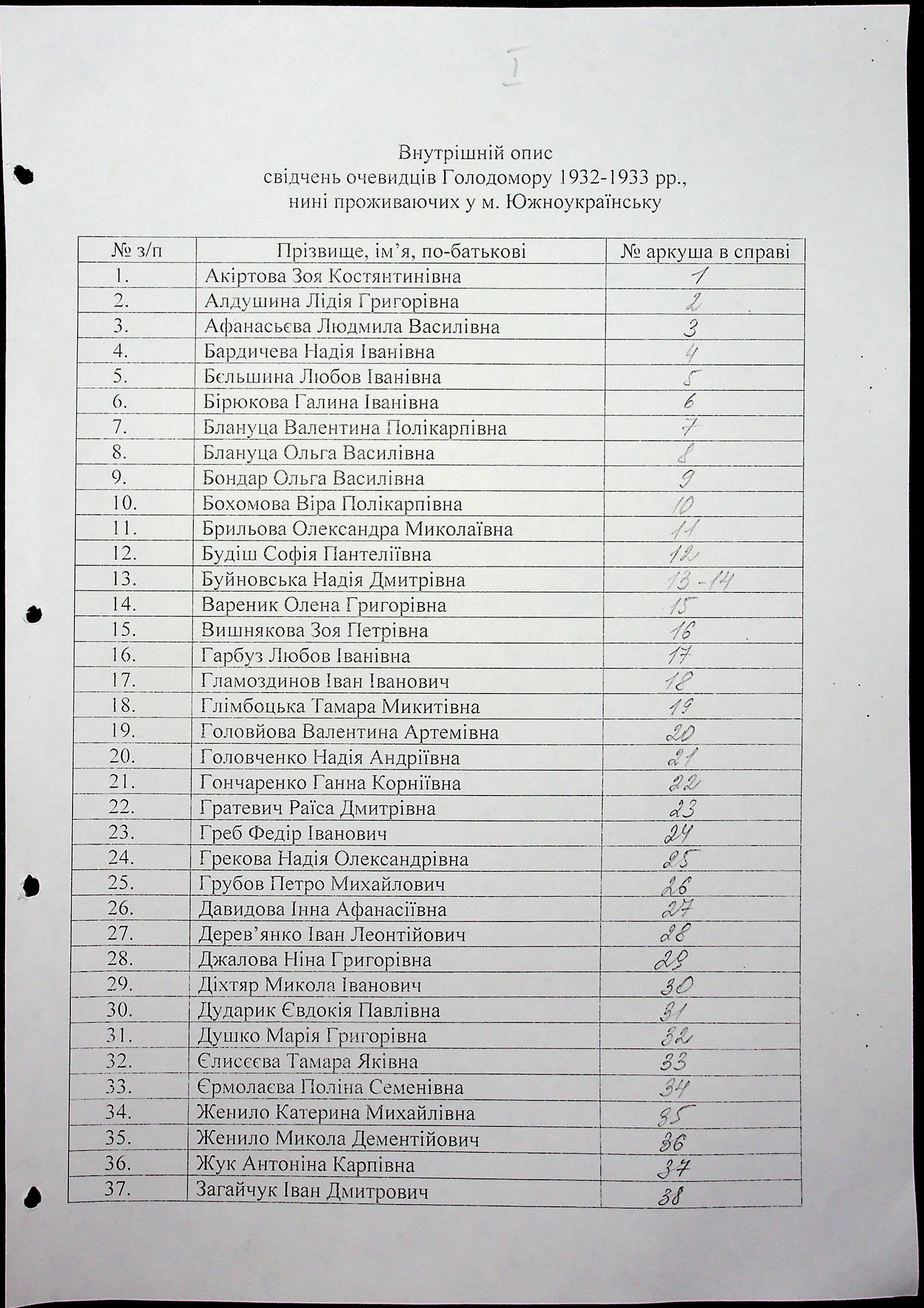 • • • • Справа № 77 “Свідчення очевидців Голодомору 1932-1933 років, нині проживаючих у місті Южноукраїнську, з прізвищами на літери А–Я”