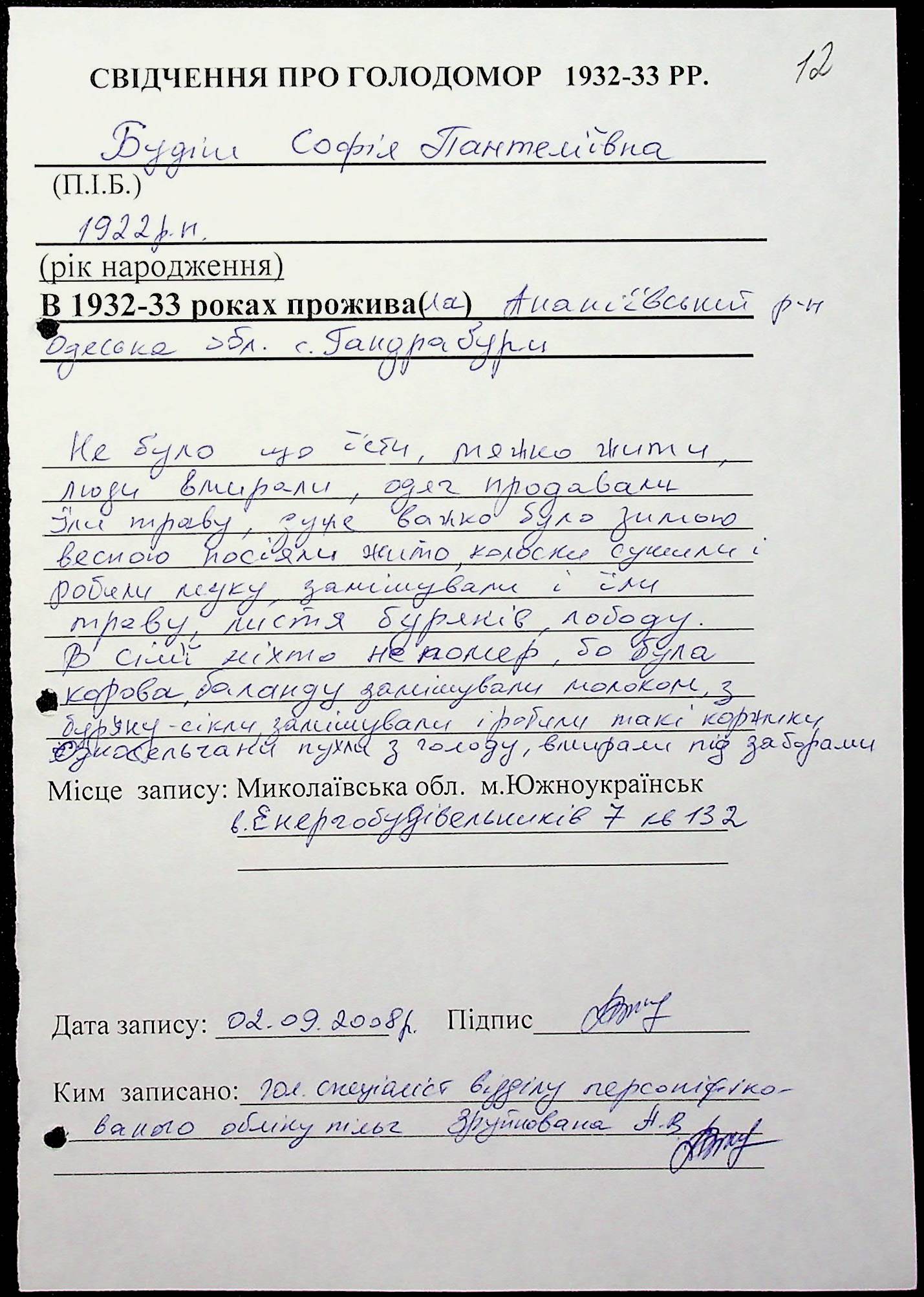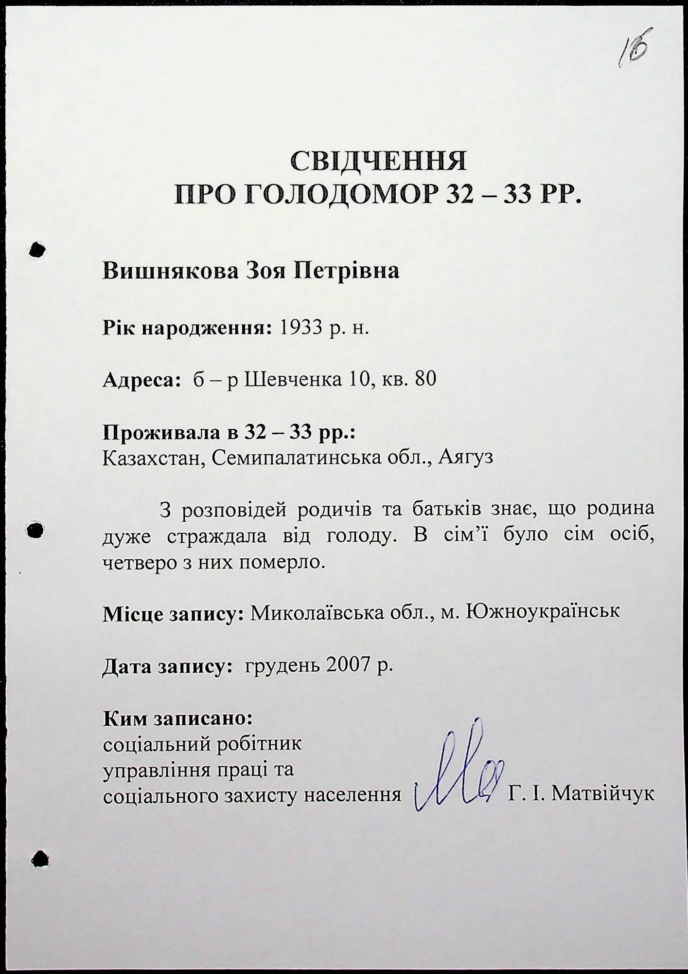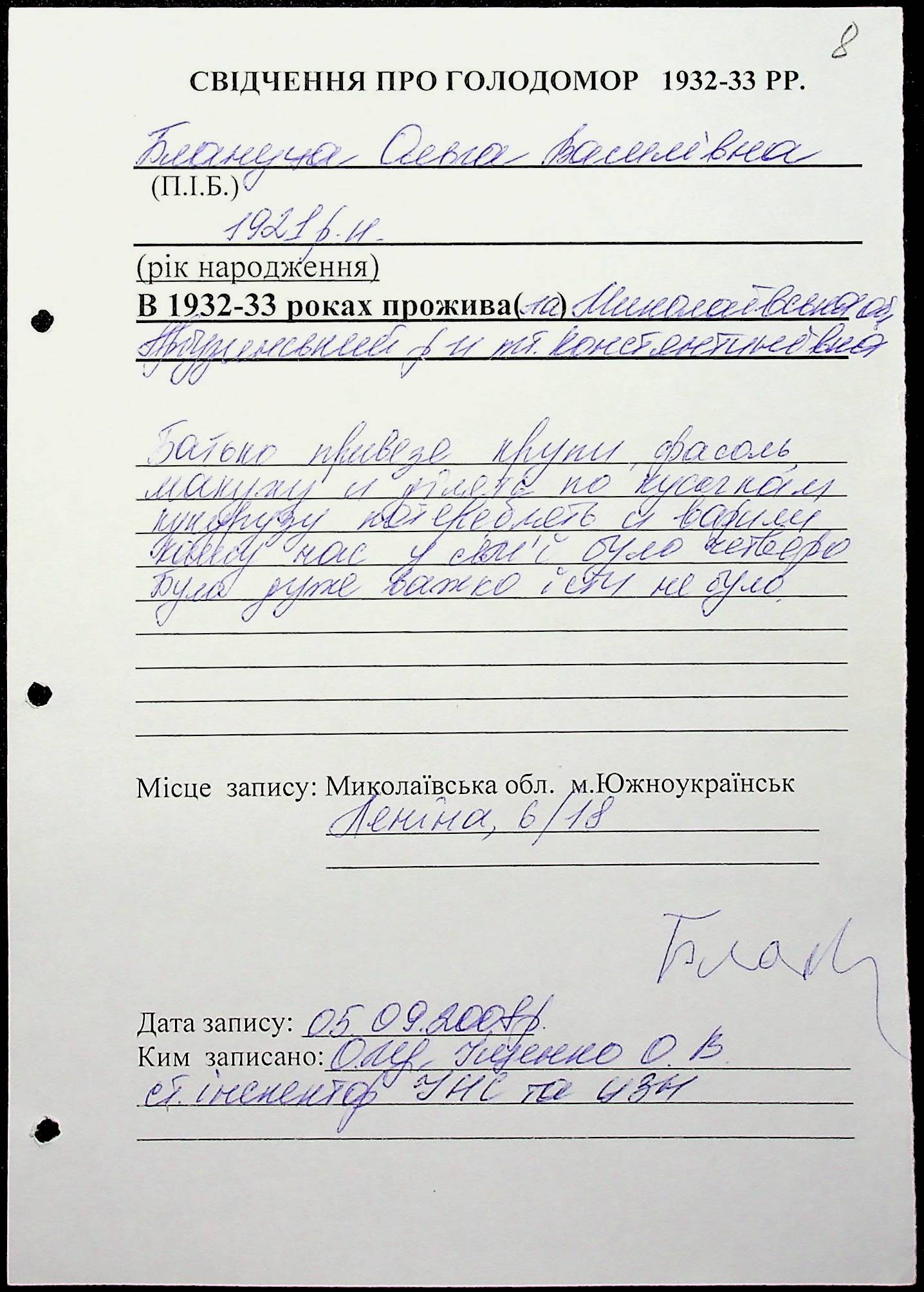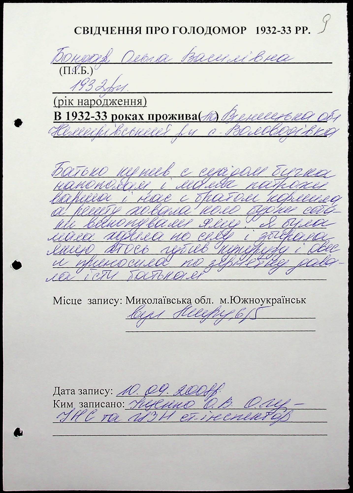 • • • • Справа № 77 “Свідчення очевидців Голодомору 1932-1933 років, нині проживаючих у місті Южноукраїнську, з прізвищами на літери А–Я”