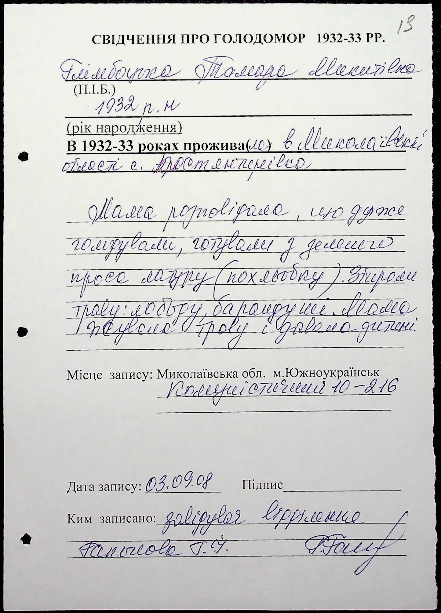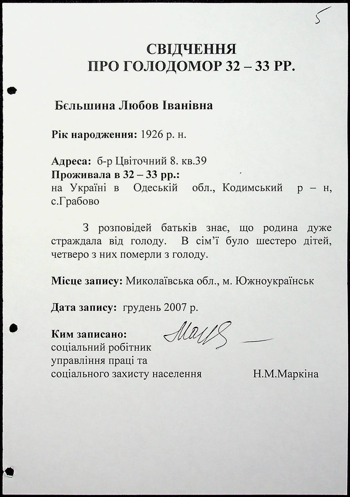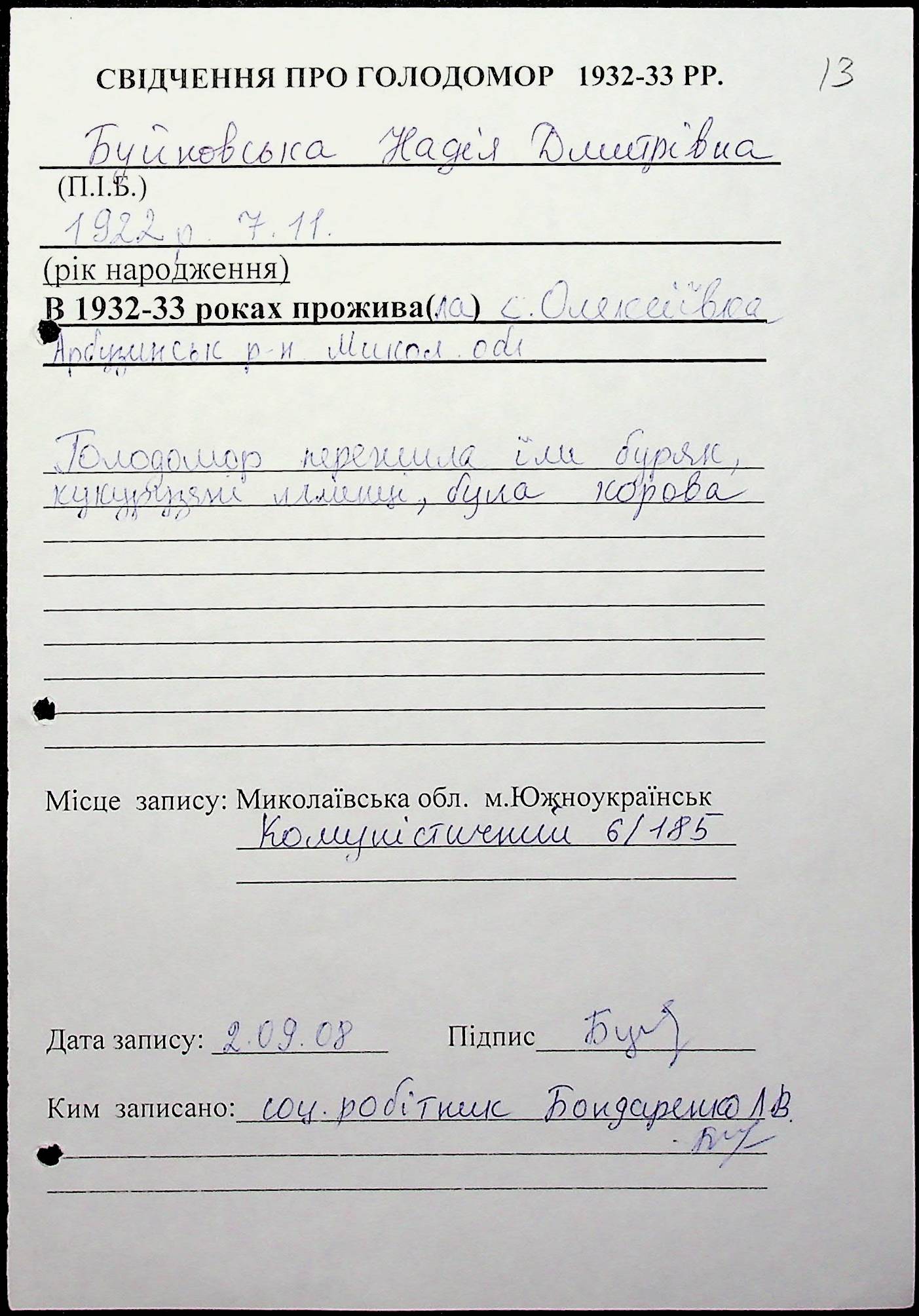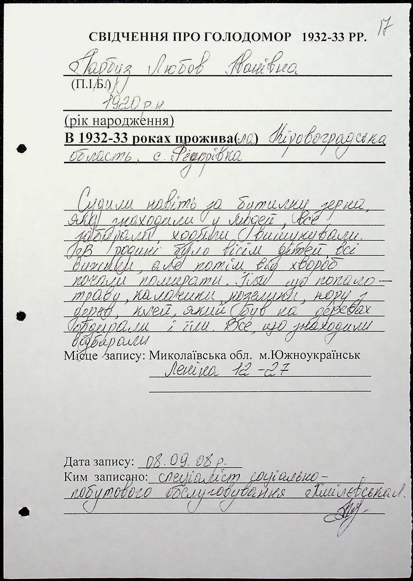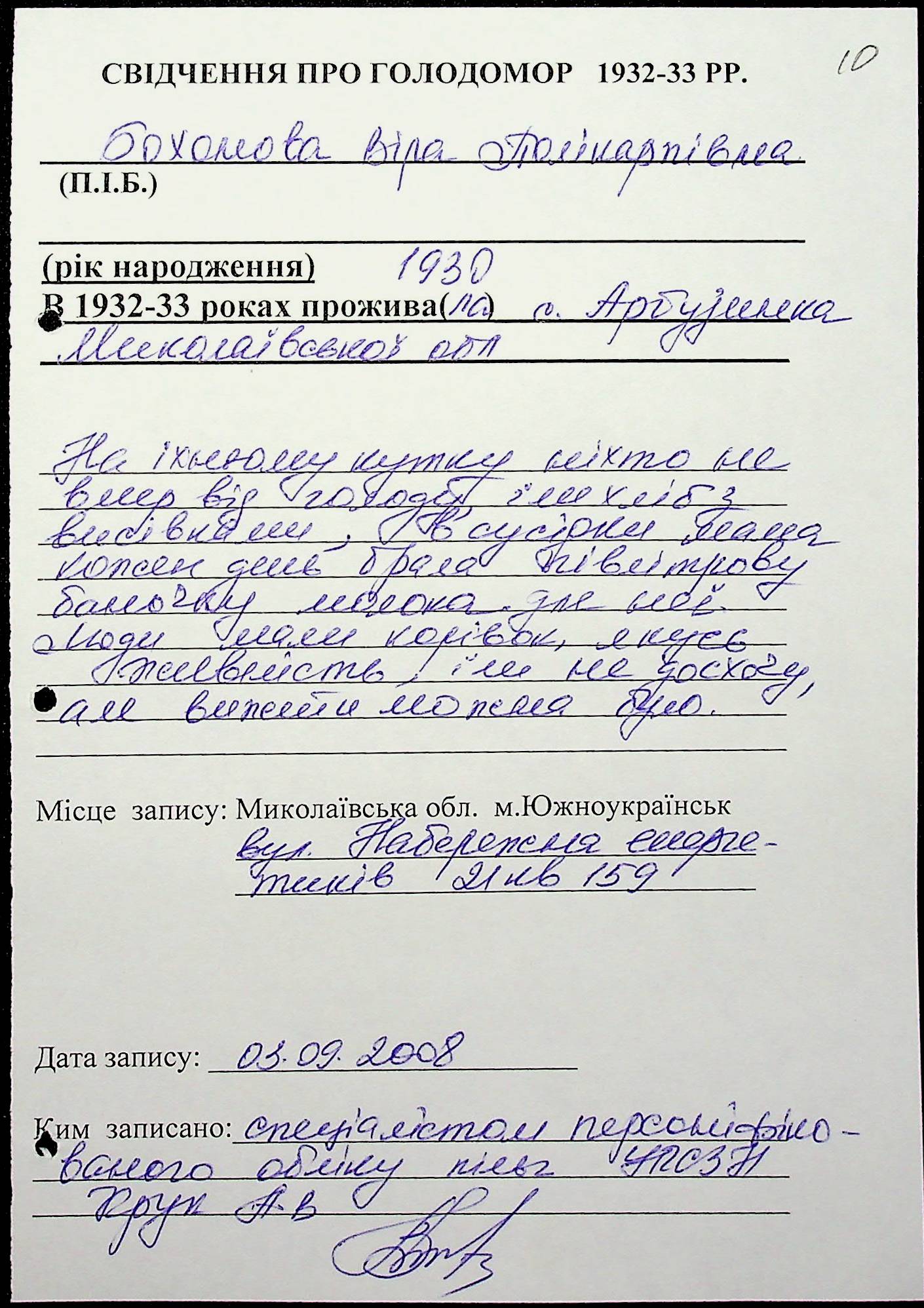 • • • • Справа № 77 “Свідчення очевидців Голодомору 1932-1933 років, нині проживаючих у місті Южноукраїнську, з прізвищами на літери А–Я”