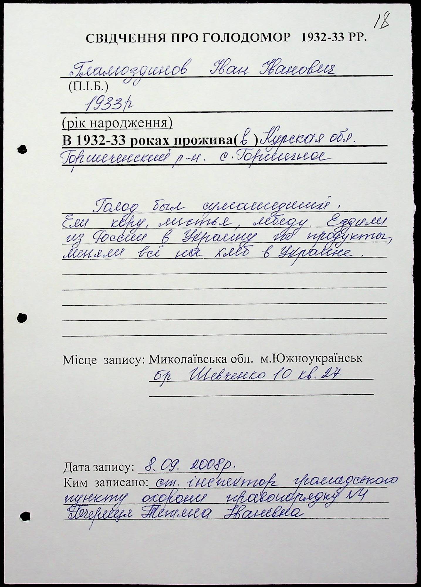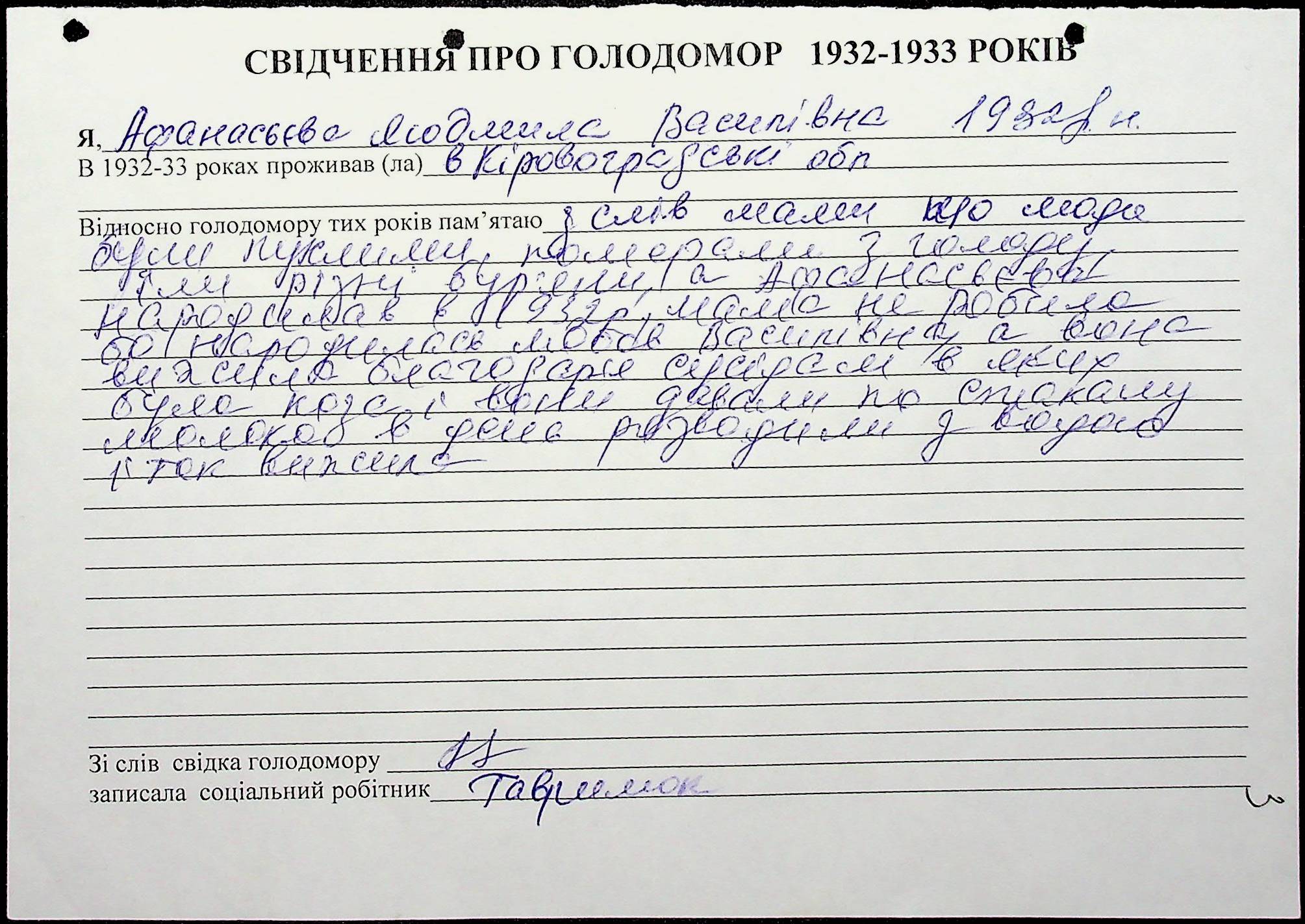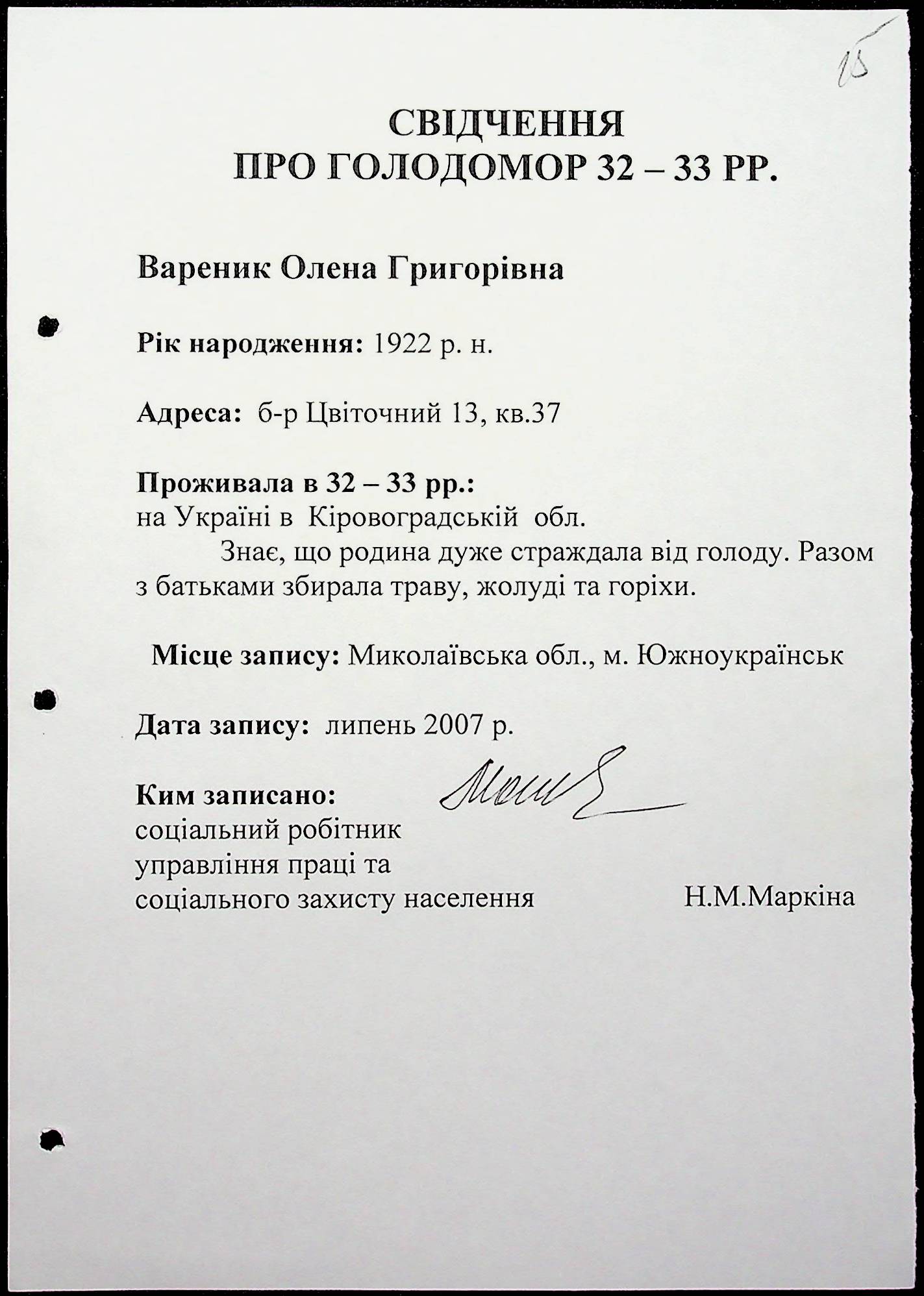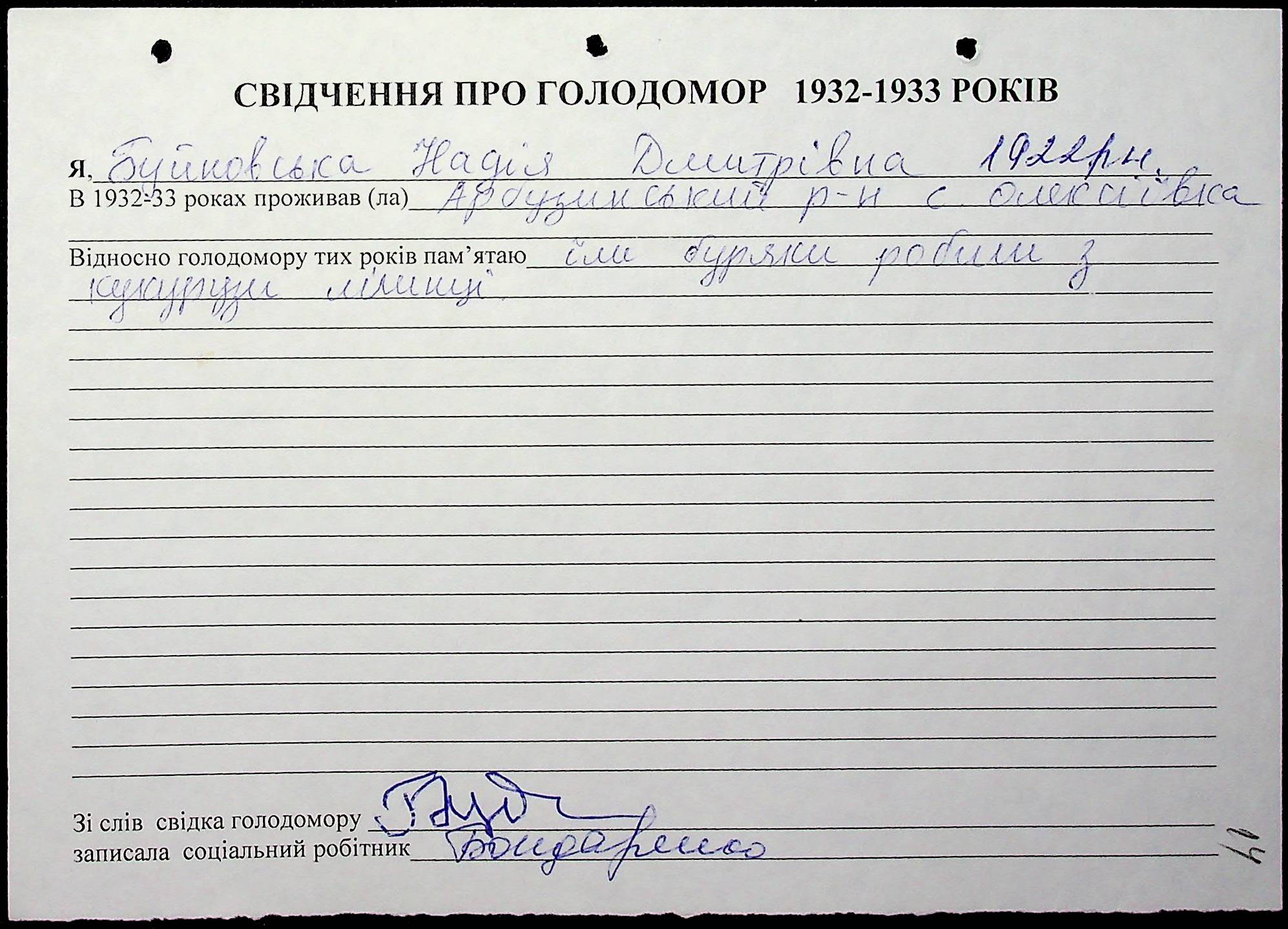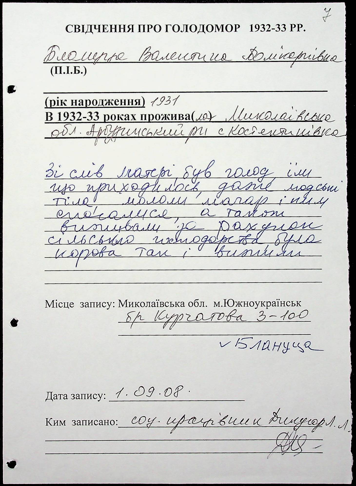 • • • • Справа № 77 “Свідчення очевидців Голодомору 1932-1933 років, нині проживаючих у місті Южноукраїнську, з прізвищами на літери А–Я”
