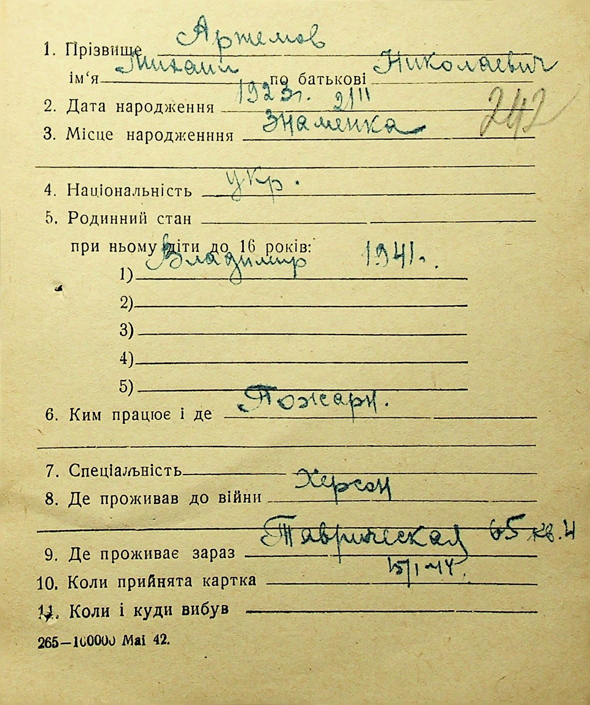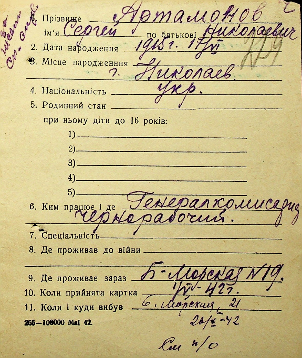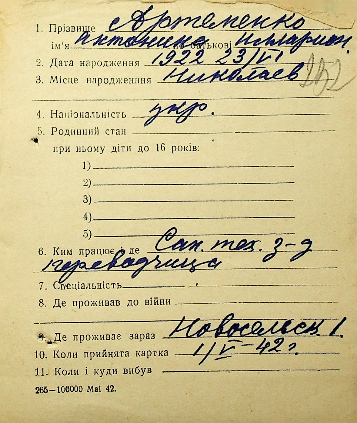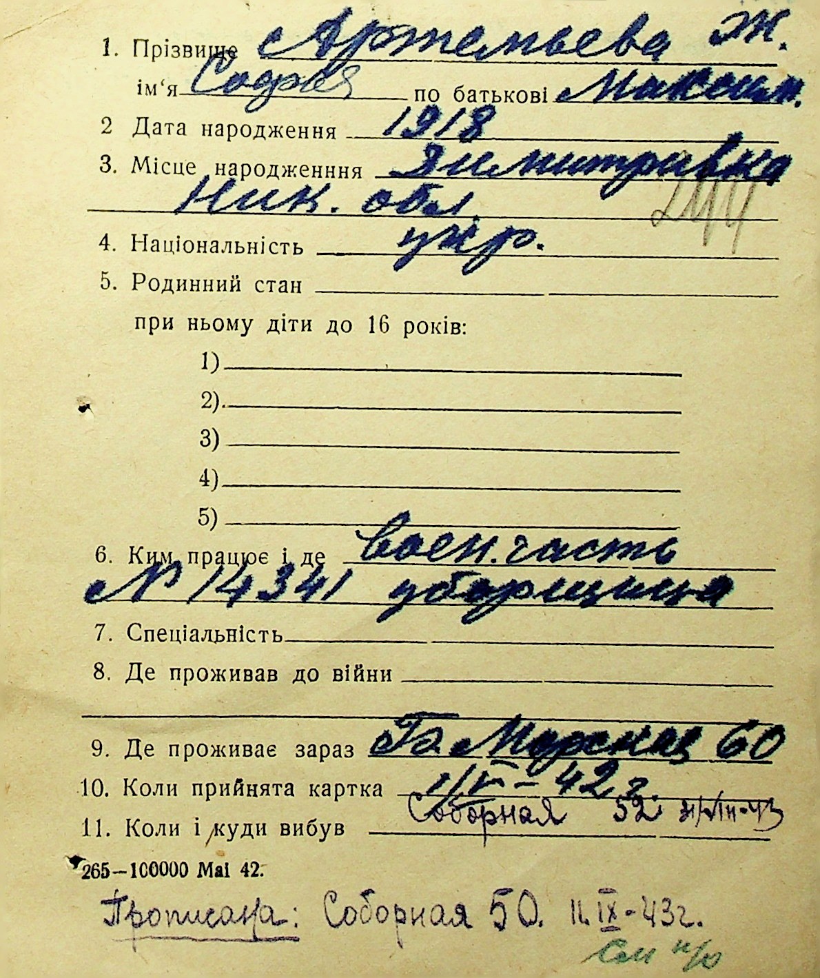 • • • • Справа № 1 “Картки адресного бюро м. Миколаєва на осіб, які працювали в німецько-фашистських установах та військових частинах. Прізвища на літеру «А». Том 3”