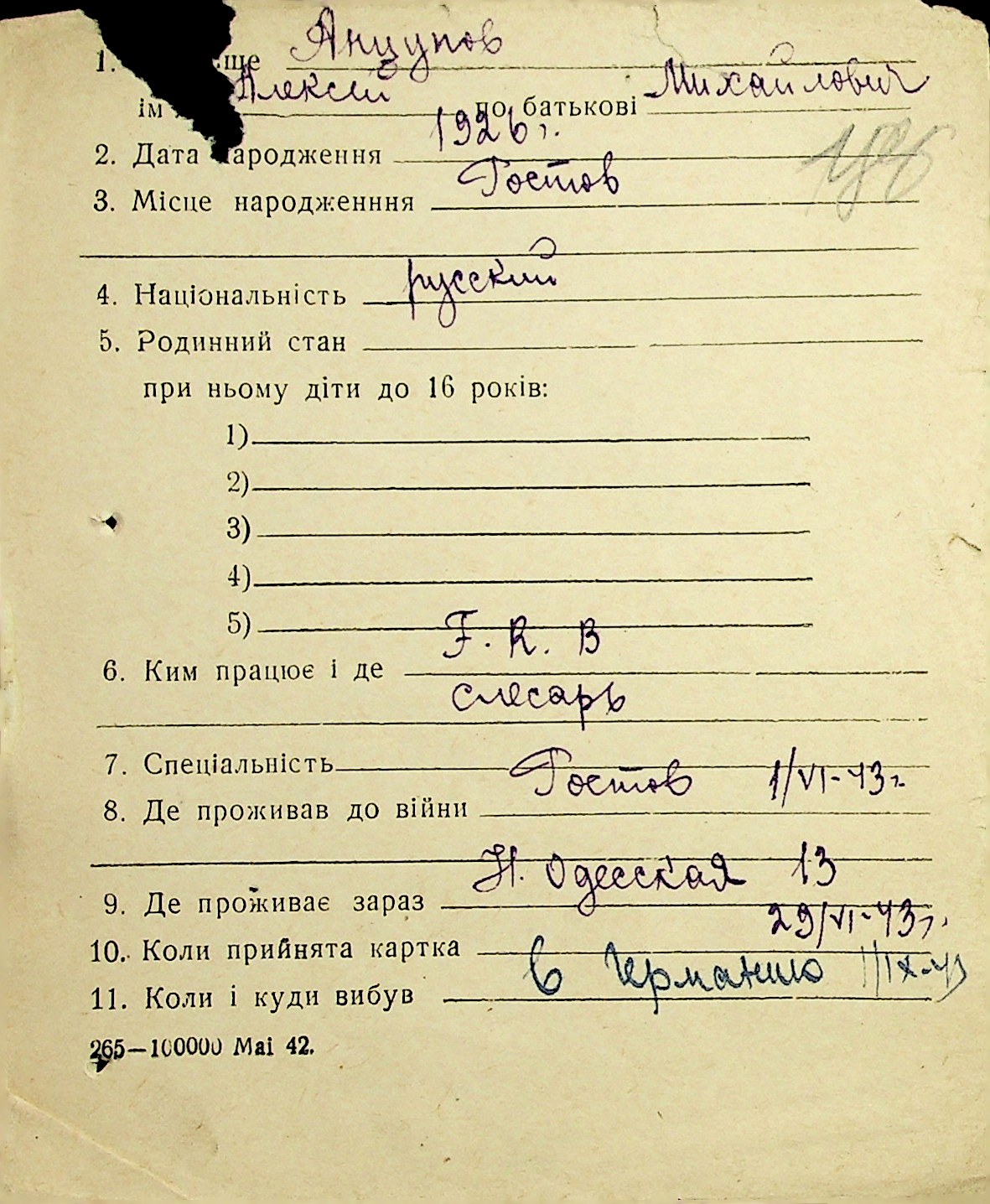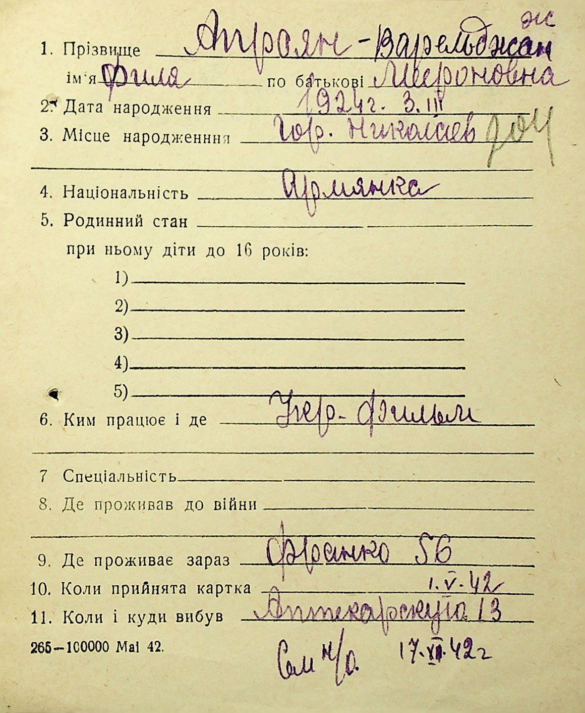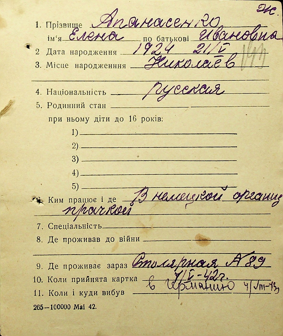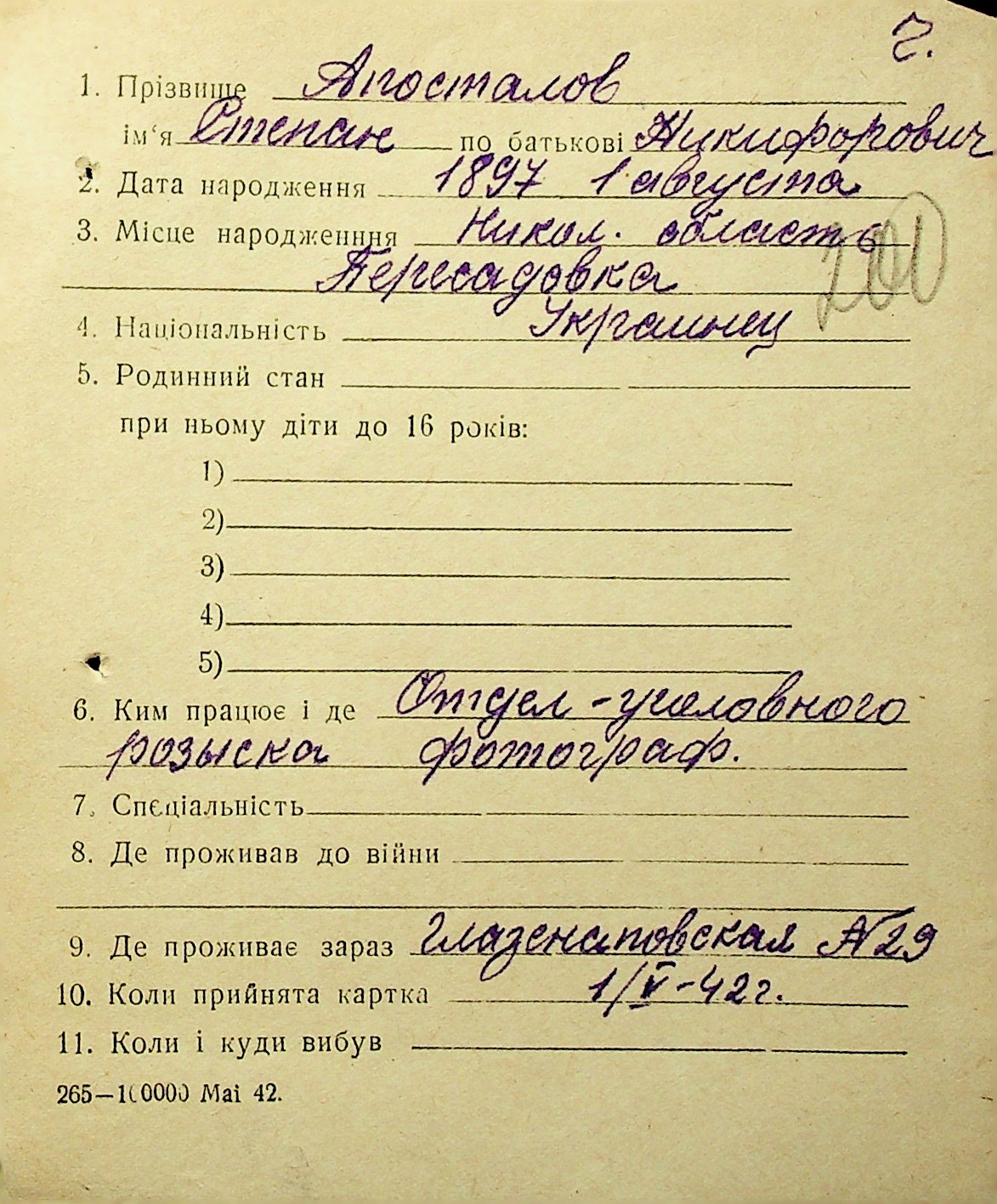 • • • • Справа № 1 “Картки адресного бюро м. Миколаєва на осіб, які працювали в німецько-фашистських установах та військових частинах. Прізвища на літеру «А». Том 3”