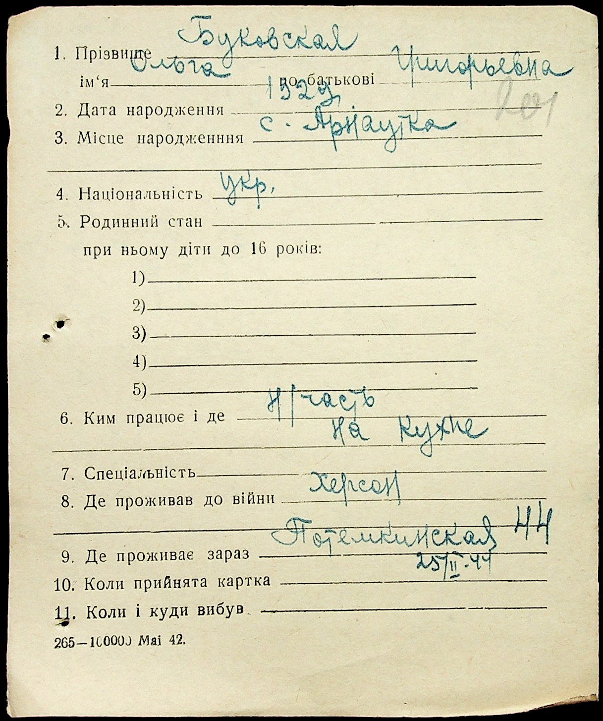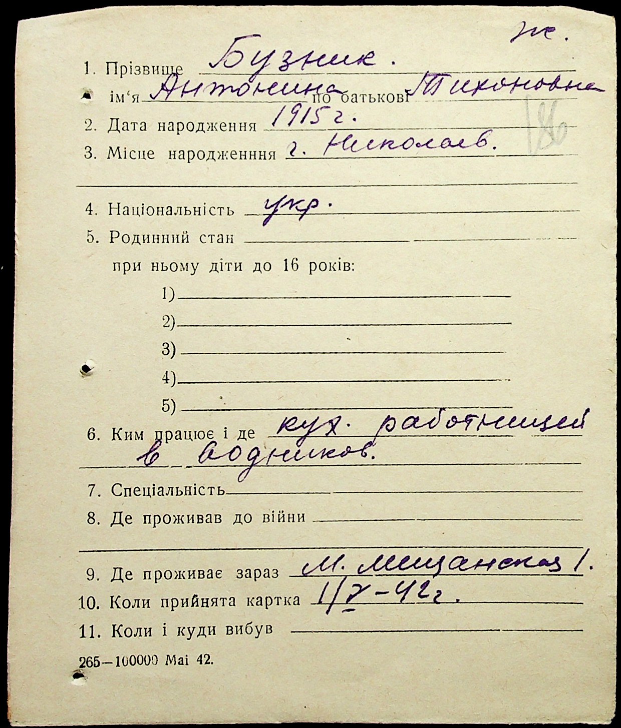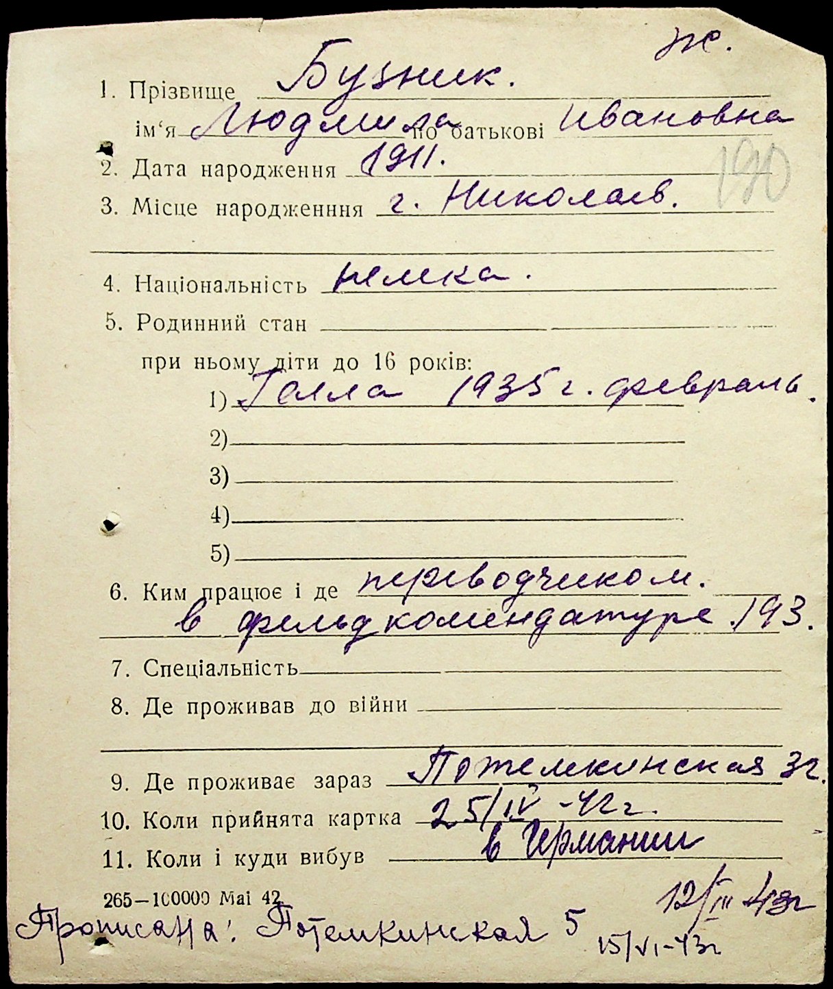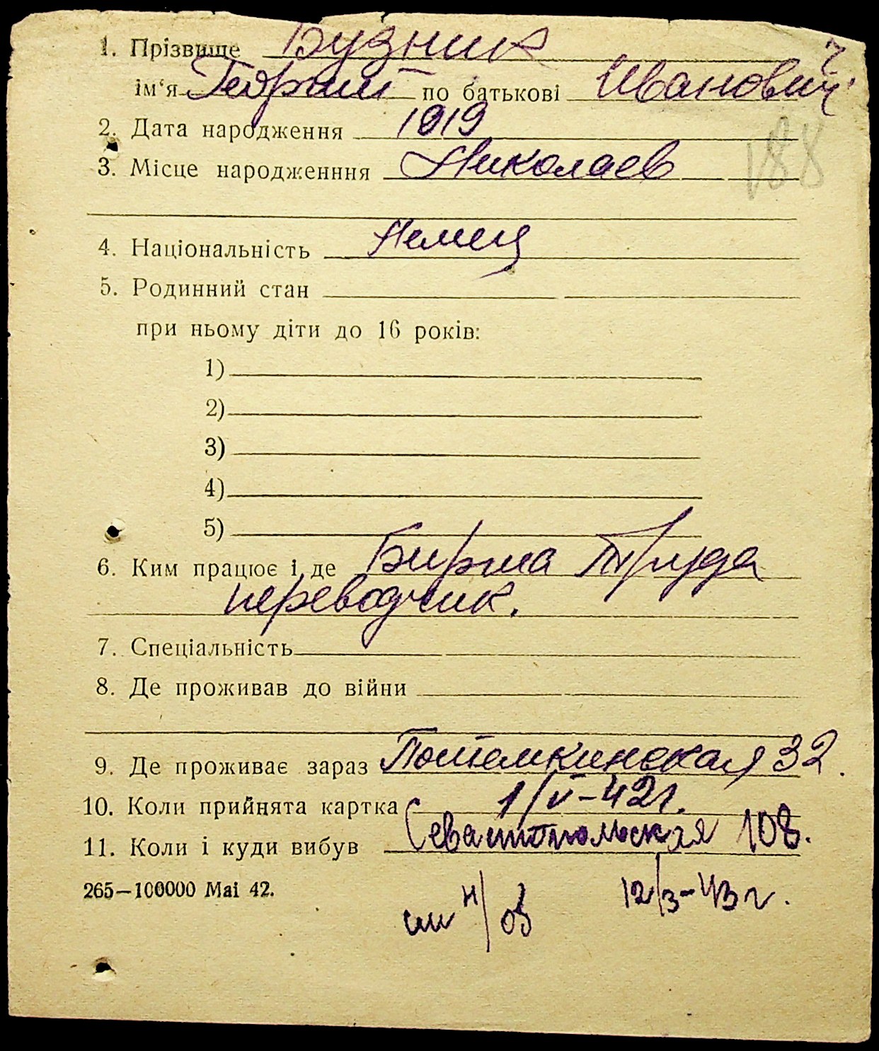 • • • • Справа № 1 “Картки адресного бюро м. Миколаєва на осіб, які працювали в німецько-фашистських установах та військових частинах. Прізвища на літеру «Б». Том 5”