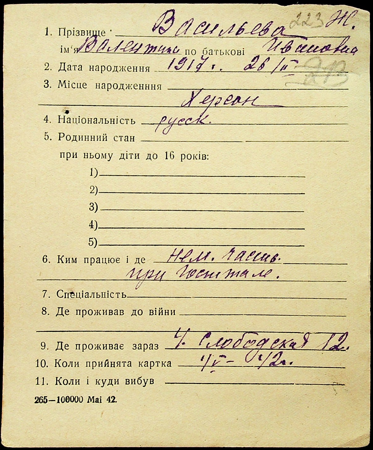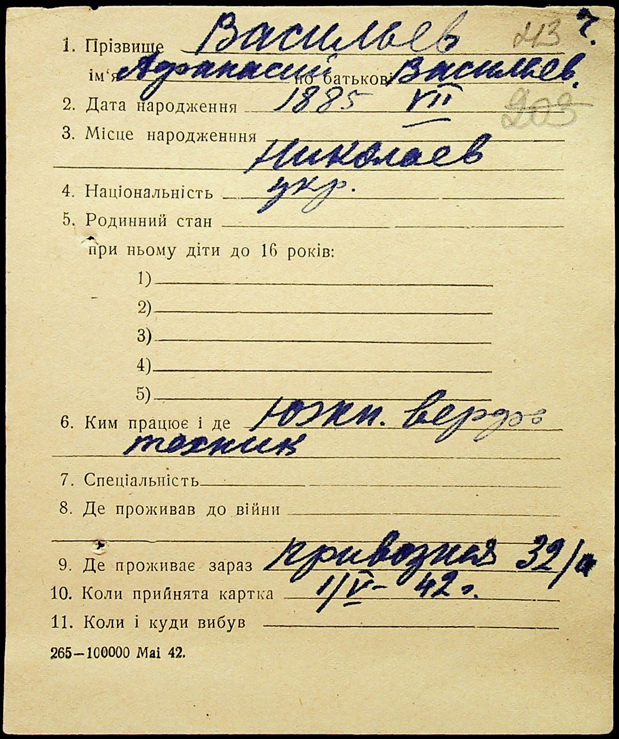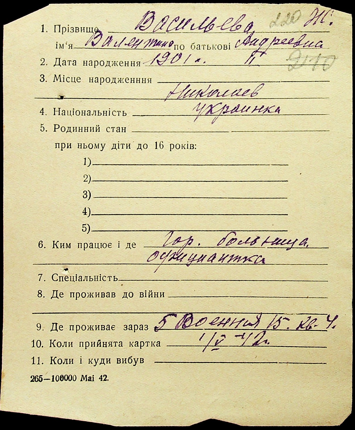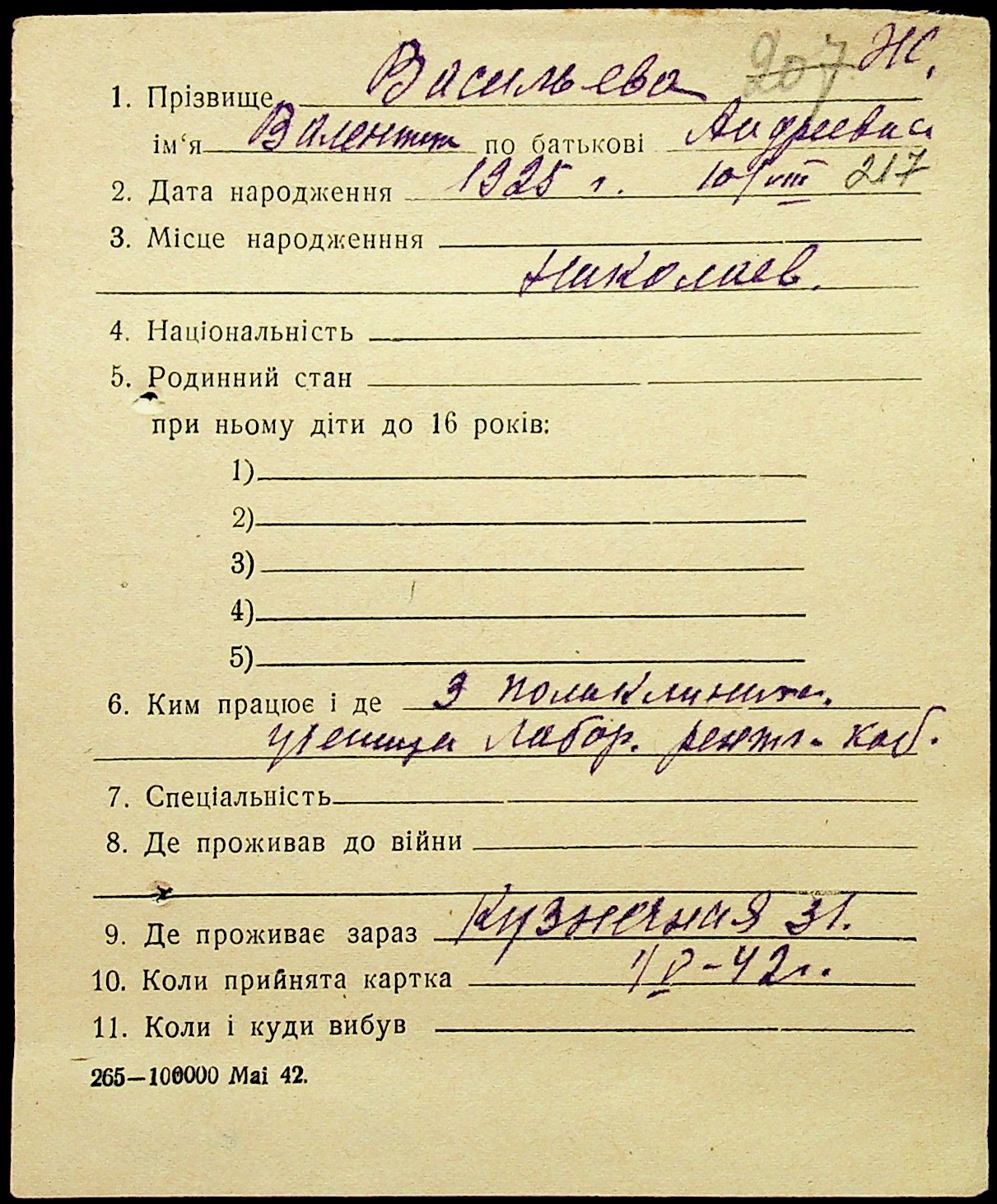 • • • • Справа № 9 “Картки адресного бюро м. Миколаєва на осіб, які працювали в німецько-фашистських установах та військових частинах. Прізвища на літеру «В». Том 1”