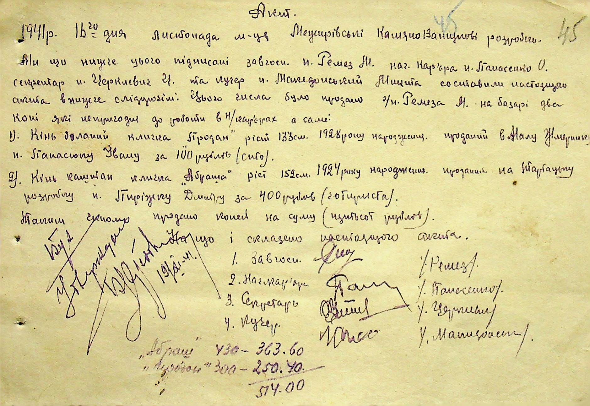 ◦ ◦ ◦ Опис № 1 справ постійного зберігання за 1941–1944 роки