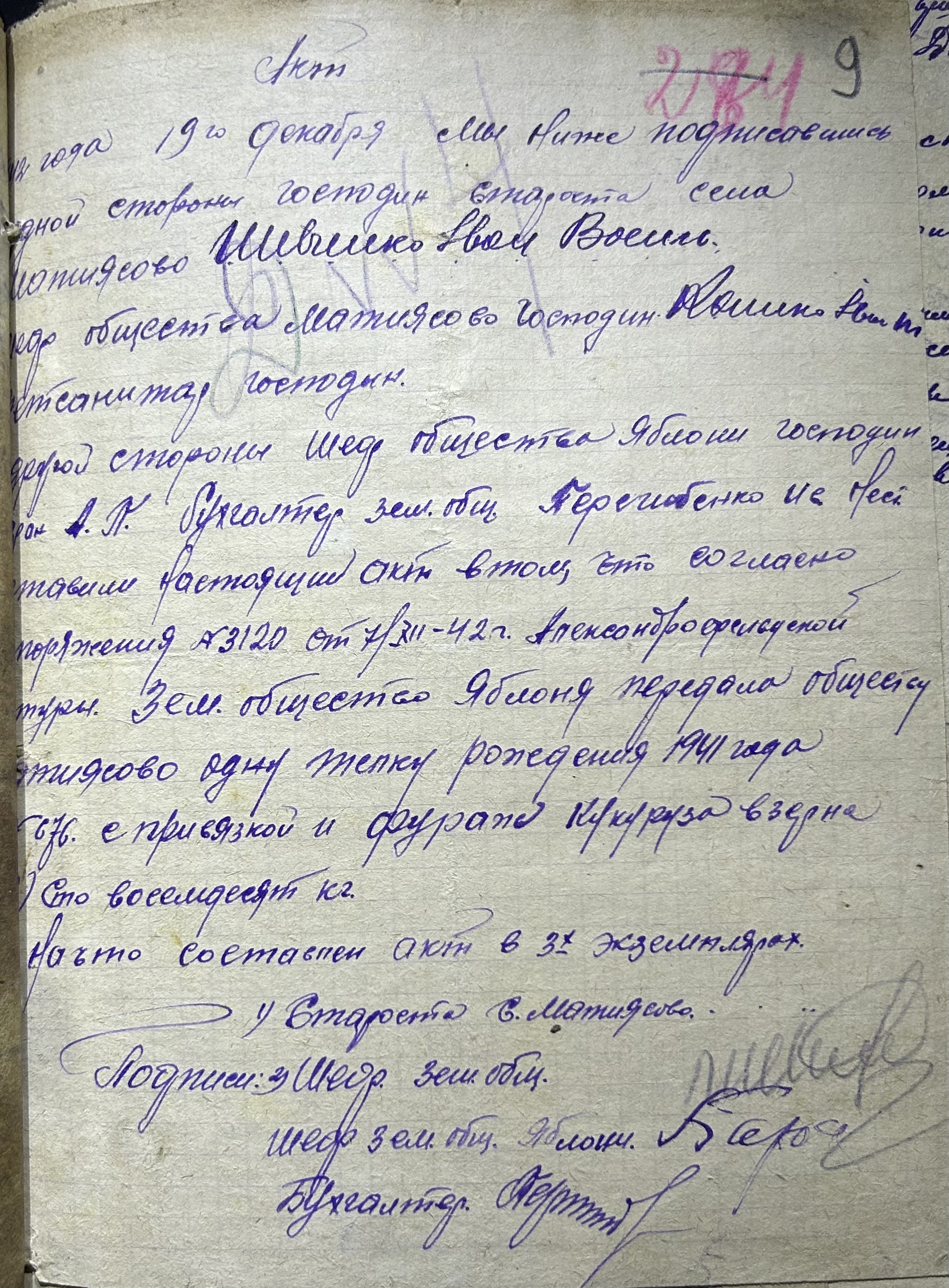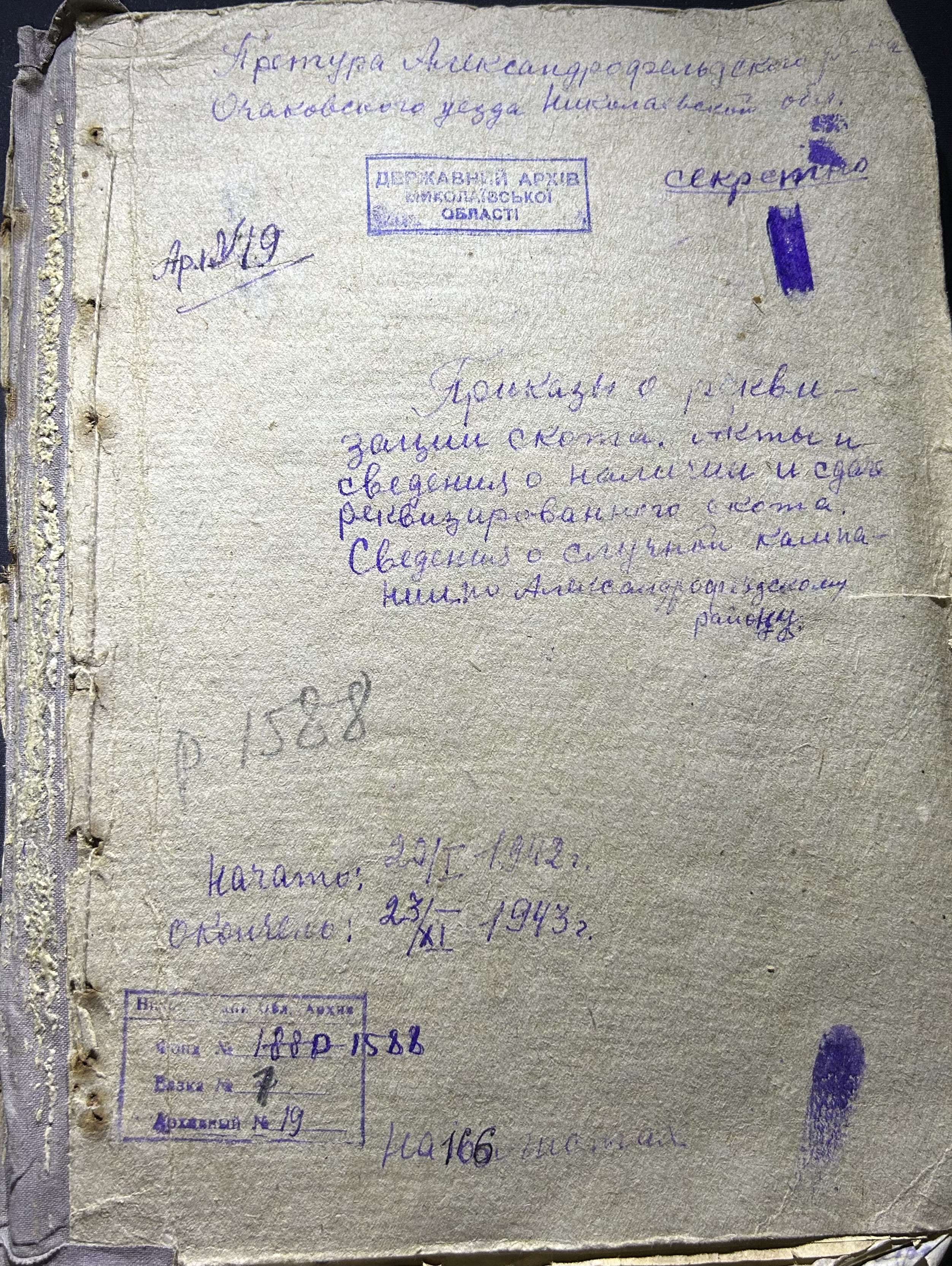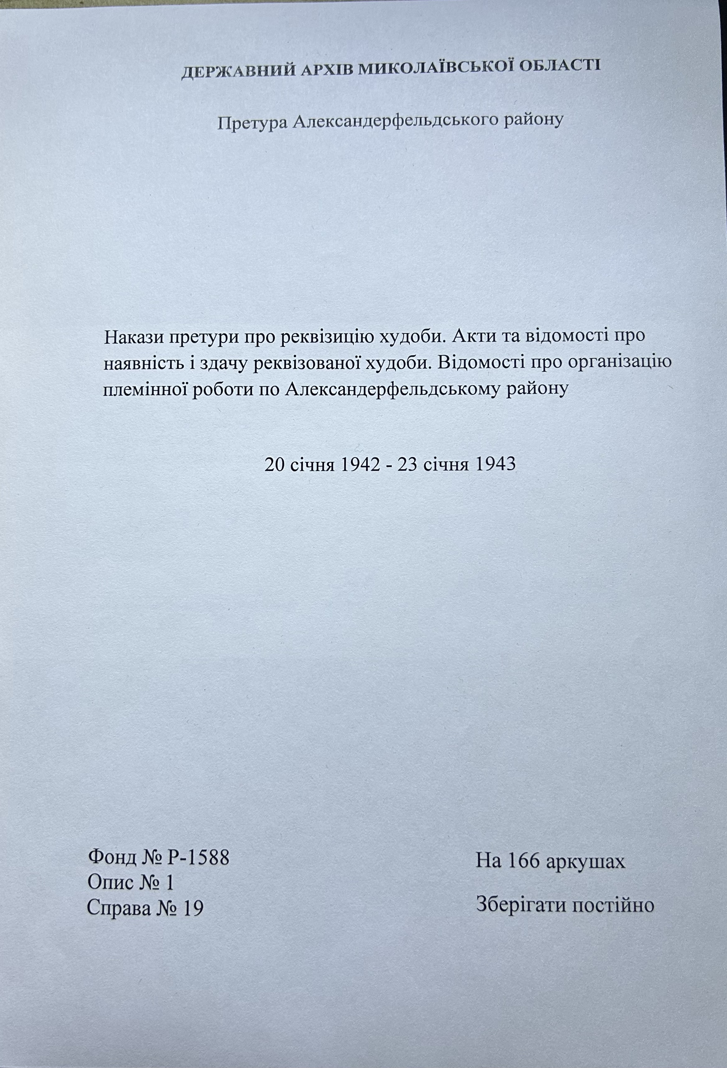 • • • • Справа № 19 “Накази претури про реквізицію худоби. Акти та відомості про наявність і здачу реквізованої худоби. Відомості про організацію племінної роботи по Александерфельдському району”