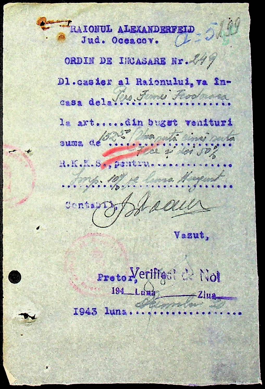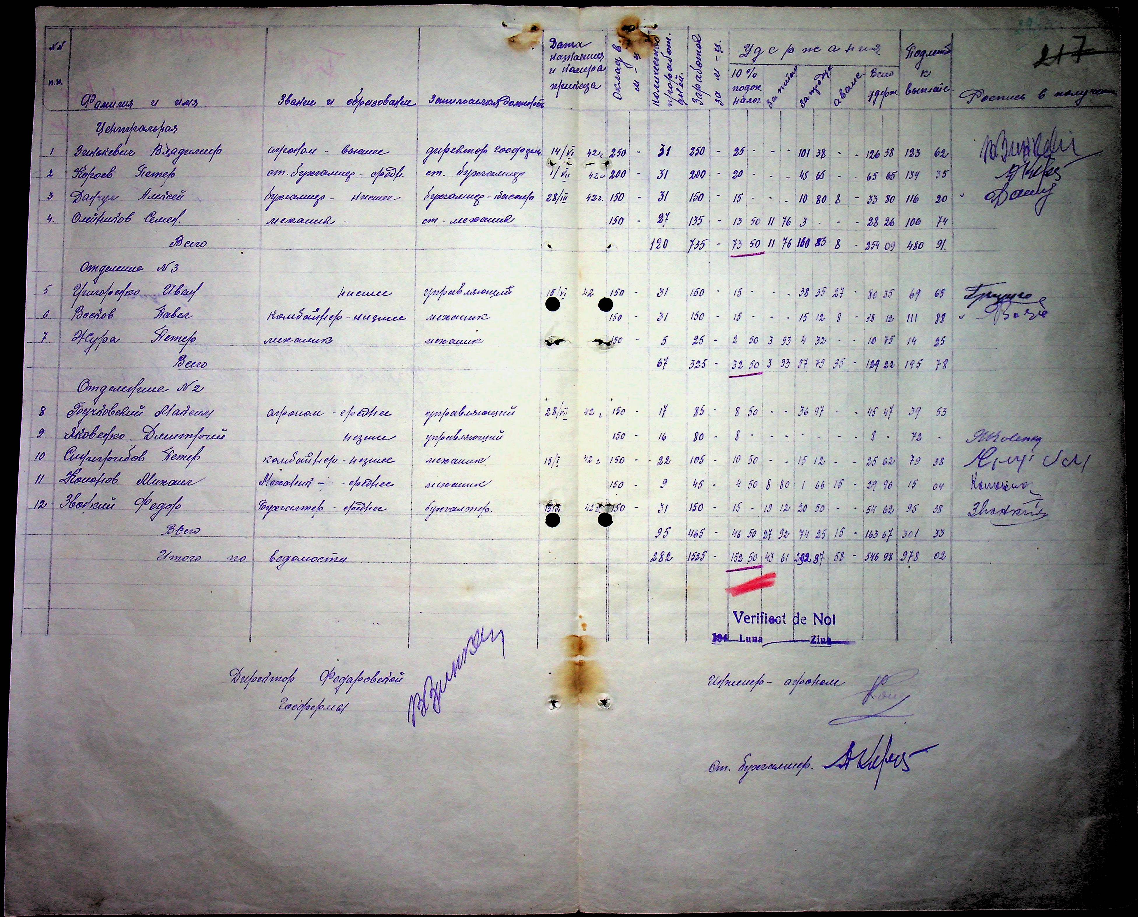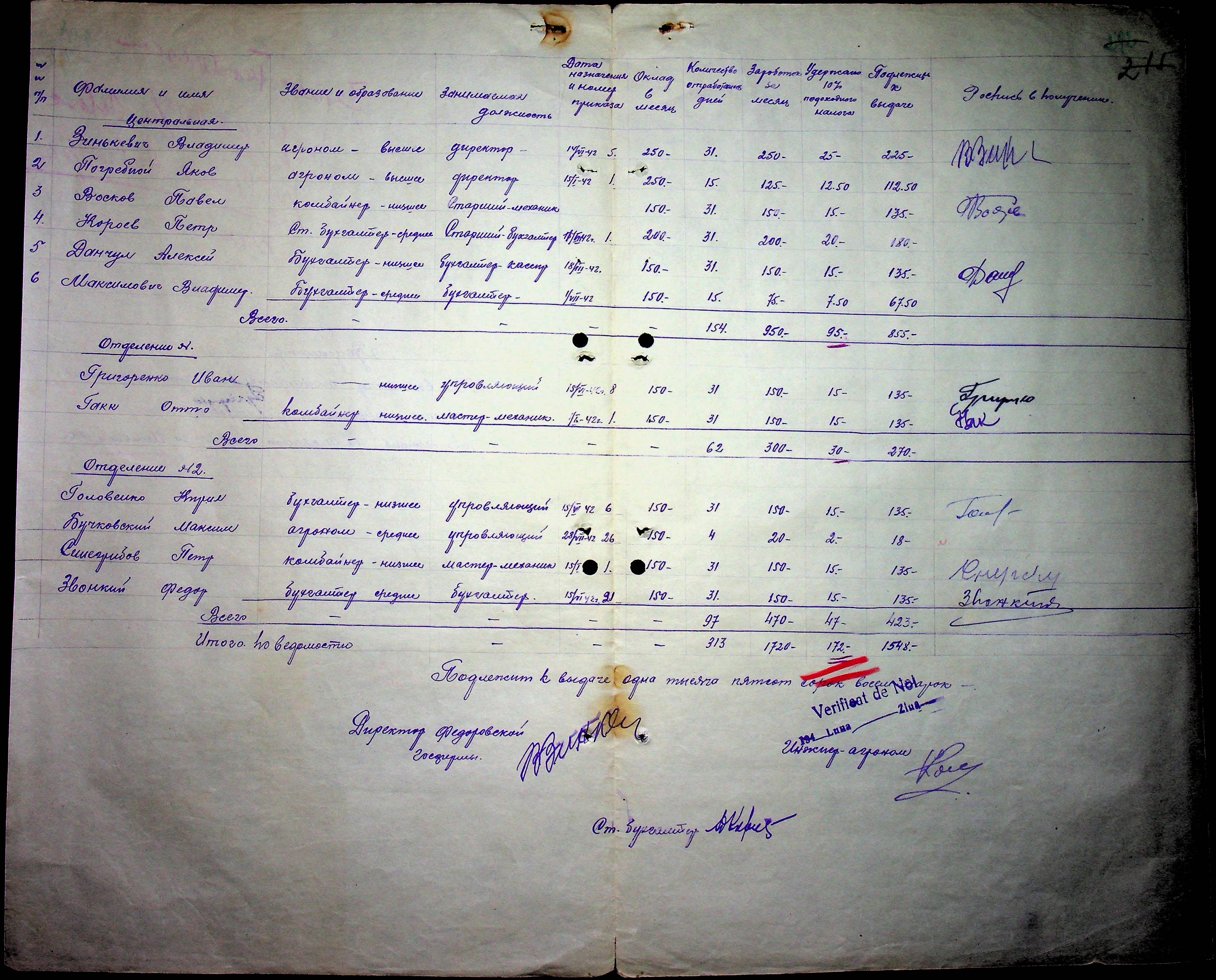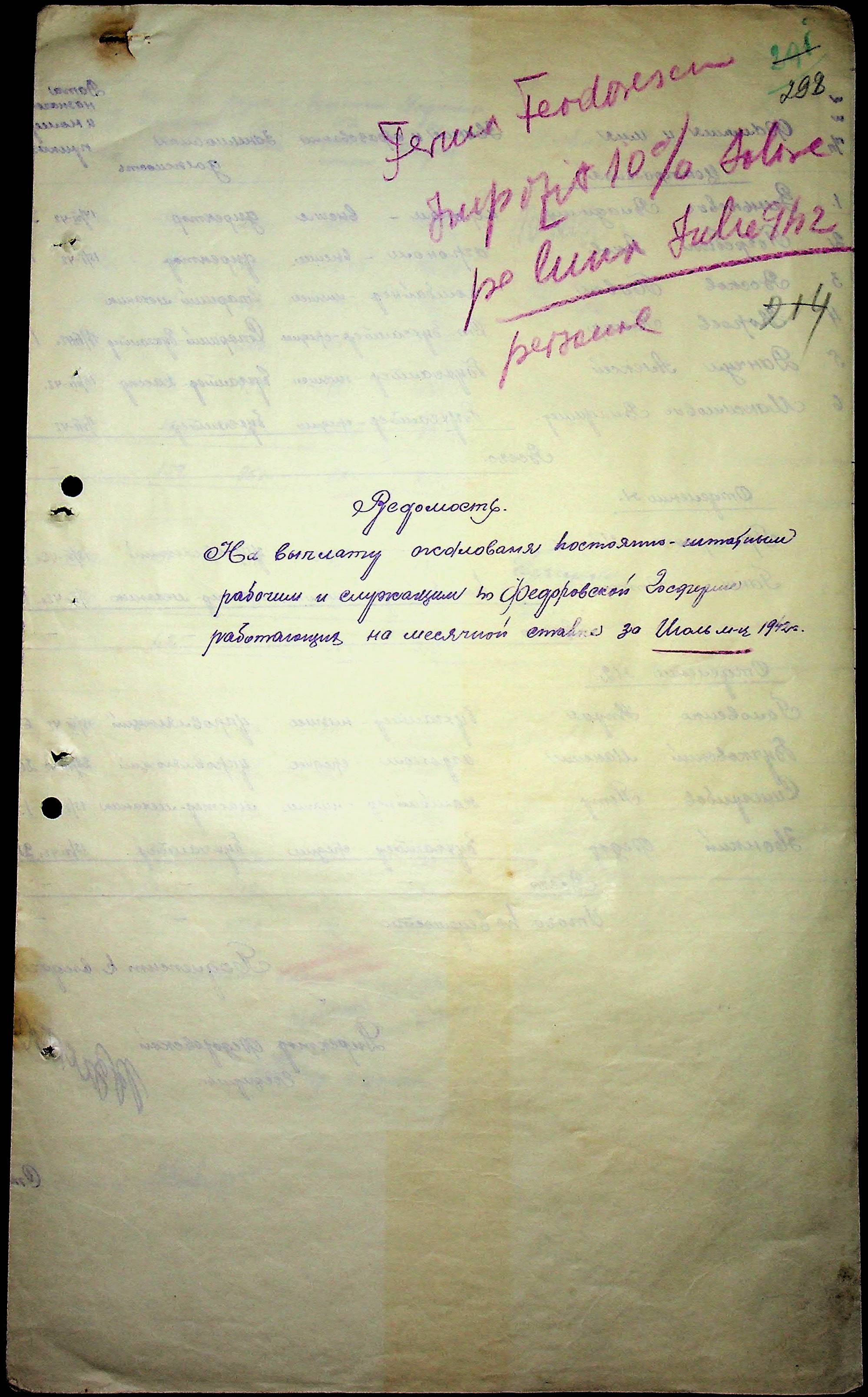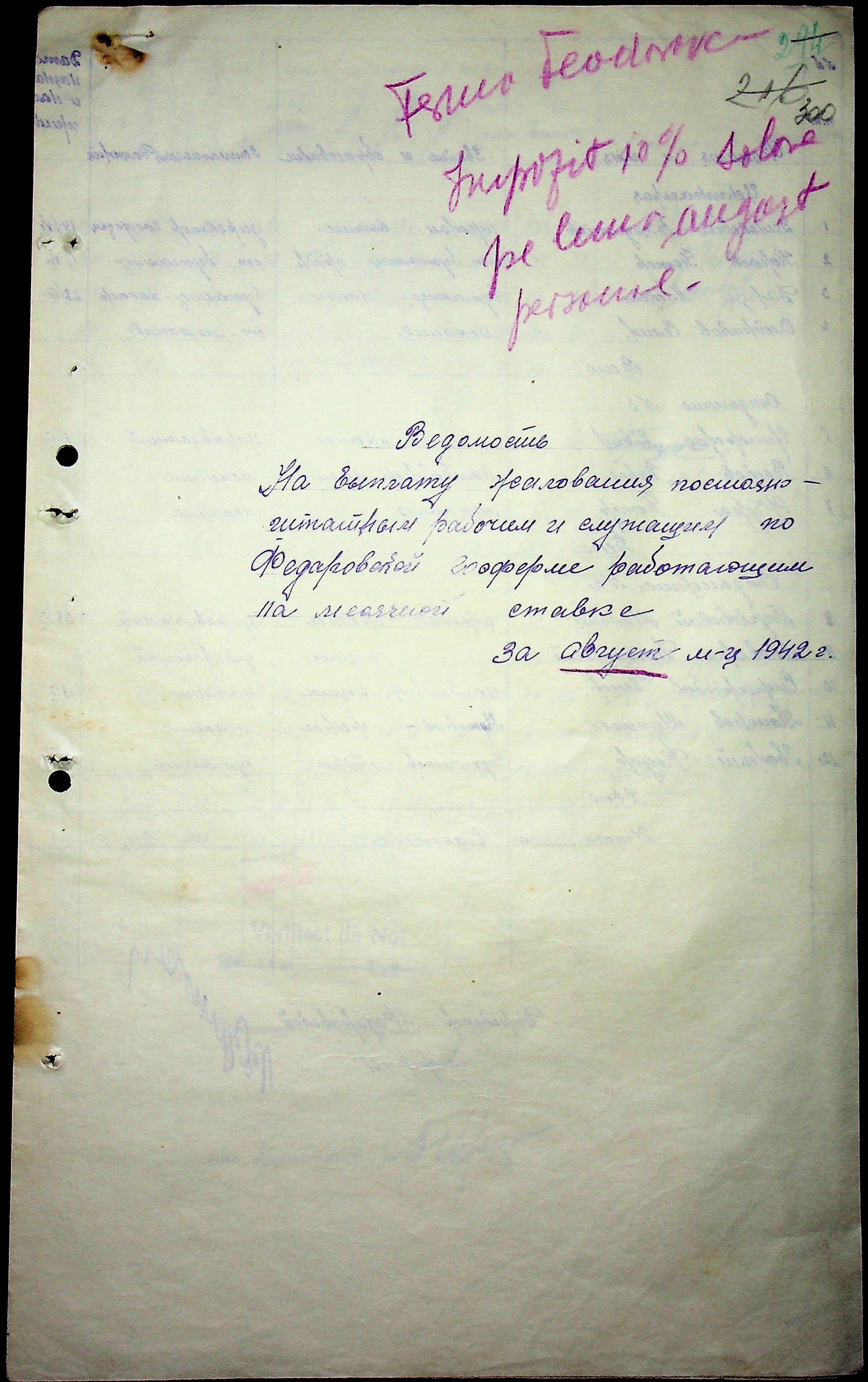 • • • • Справа № 109 “Відомості по заробітній платі штатних робітників та службовців Александерфельдського району за 1942-1943 роки”