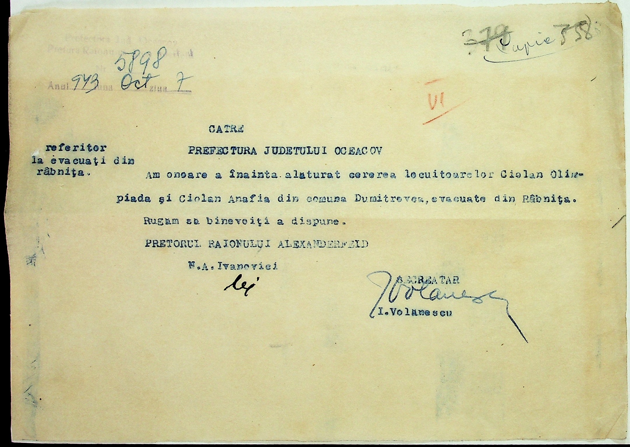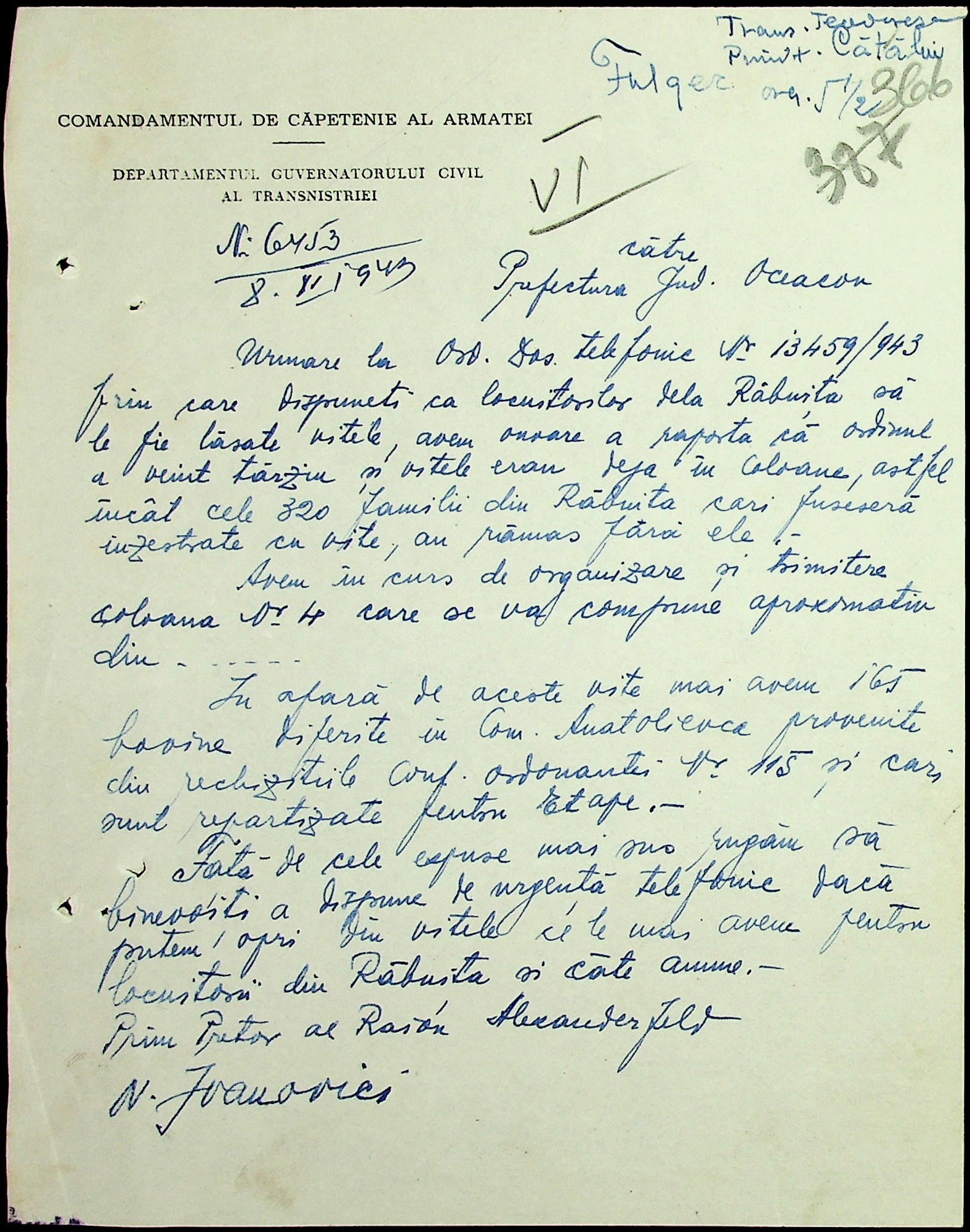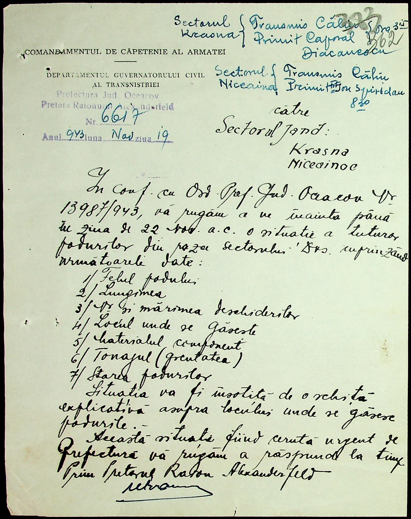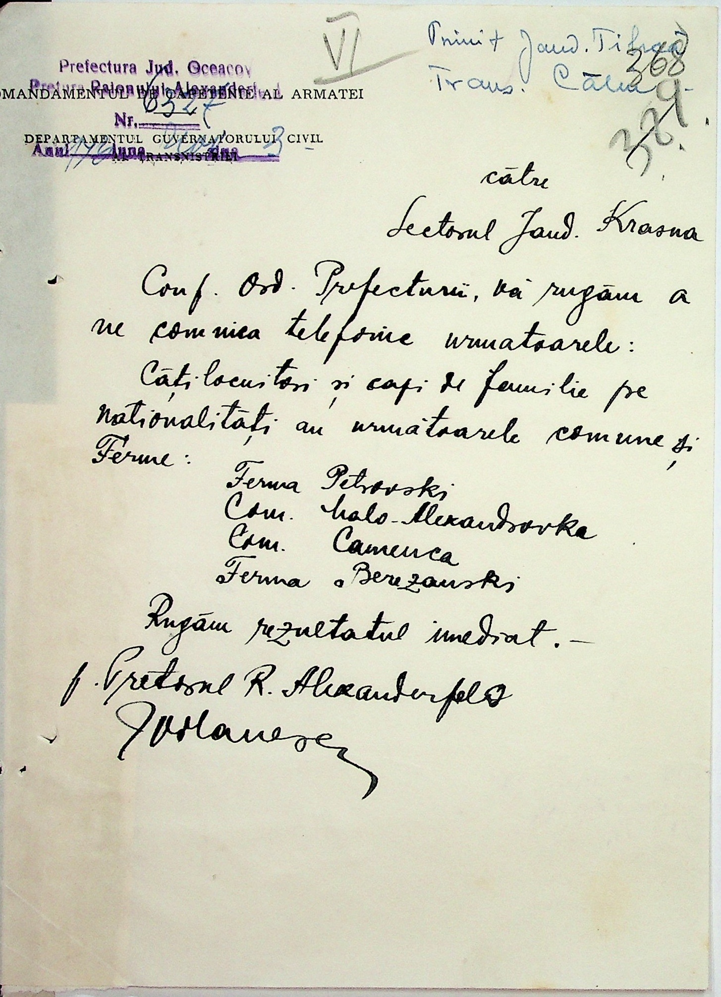 • • • • Справа № 7 “Накази, постанови цивільного губернатора Трансністрії (копії), листування з адміністративним відділом Очаківської префектури про використання місцевих співробітників на роботах під контролем румунської адміністрації, заведення російсько-румунських журналів для реєстрації актів громадянського стану, про надання канцелярського приладдя для сільськогосподарського відділу”