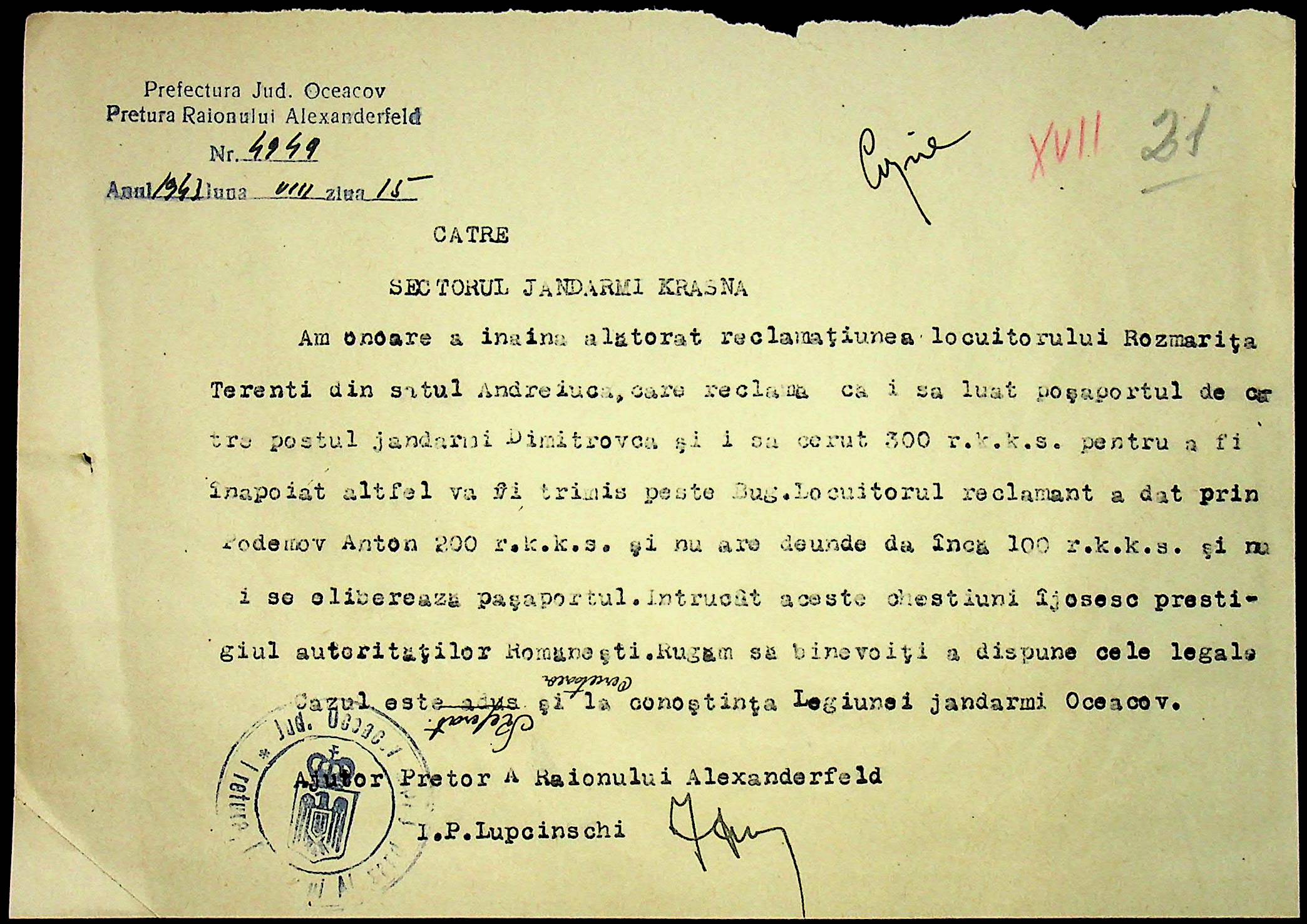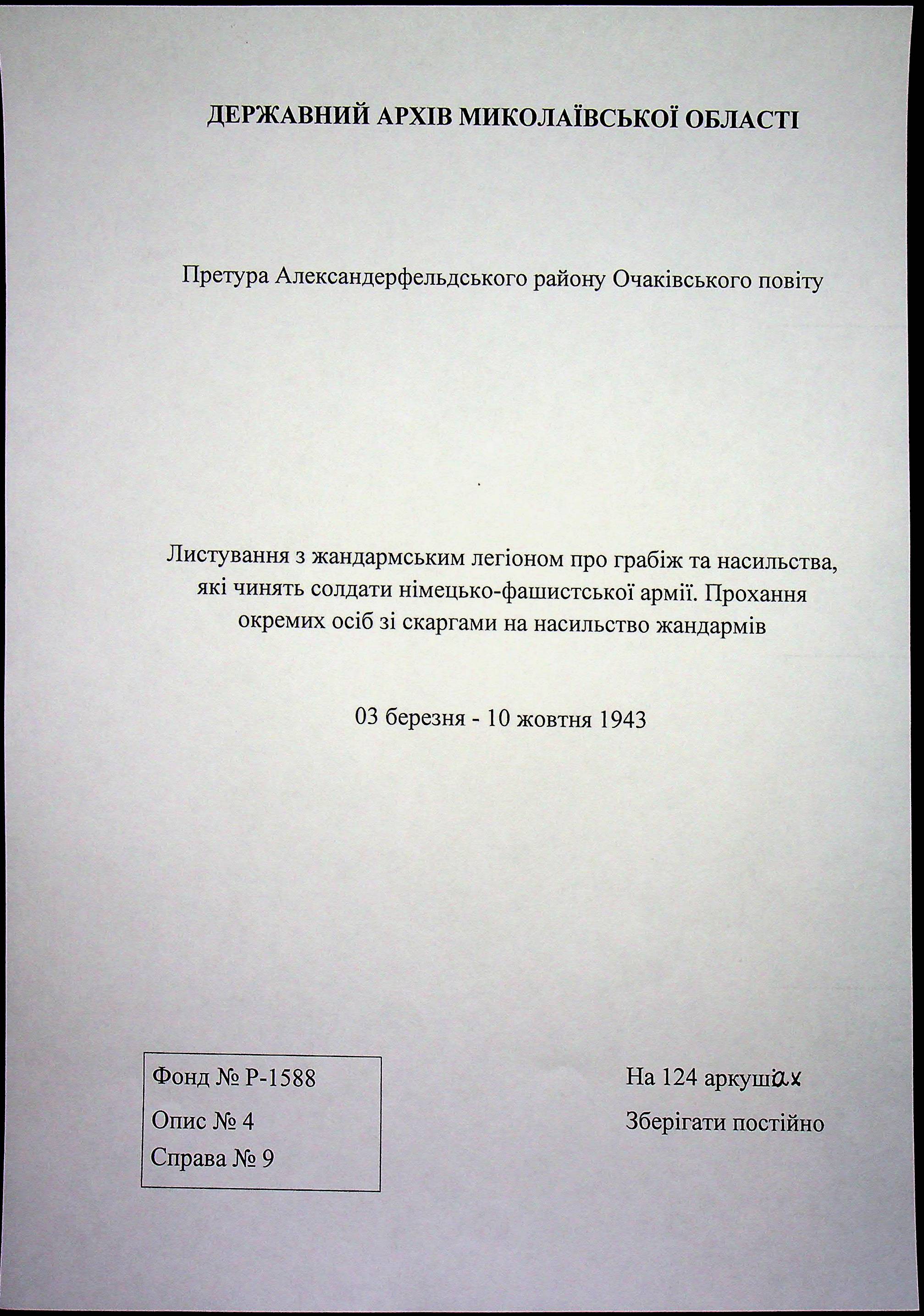 • • • • Справа № 9 “Листування з жандармським легіоном про грабіж та насильства, які чинять солдати німецько-фашистської армії. Прохання окремих осіб зі скаргами на насильство жандармів”