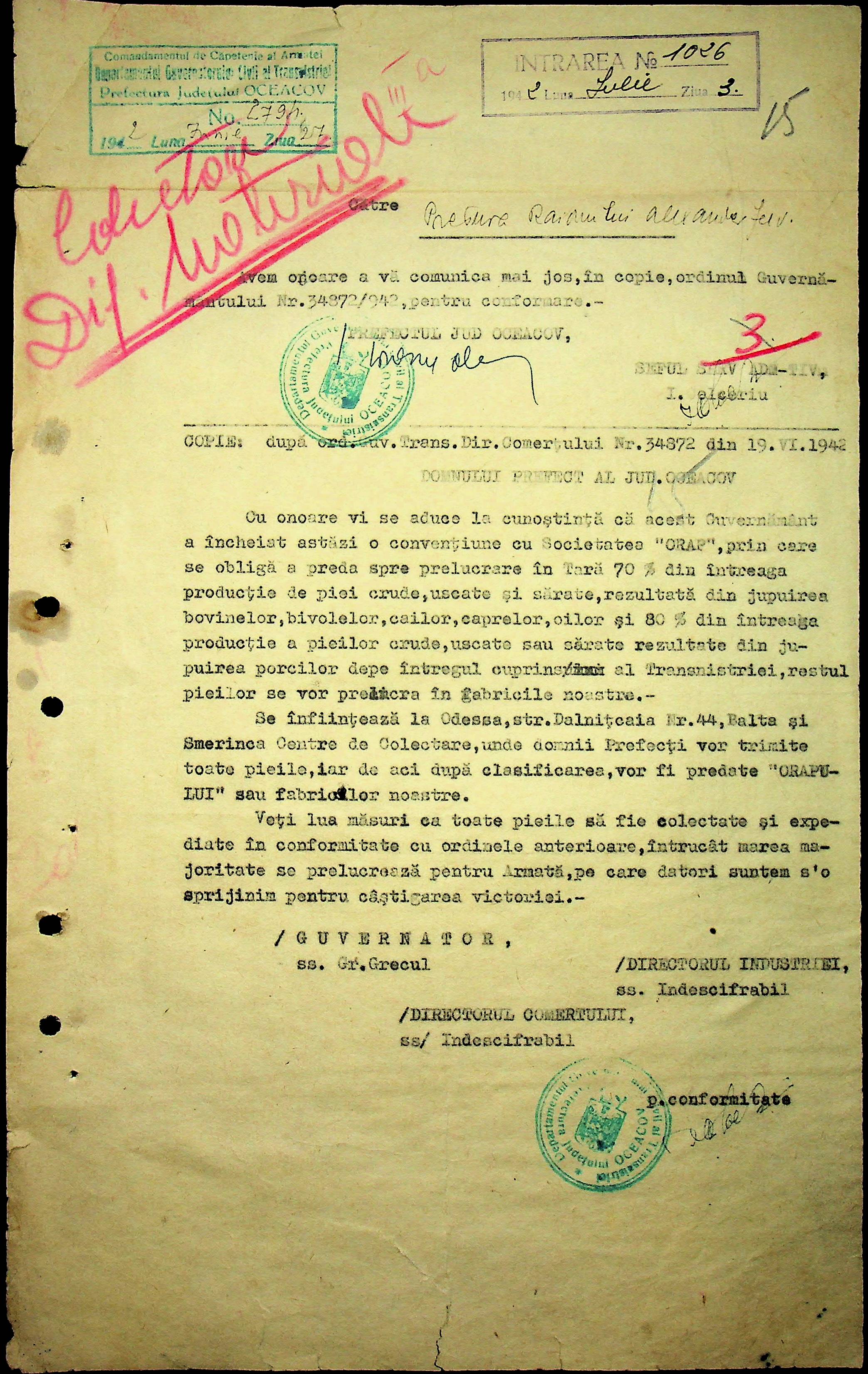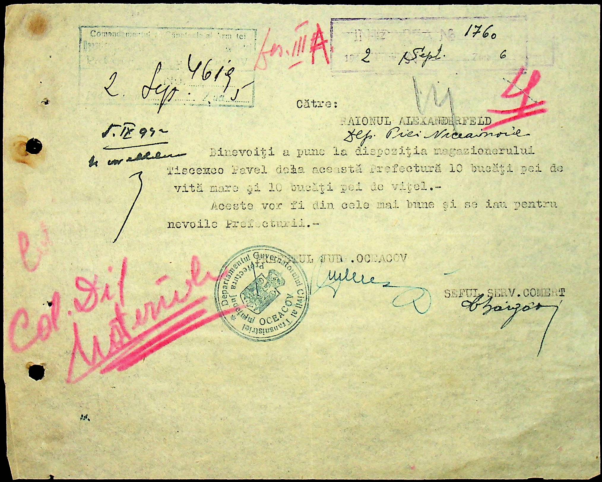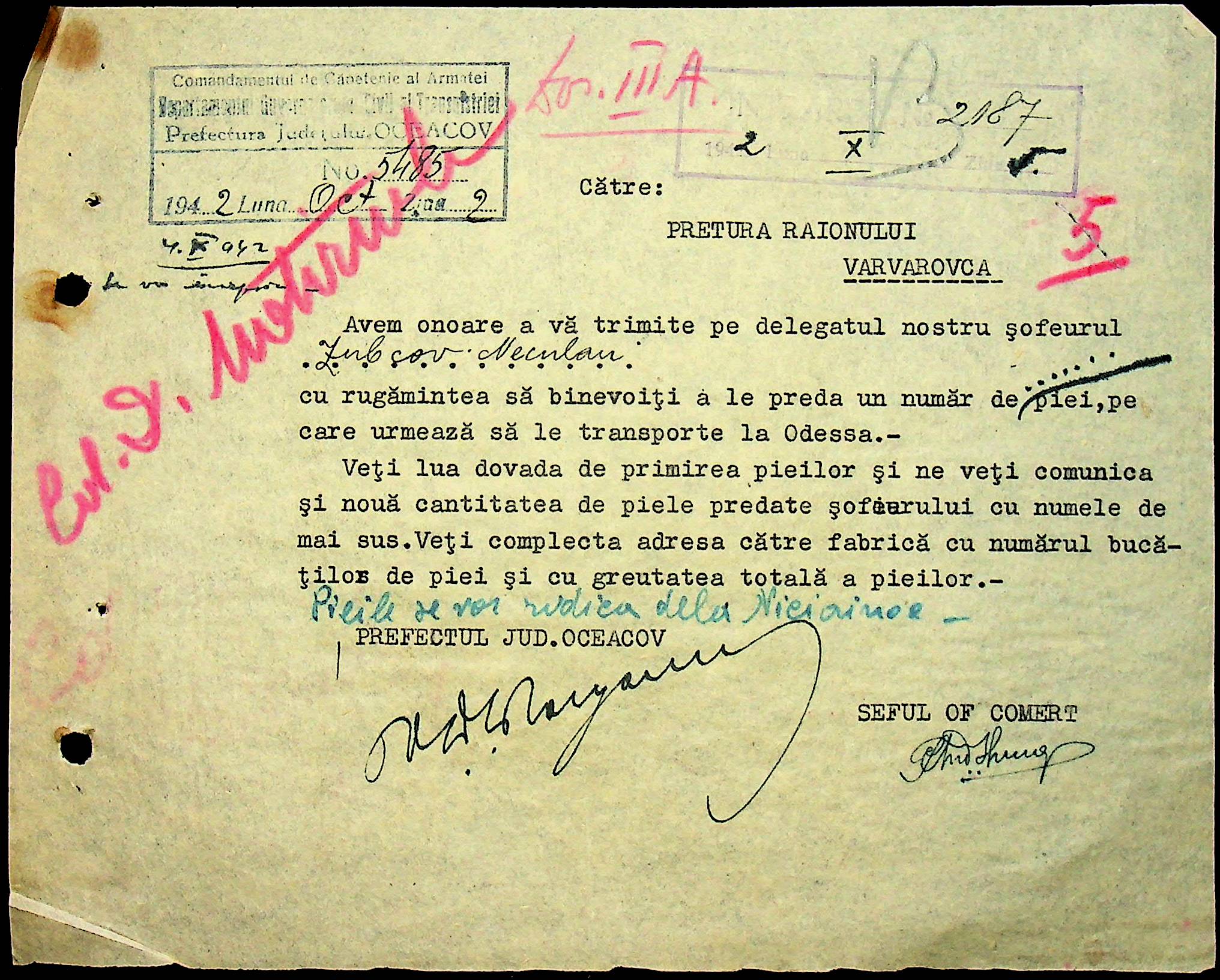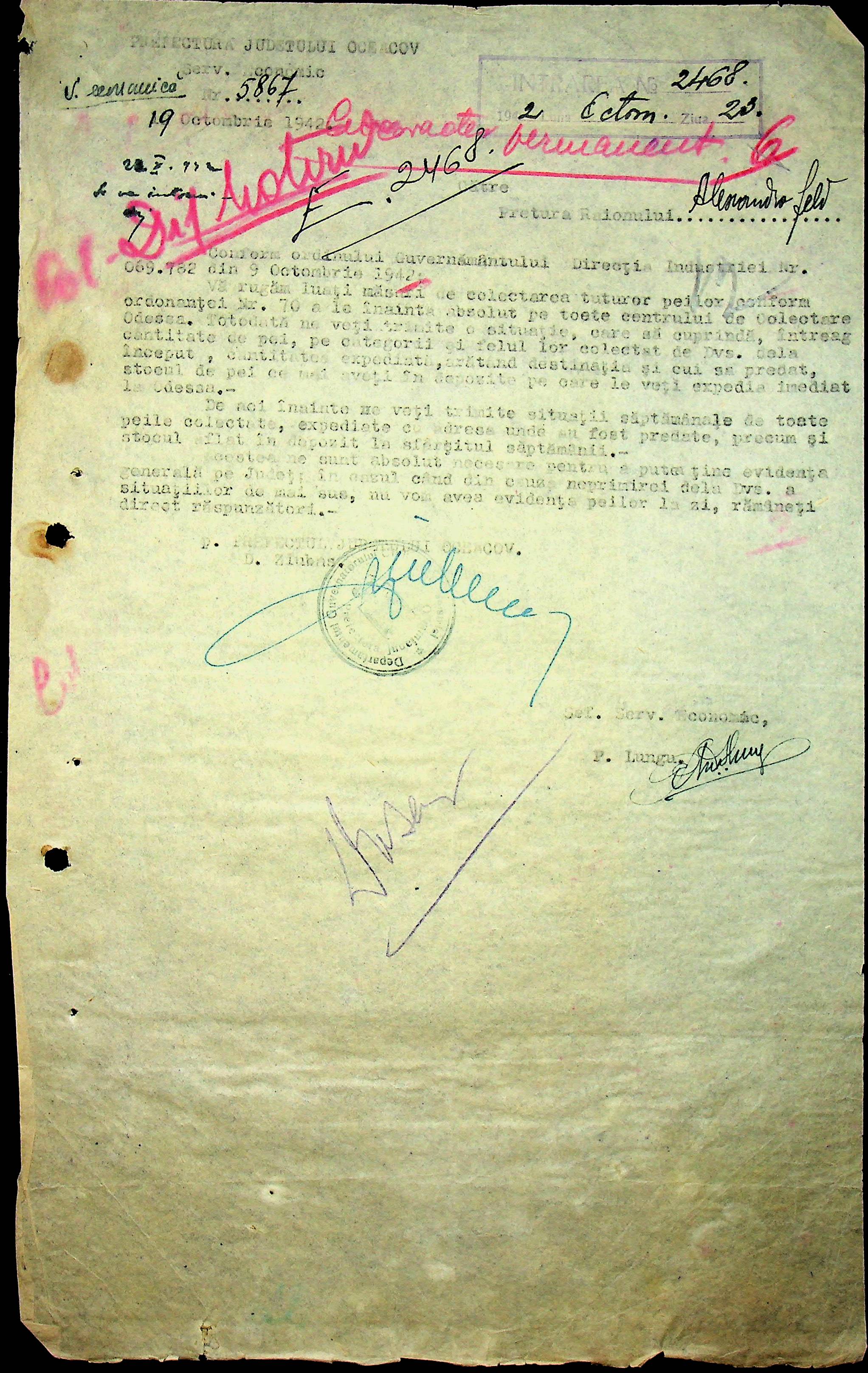 • • • • Справа № 14 “Наказ цивільного губернатора Трансністрії (копія) про бронювання тваринного жиру на бійнях. Листування з префектурою Очаківського повіту про відправку шкір тварин до м. Одеса”