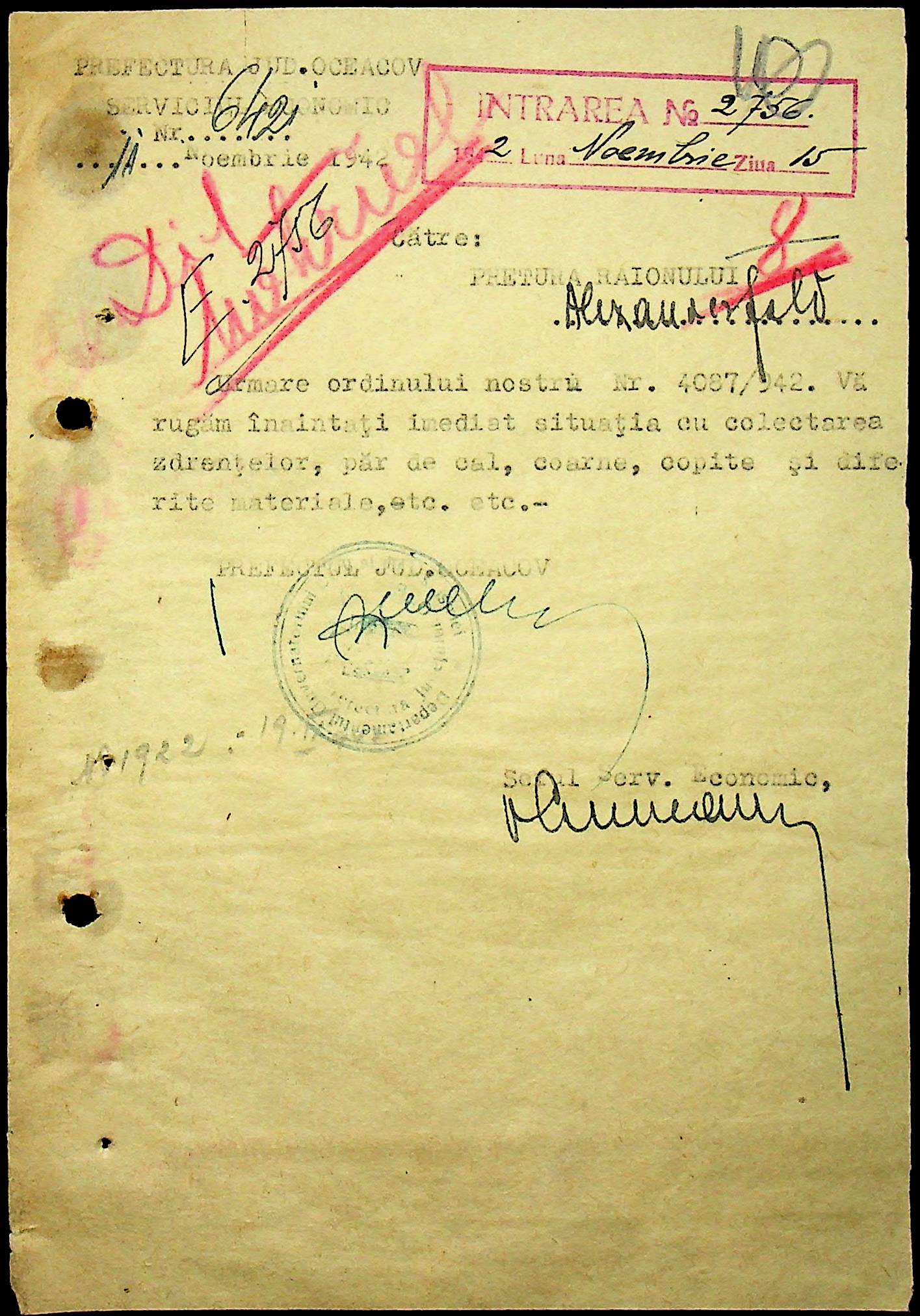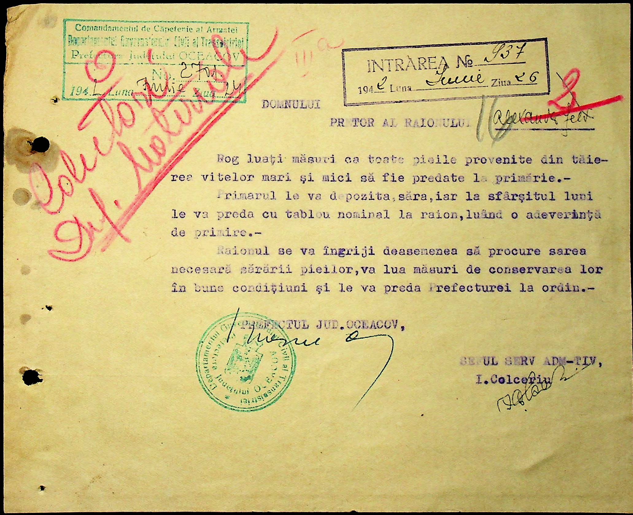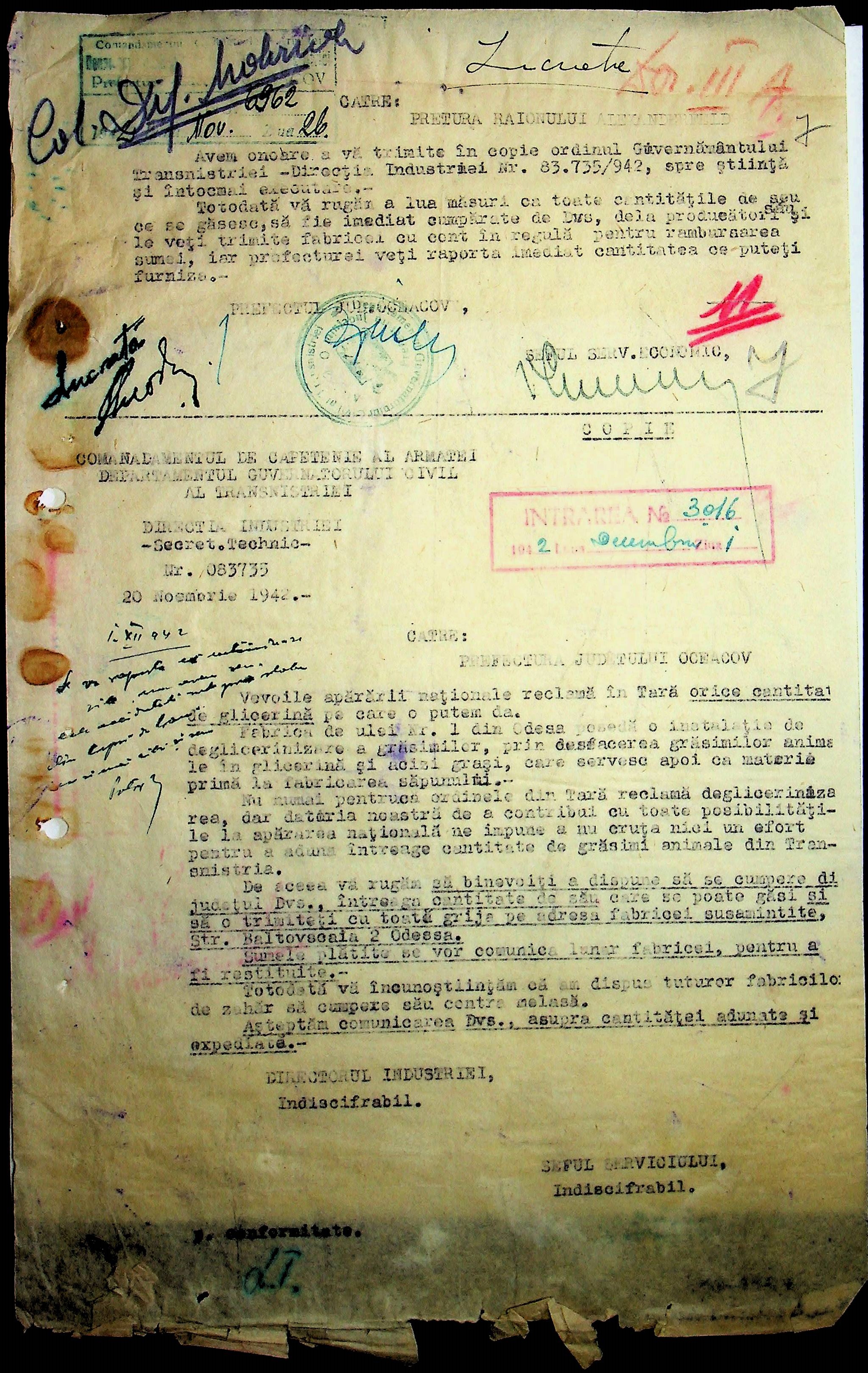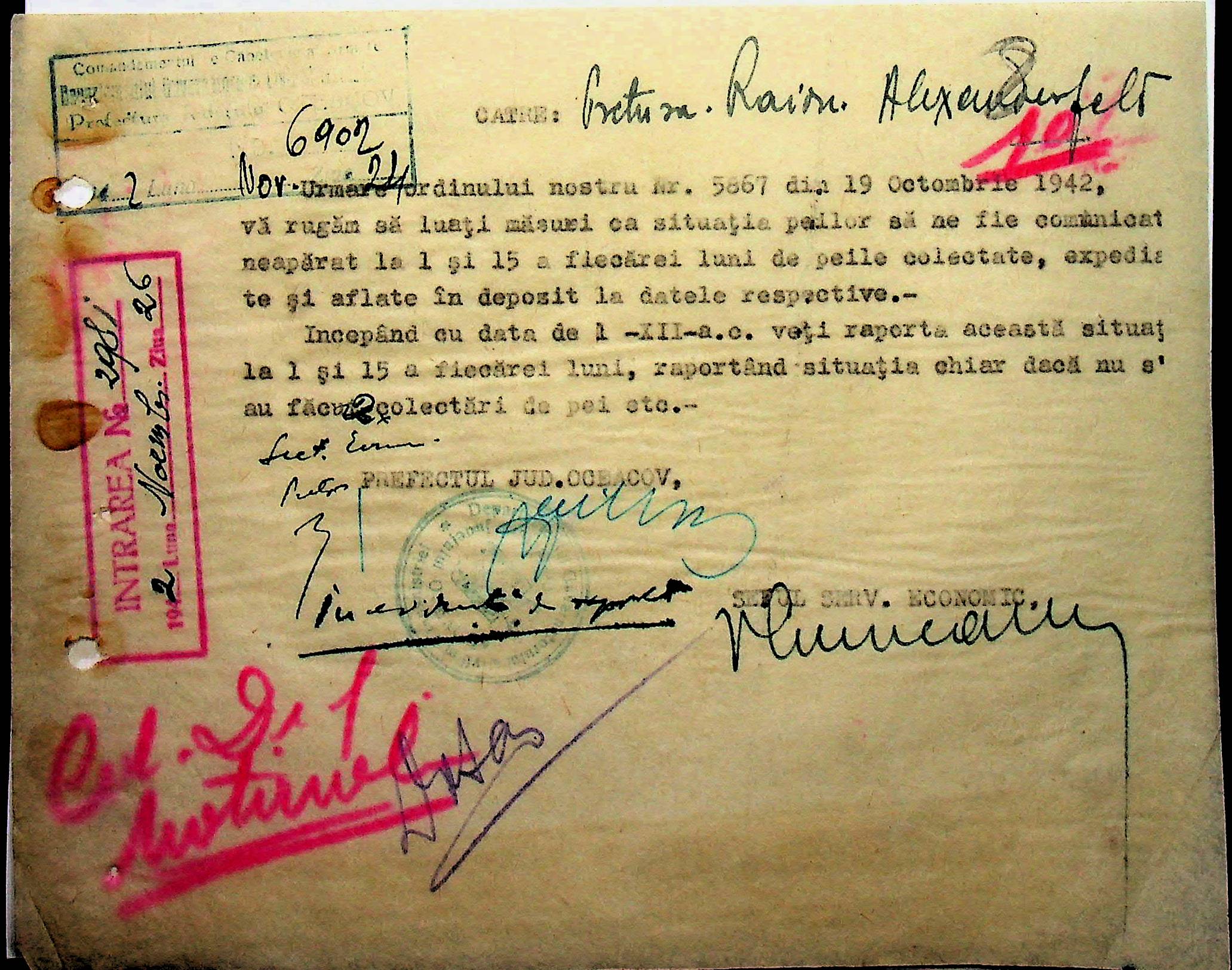 • • • • Справа № 14 “Наказ цивільного губернатора Трансністрії (копія) про бронювання тваринного жиру на бійнях. Листування з префектурою Очаківського повіту про відправку шкір тварин до м. Одеса”