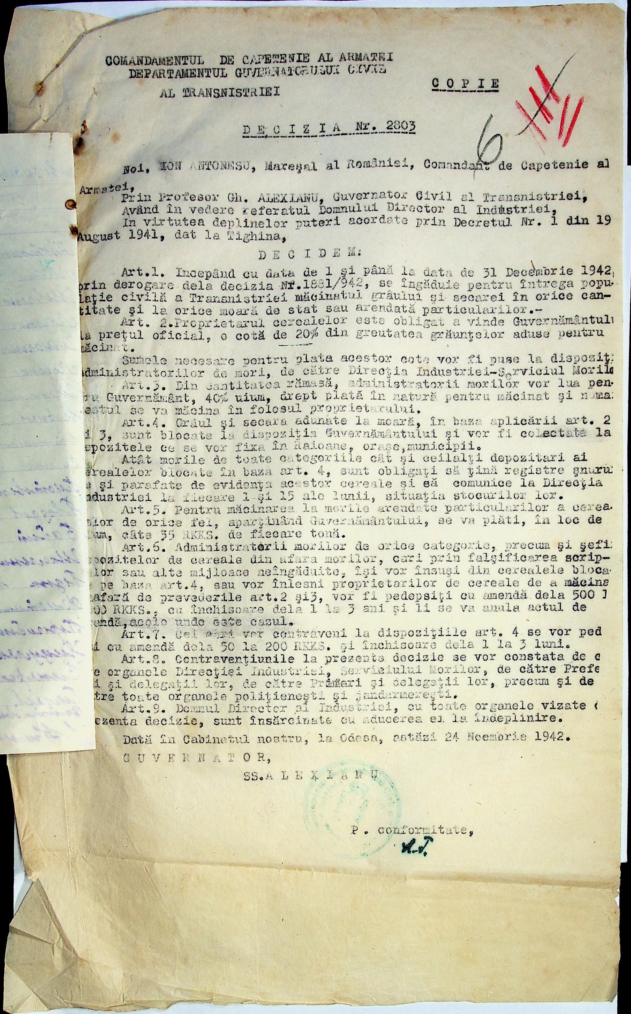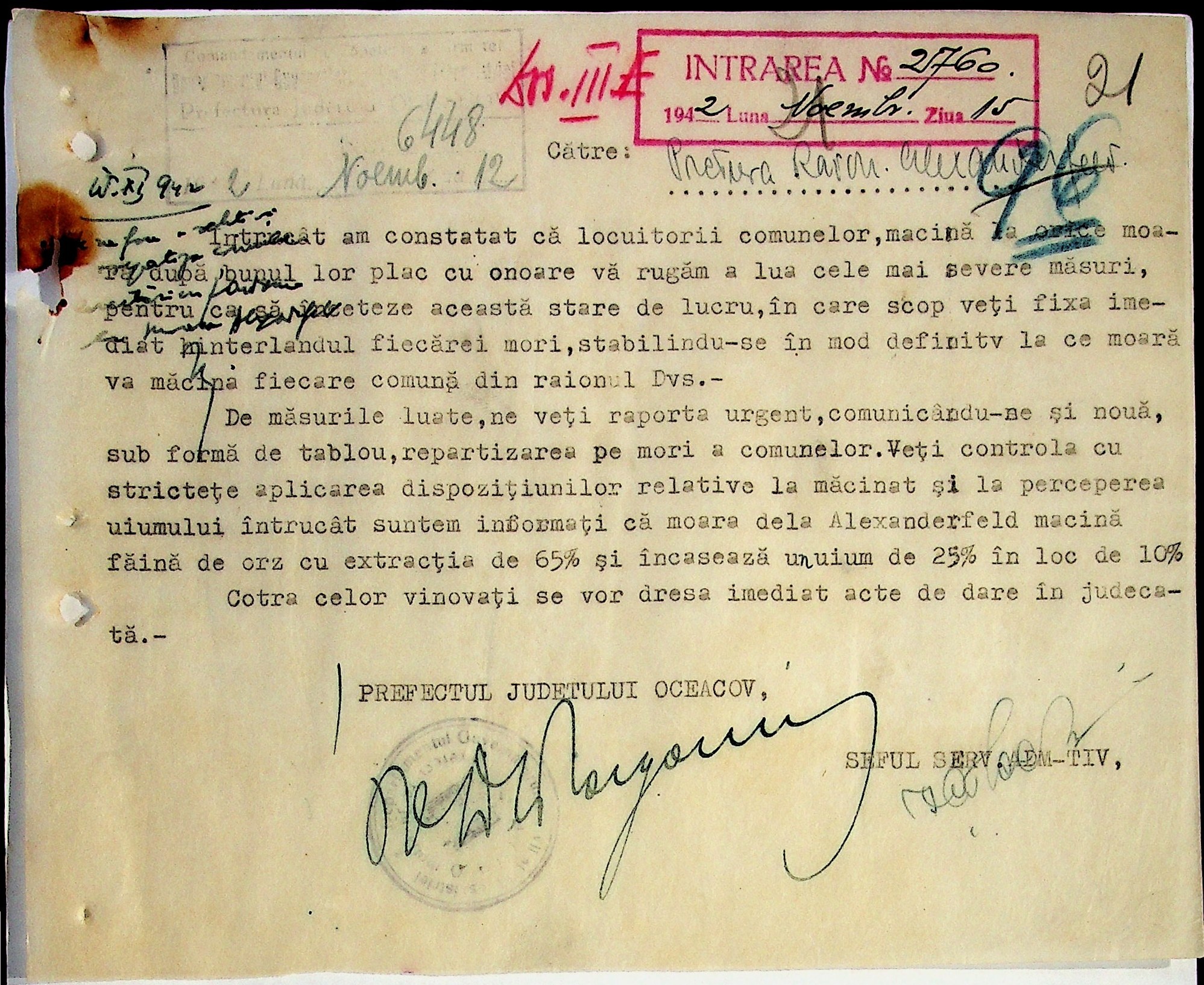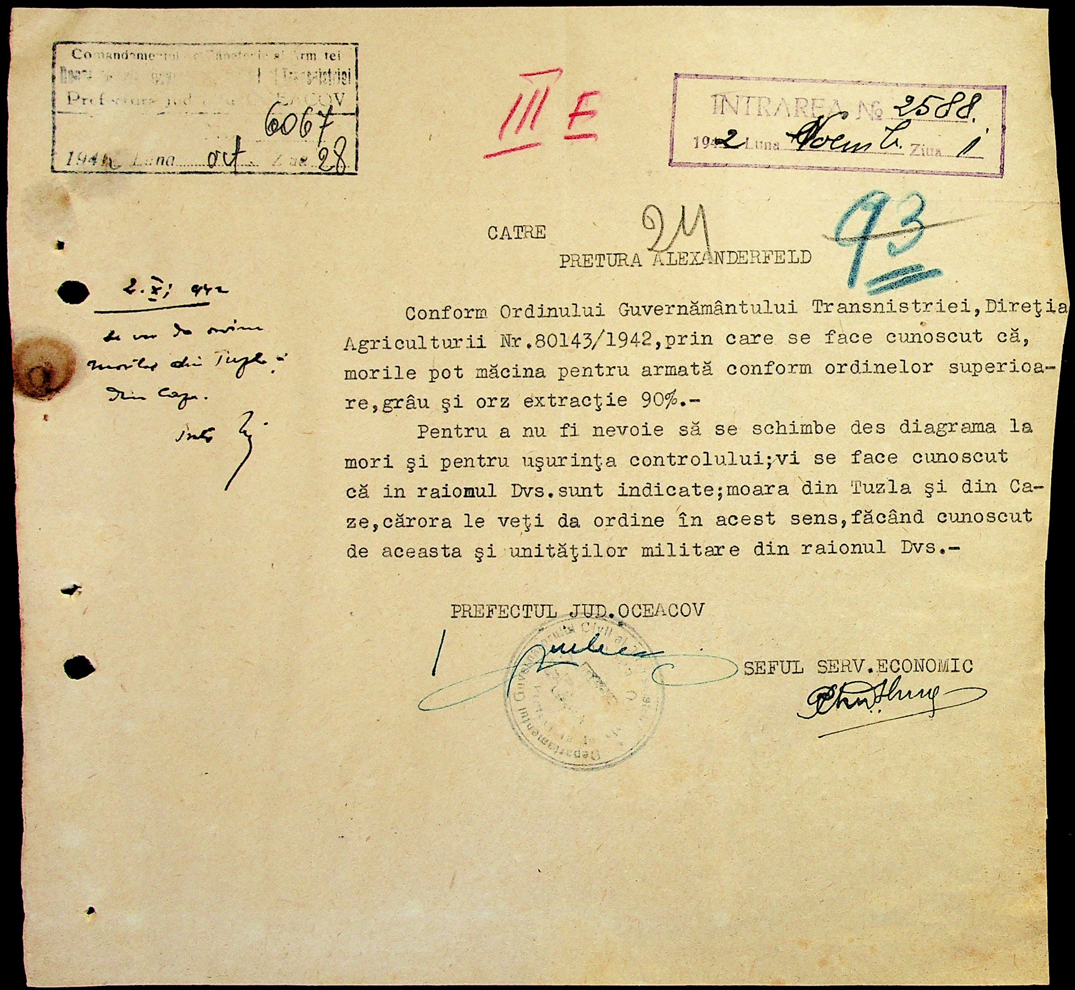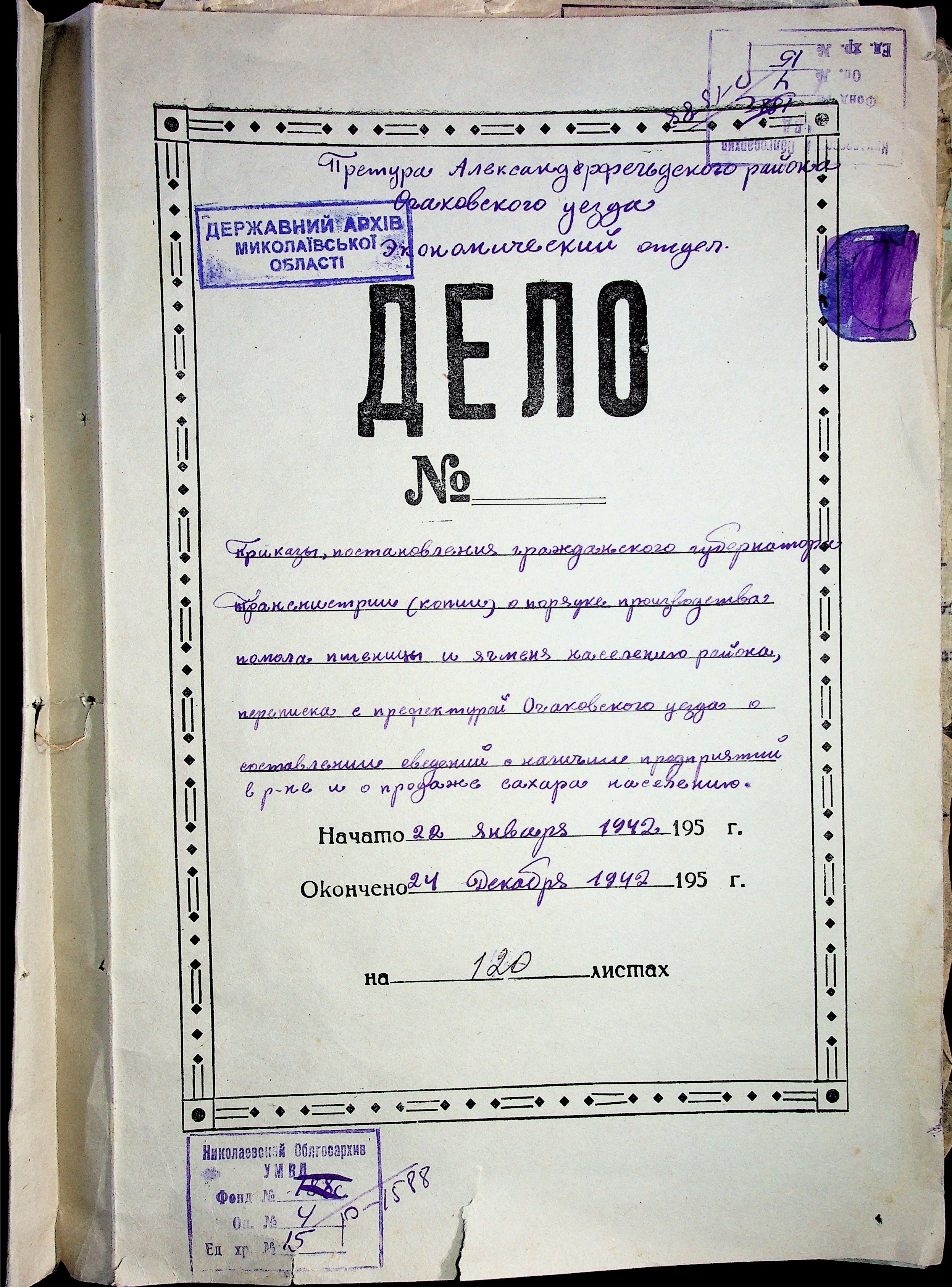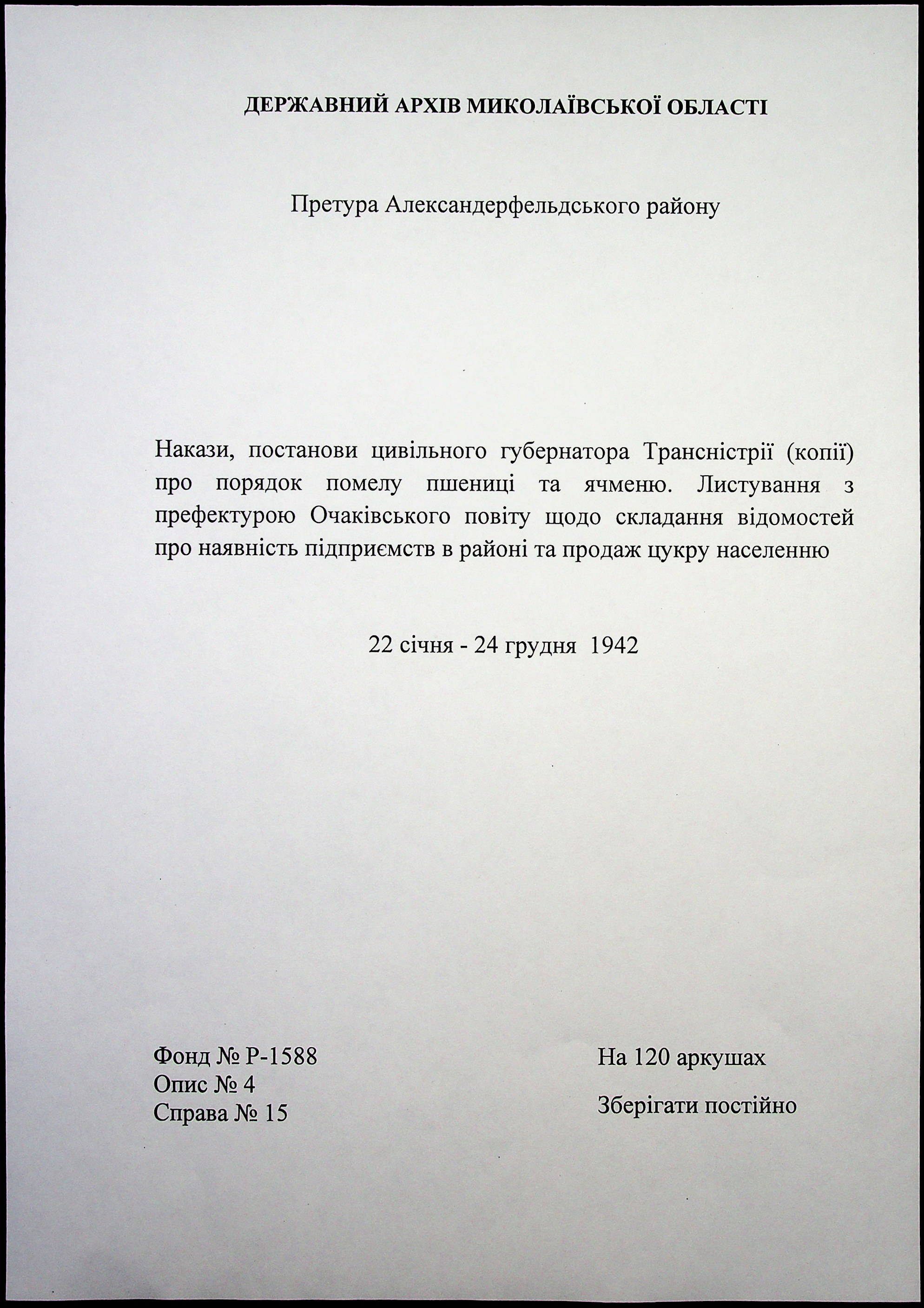 • • • • Справа № 15 “Накази, постанови цивільного губернатора Трансністрії (копії) про порядок помелу пшениці та ячменю. Листування з префектурою Очаківського повіту щодо складання відомостей про наявність підприємств в районі та продаж цукру населенню”