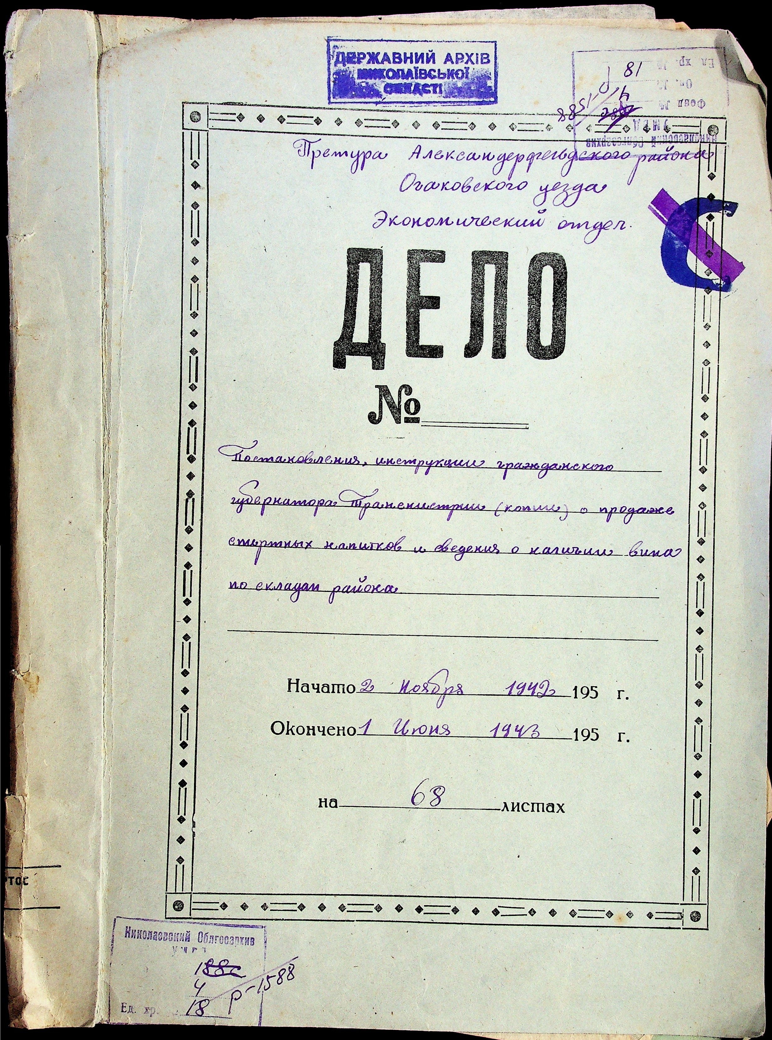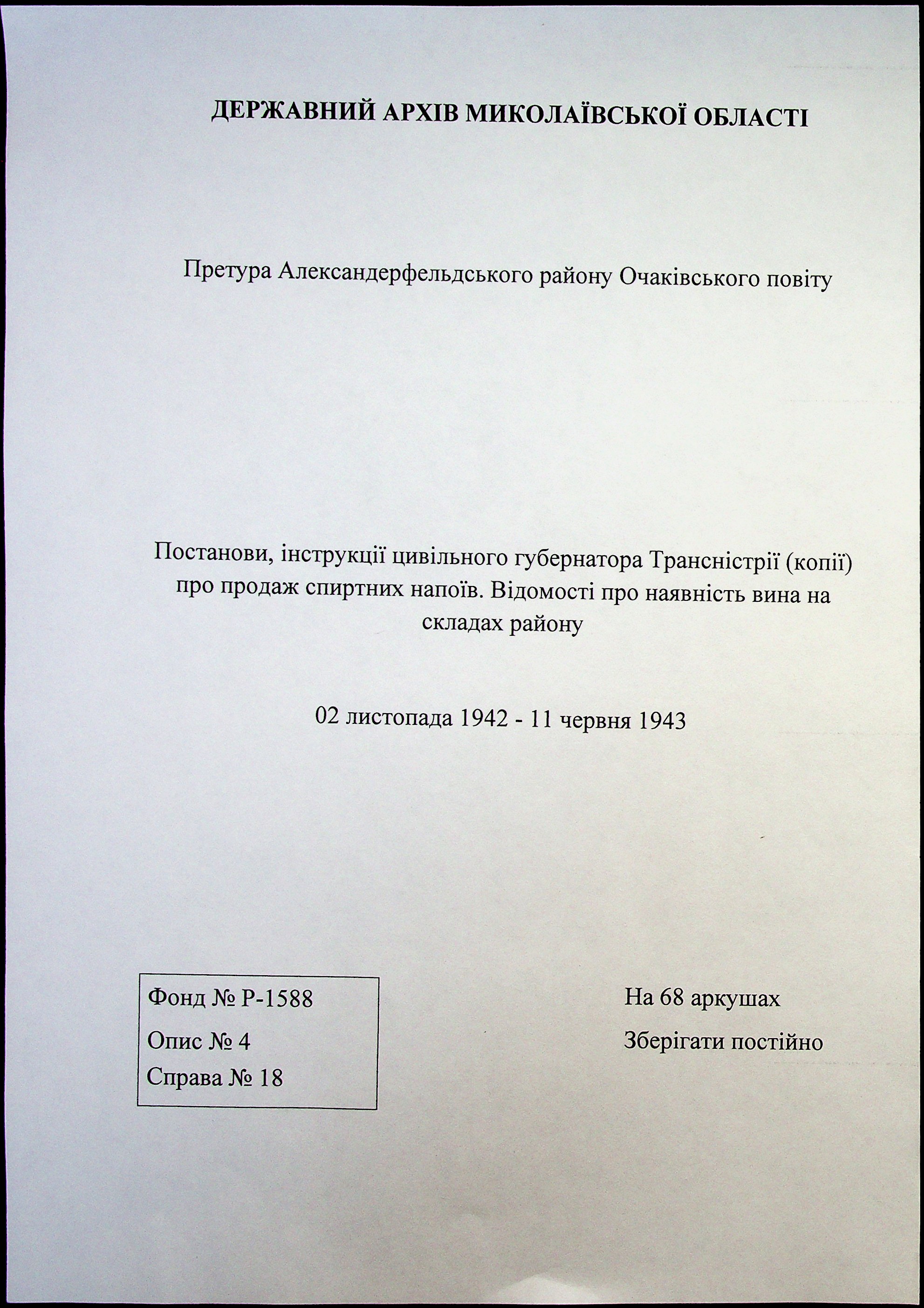 • • • • Справа № 18 “Постанови, інструкції цивільного губернатора Трансністрії (копії) про продаж спиртних напоїв. Відомості про наявність вина на складах району”