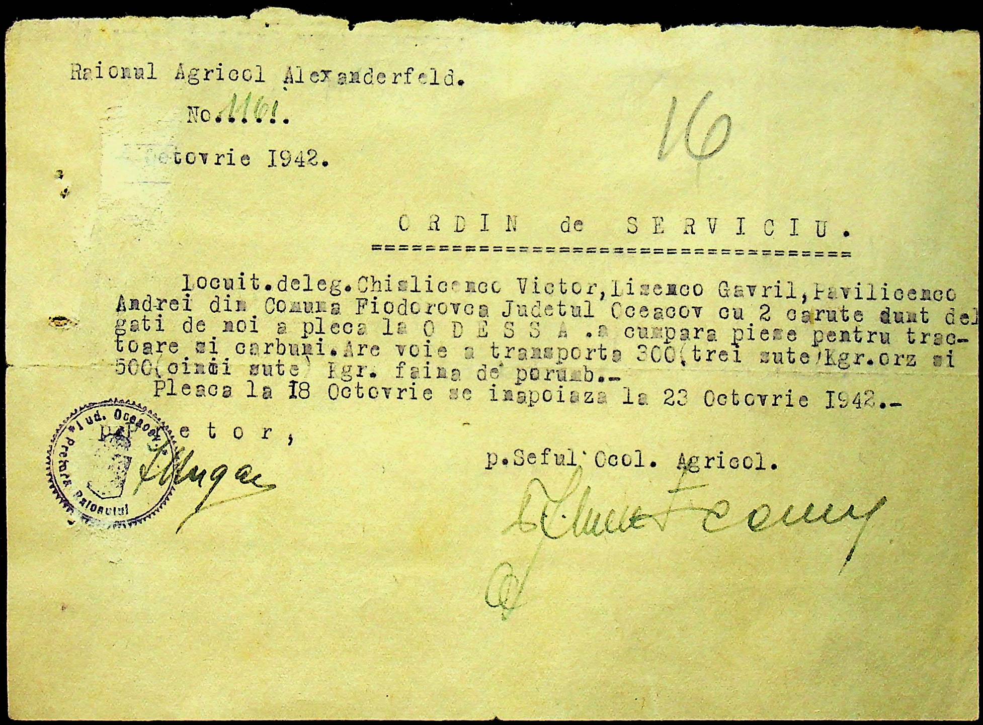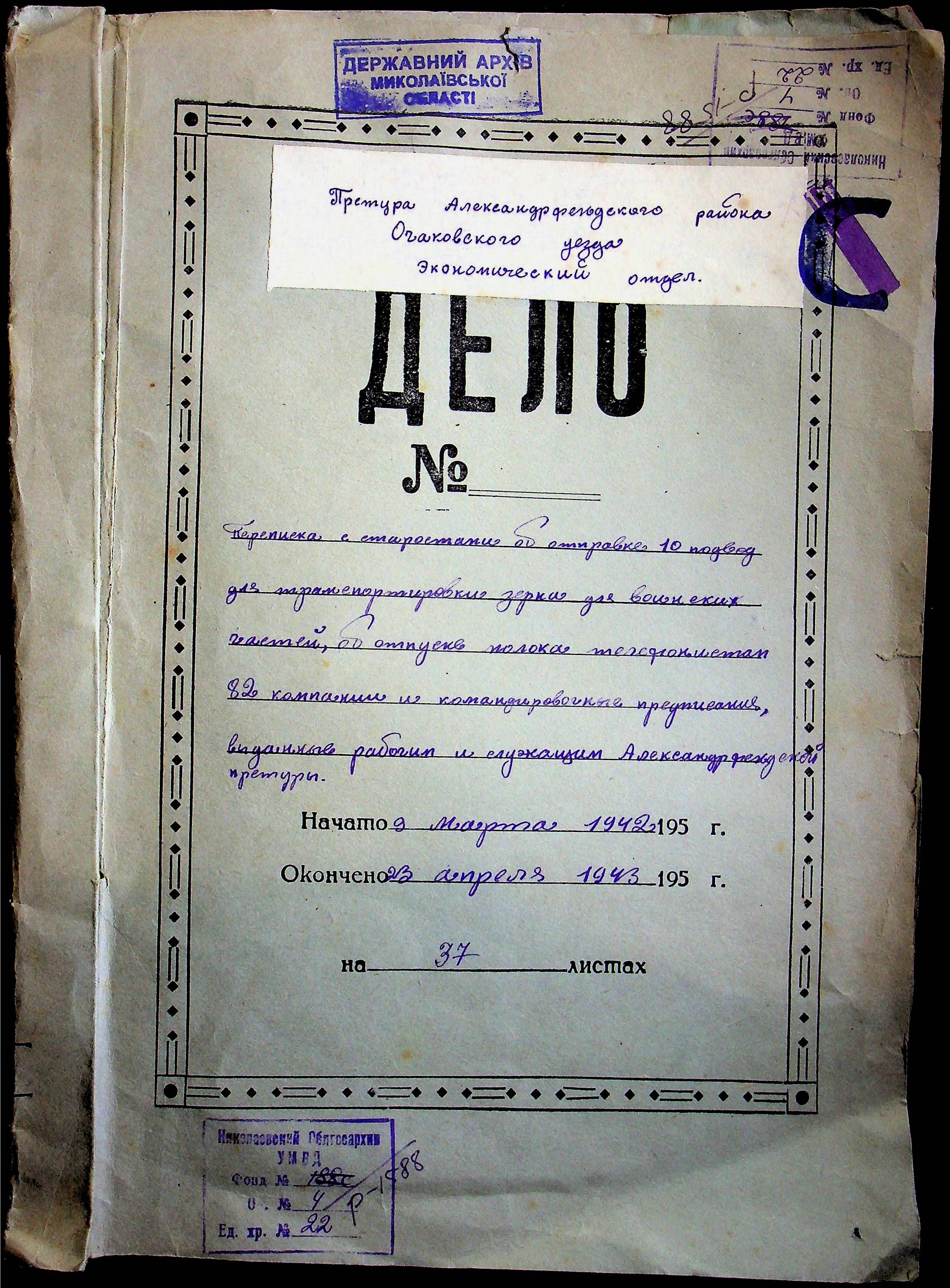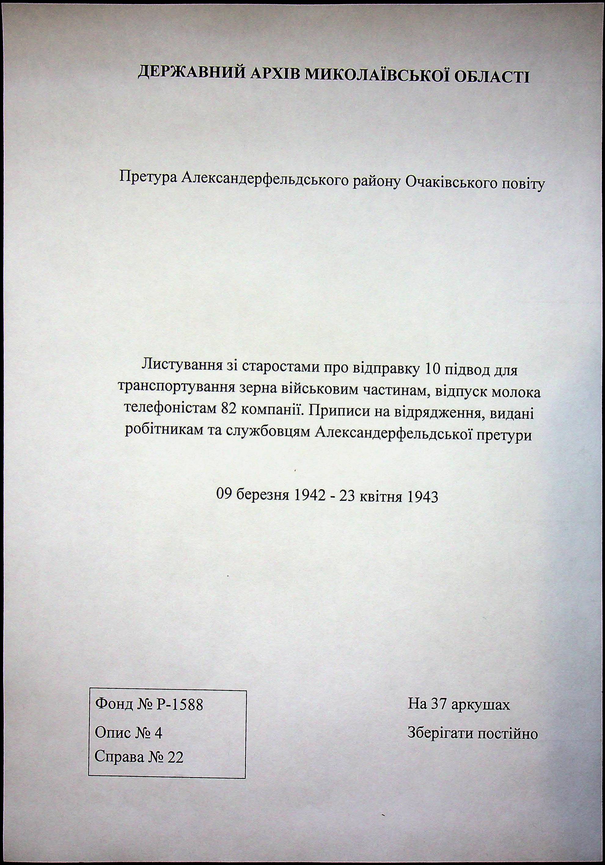 • • • • Справа № 22 “Листування зі старостами про відправку 10 підвод для транспортування зерна військовим частинам, відпуск молока телефоністам 82 компанії. Приписи на відрядження, видані робітникам та службовцям Александерфельдської претури”
