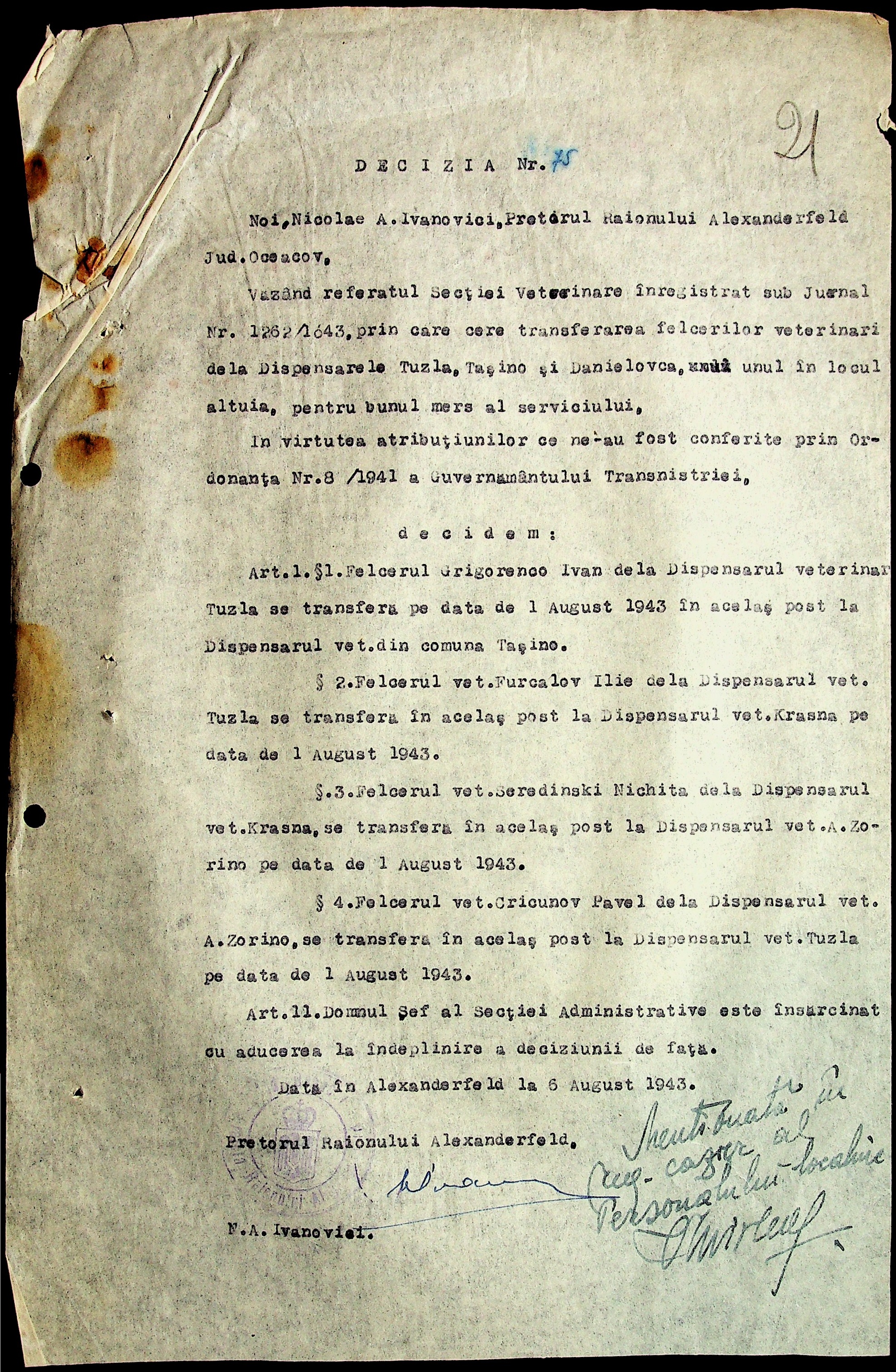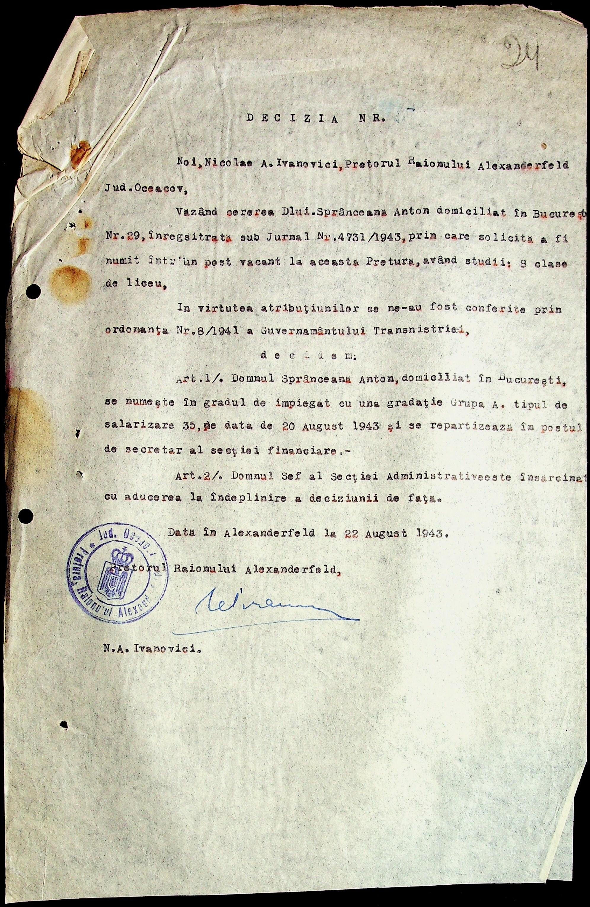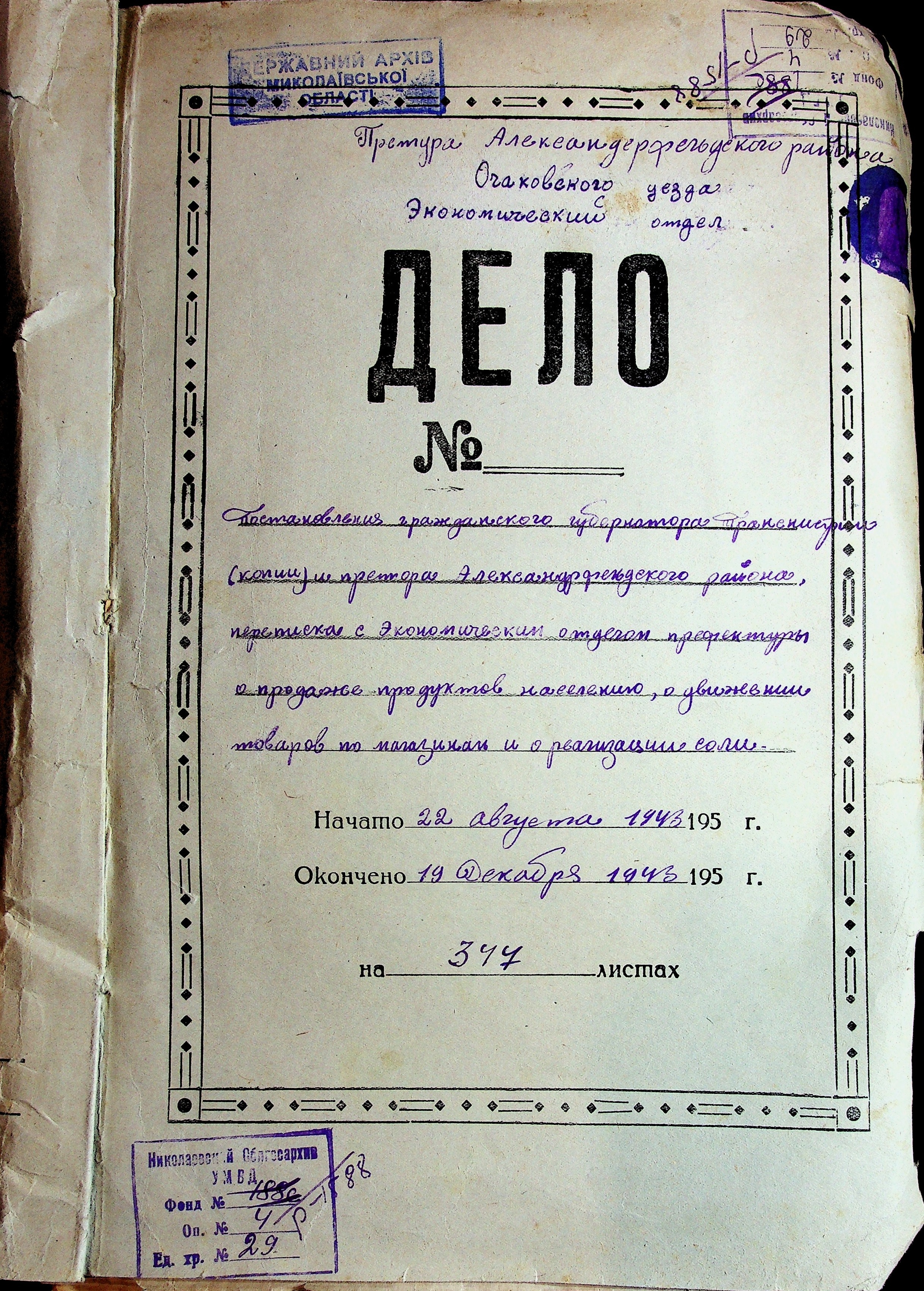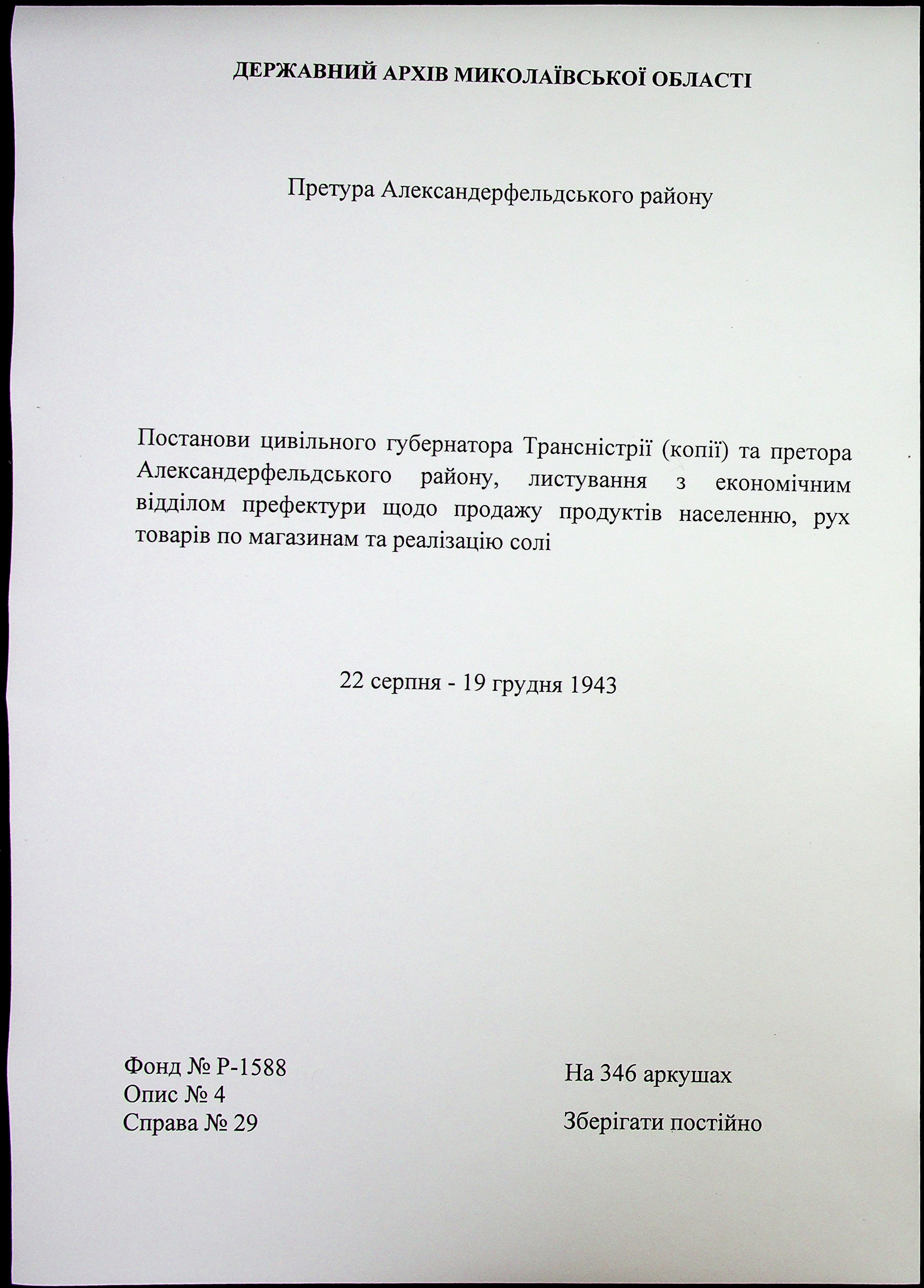 • • • • Справа № 29 “Постанови цивільного губернатора Трансністрії (копії) та претора Александерфельдського району, листування з економічним відділом префектури щодо продажу продуктів населенню, рух товарів по магазинам та реалізацію солі”