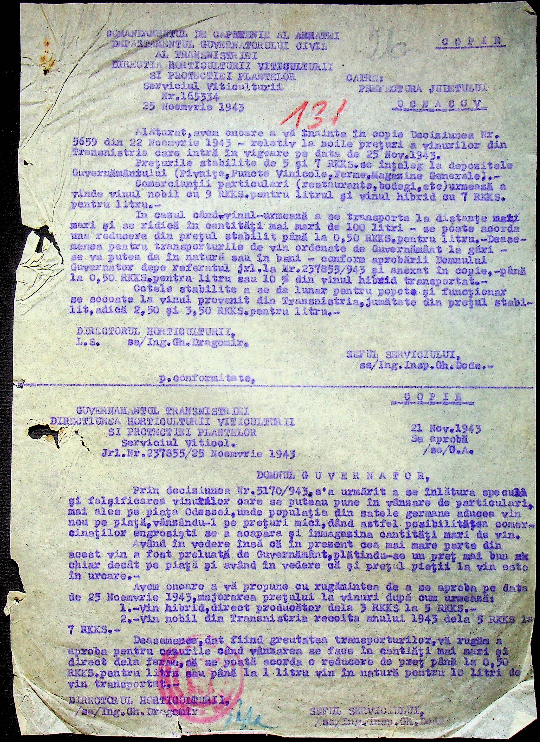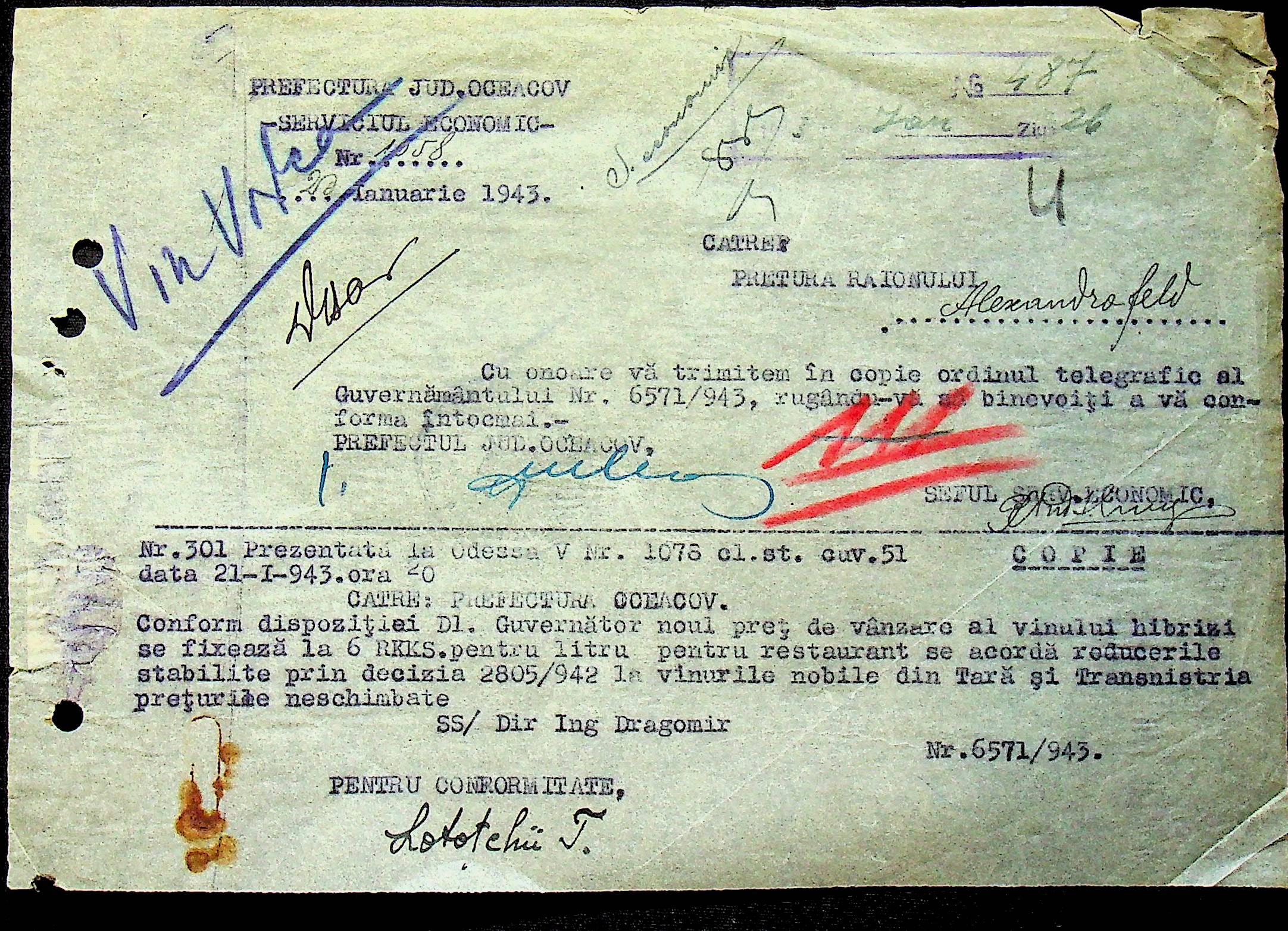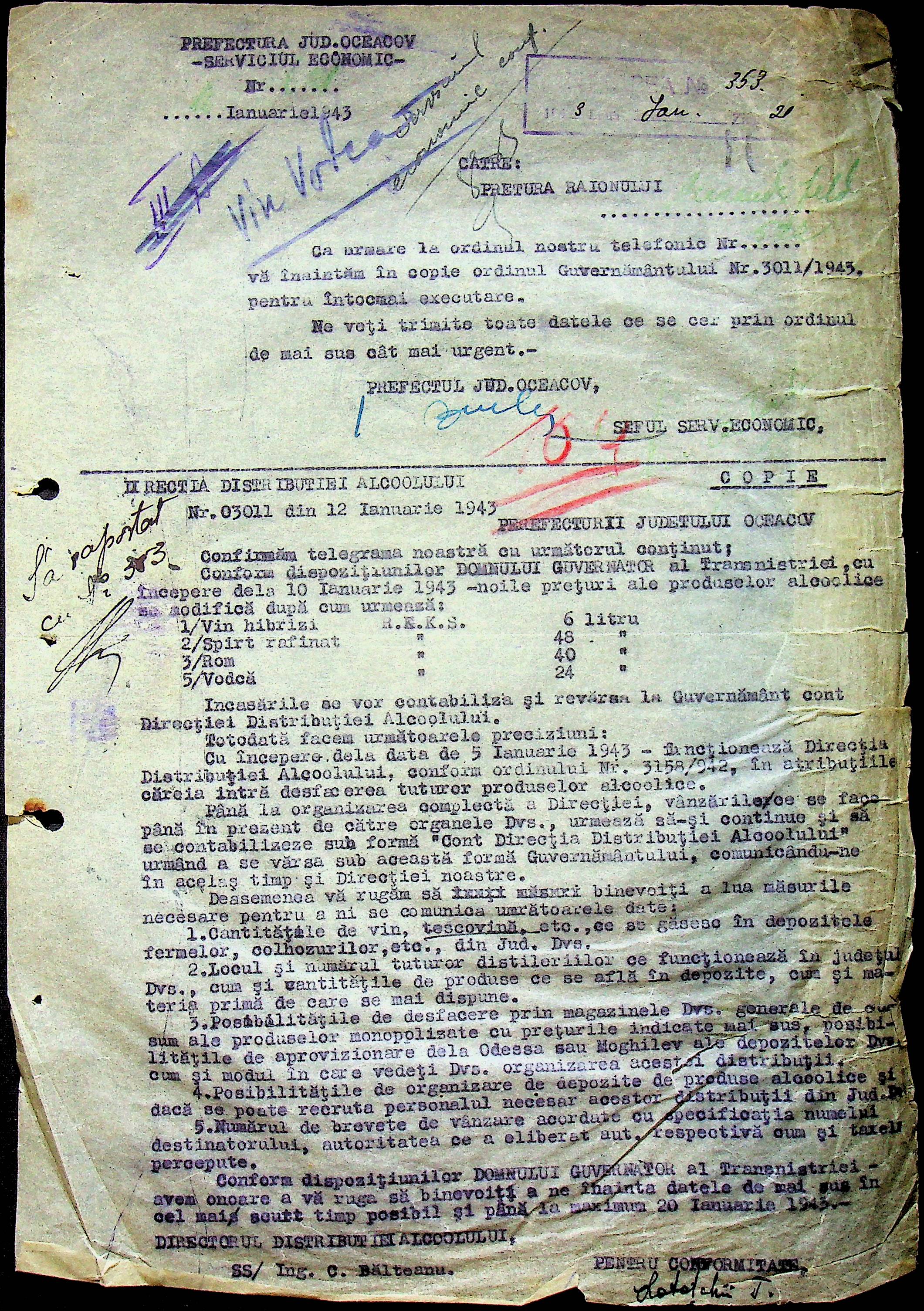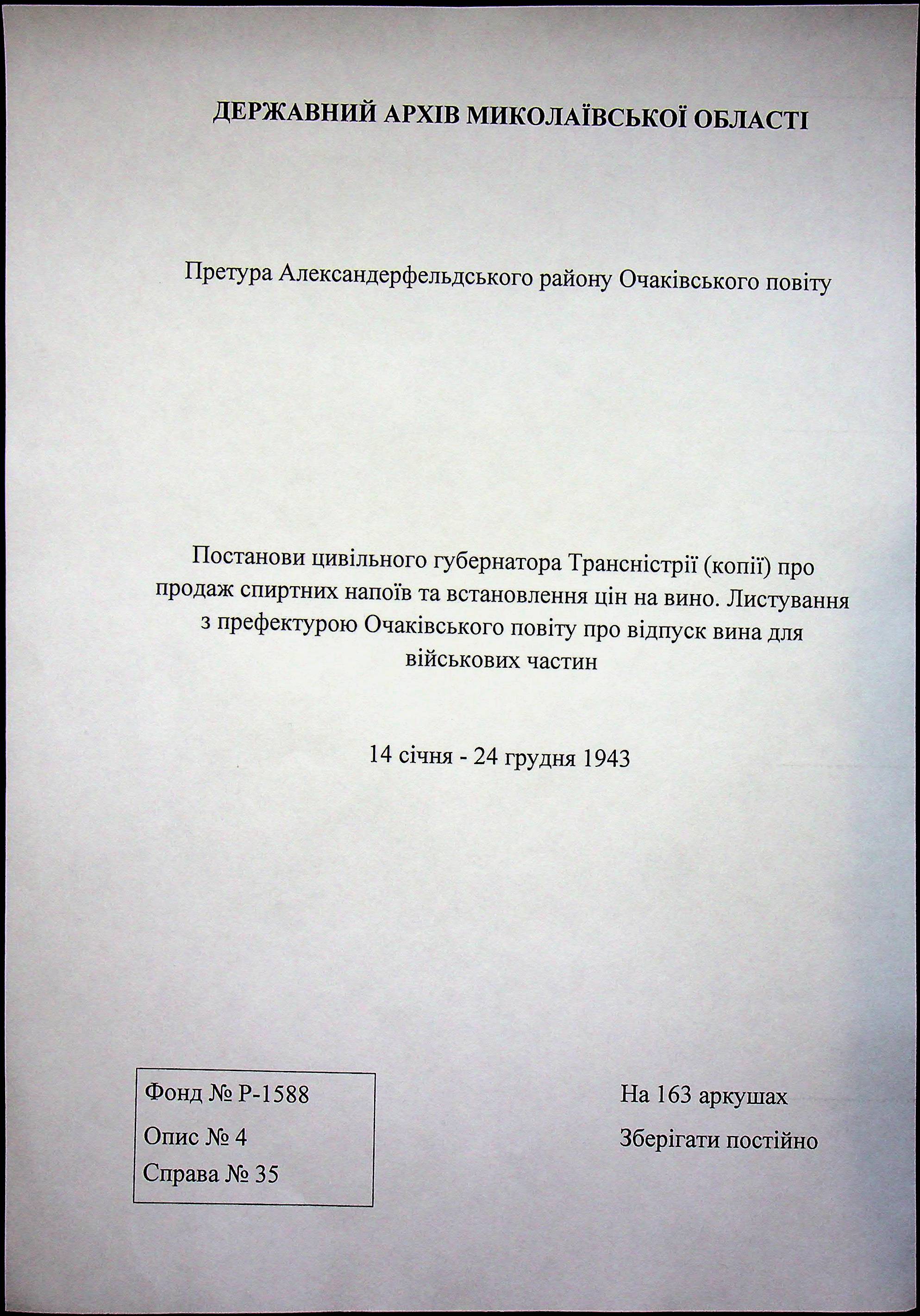 • • • • Справа № 35 “Постанови цивільного губернатора Трансністрії (копії) про продаж спиртних напоїв та встановлення цін на вино. Листування з префектурою Очаківського повіту про відпуск вина для військових частин”