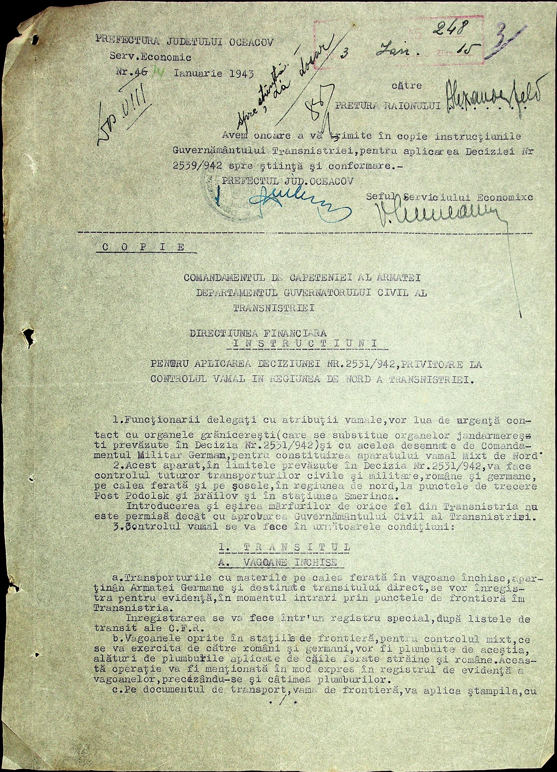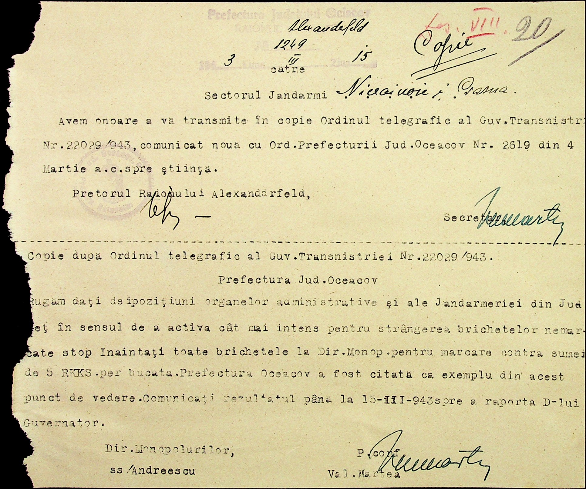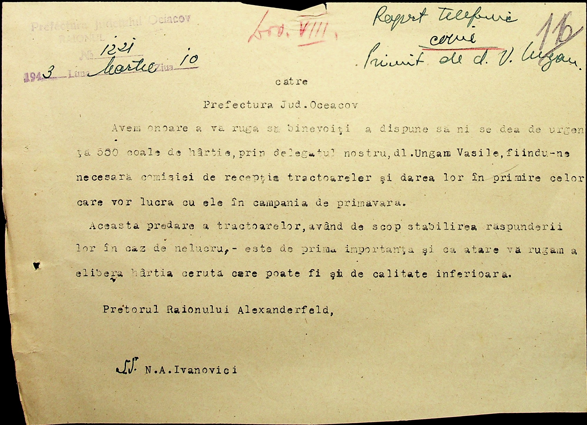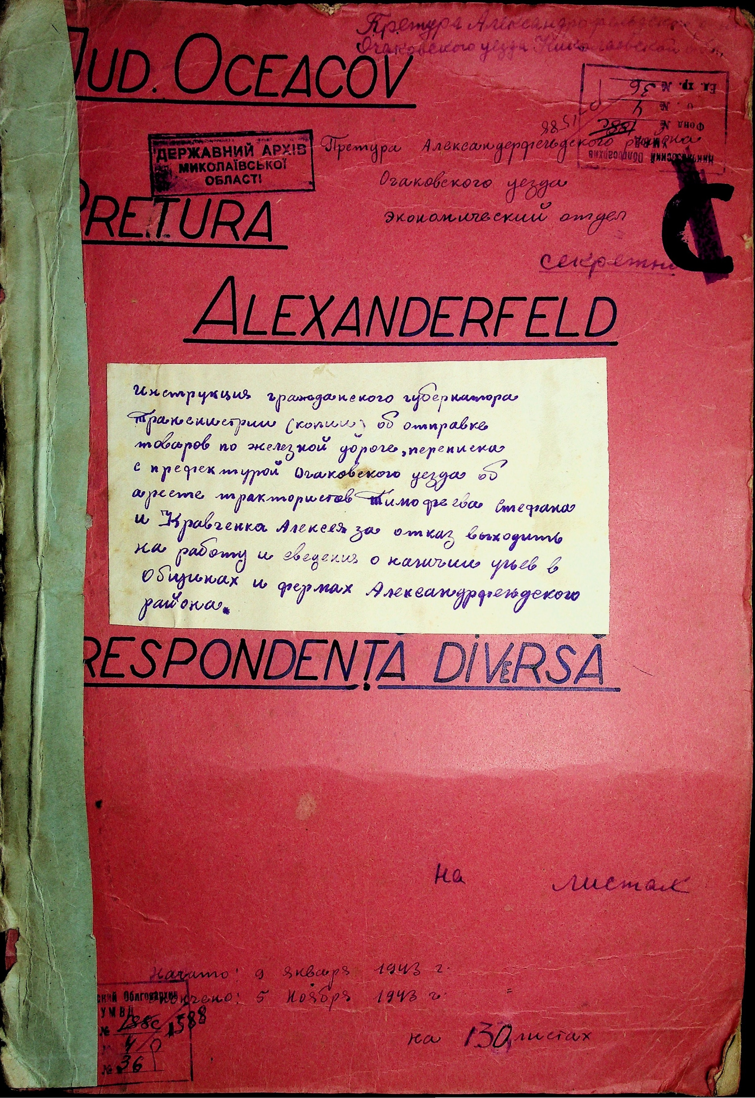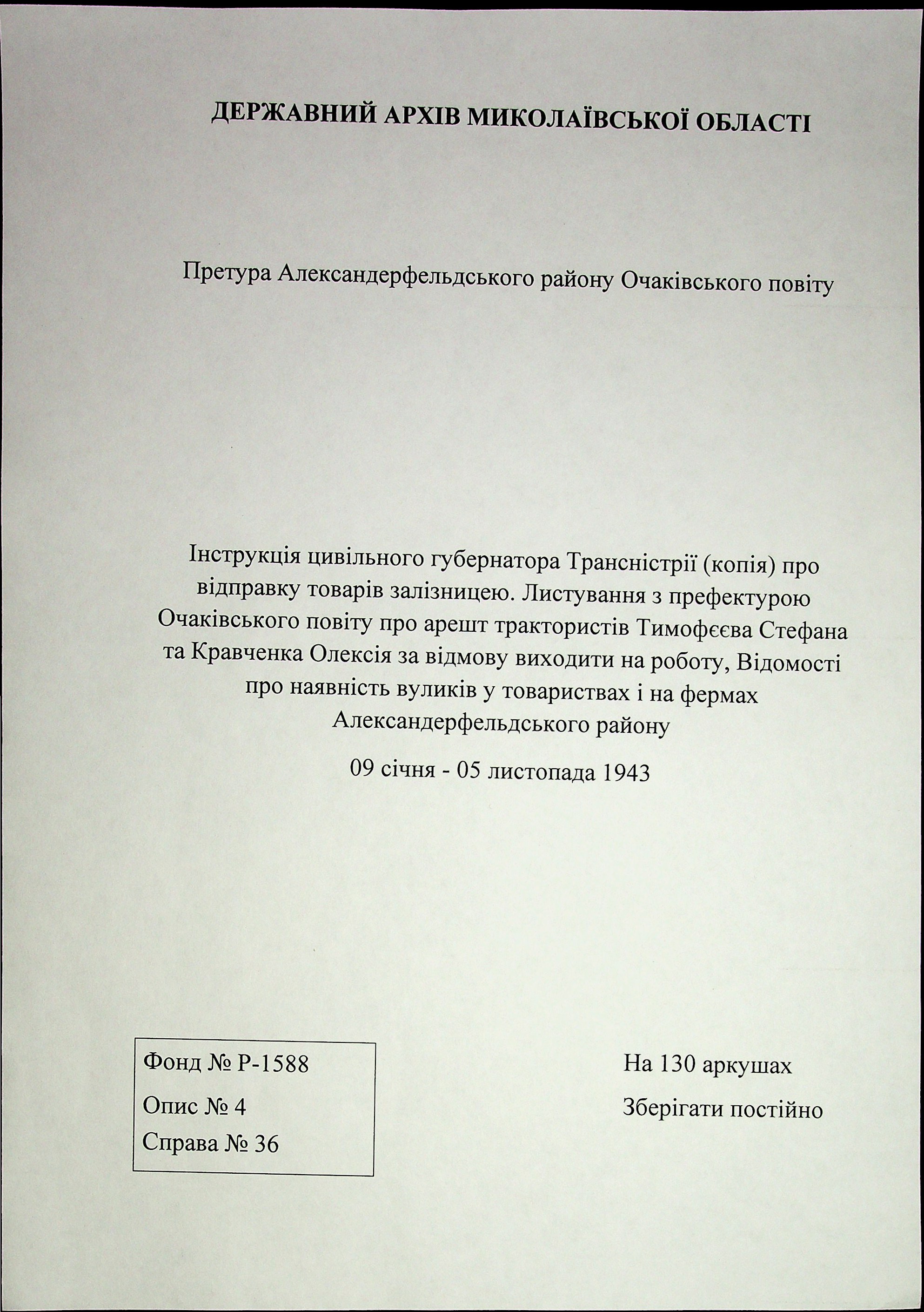 • • • • Справа № 36 “Інструкція цивільного губернатора Трансністрії (копія) про відправку товарів залізницею. Листування з префектурою Очаківського повіту про арешт трактористів Тимофєєва Стефана та Кравченка Олексія за відмову виходити на роботу, Відомості про наявність вуликів у товариствах і на фермах Александерфельдського району”