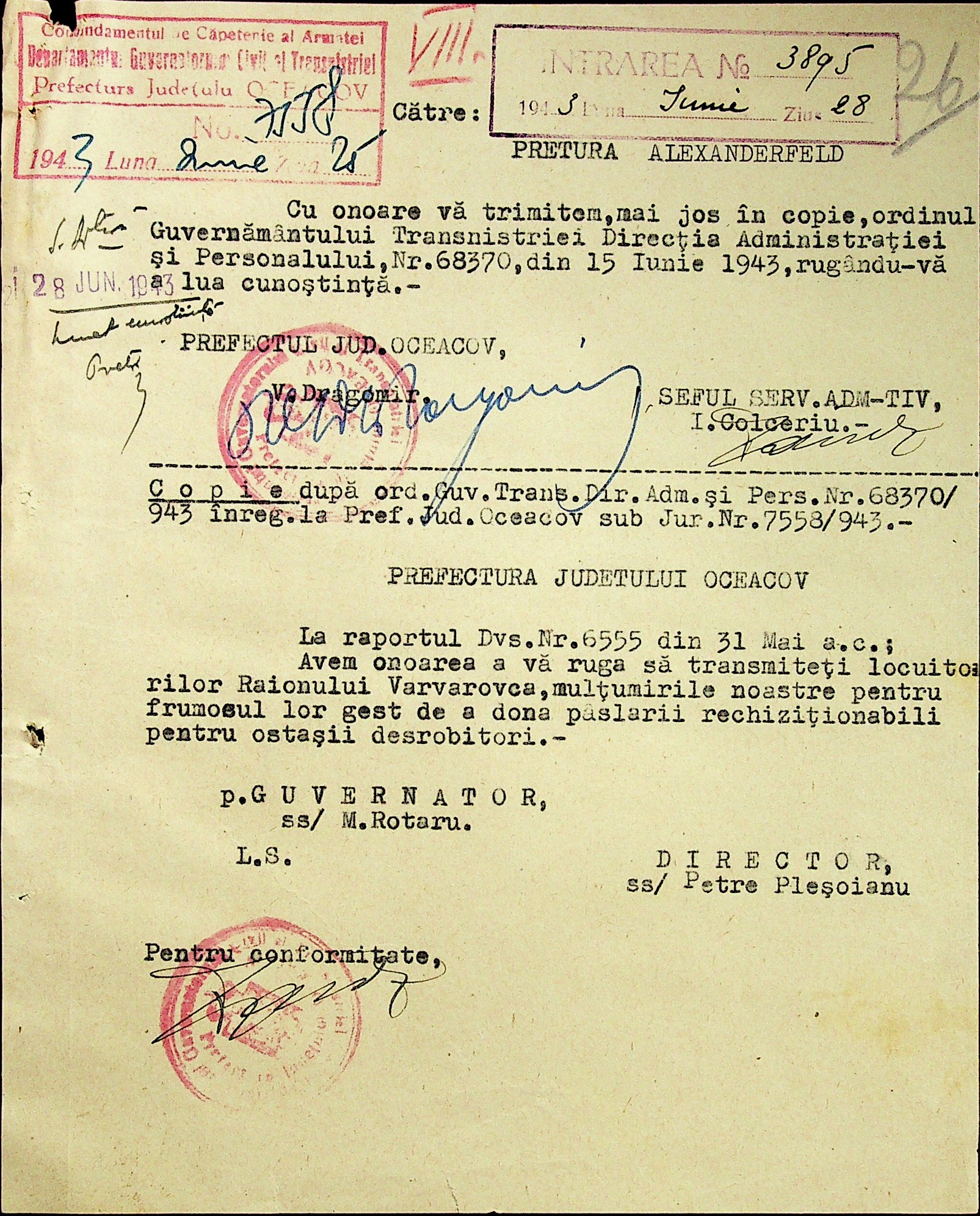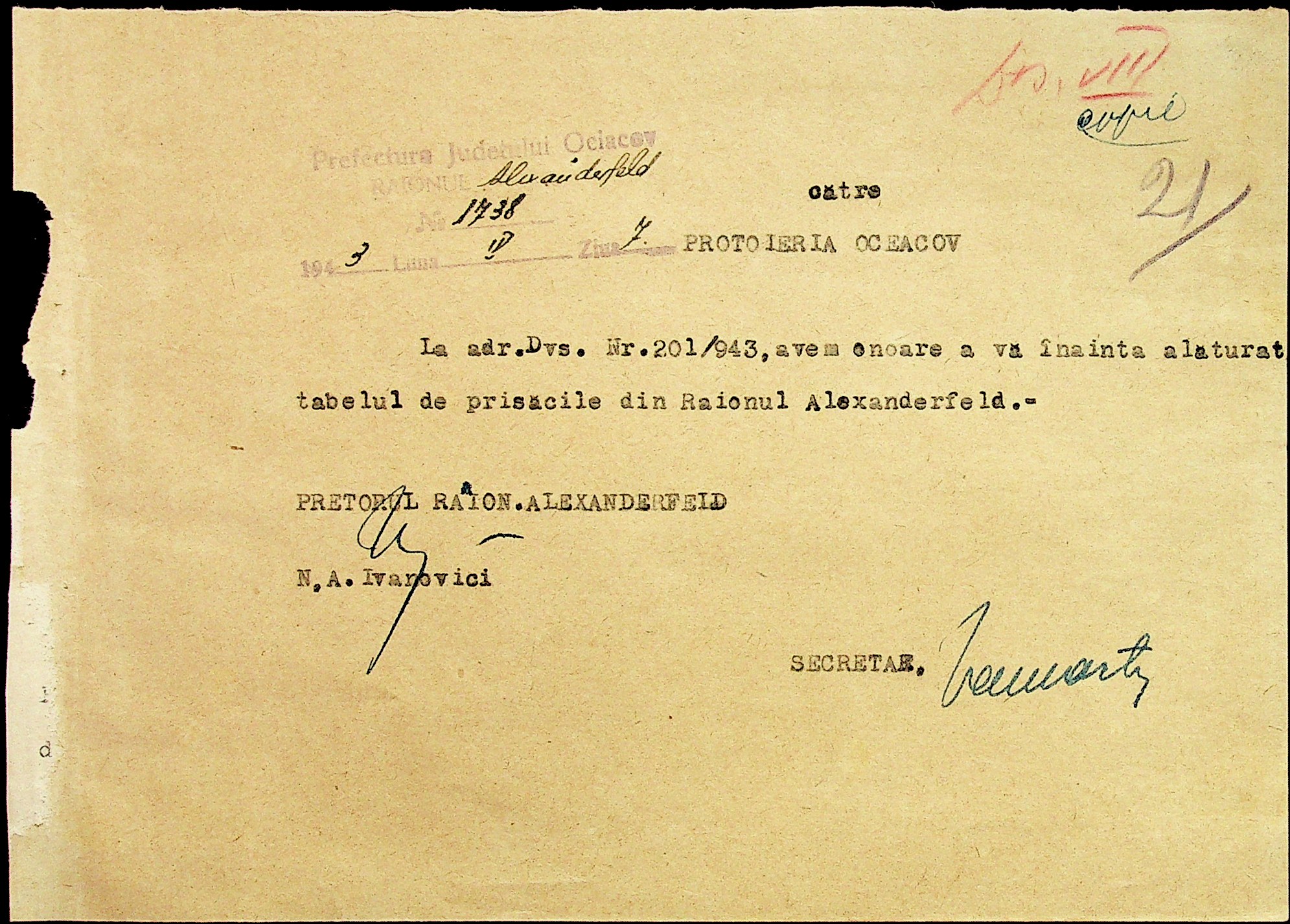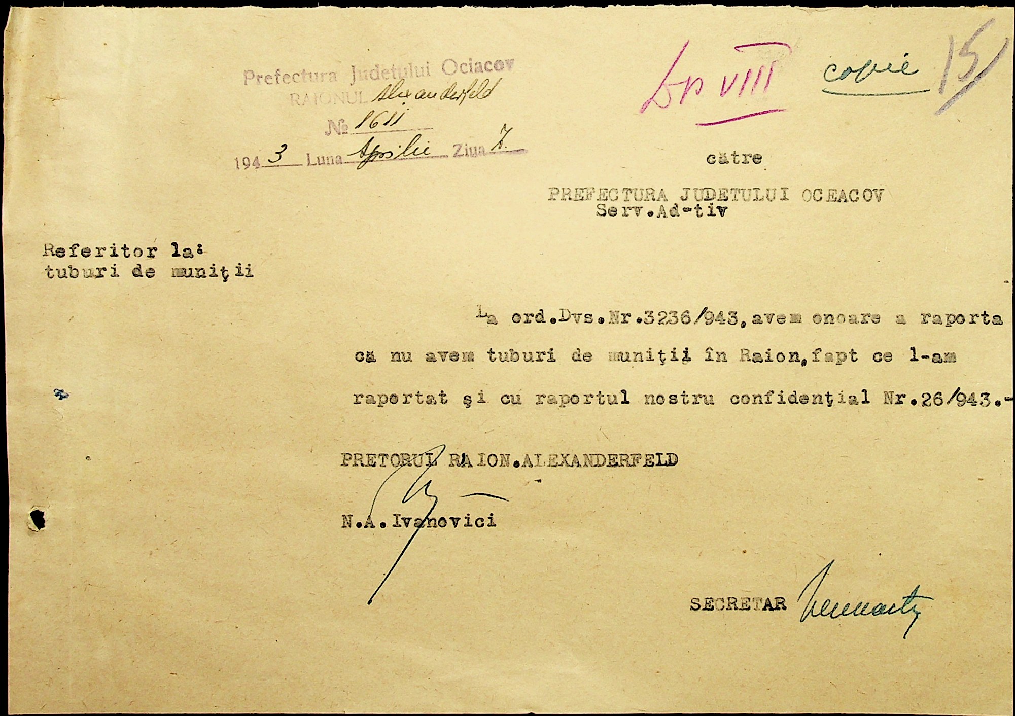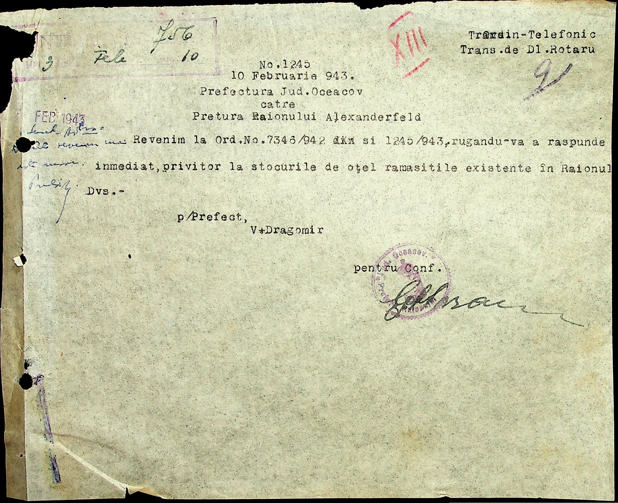 • • • • Справа № 36 “Інструкція цивільного губернатора Трансністрії (копія) про відправку товарів залізницею. Листування з префектурою Очаківського повіту про арешт трактористів Тимофєєва Стефана та Кравченка Олексія за відмову виходити на роботу, Відомості про наявність вуликів у товариствах і на фермах Александерфельдського району”