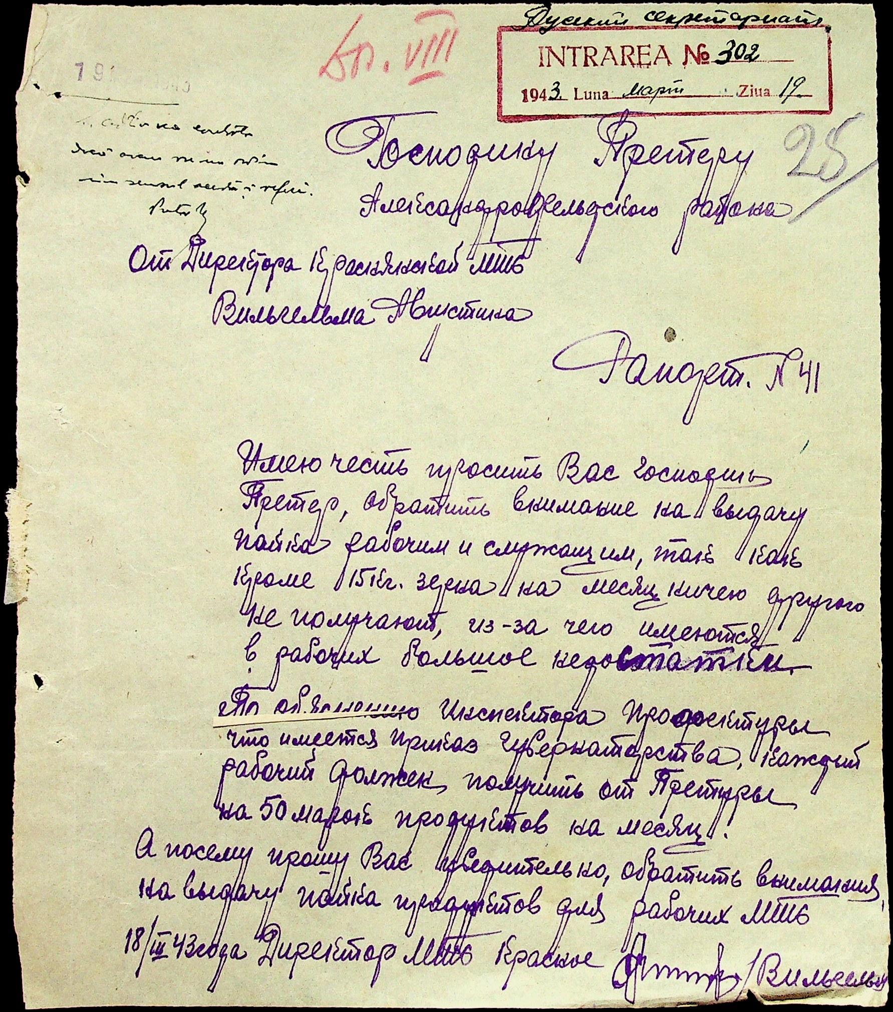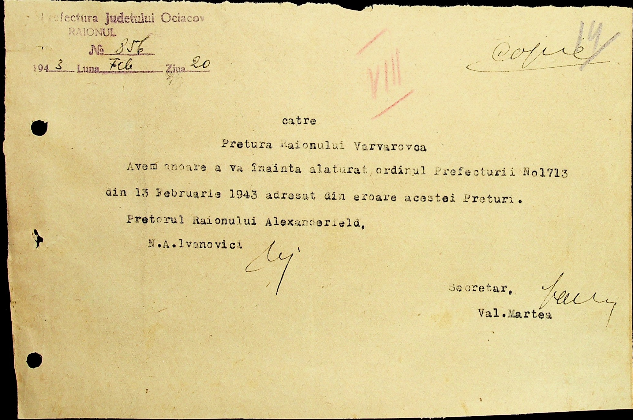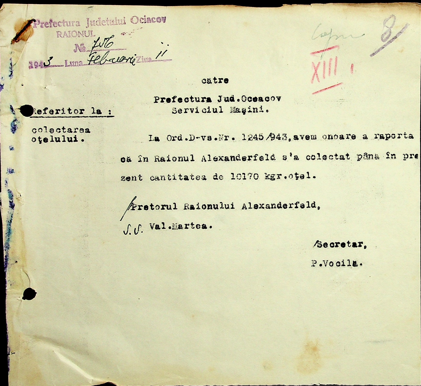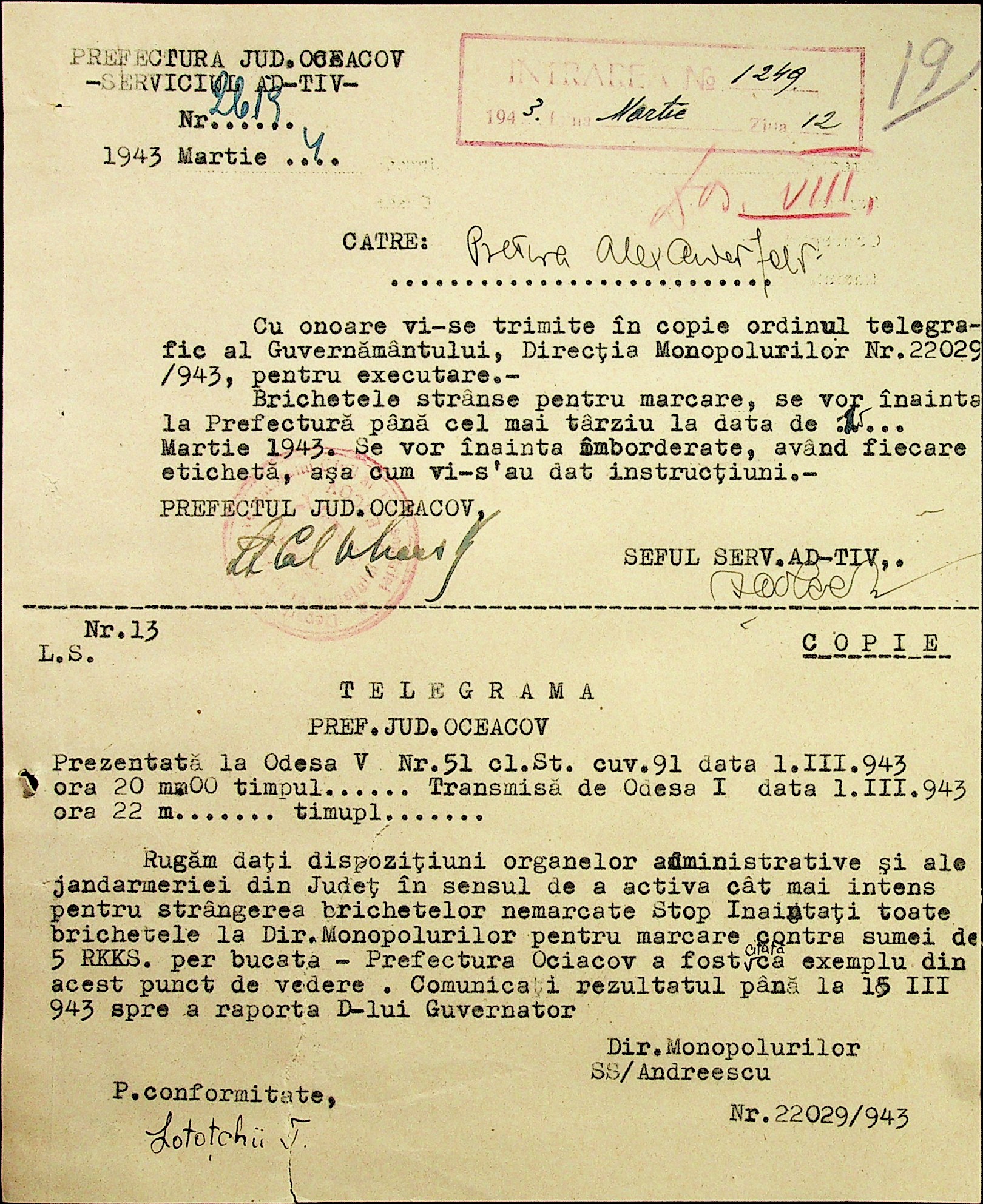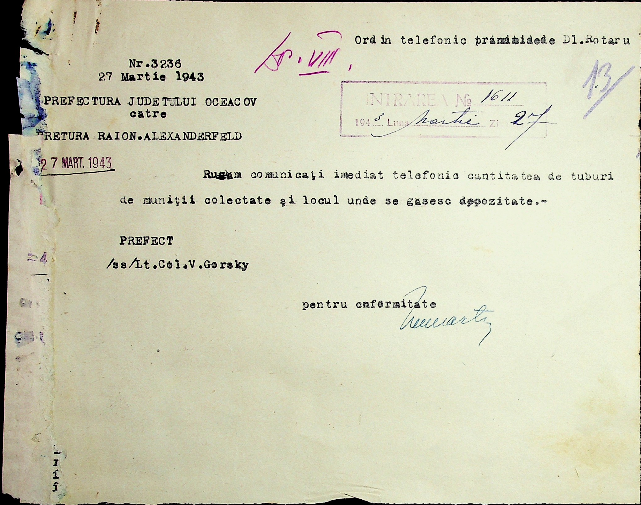 • • • • Справа № 36 “Інструкція цивільного губернатора Трансністрії (копія) про відправку товарів залізницею. Листування з префектурою Очаківського повіту про арешт трактористів Тимофєєва Стефана та Кравченка Олексія за відмову виходити на роботу, Відомості про наявність вуликів у товариствах і на фермах Александерфельдського району”
