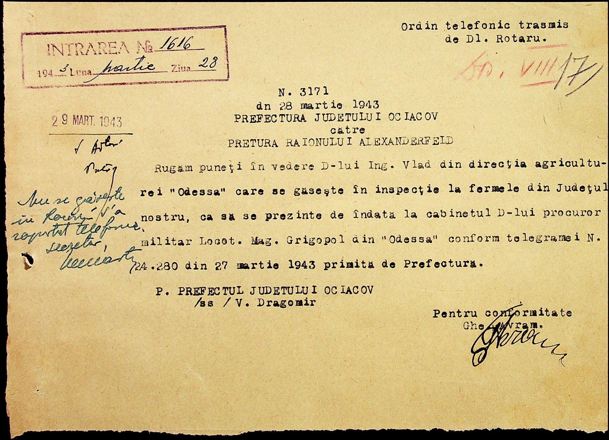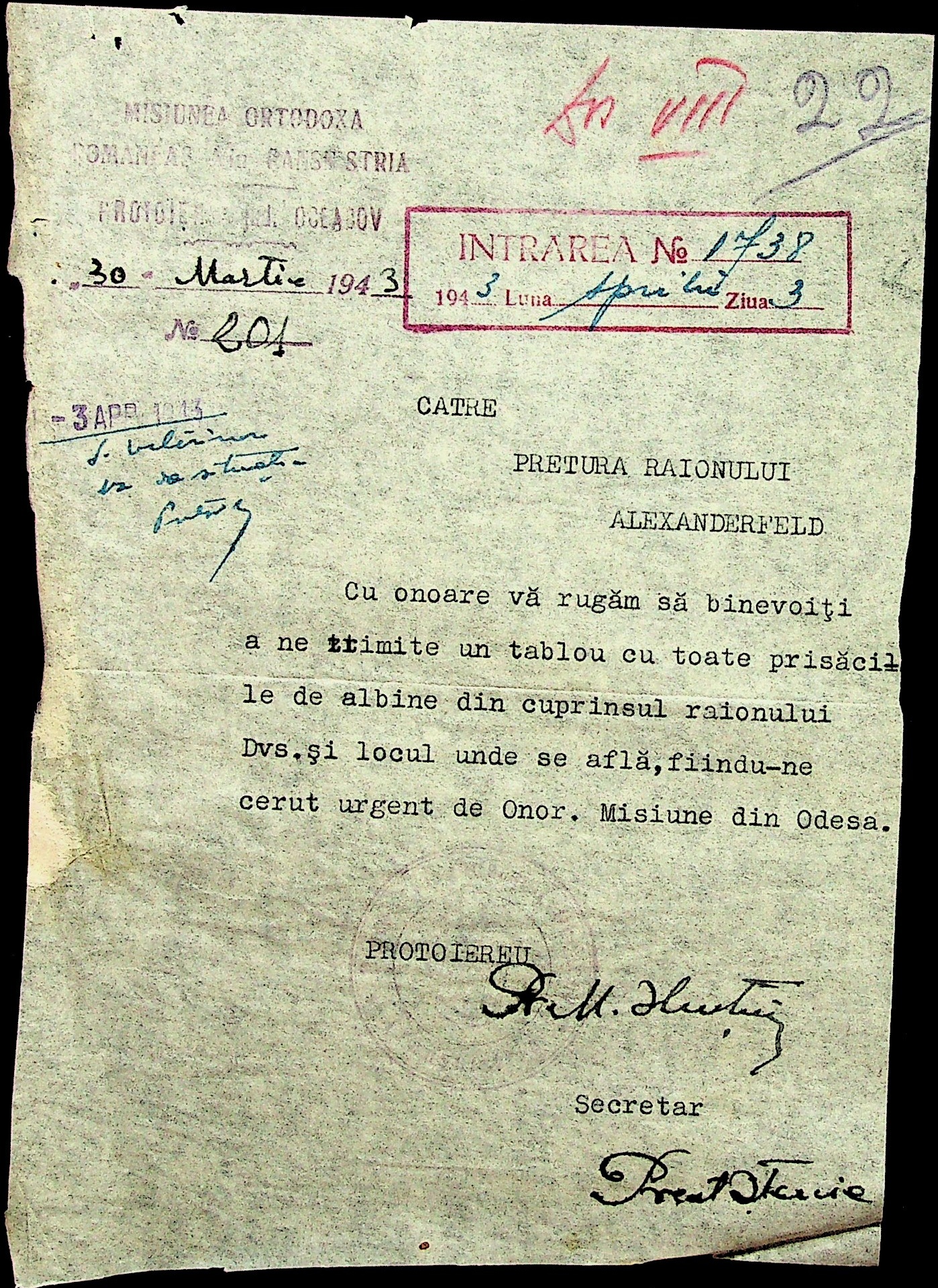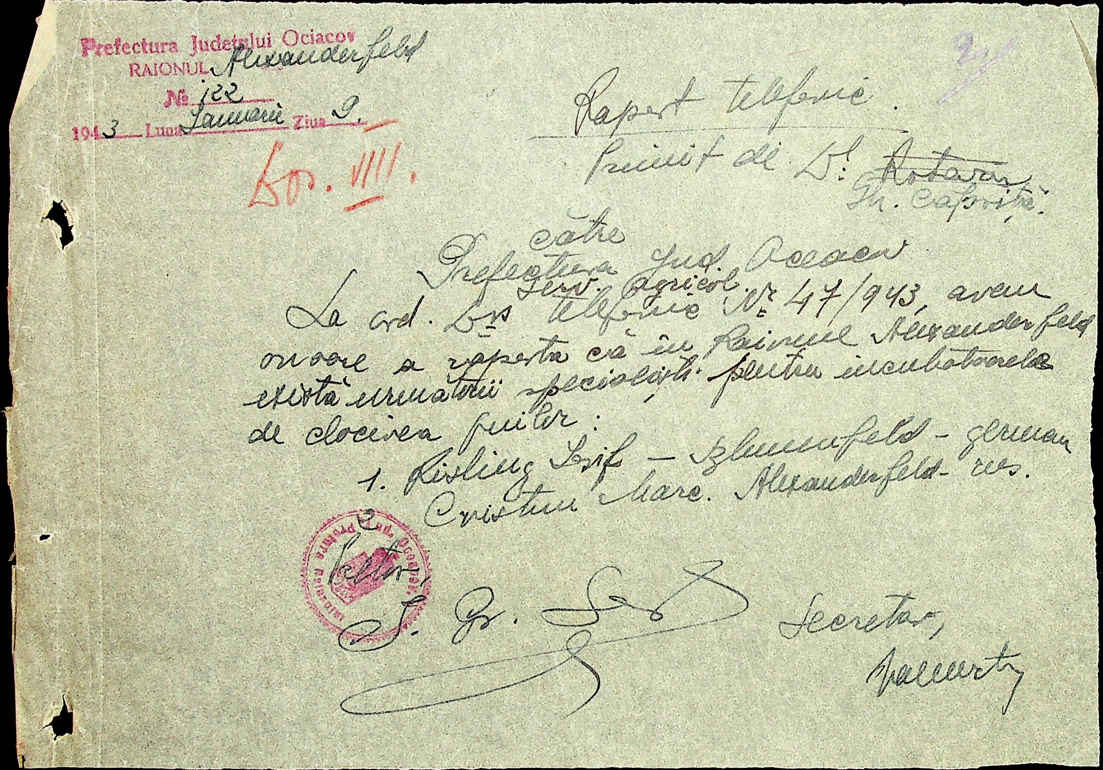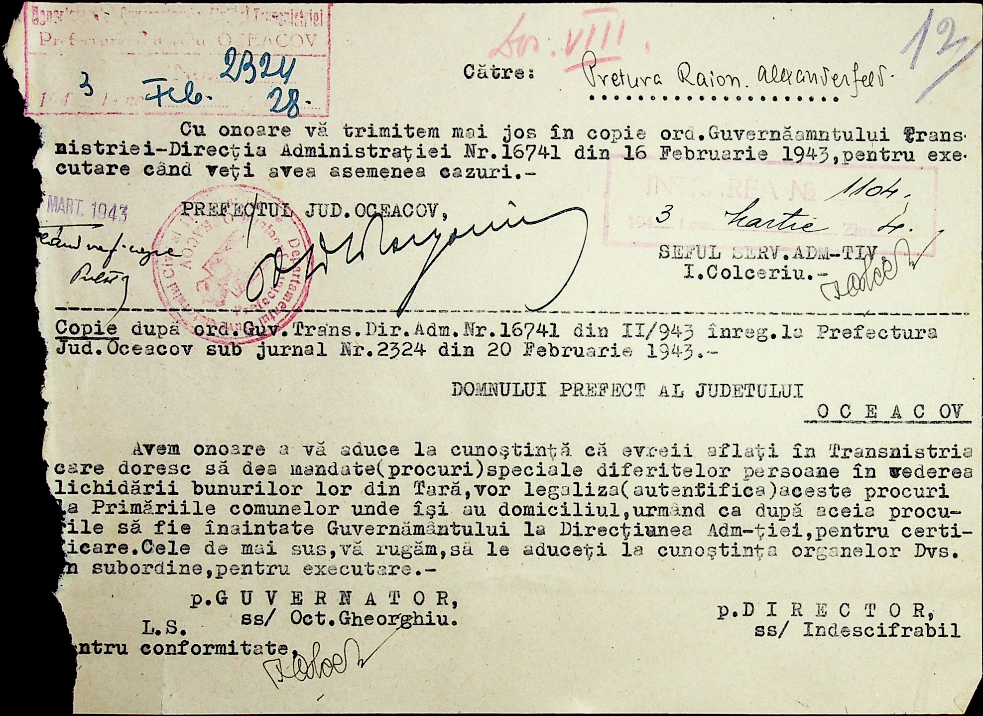 • • • • Справа № 36 “Інструкція цивільного губернатора Трансністрії (копія) про відправку товарів залізницею. Листування з префектурою Очаківського повіту про арешт трактористів Тимофєєва Стефана та Кравченка Олексія за відмову виходити на роботу, Відомості про наявність вуликів у товариствах і на фермах Александерфельдського району”