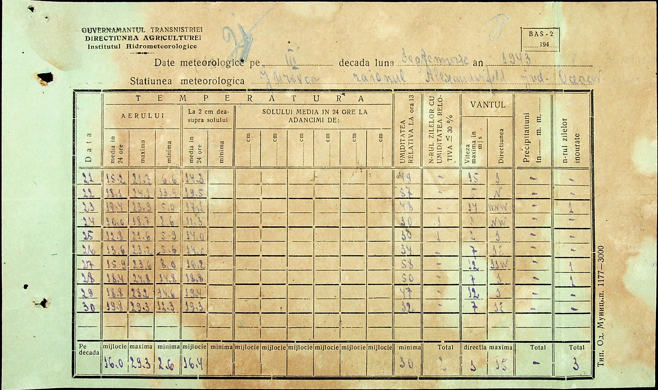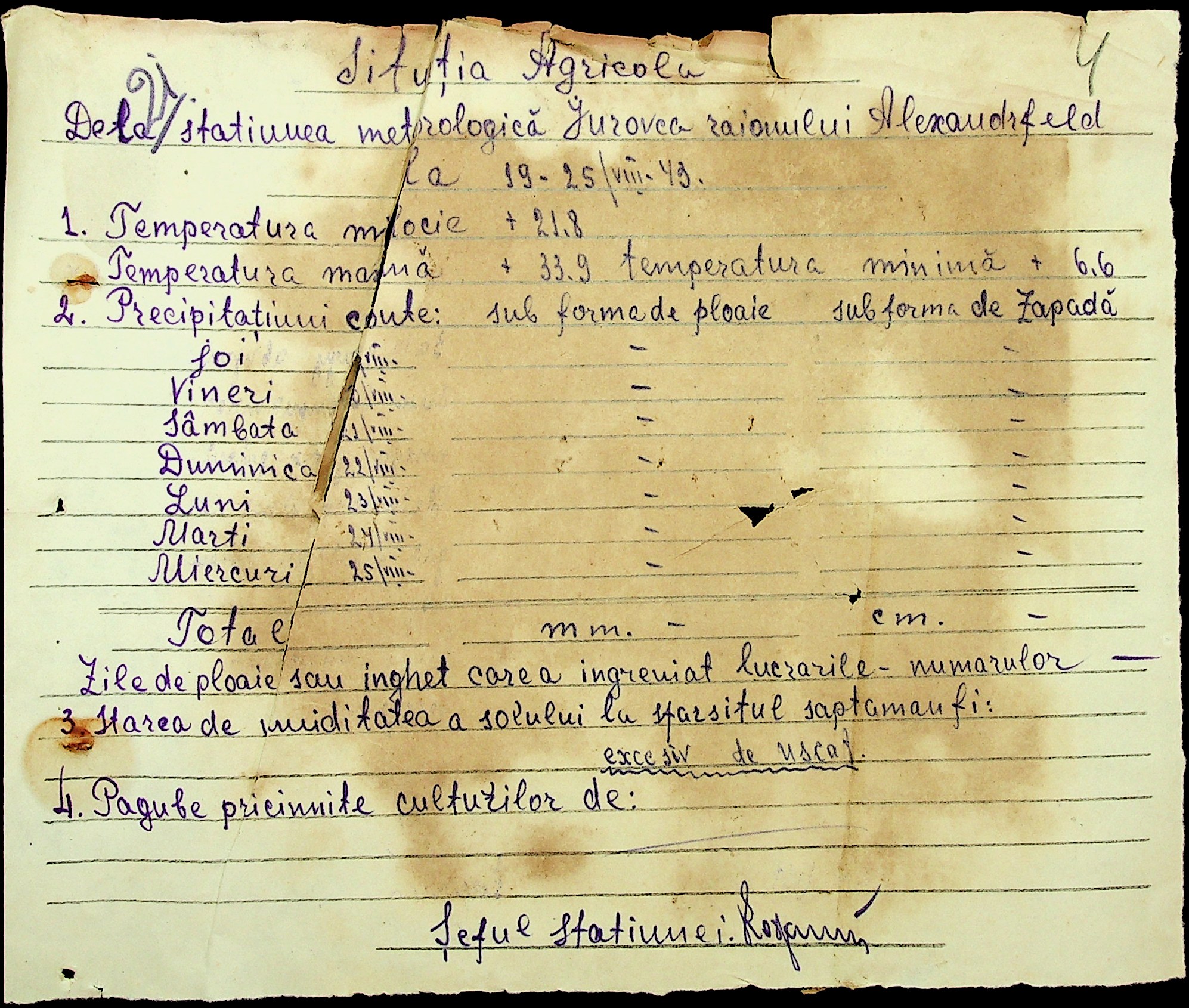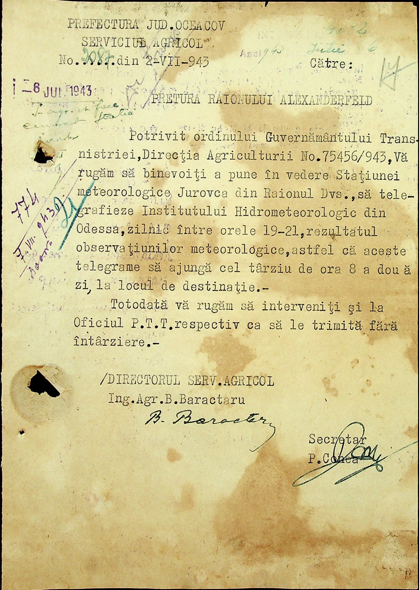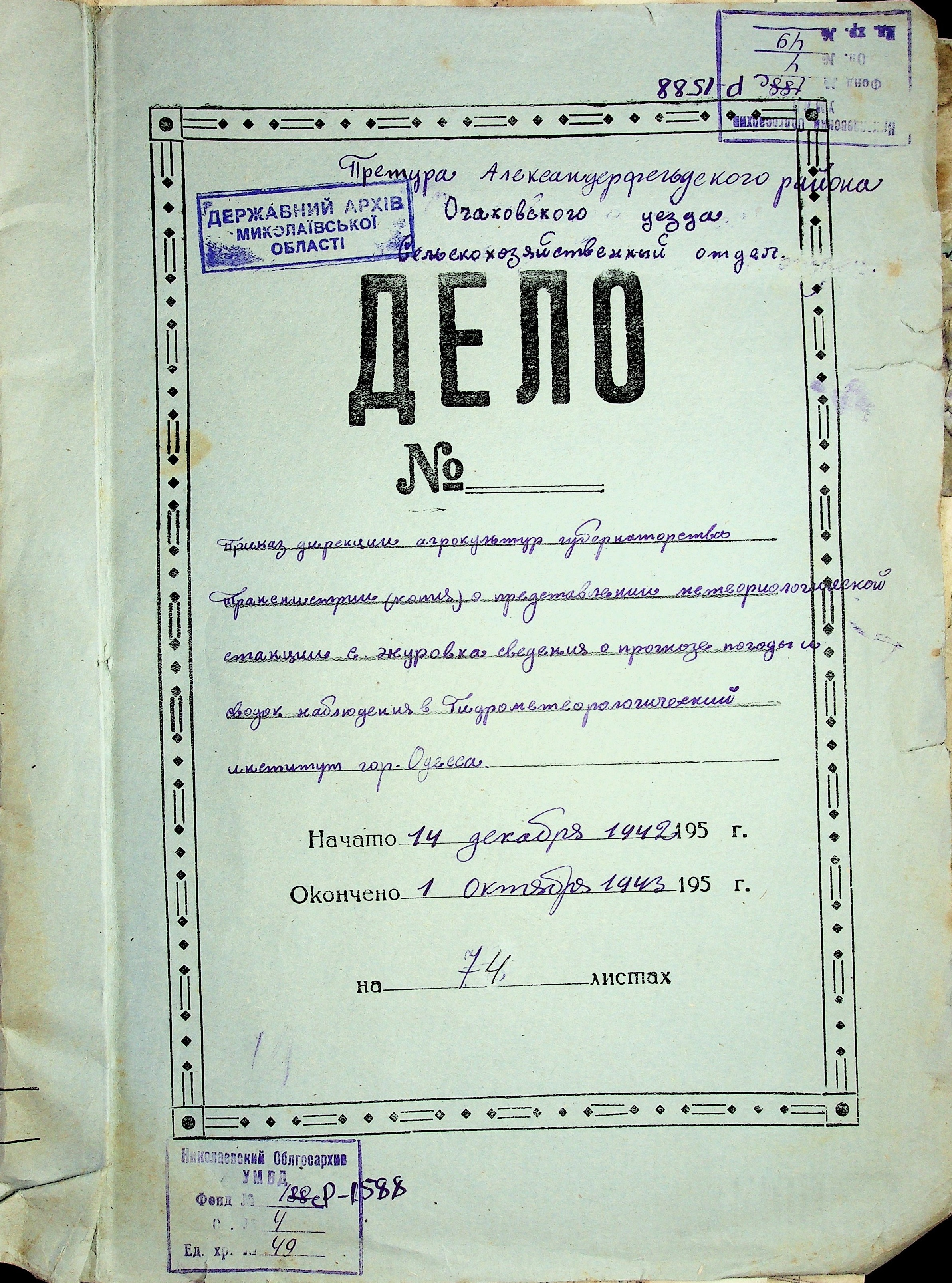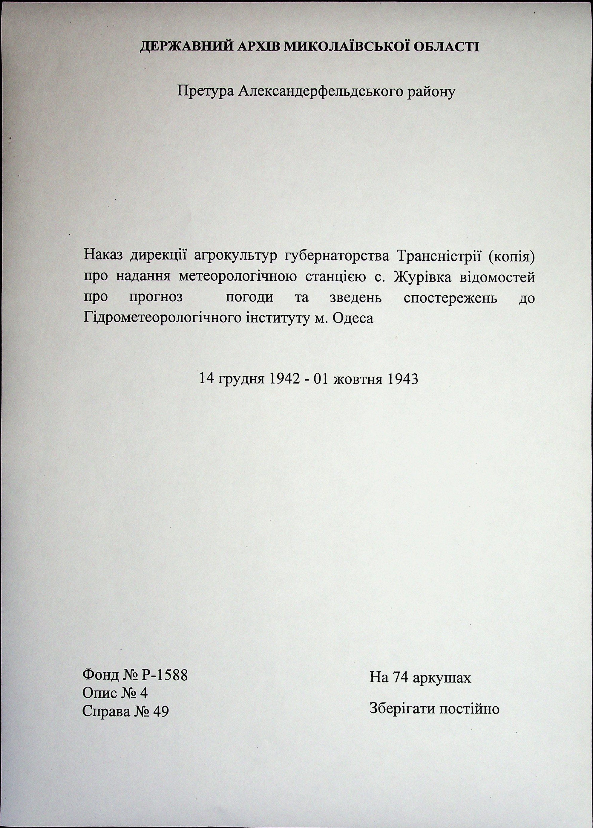 • • • • Справа № 49 “Наказ дирекції агрокультур губернаторства Трансністрії (копія) про надання метеорологічною станцією с. Журівка відомостей про прогноз погоди та зведень спостережень до Гідрометеорологічного інституту м. Одеса”