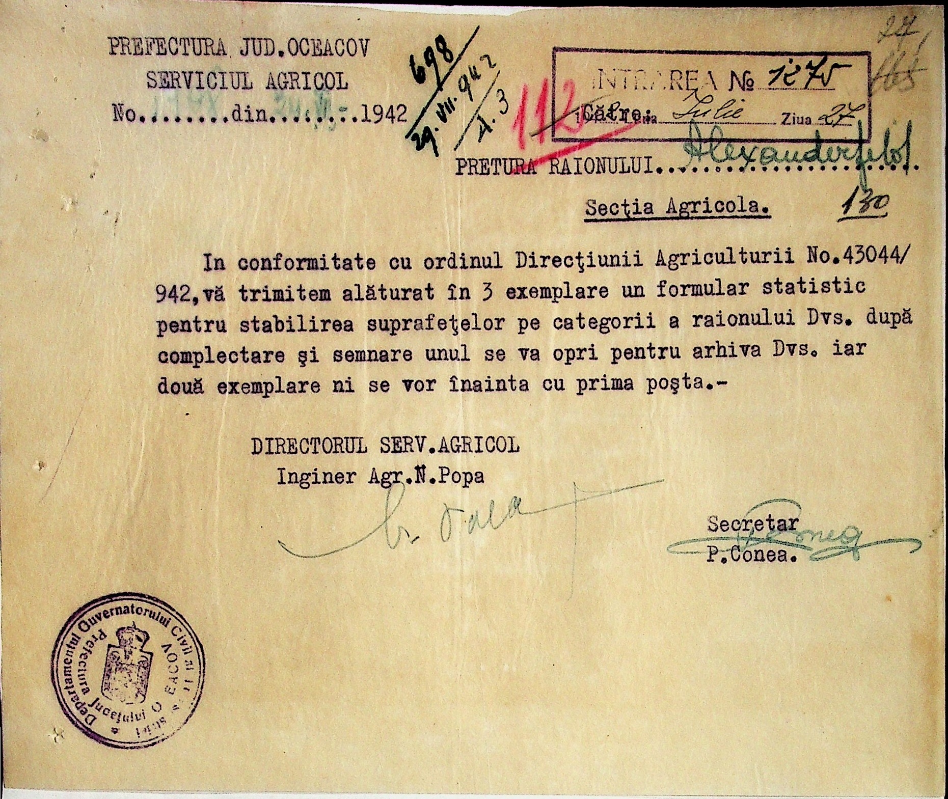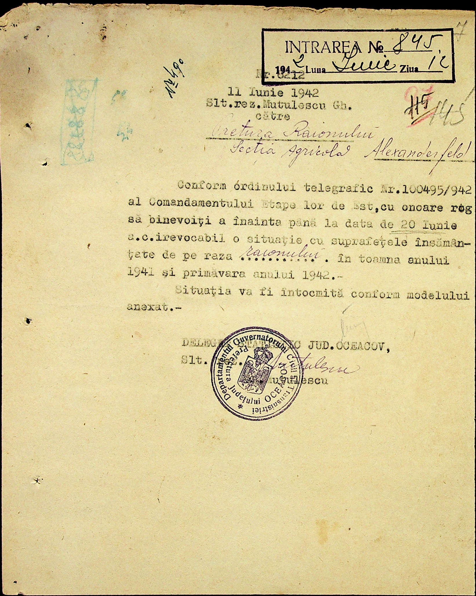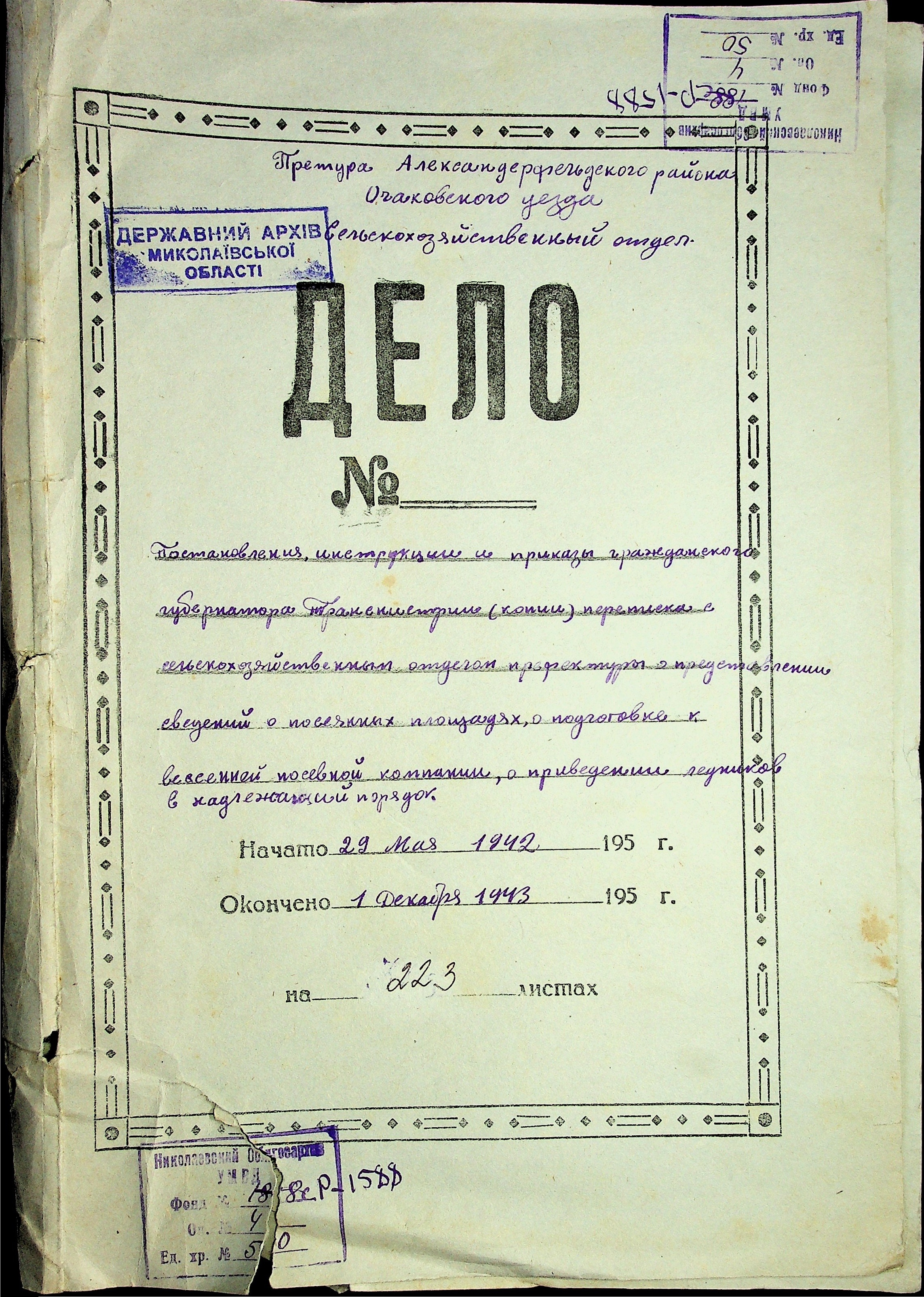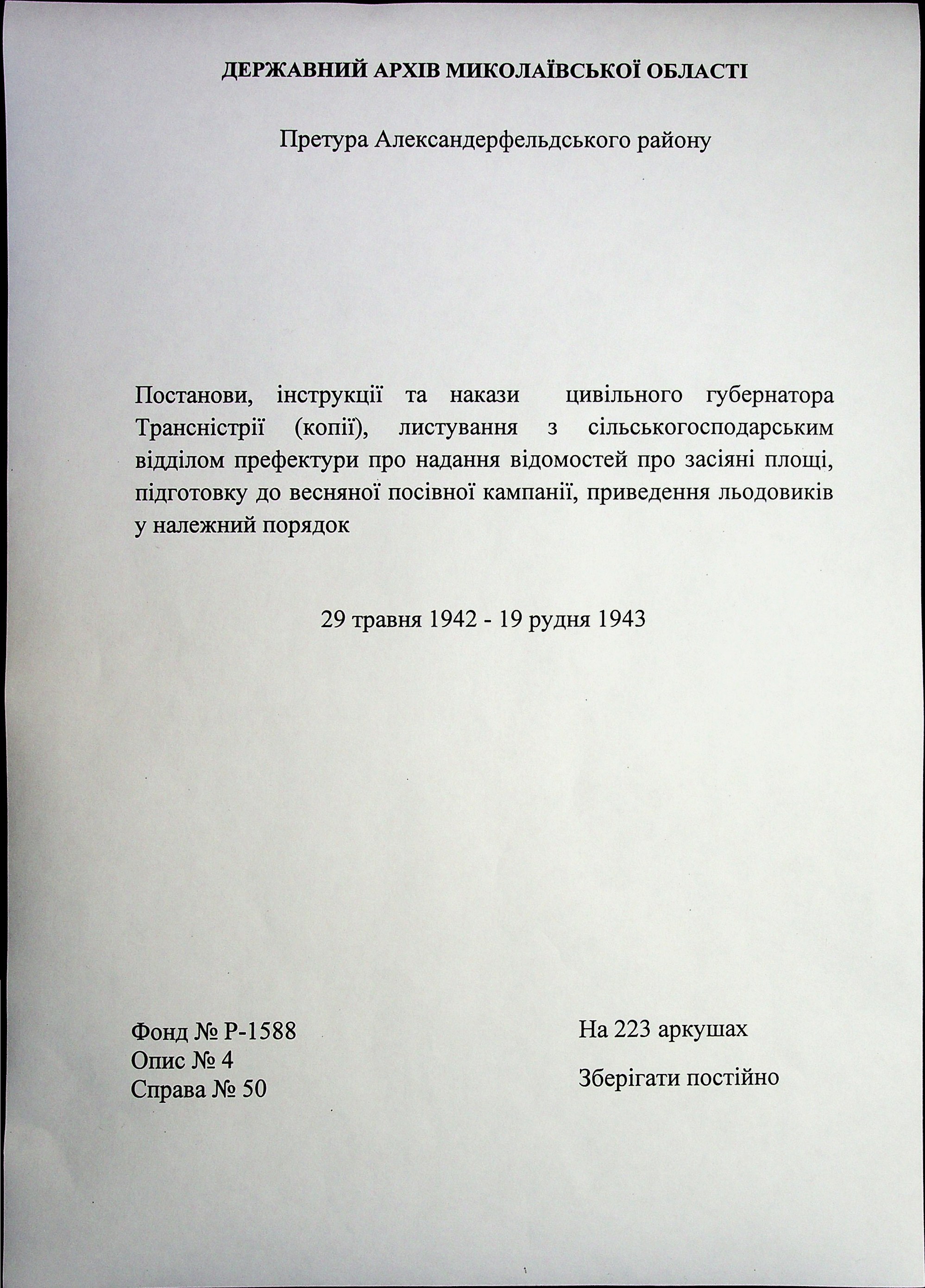 • • • • Справа № 50 “Постанови, інструкції та накази цивільного губернатора Трансністрії (копії), листування з сільськогосподарським відділом префектури про надання відомостей про засіяні площі, підготовку до весняної посівної кампанії, приведення льодовиків у належний порядок”