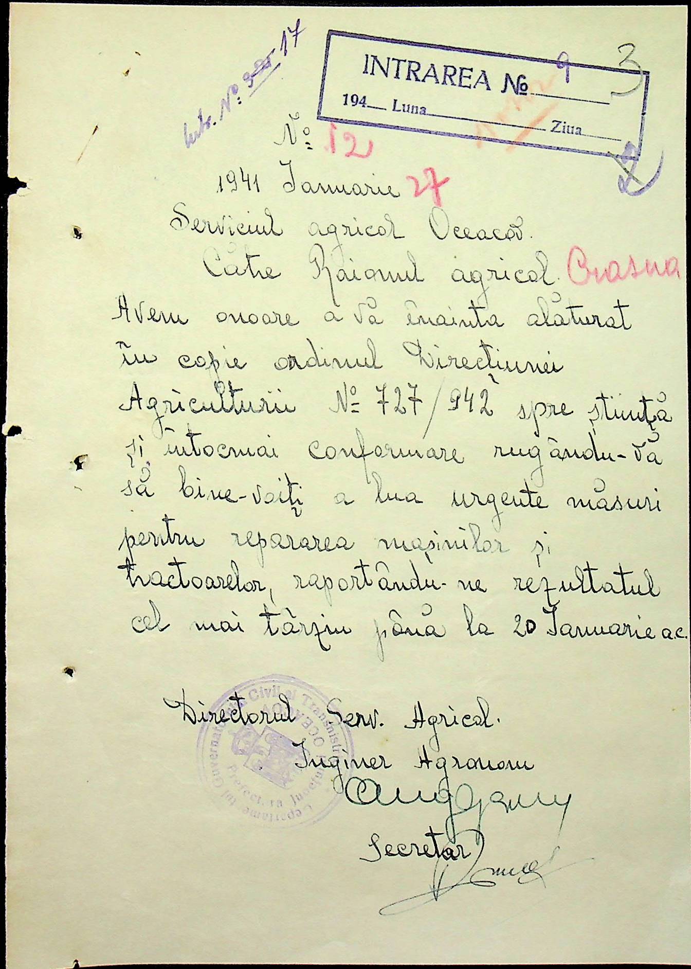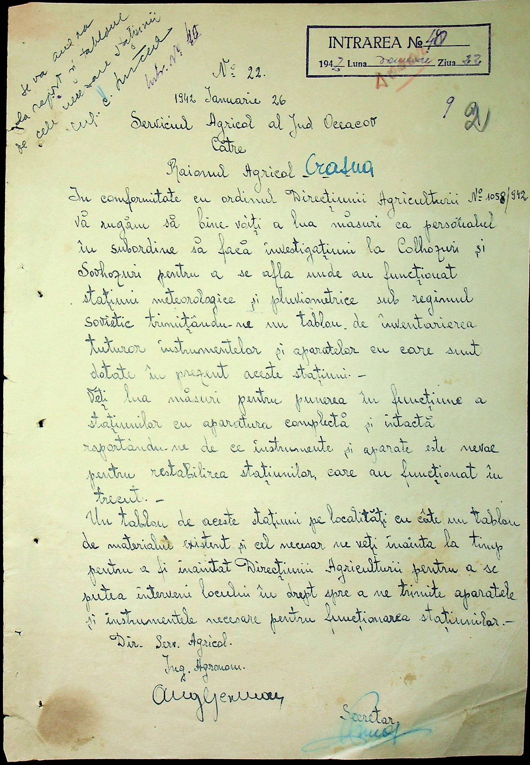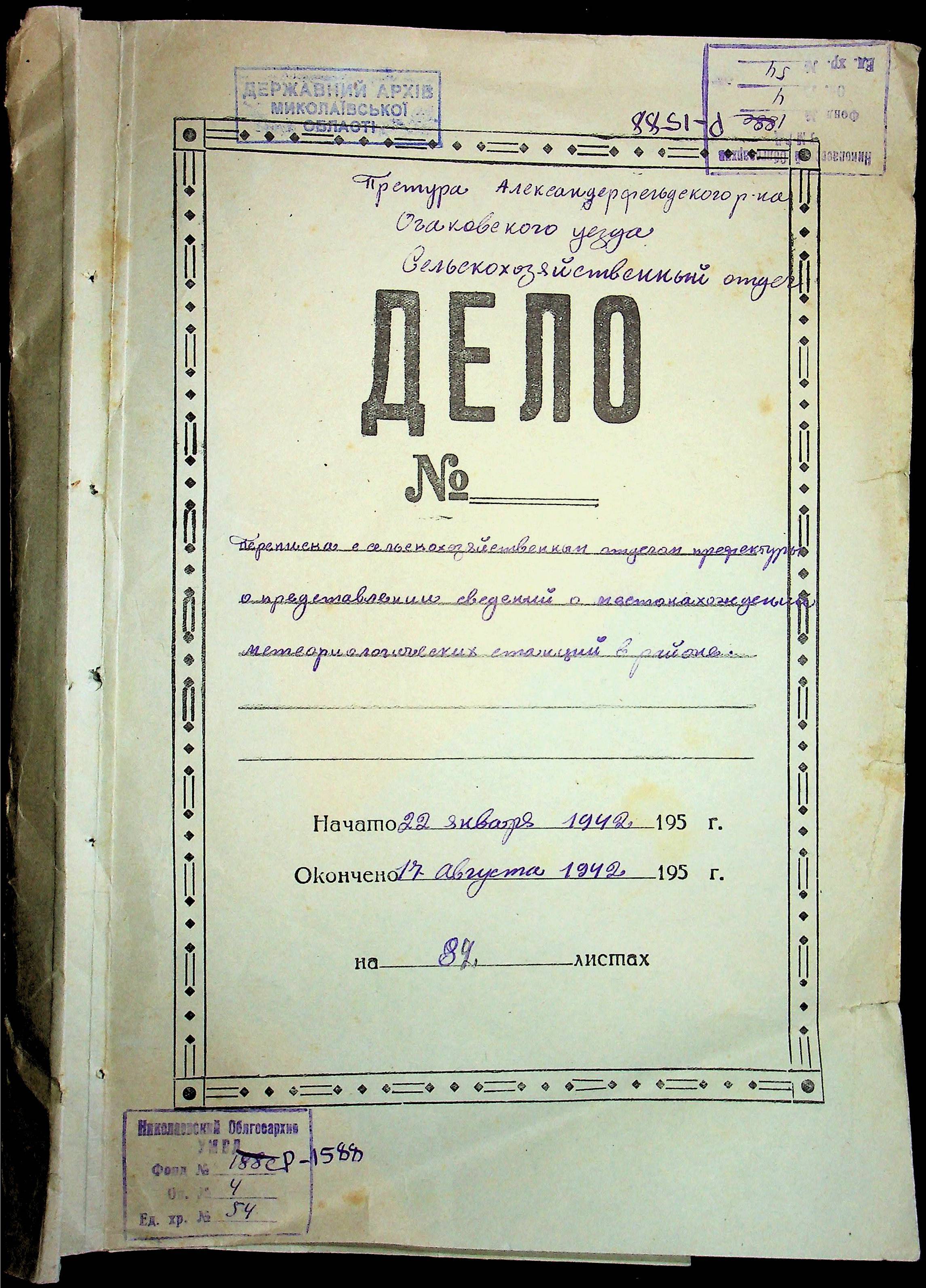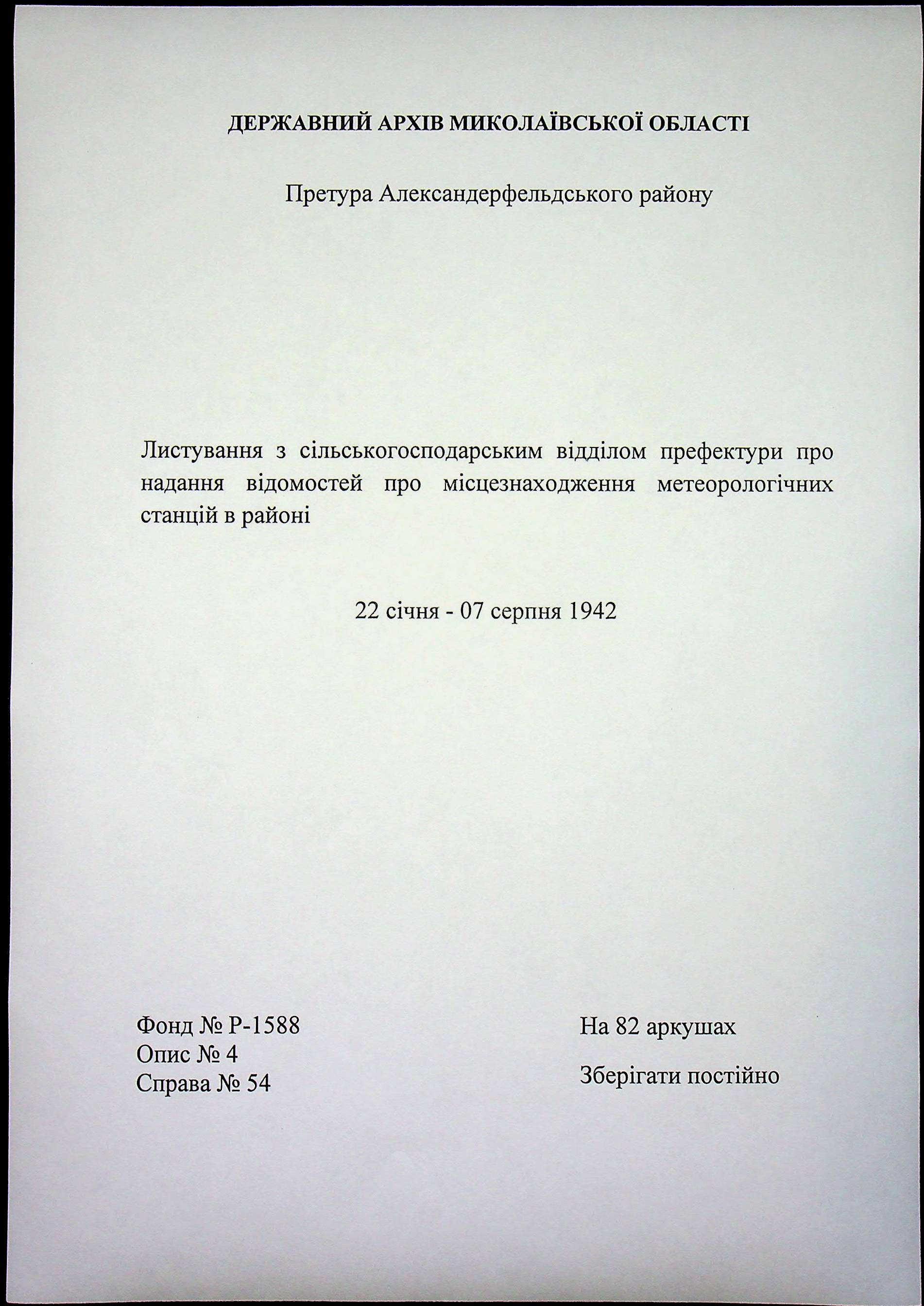 • • • • Справа № 54 “Листування з сільськогосподарським відділом префектури про надання відомостей про місцезнаходження метеорологічних станцій в районі”