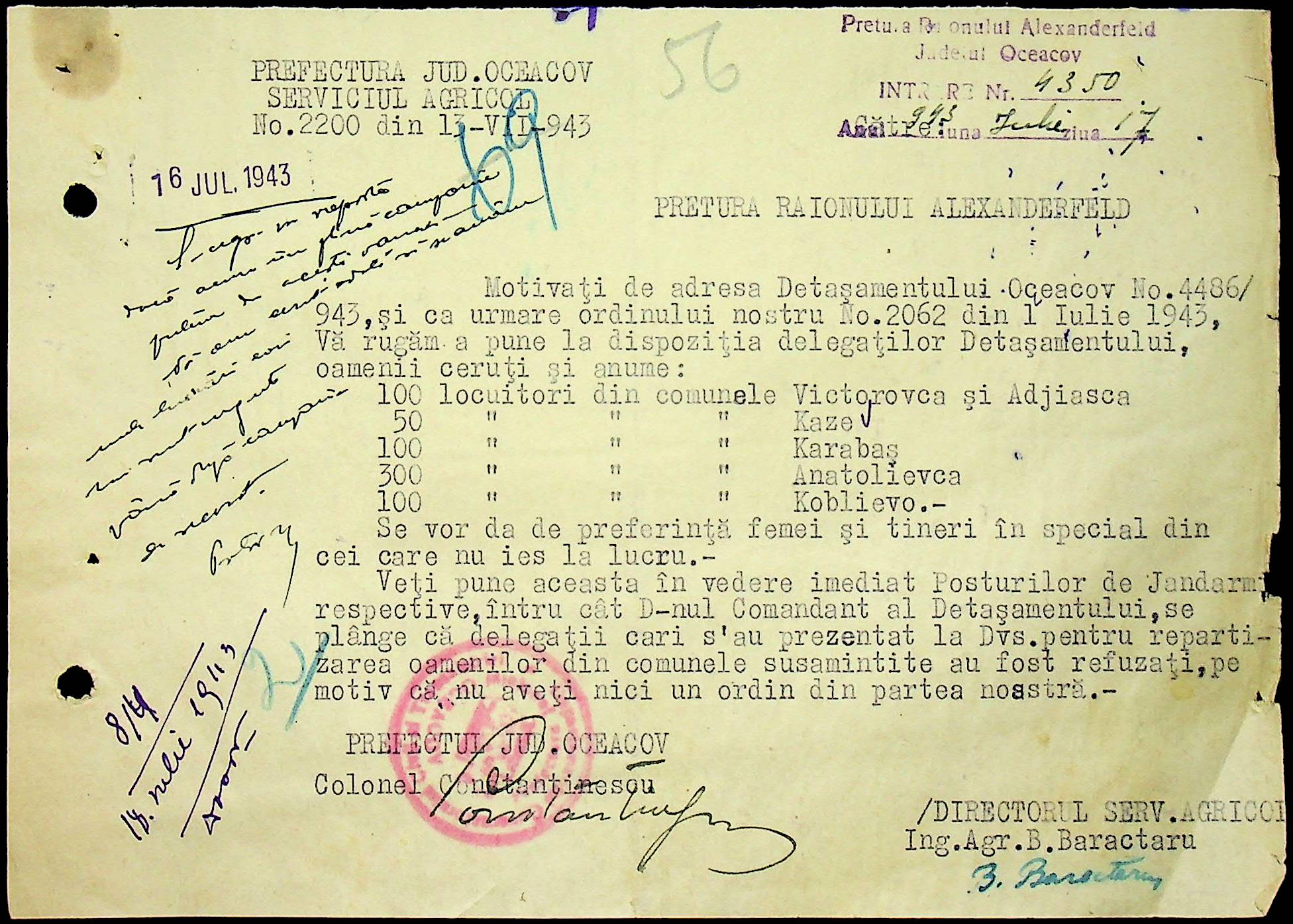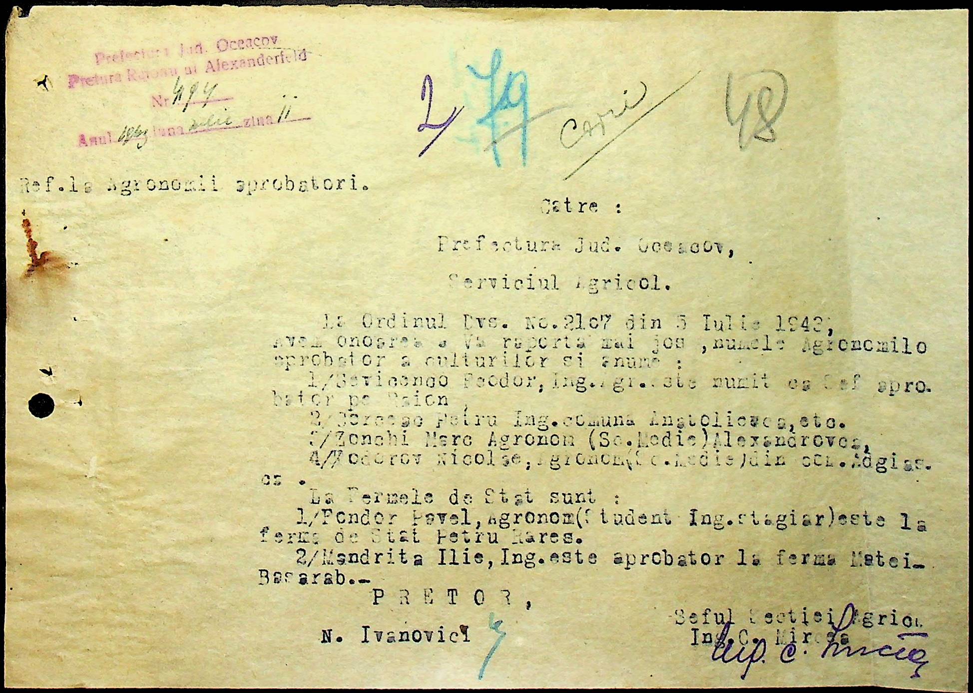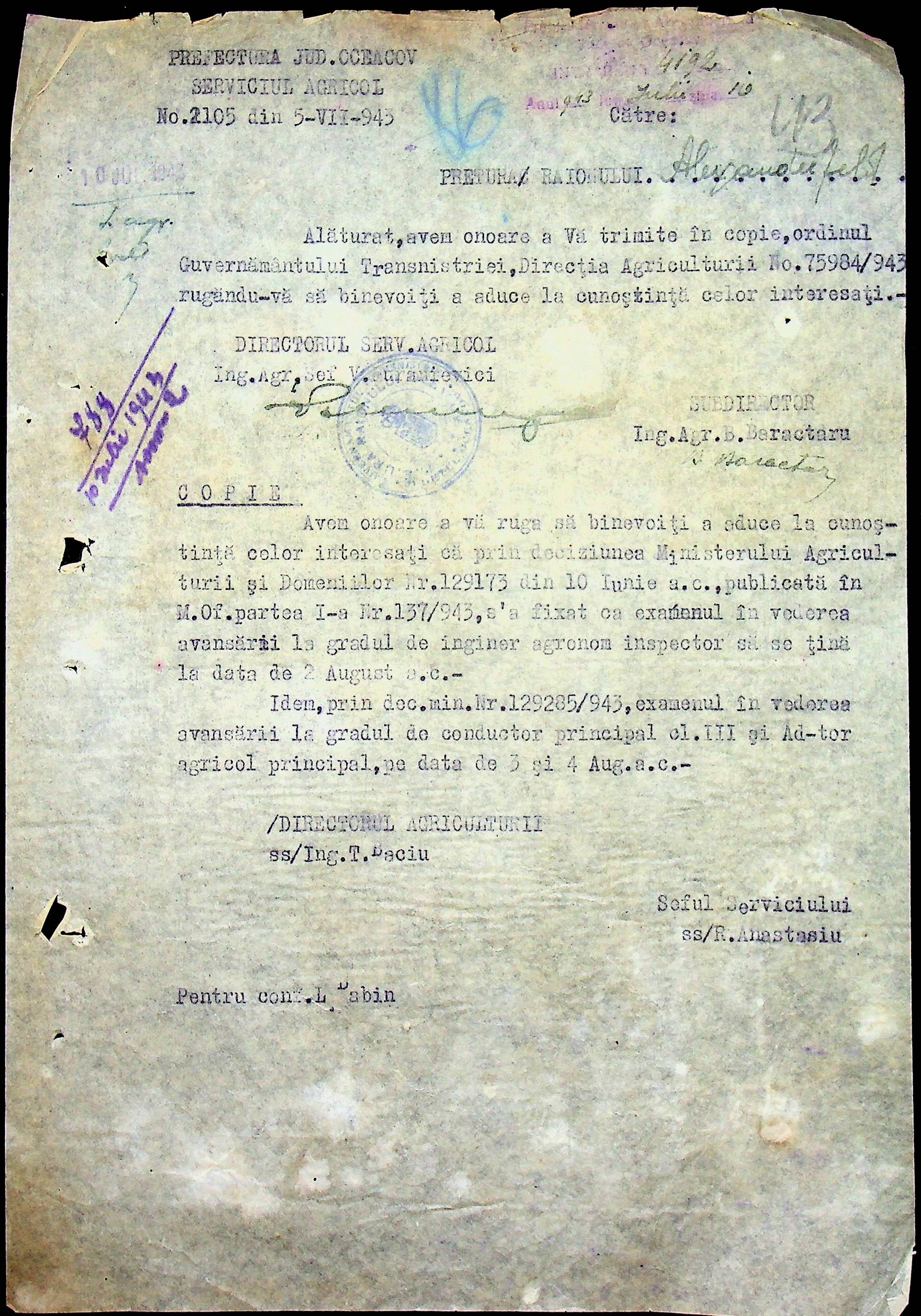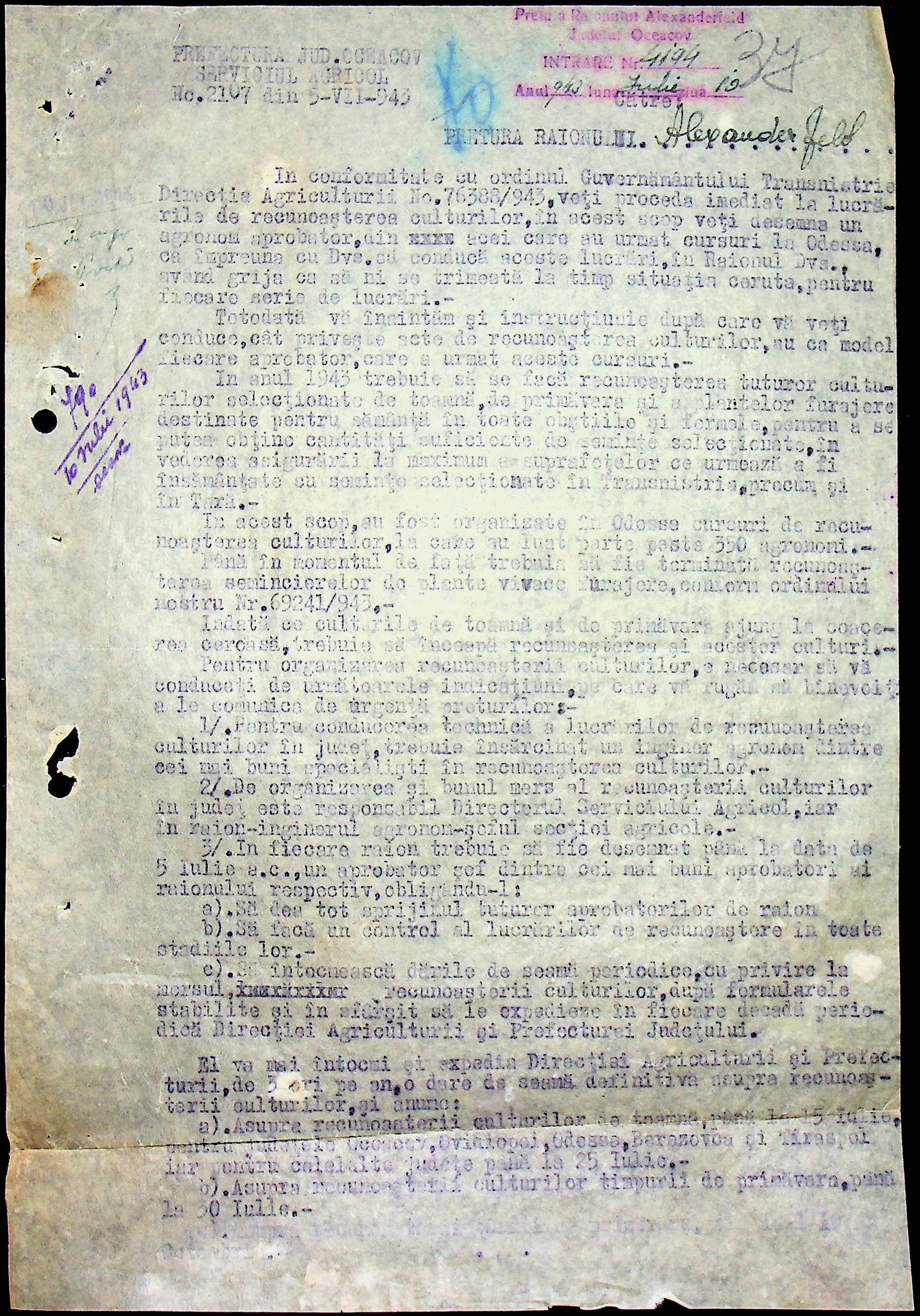 • • • • Справа № 62 “Інструкції, накази дирекції агрокультур губернаторства Трансністрії (копії), листування з сільськогосподарським відділом префектури про вихід на польові роботи учнів та вчителів, мобілізацію населення на військові роботи. Список сільськогосподарських спеціалістів, премійованих румунською адміністрацією під час весняної посівної кампанії 1943 року”