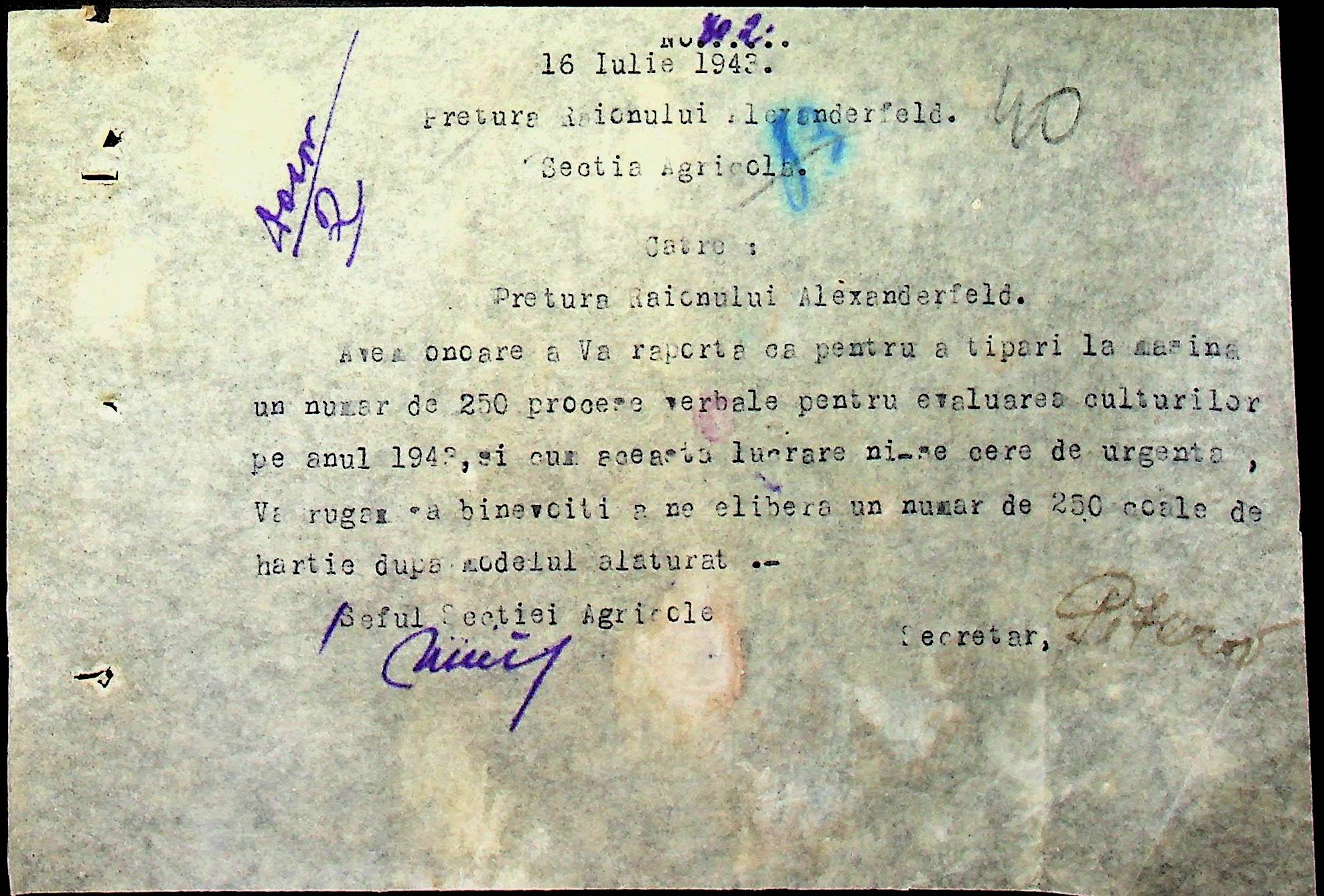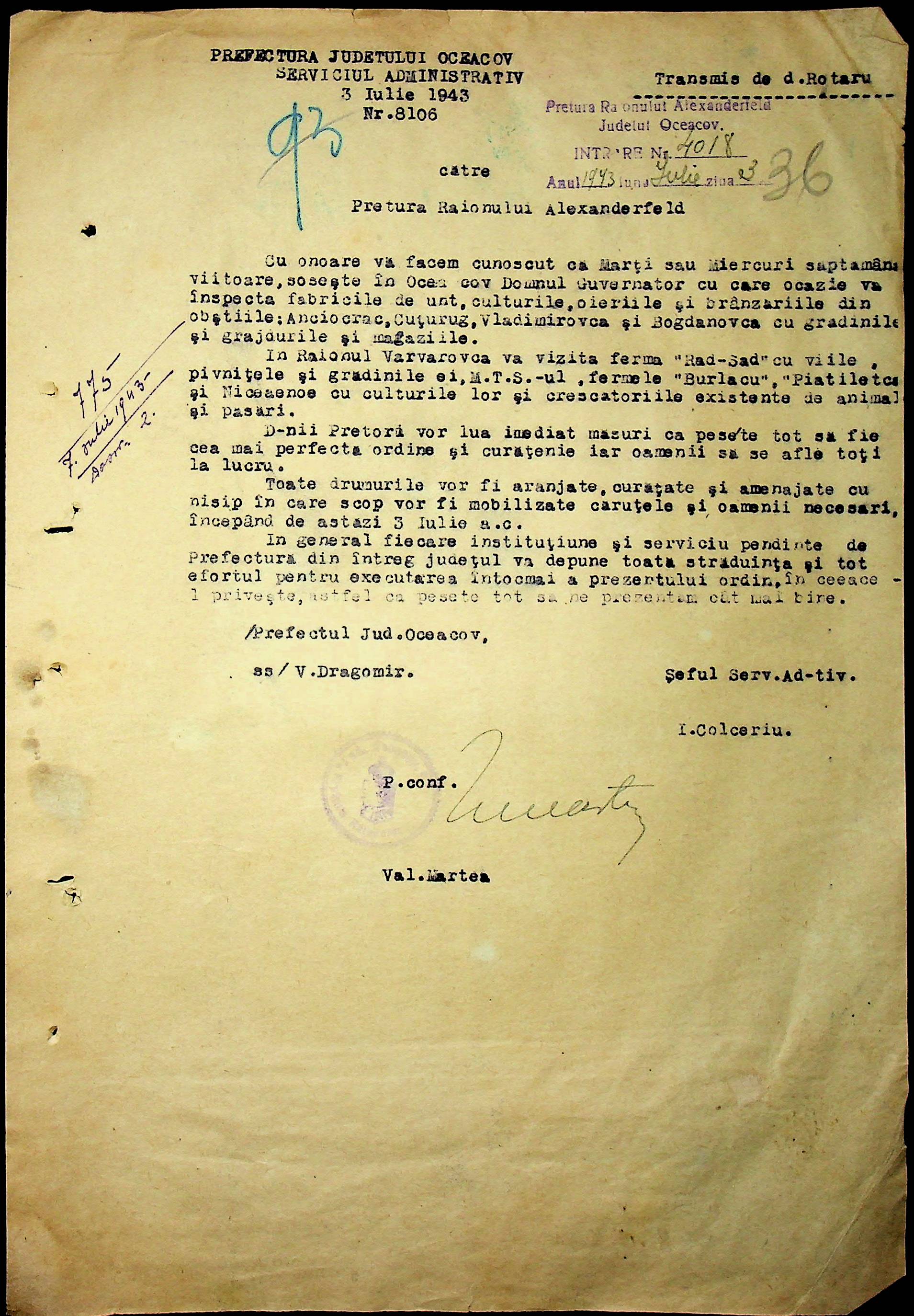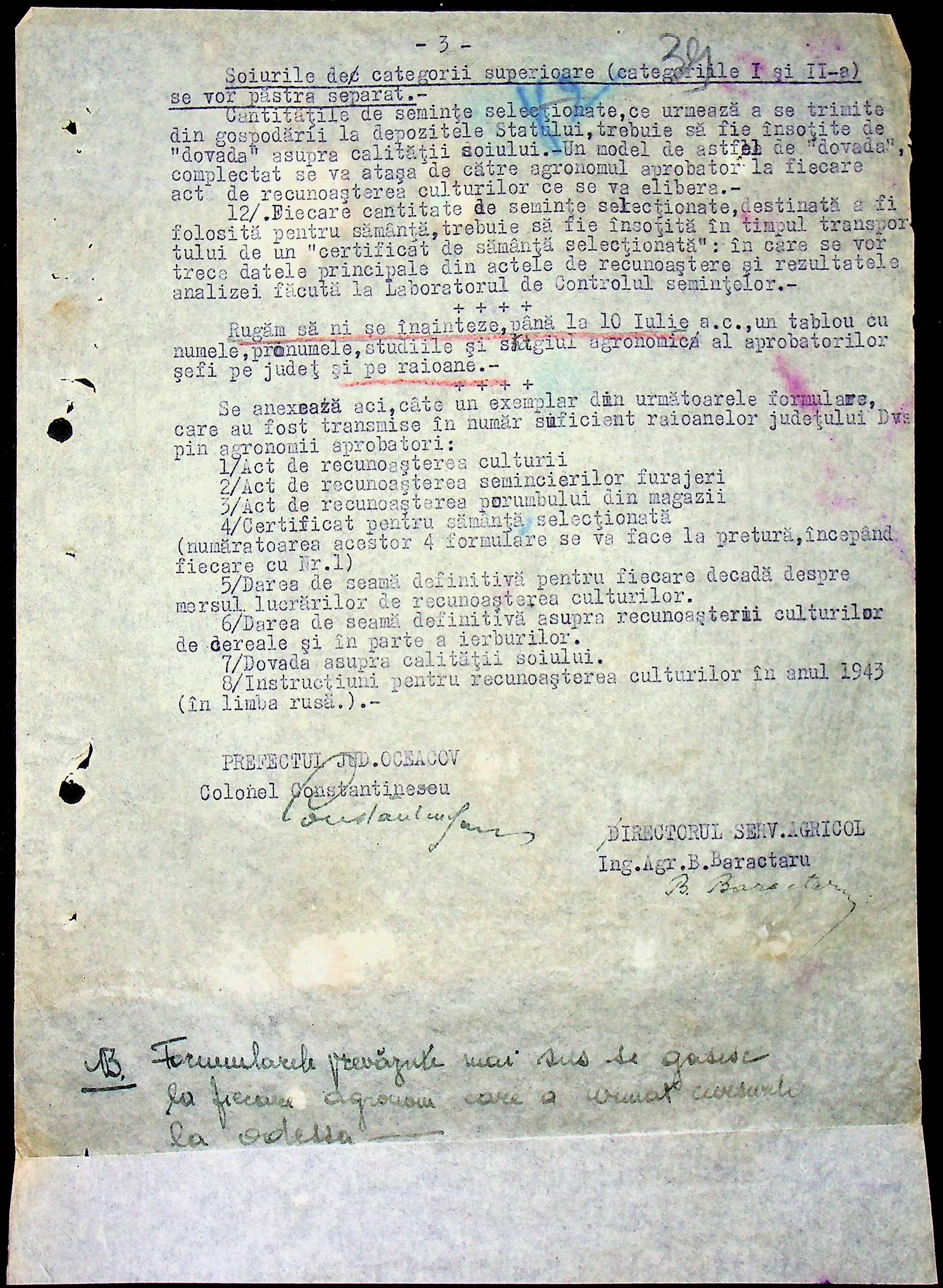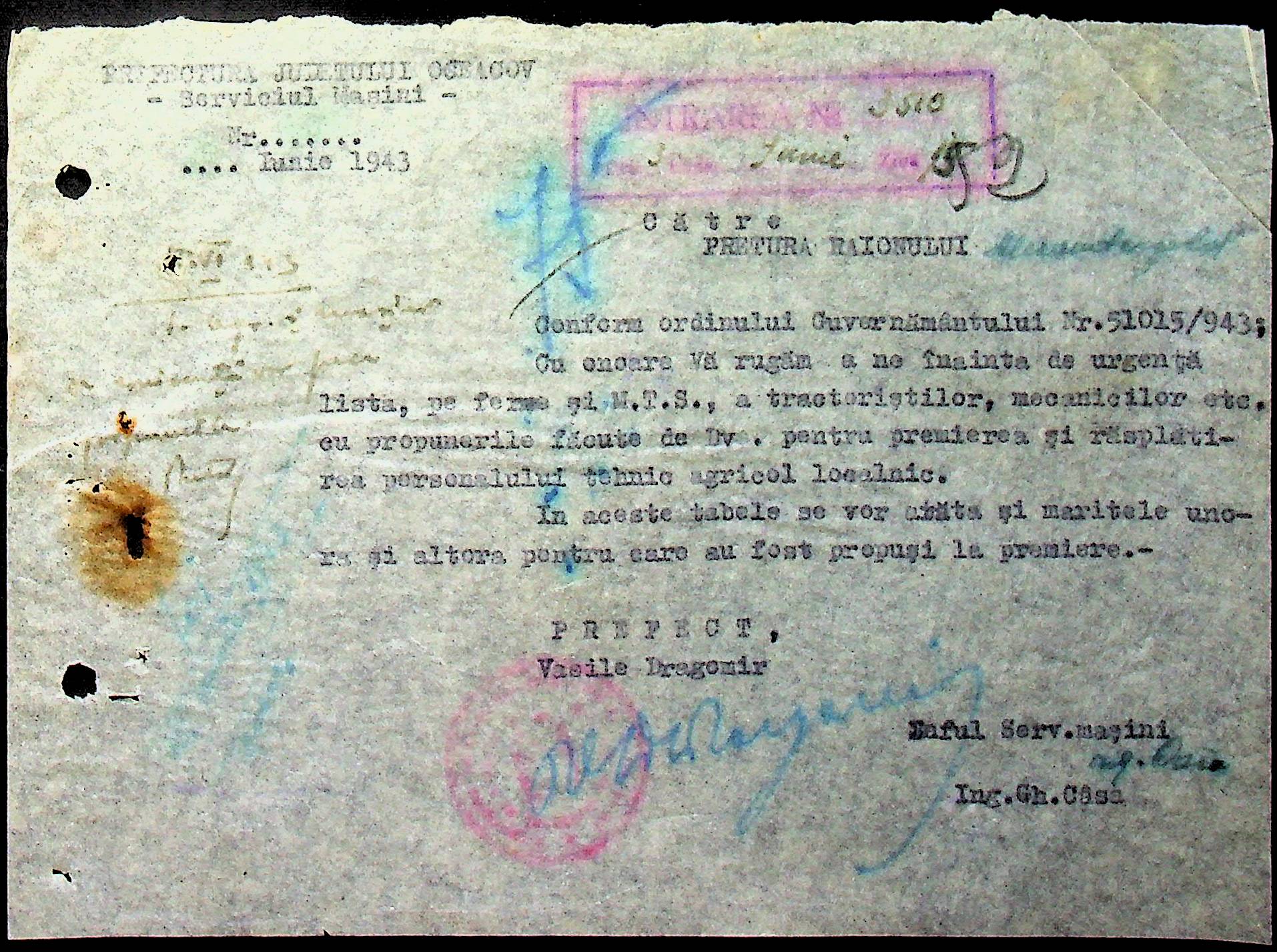• • • • Справа № 62 “Інструкції, накази дирекції агрокультур губернаторства Трансністрії (копії), листування з сільськогосподарським відділом префектури про вихід на польові роботи учнів та вчителів, мобілізацію населення на військові роботи. Список сільськогосподарських спеціалістів, премійованих румунською адміністрацією під час весняної посівної кампанії 1943 року”