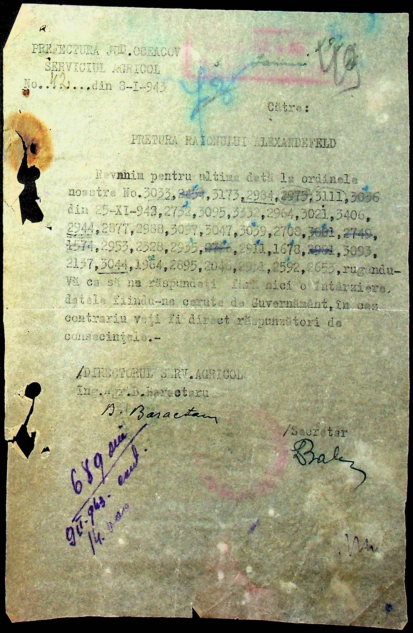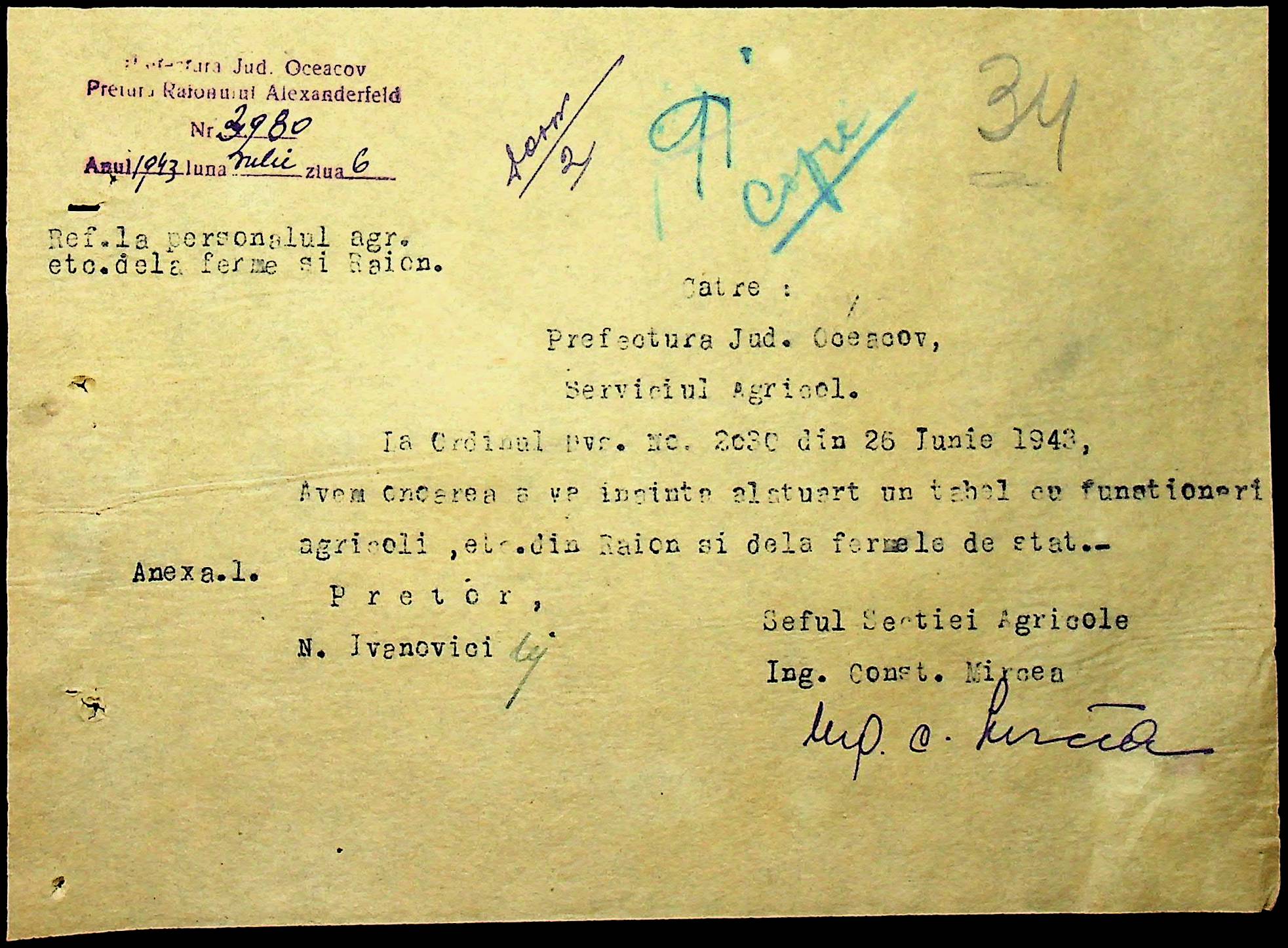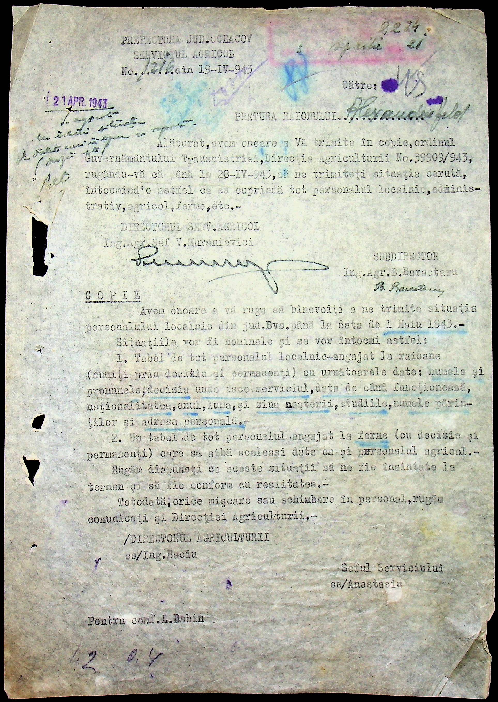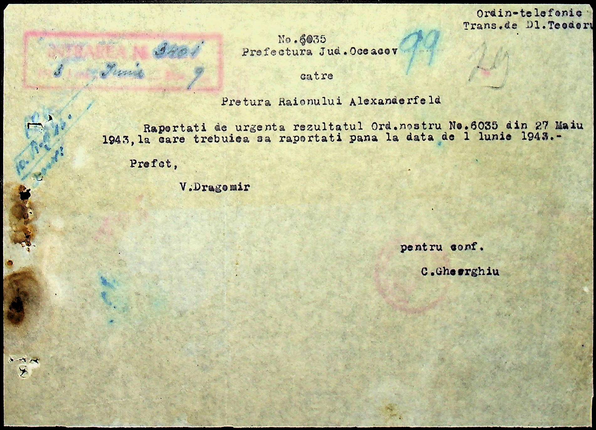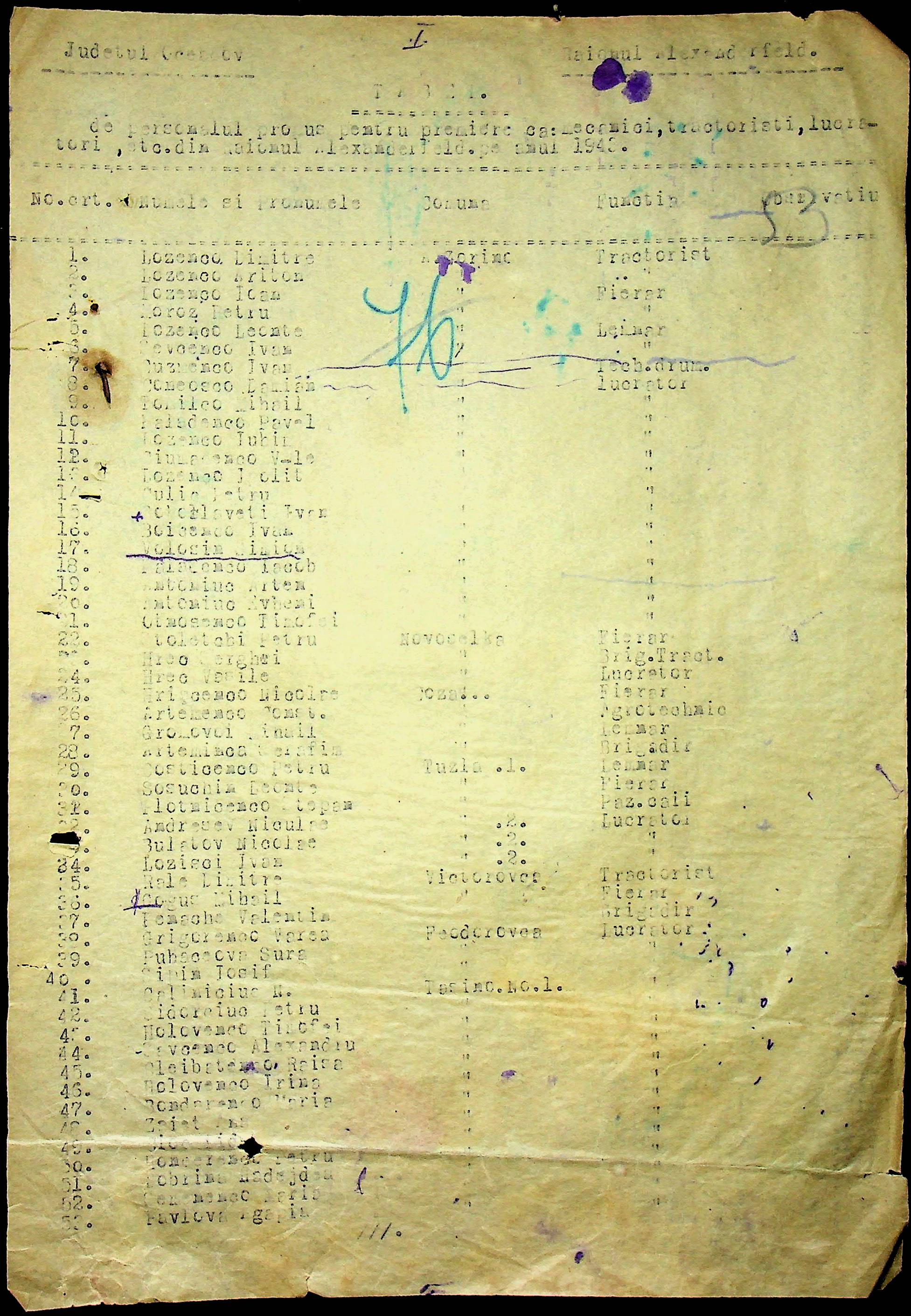 • • • • Справа № 62 “Інструкції, накази дирекції агрокультур губернаторства Трансністрії (копії), листування з сільськогосподарським відділом префектури про вихід на польові роботи учнів та вчителів, мобілізацію населення на військові роботи. Список сільськогосподарських спеціалістів, премійованих румунською адміністрацією під час весняної посівної кампанії 1943 року”