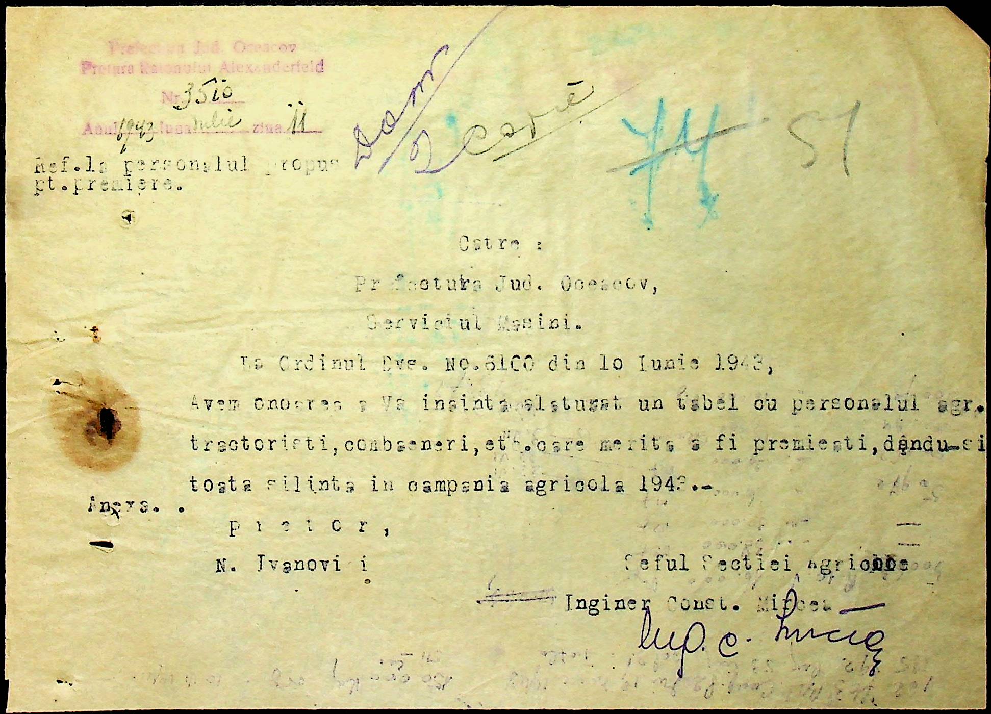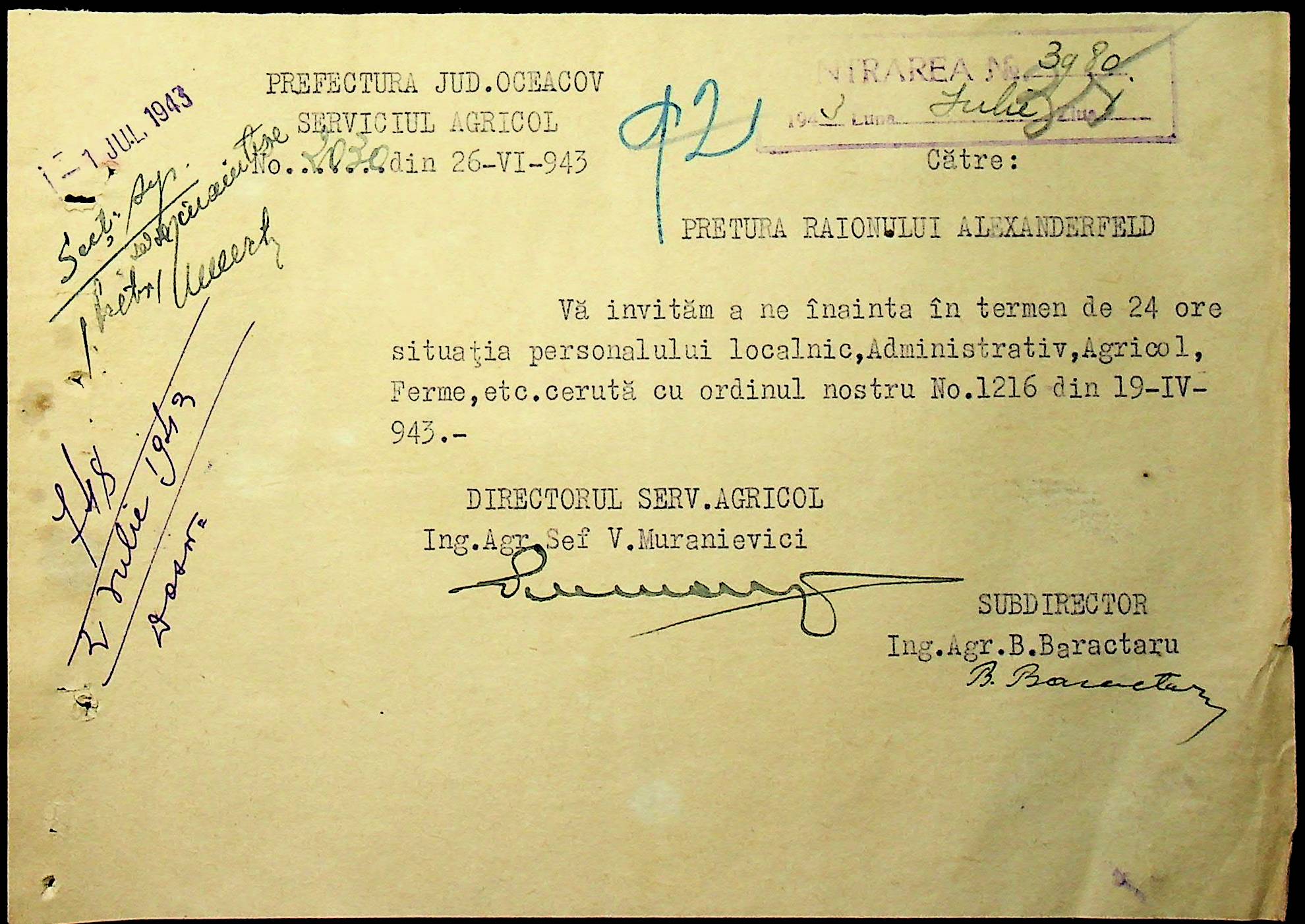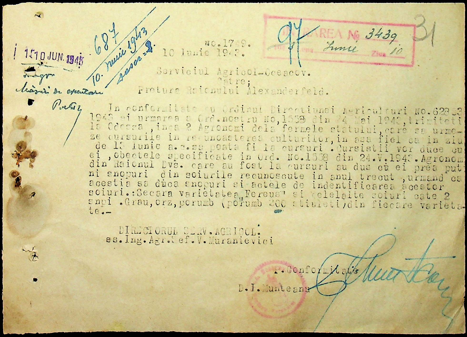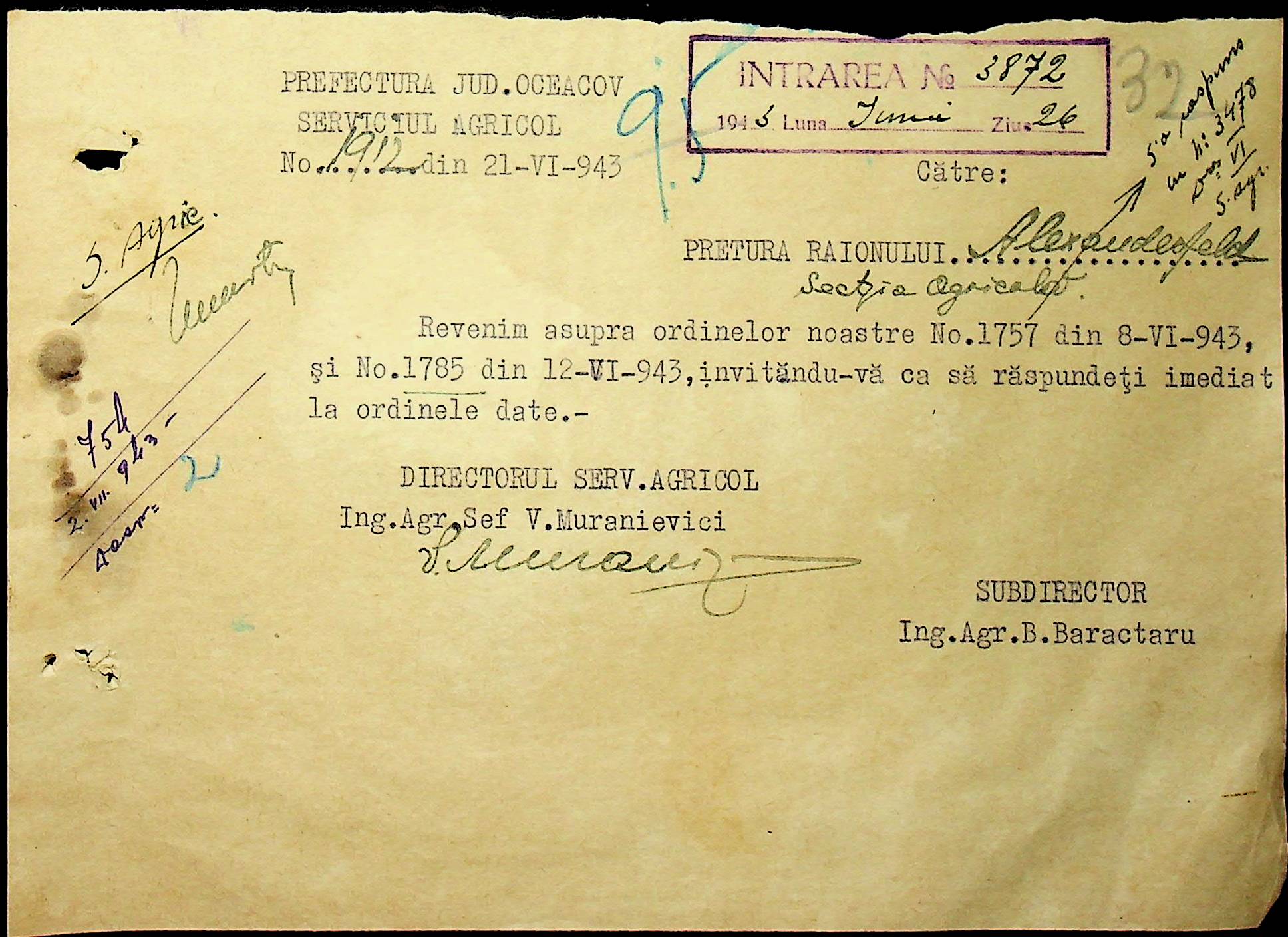 • • • • Справа № 62 “Інструкції, накази дирекції агрокультур губернаторства Трансністрії (копії), листування з сільськогосподарським відділом префектури про вихід на польові роботи учнів та вчителів, мобілізацію населення на військові роботи. Список сільськогосподарських спеціалістів, премійованих румунською адміністрацією під час весняної посівної кампанії 1943 року”